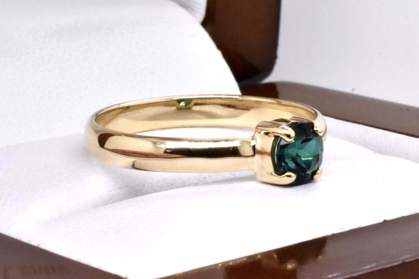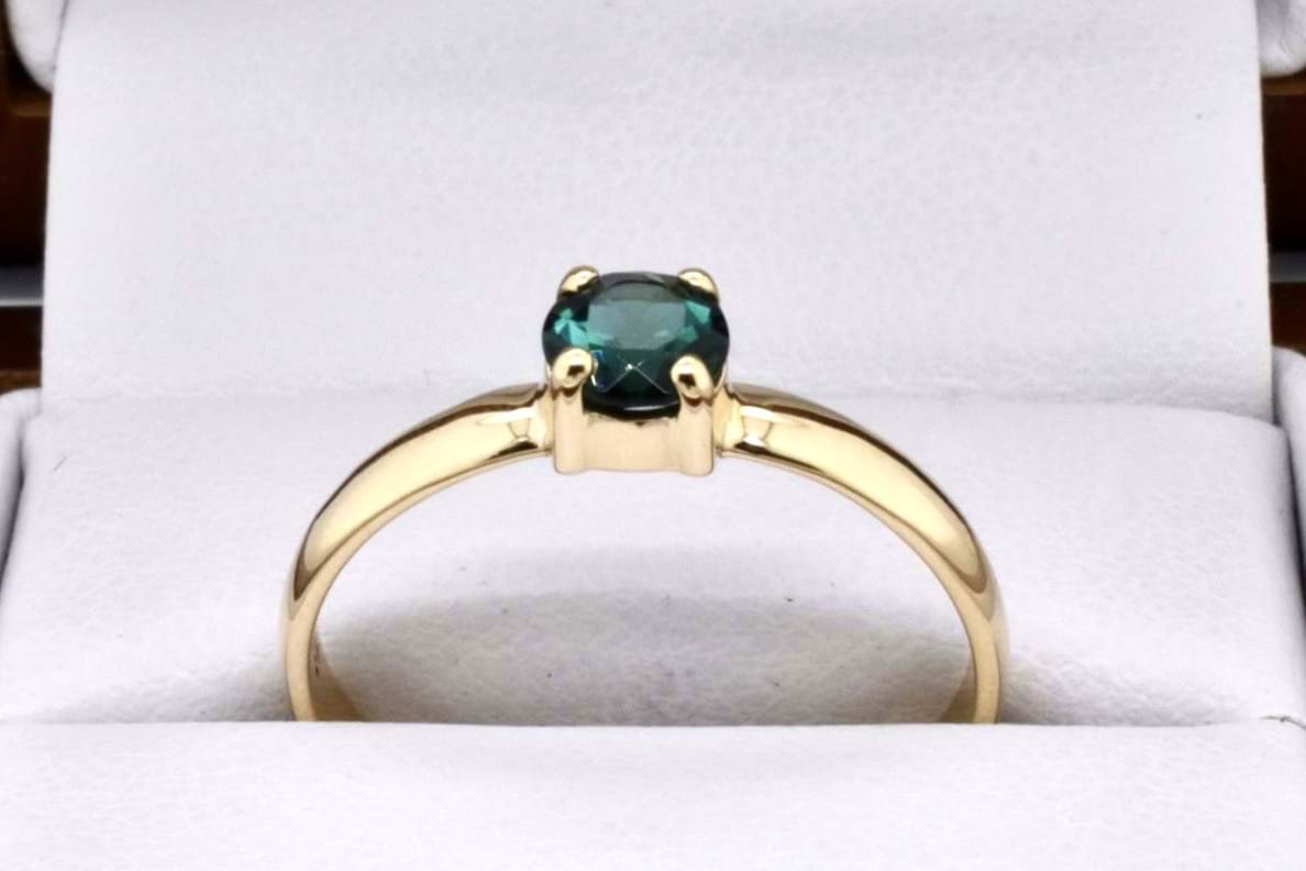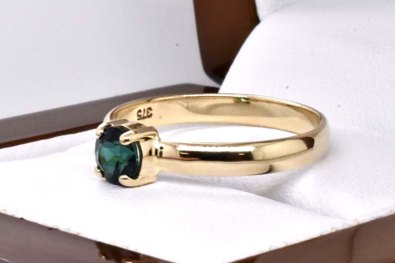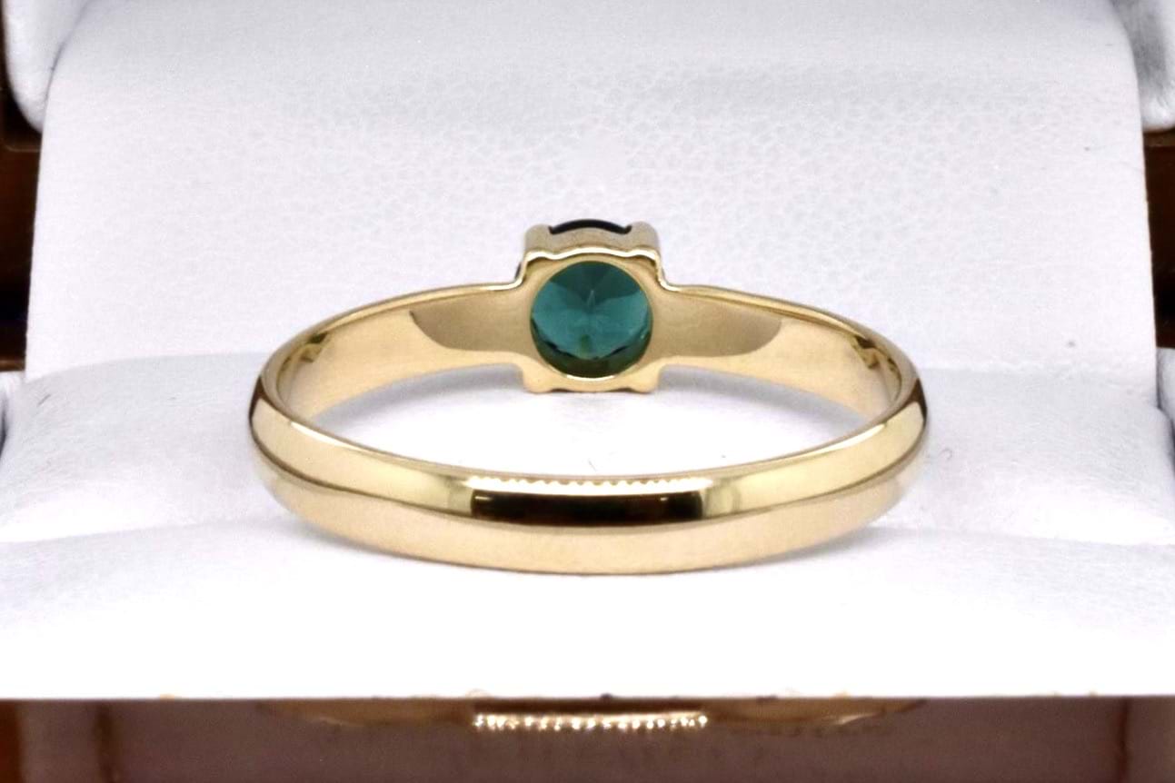 A petite handmade 9ct yellow gold ring featuring an approx. 5mm round green tourmaline, 4 claw set with a plain band. Finger size Q