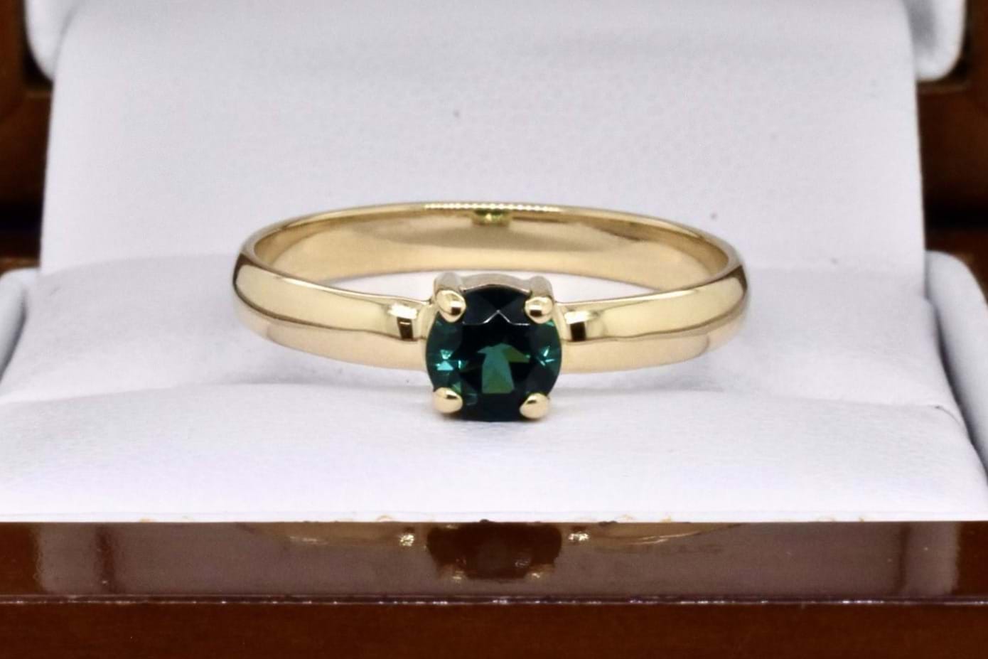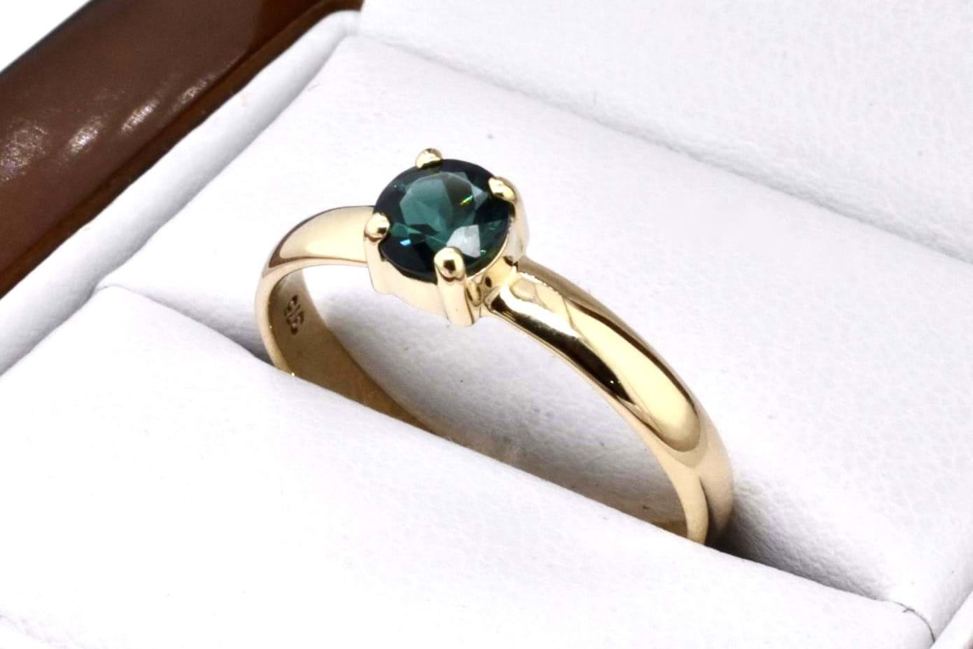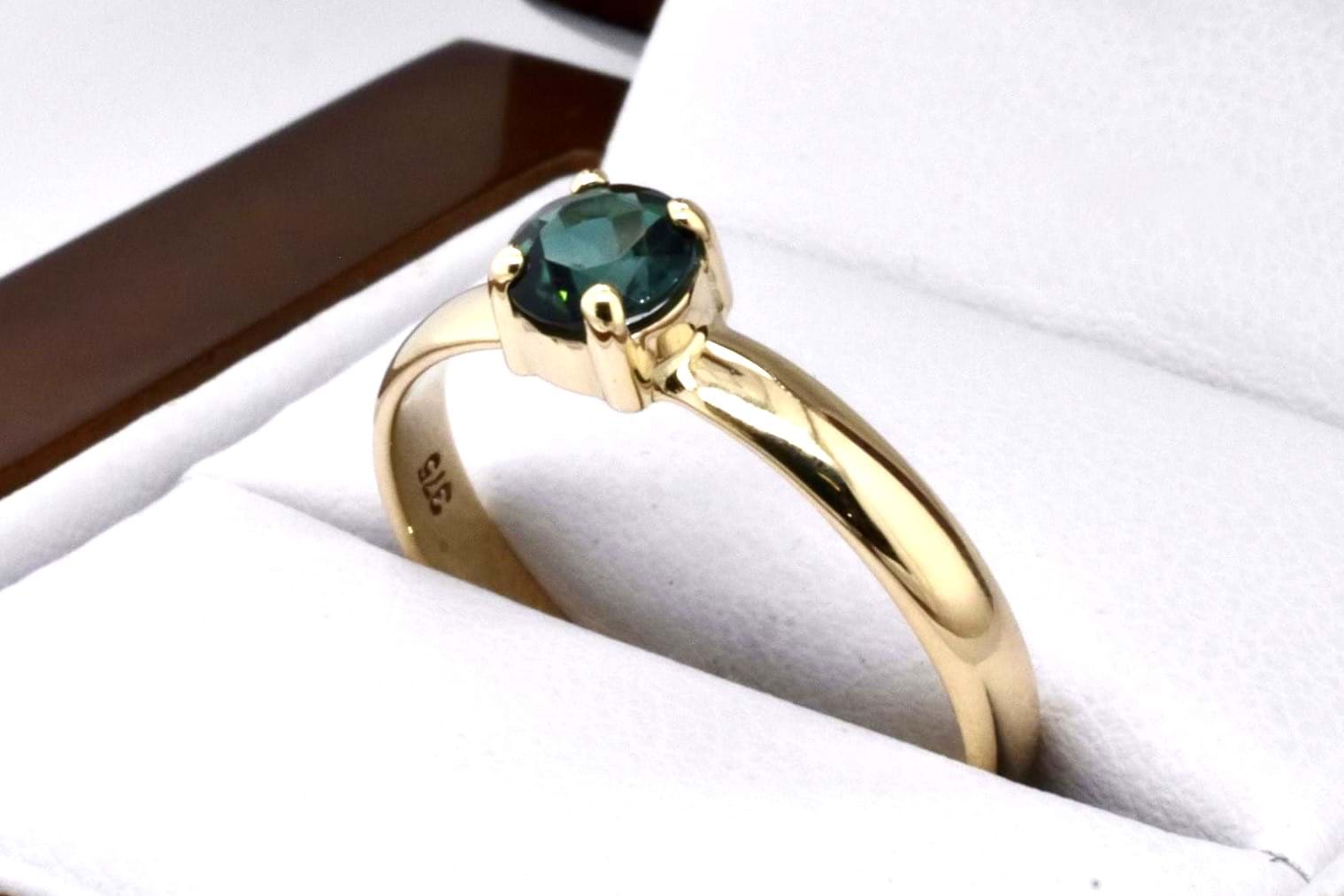 A petite handmade 9ct yellow gold ring featuring an approx. 5mm round green tourmaline, 4 claw set with a plain band. Finger size Q
