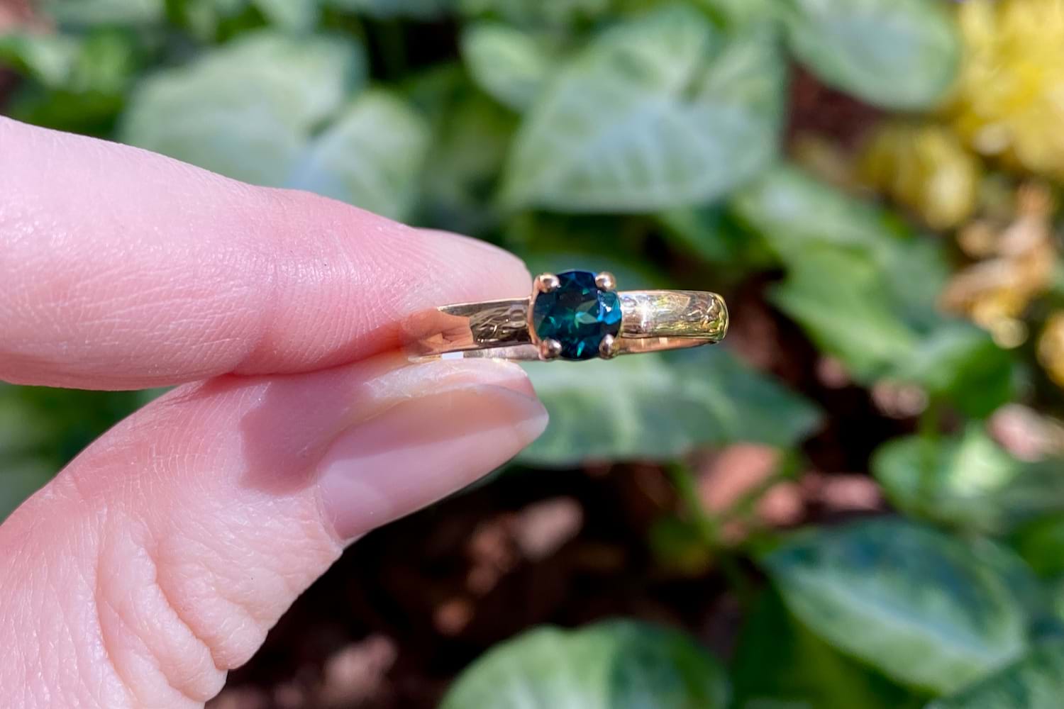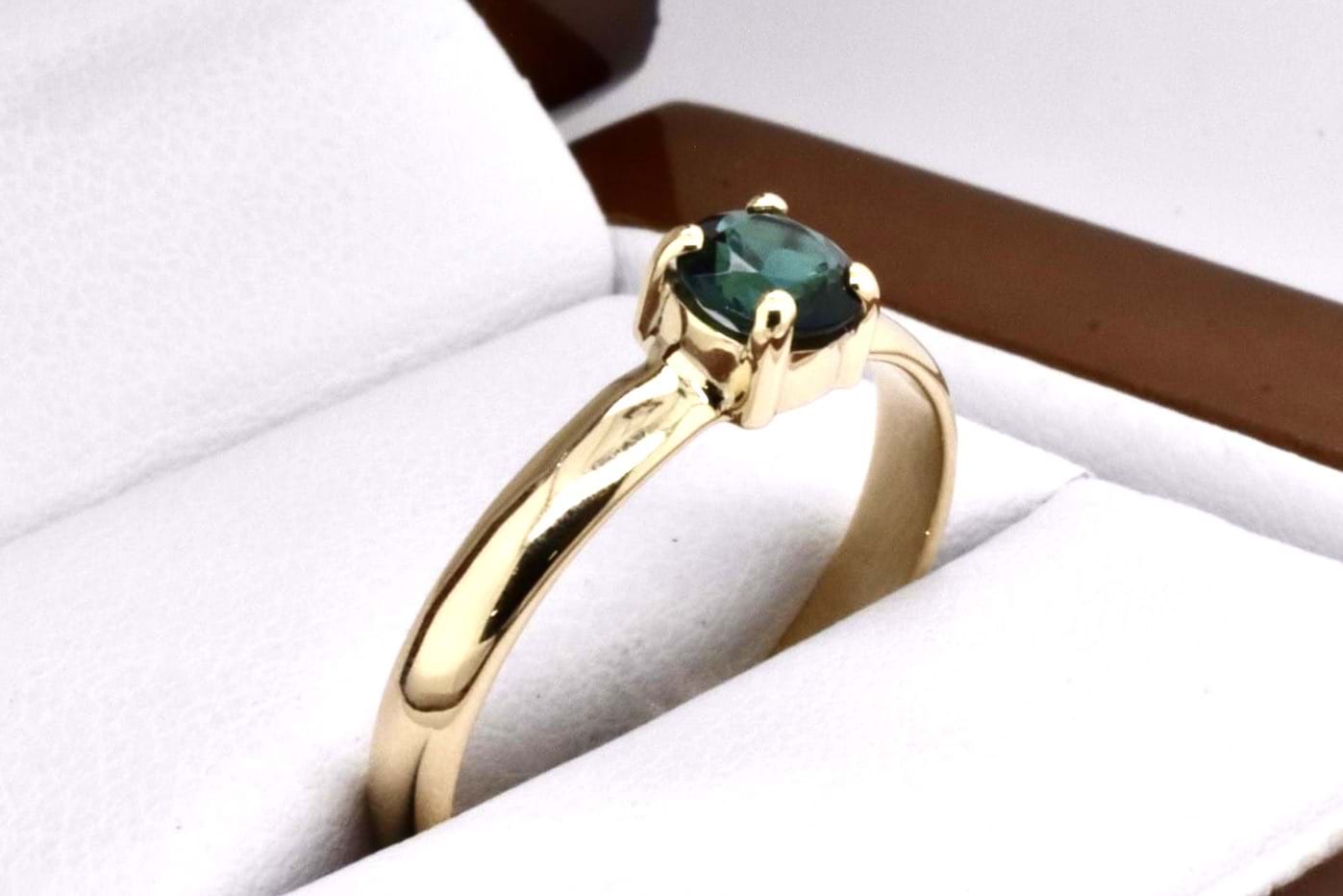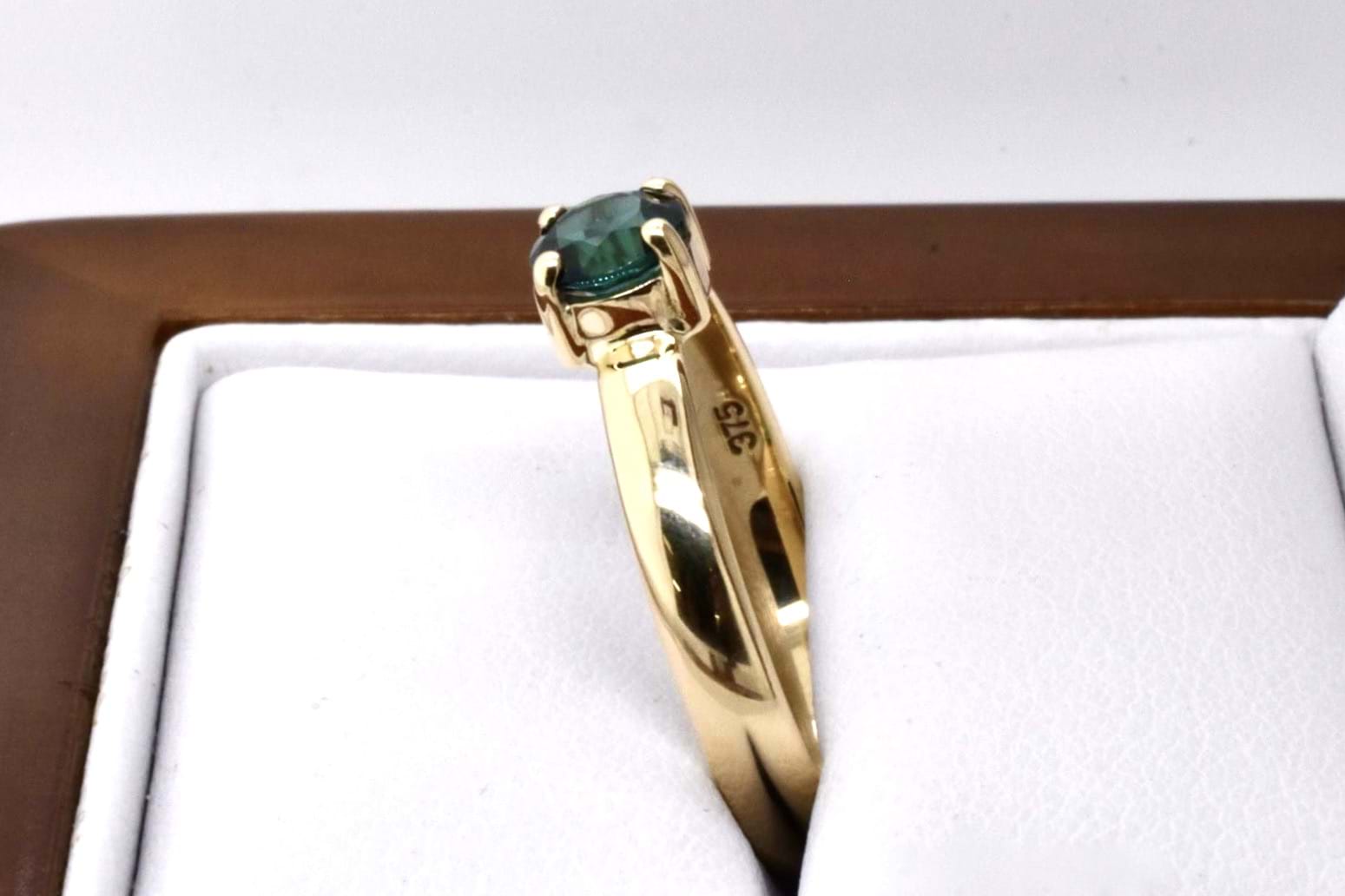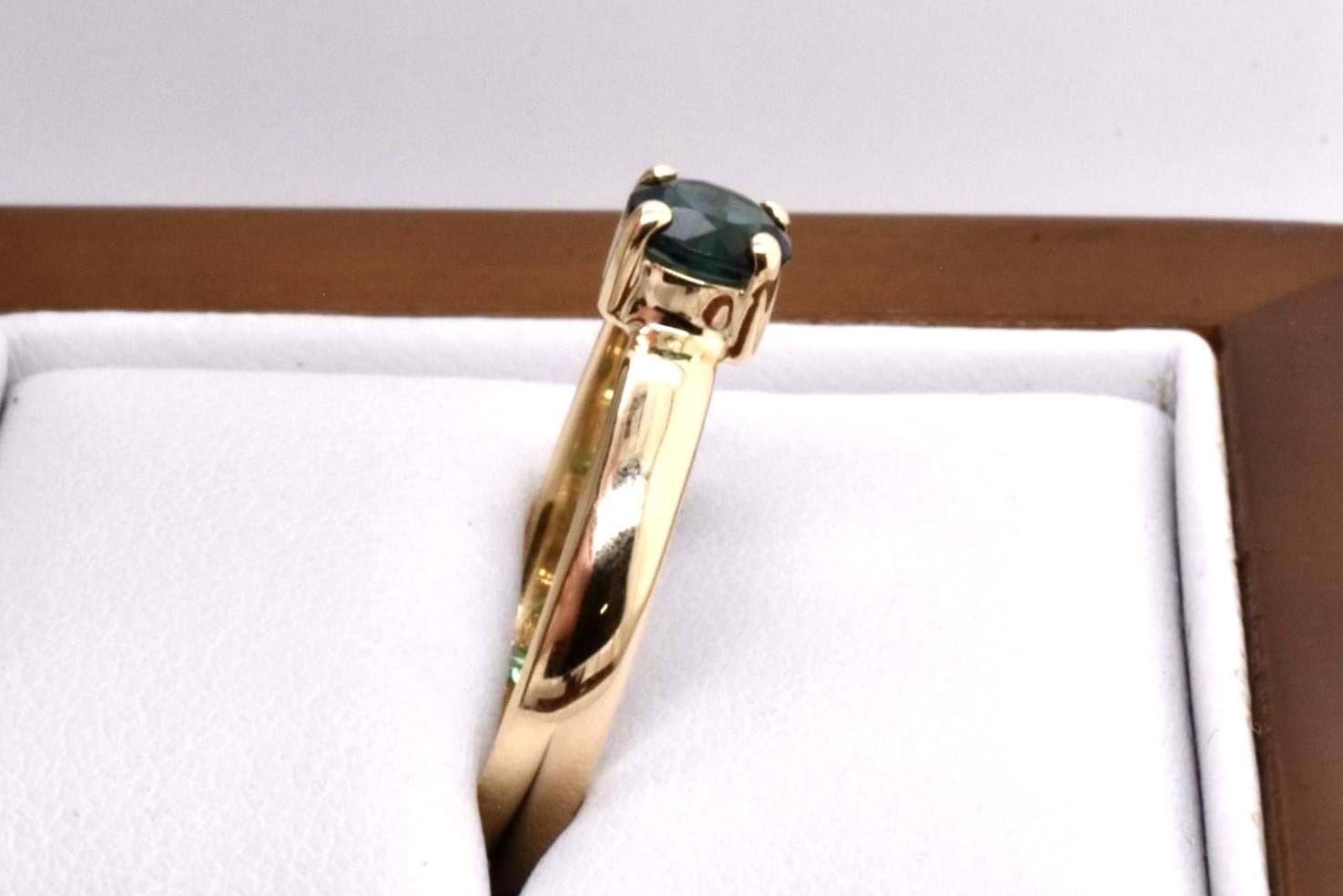 A petite handmade 9ct yellow gold ring featuring an approx. 5mm round green tourmaline, 4 claw set with a plain band. Finger size Q
