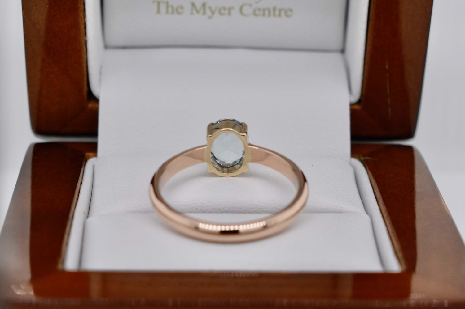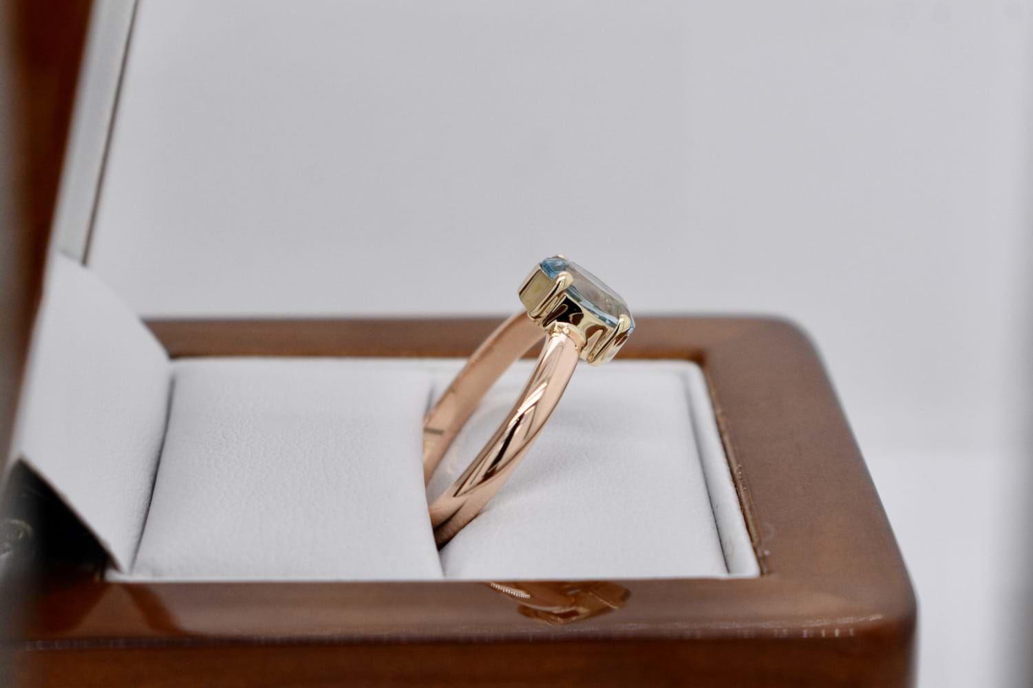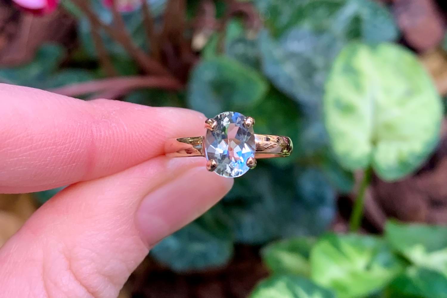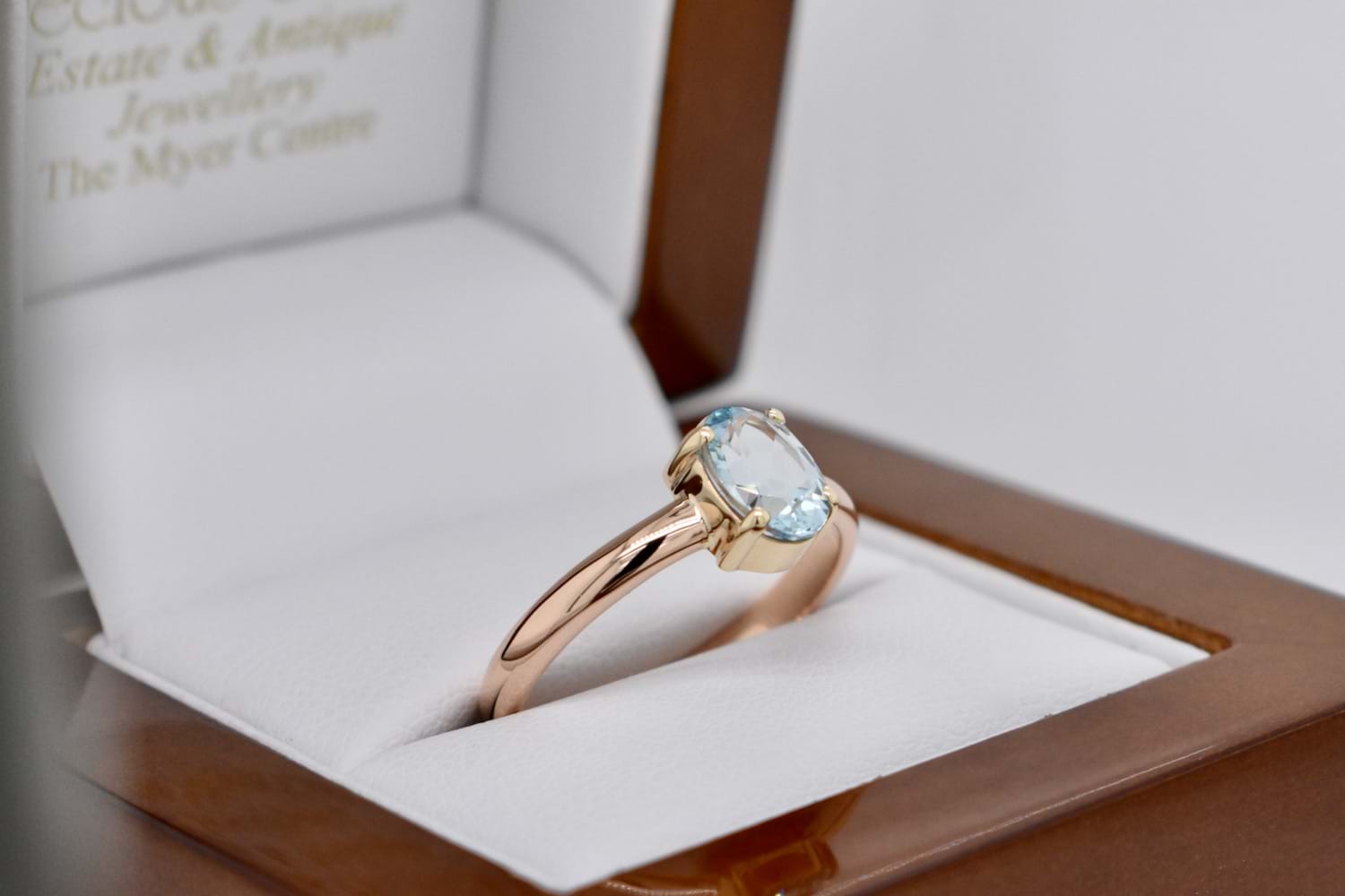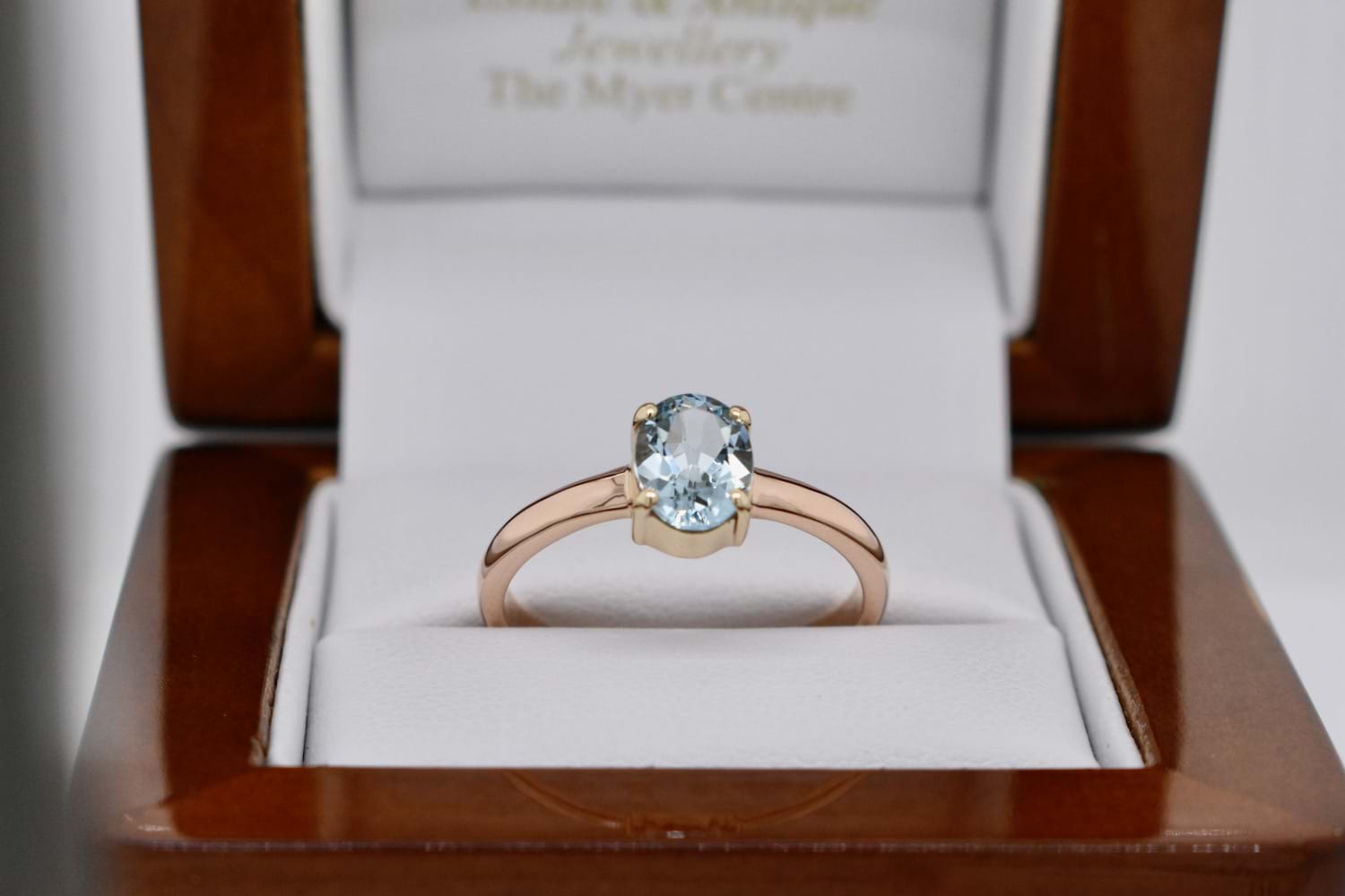 A feminine and pretty 9ct yellow gold ring featuring a four claw set oval aquamarine measuring approx. 8x6mm with a plain band. Finger size R