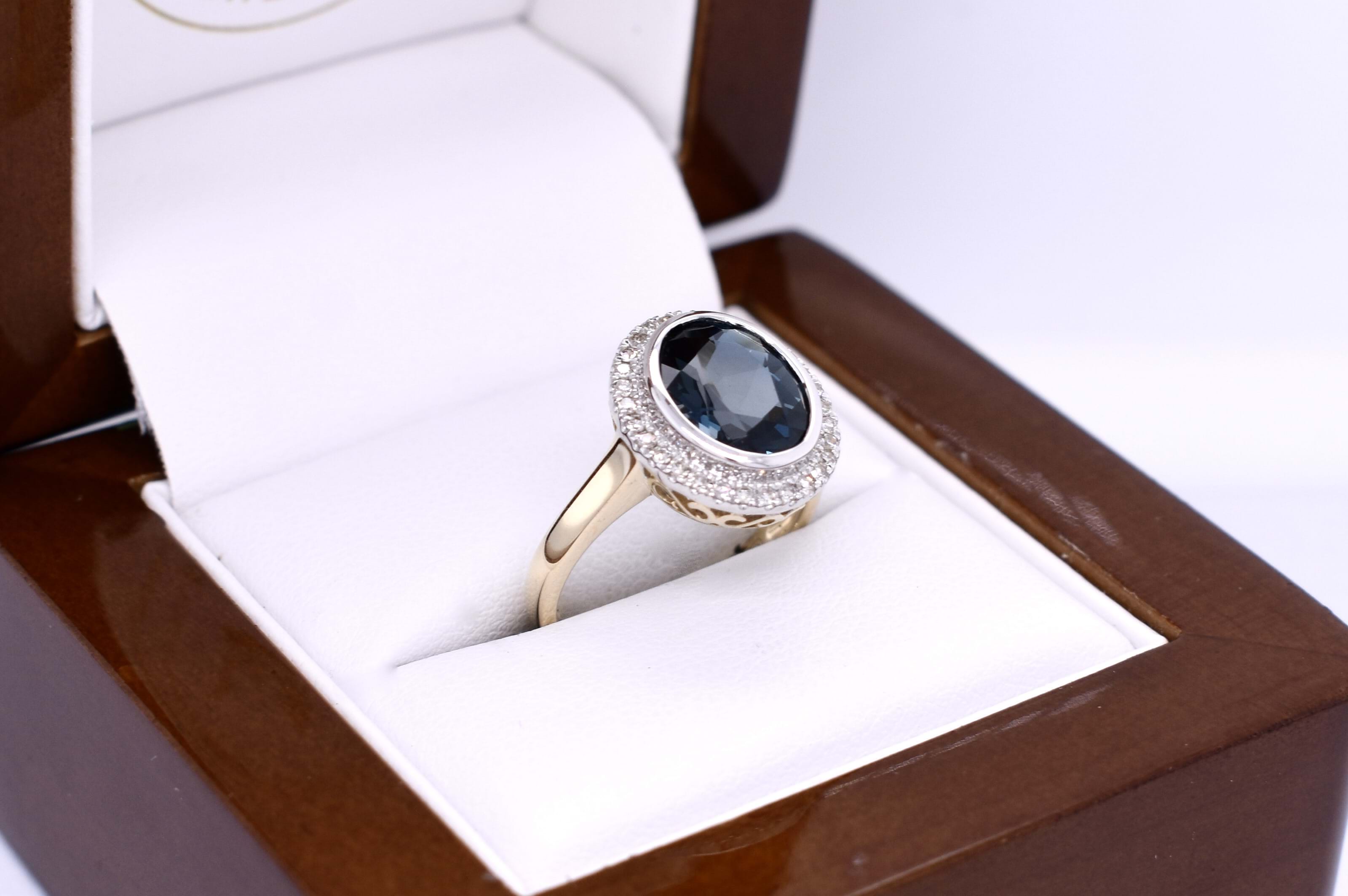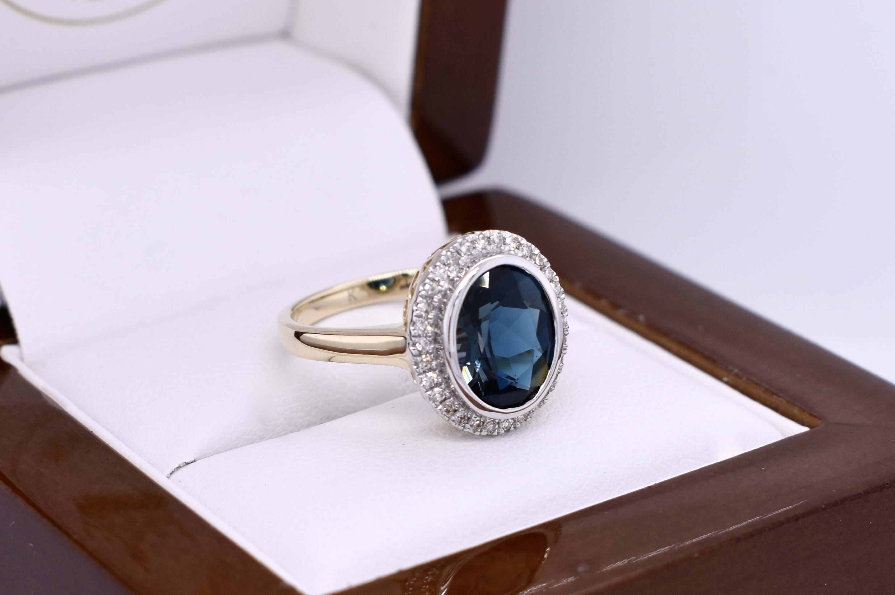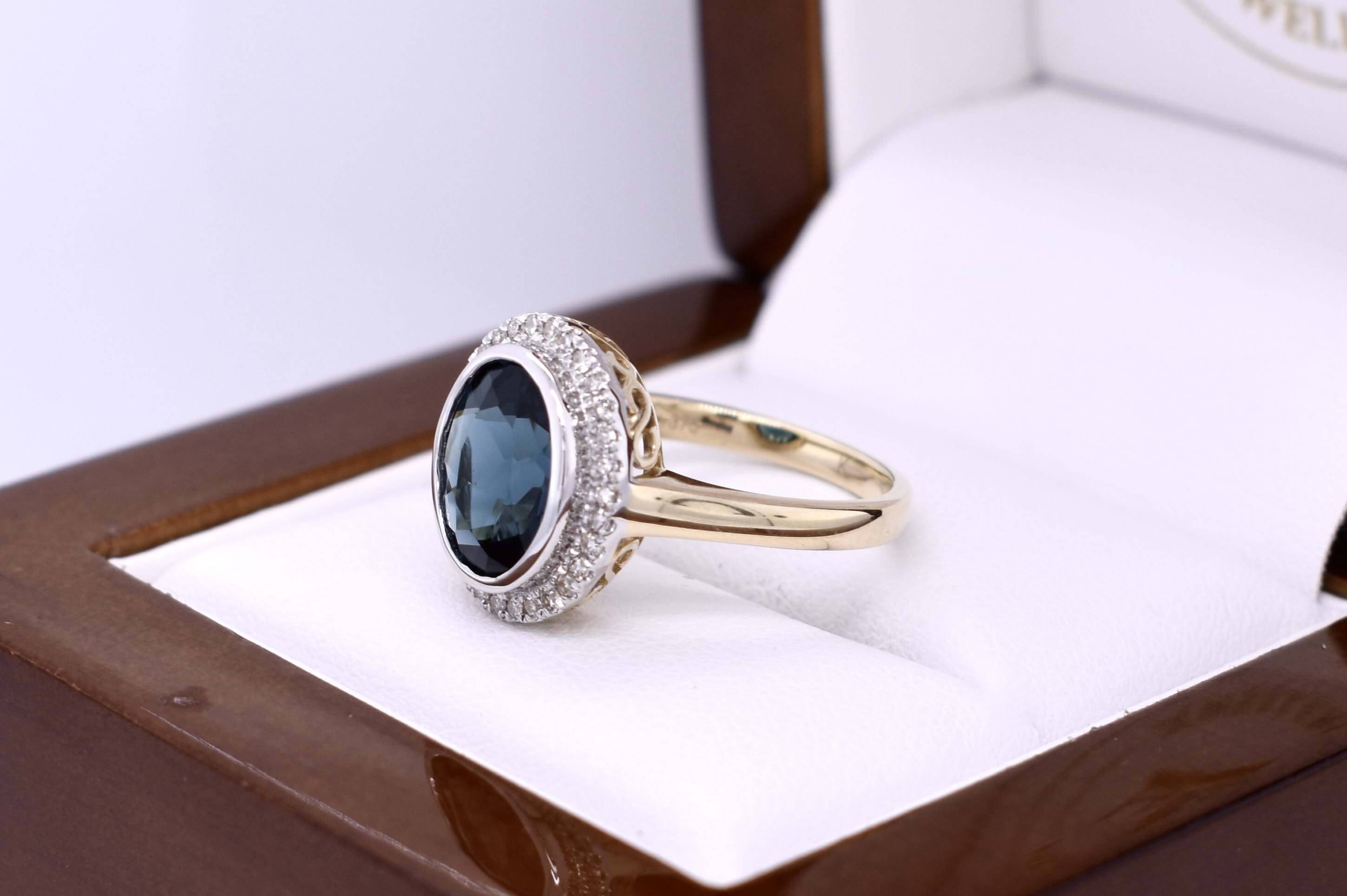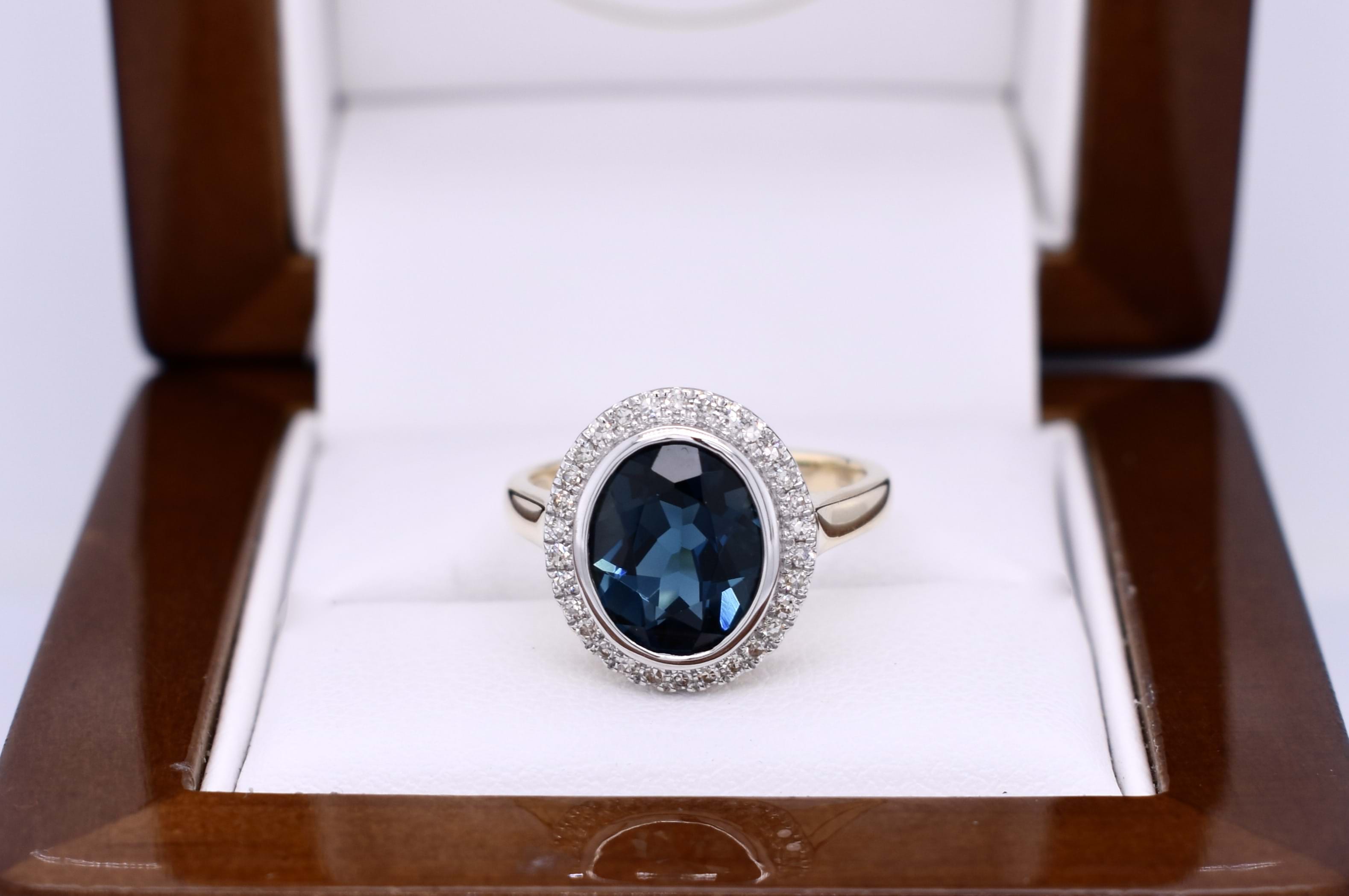 Dazzling and blue, this stunning 9ct yellow gold oval shaped London blue topaz ring, centre stone measuring 10x8mm, bezel set. Surrounded by a halo of round brilliant cut diamonds. Completed with a yellow gold plain band. 3.24 grams. Finger size K.