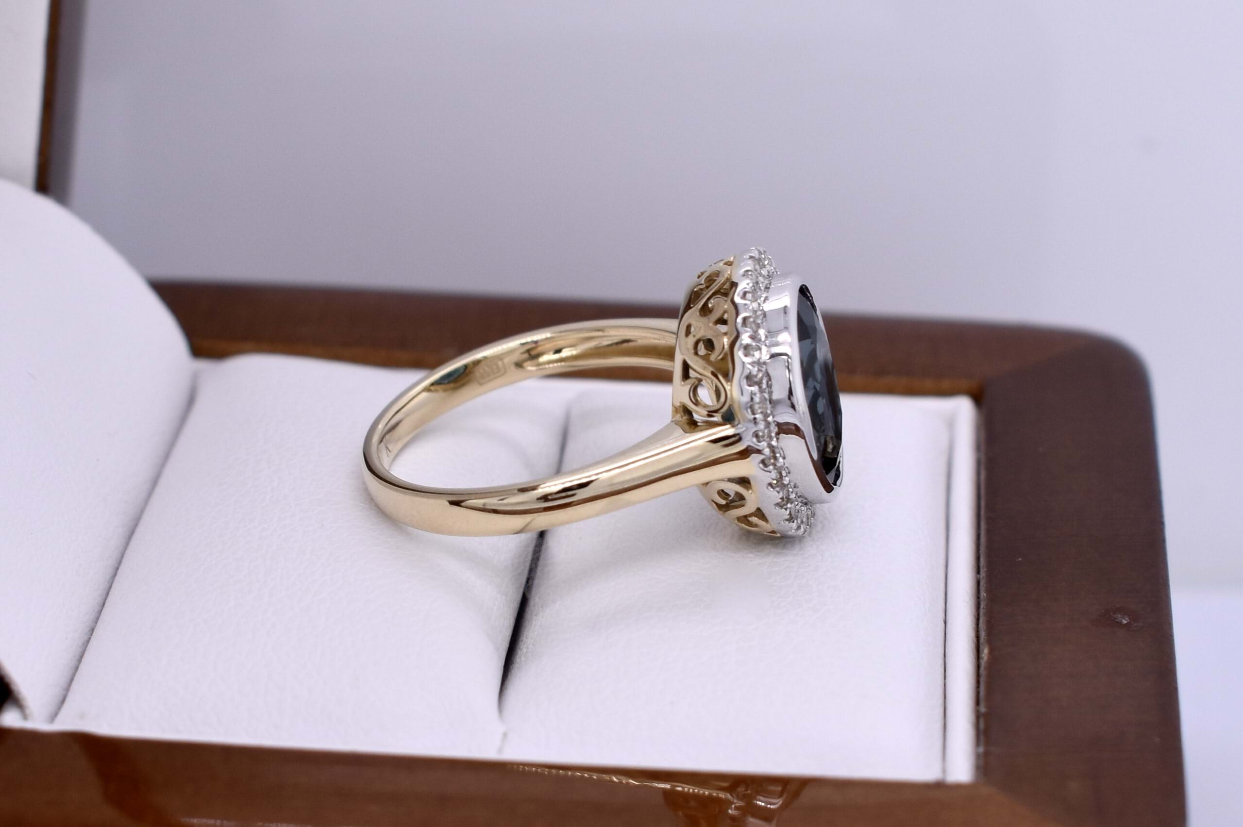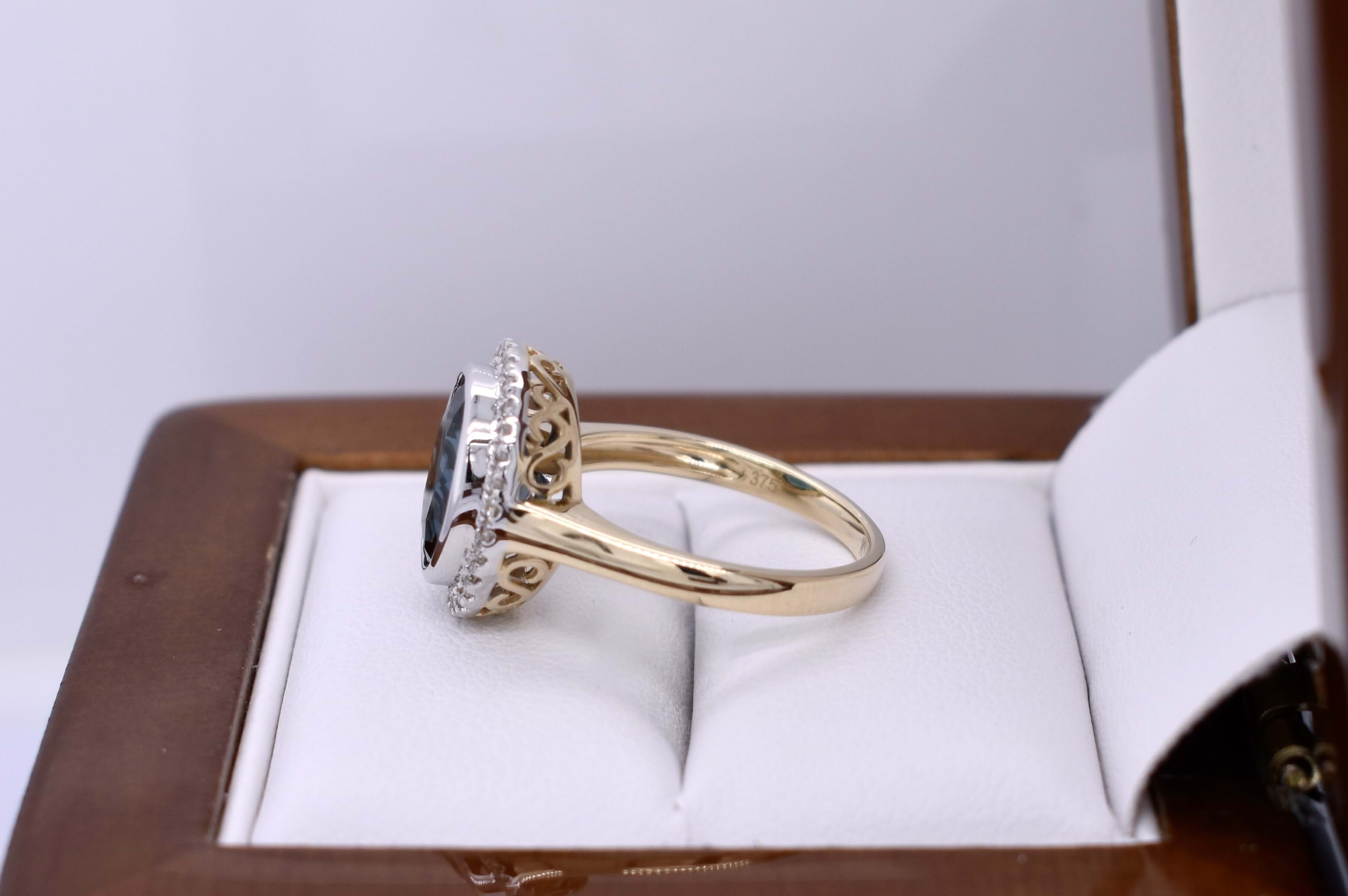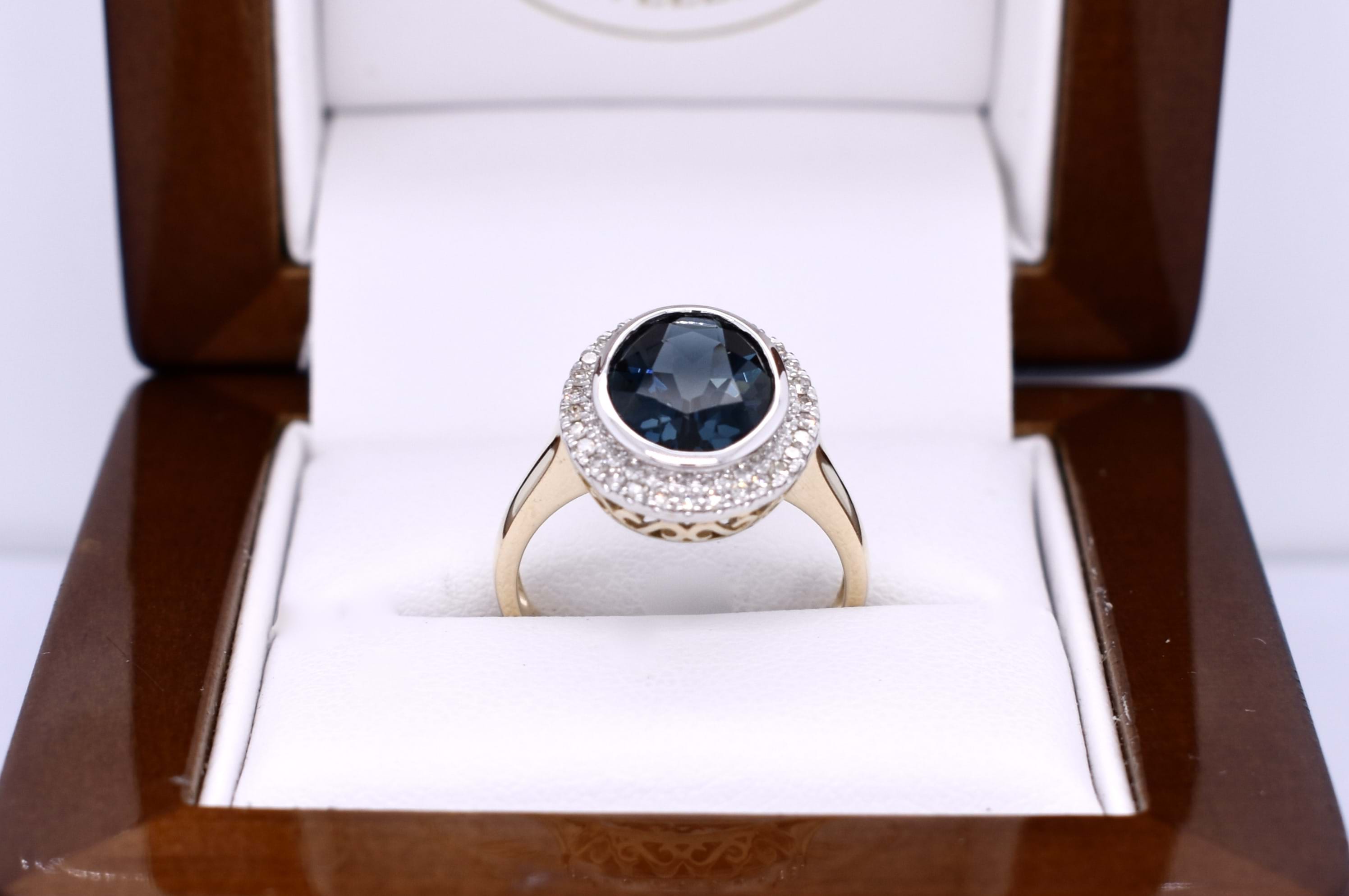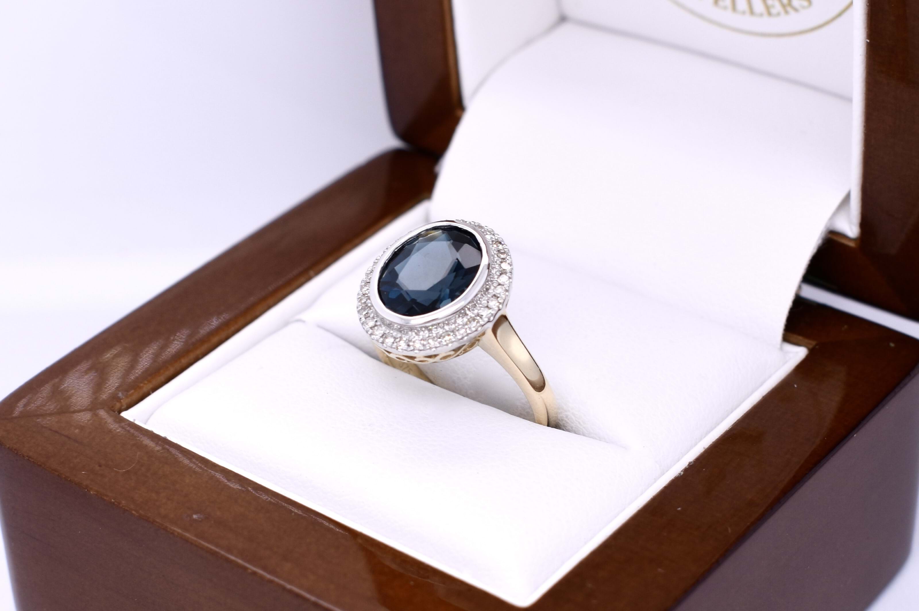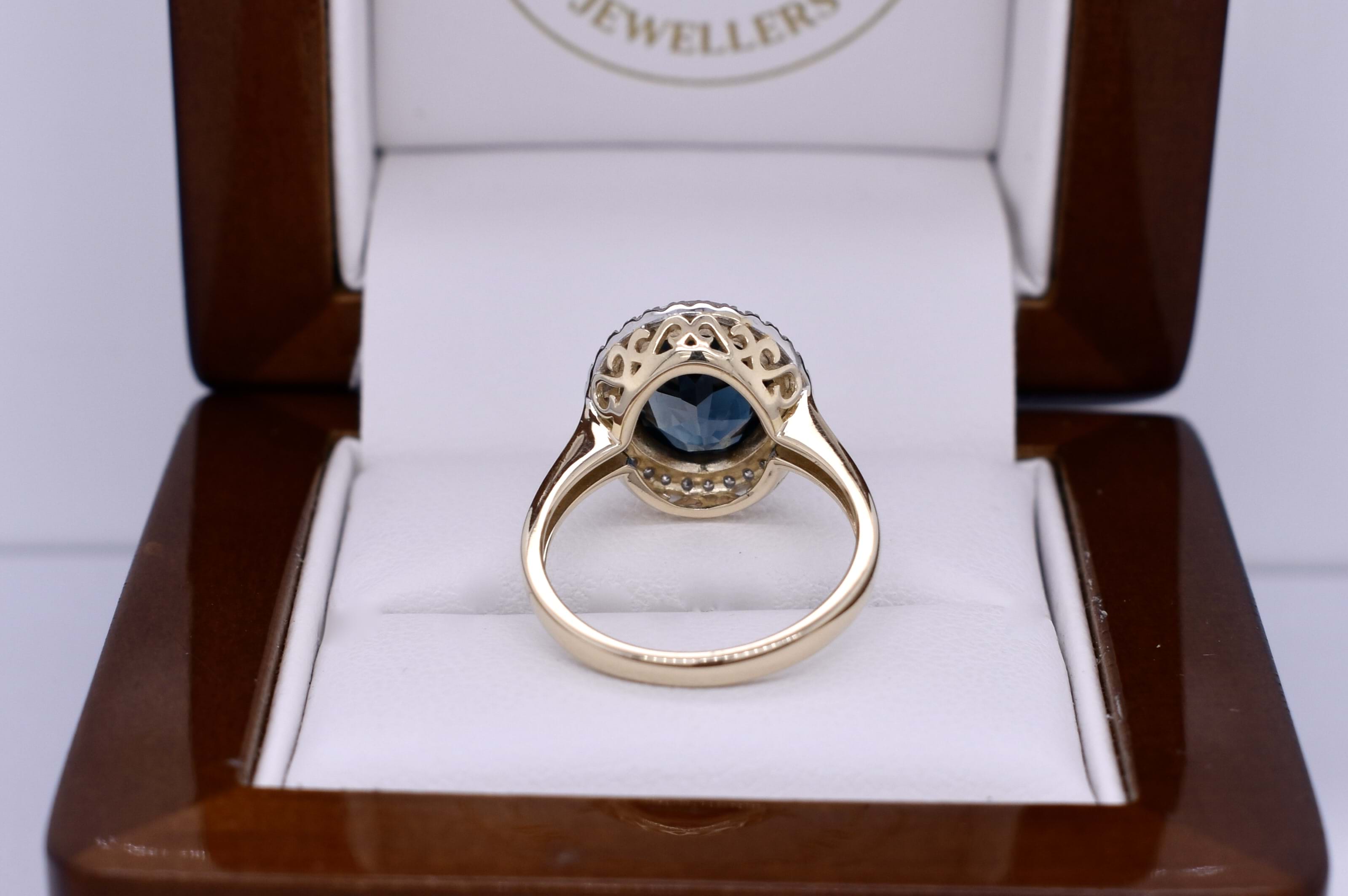 Dazzling and blue, this stunning 9ct yellow gold oval shaped London blue topaz ring, centre stone measuring 10x8mm, bezel set. Surrounded by a halo of round brilliant cut diamonds. Completed with a yellow gold plain band. 3.24 grams. Finger size K.