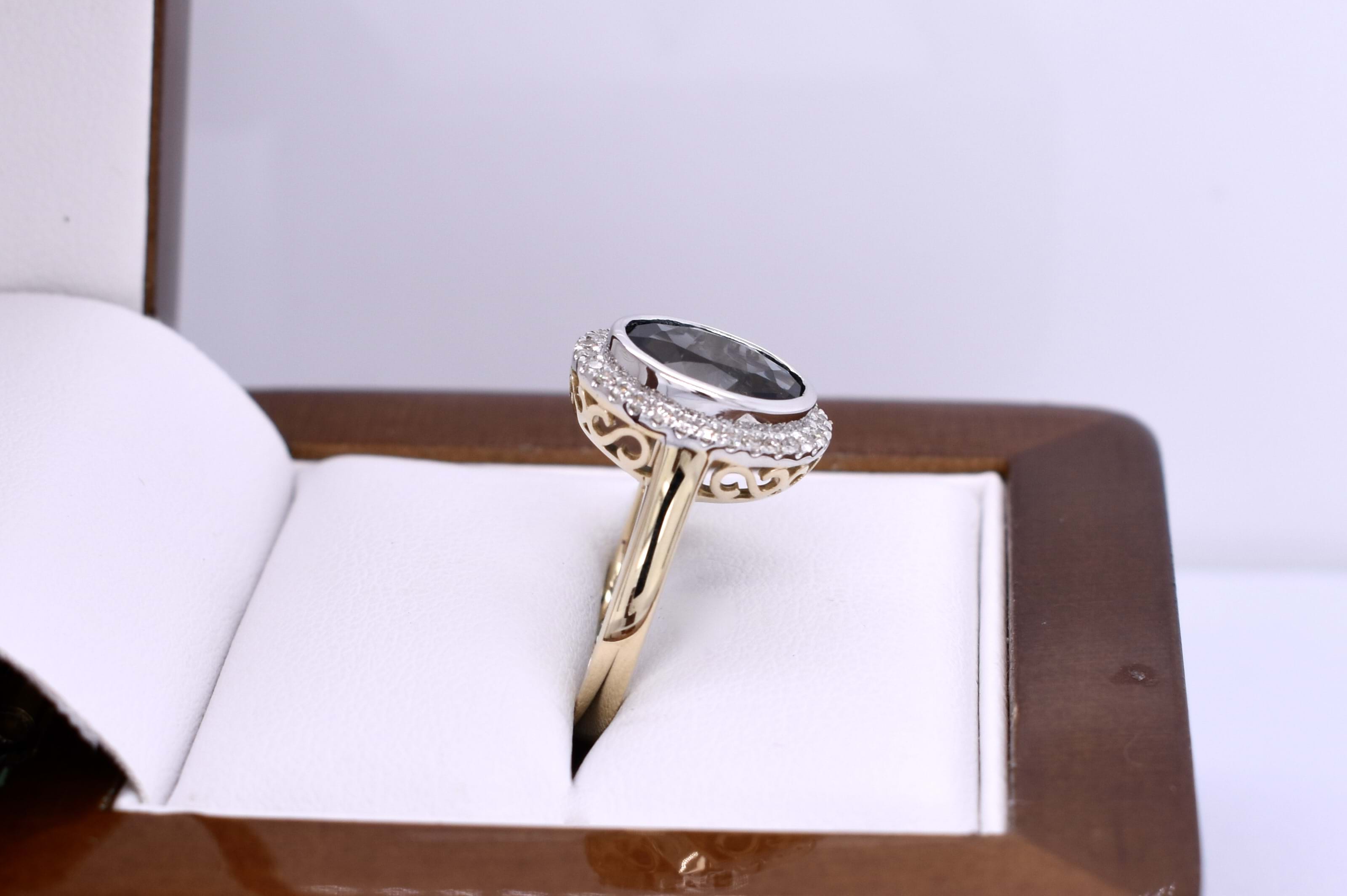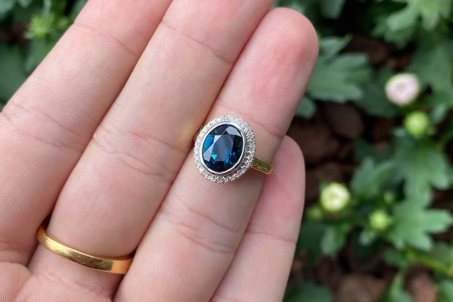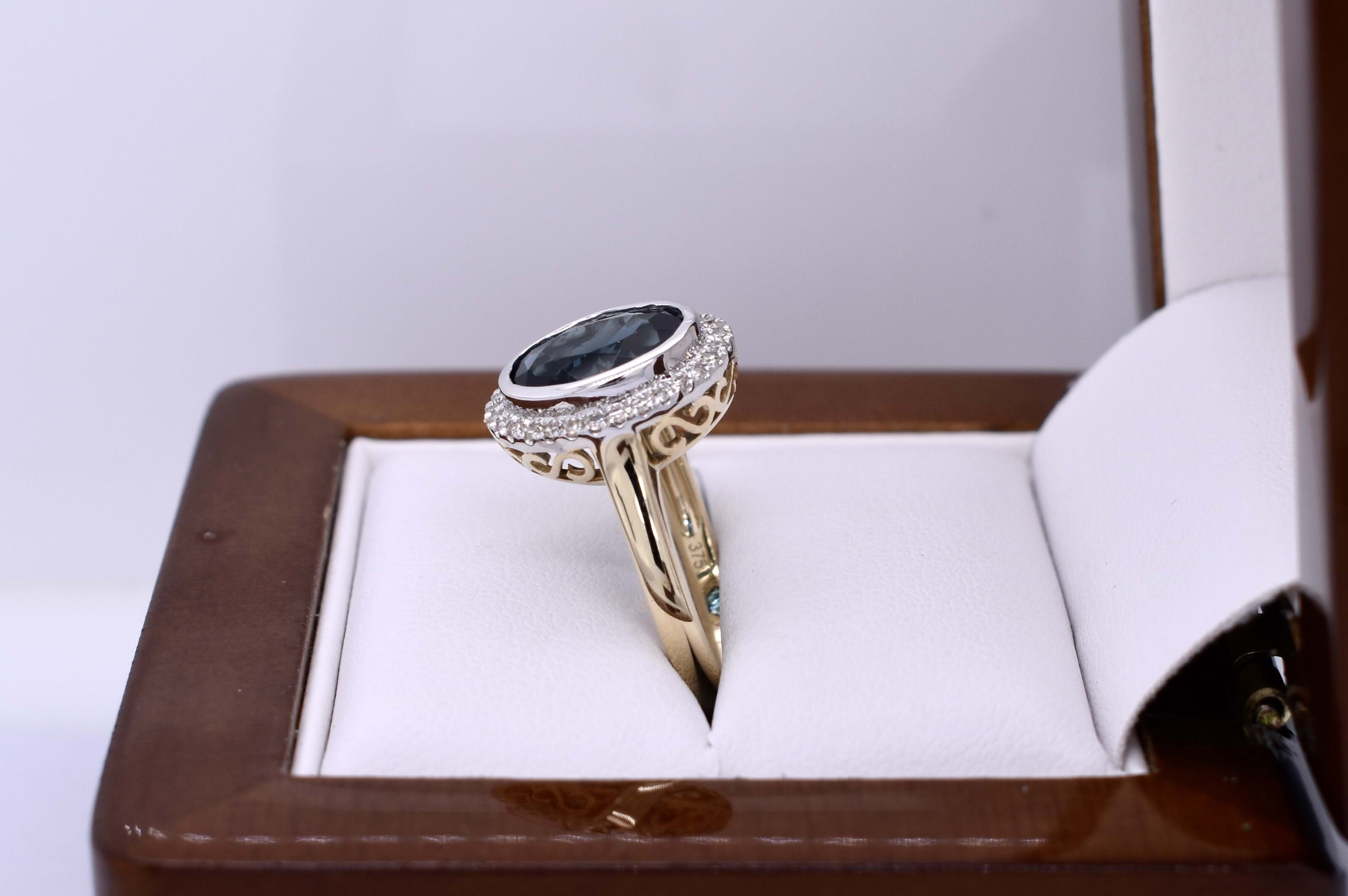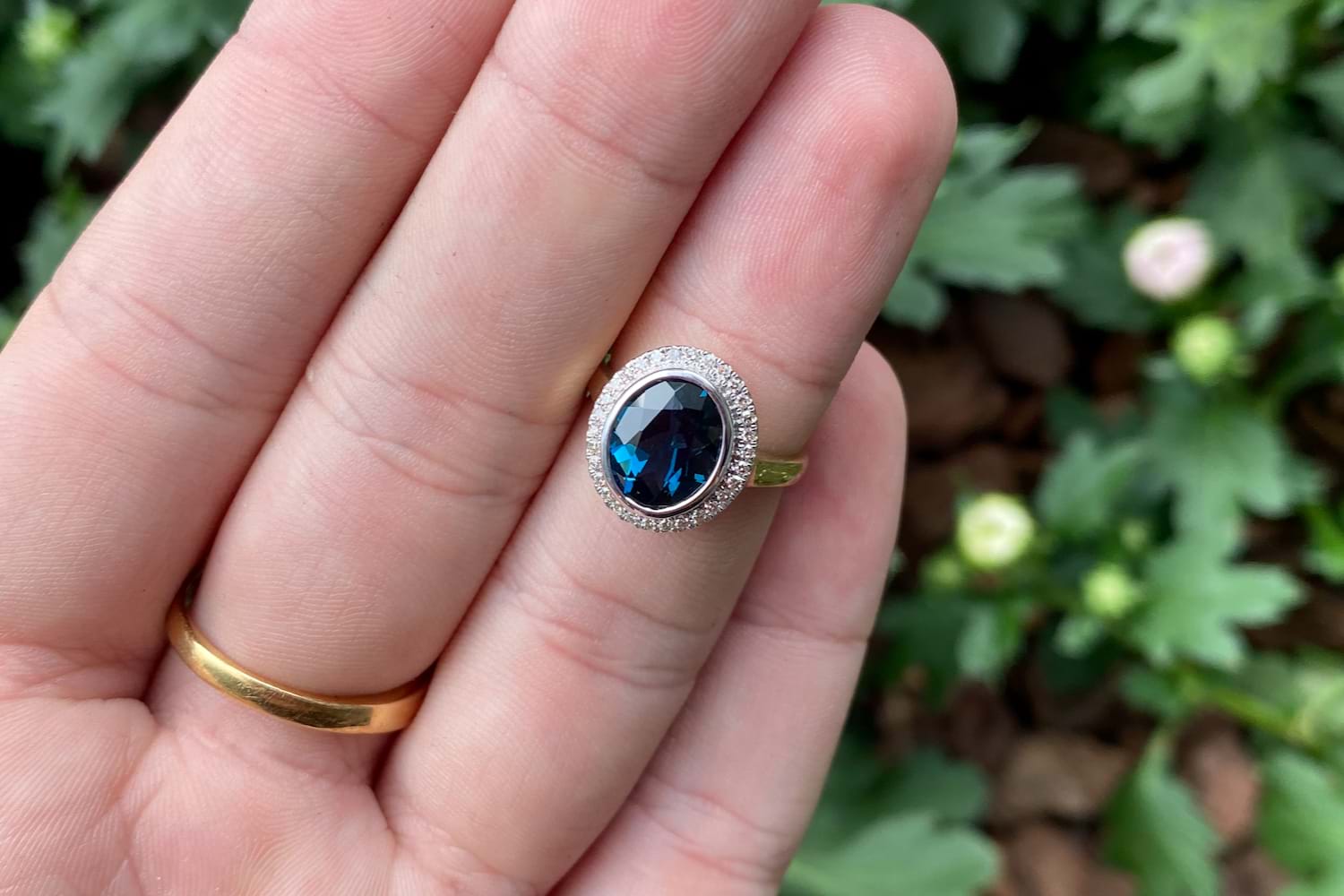 Dazzling and blue, this stunning 9ct yellow gold oval shaped London blue topaz ring, centre stone measuring 10x8mm, bezel set. Surrounded by a halo of round brilliant cut diamonds. Completed with a yellow gold plain band. 3.24 grams. Finger size K.