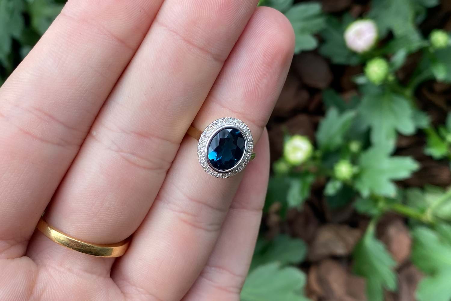SOLD Secondhand Bargain! 9ct Yellow Gold Oval London Blue Topaz & Diamond Halo Ring (K)
