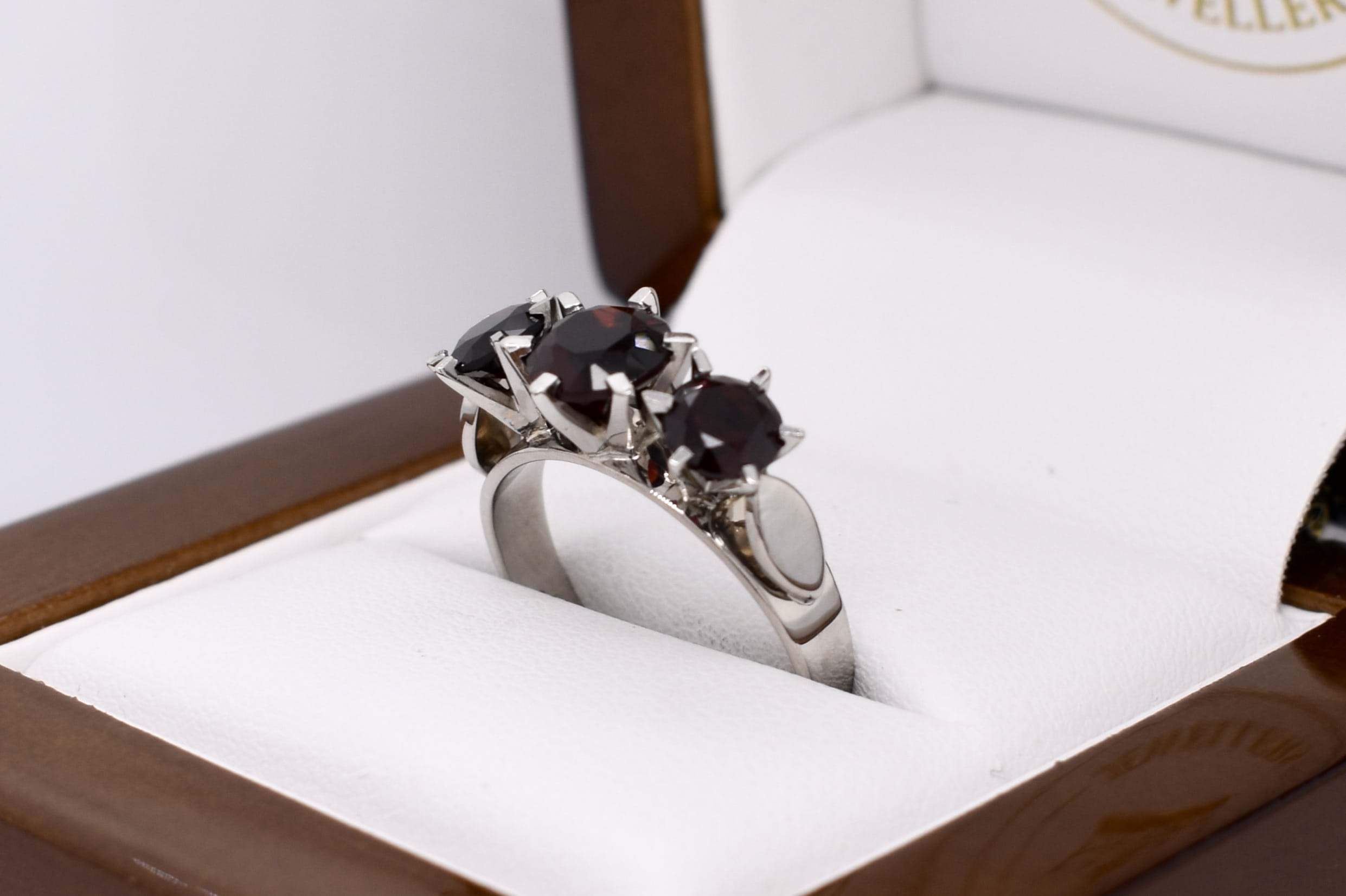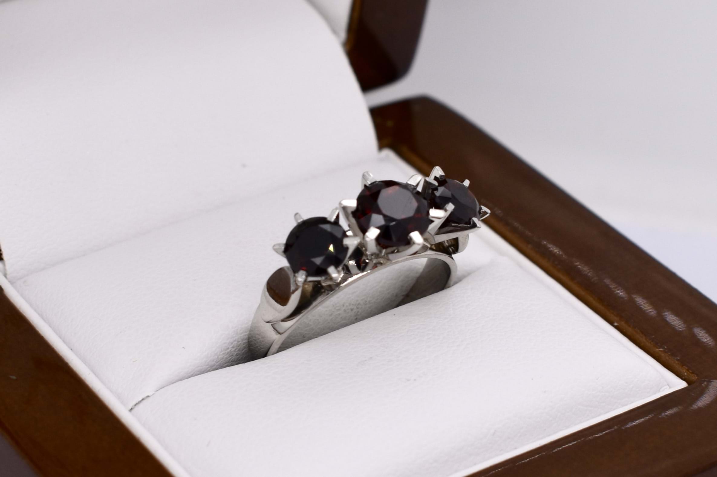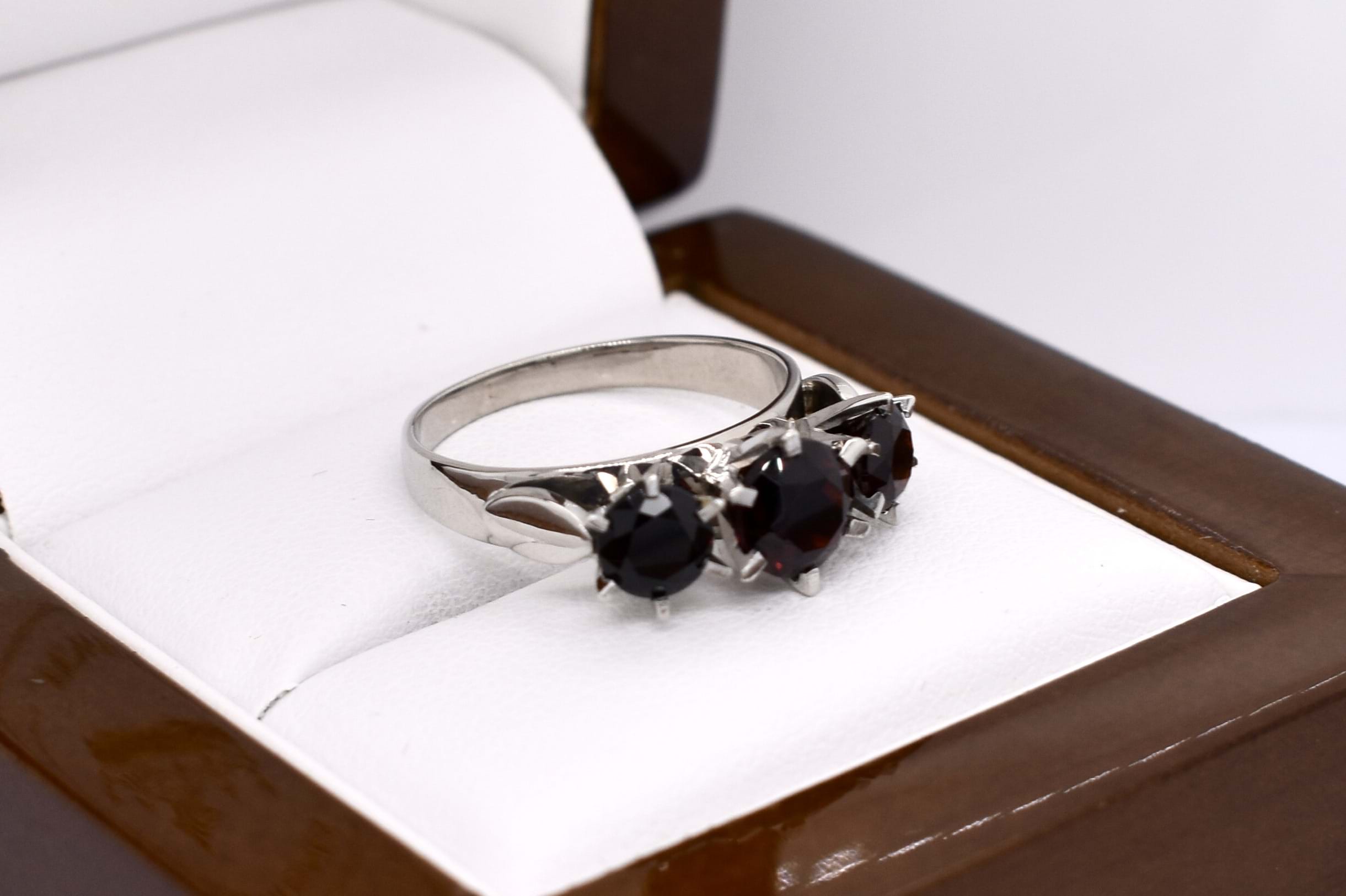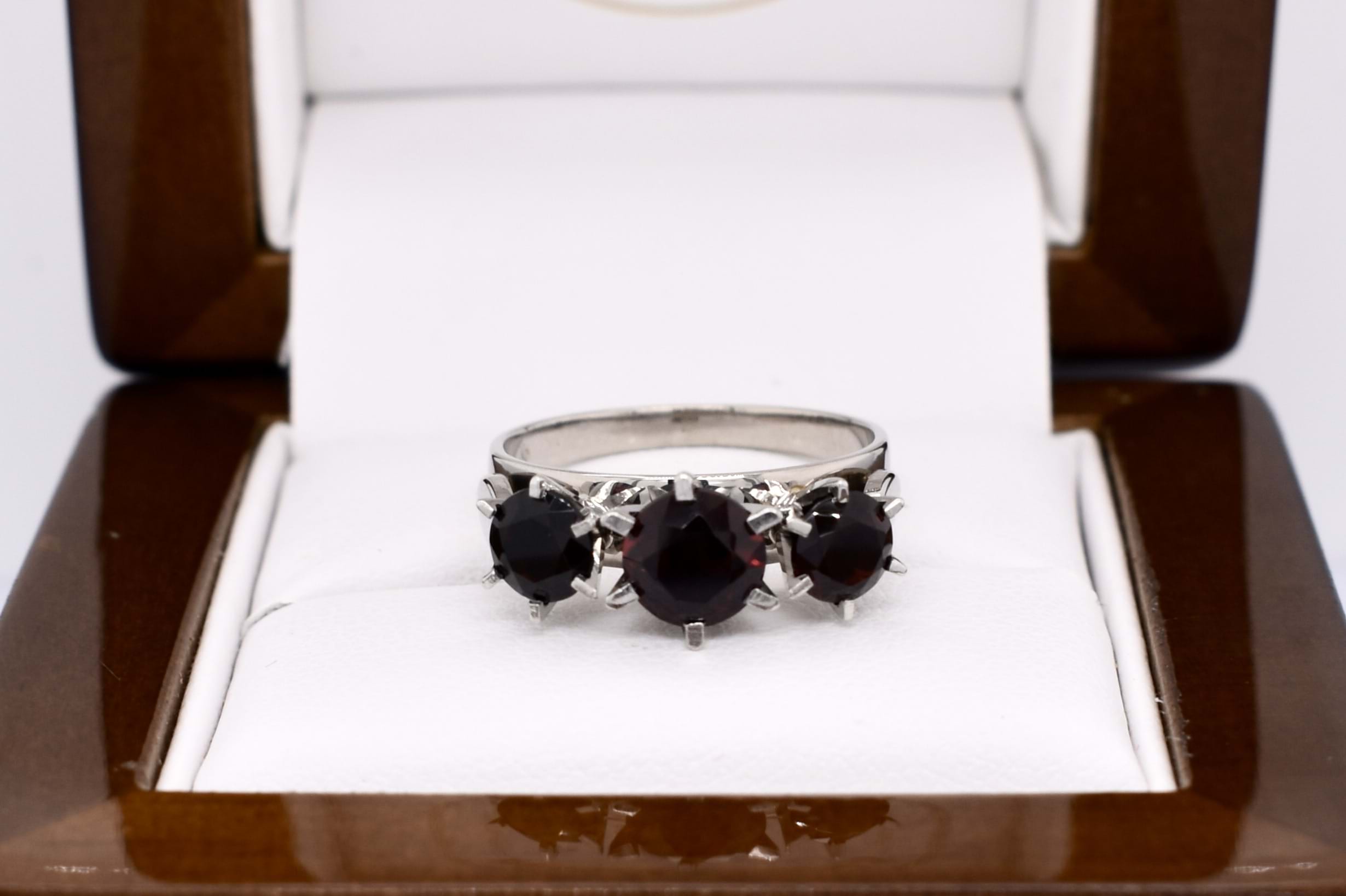 Awesome vintage find! This 9ct white gold ring features a centre 6mm round garnet, with two 5mm round garnets either side. They are 6 claw set on a plain band. 3.40 grams.