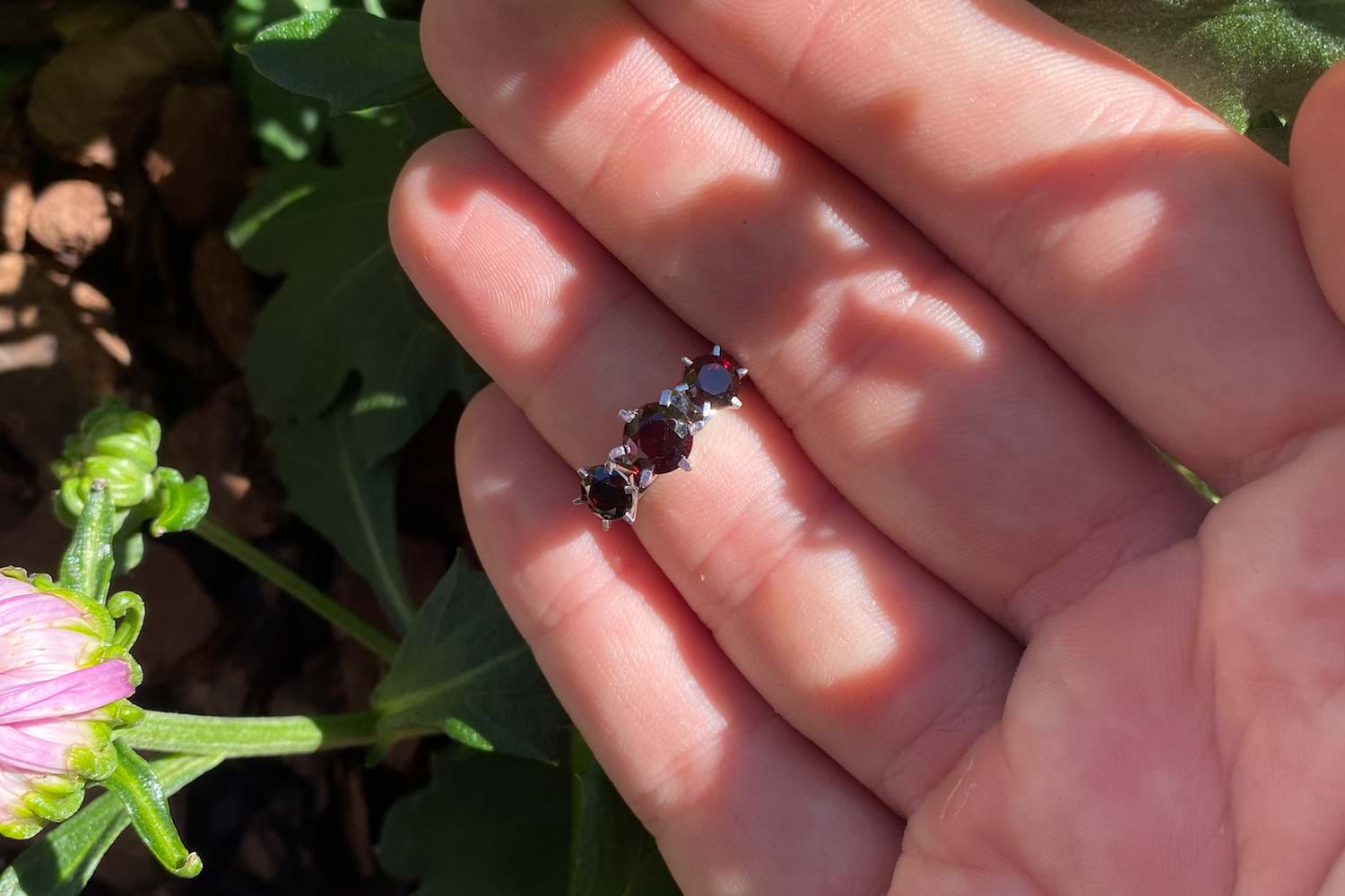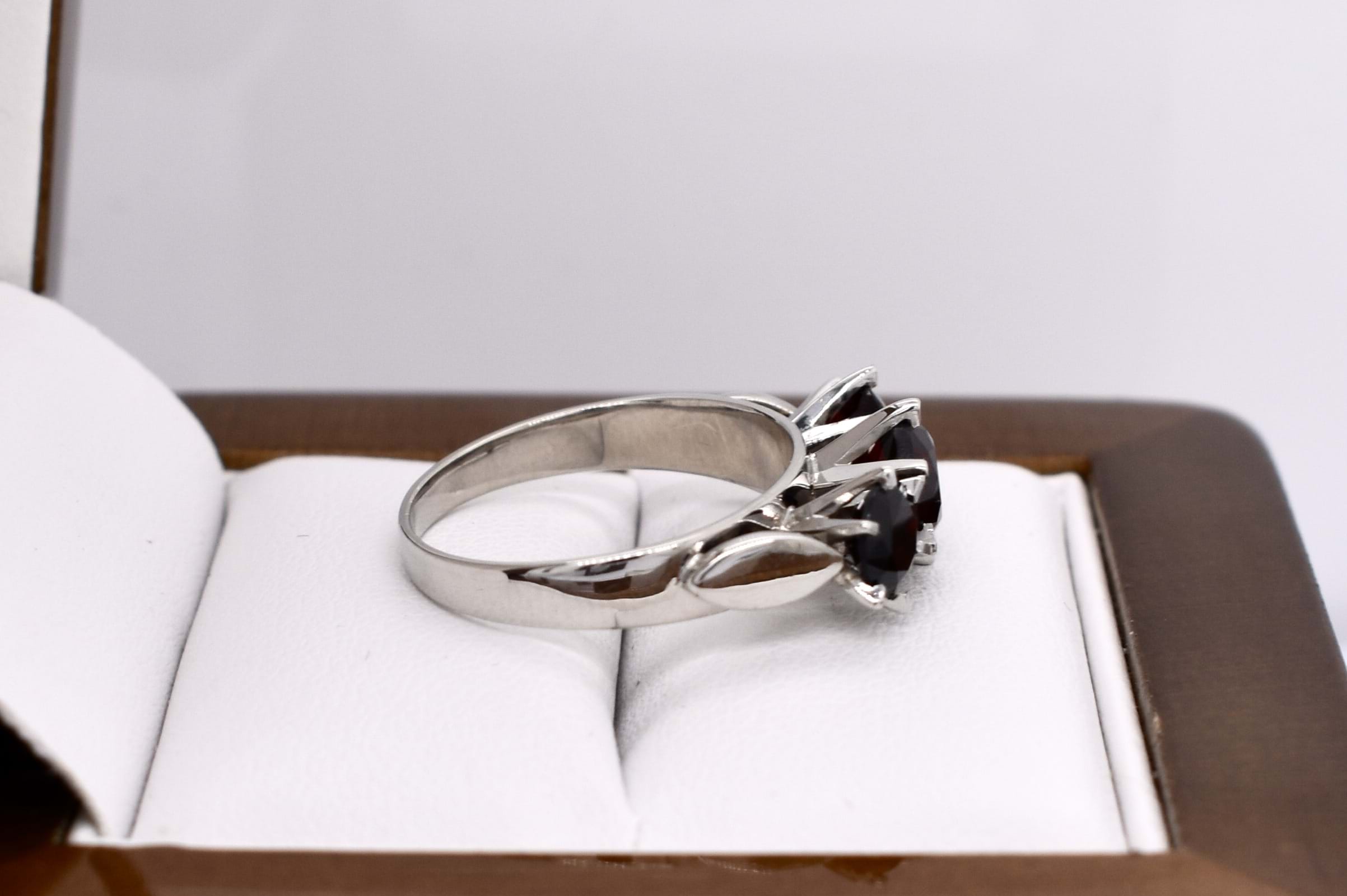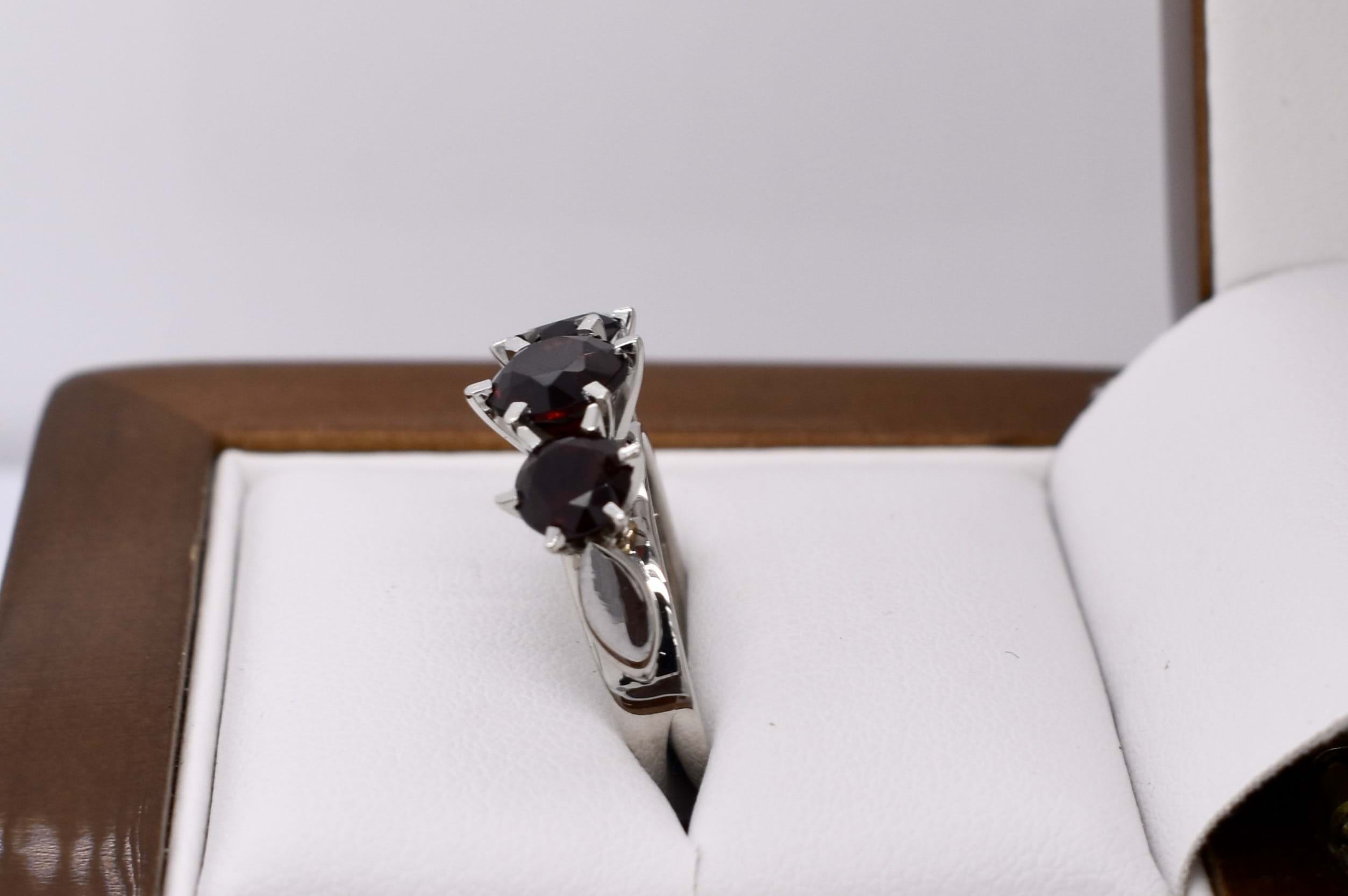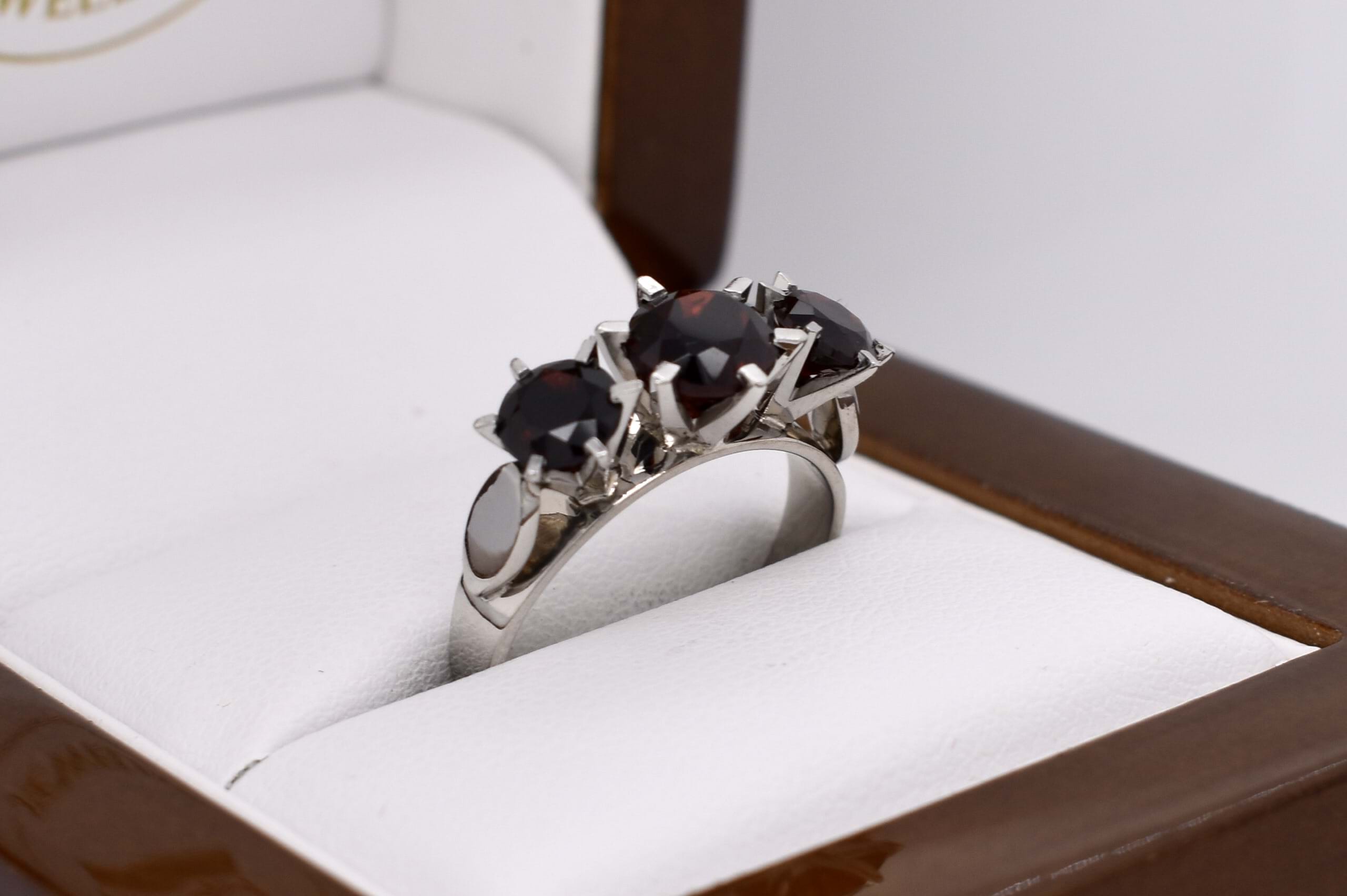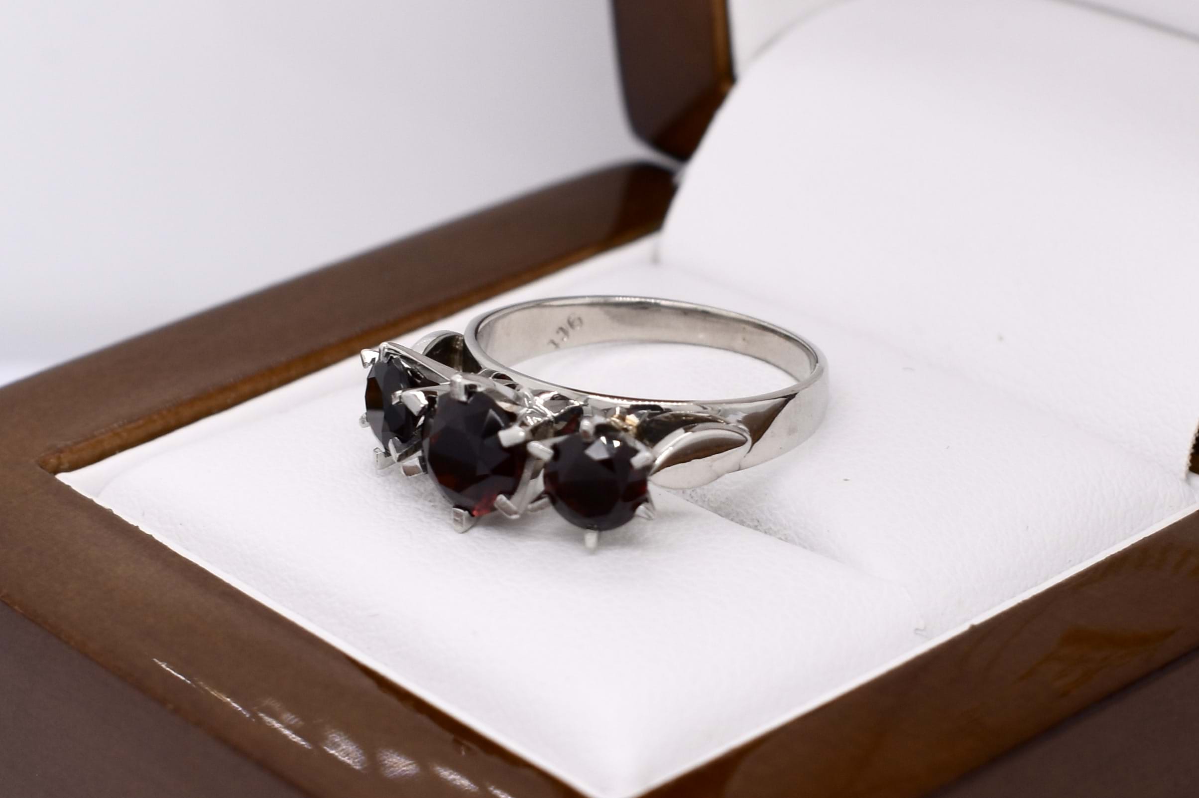 Awesome vintage find! This 9ct white gold ring features a centre 6mm round garnet, with two 5mm round garnets either side. They are 6 claw set on a plain band. 3.40 grams.