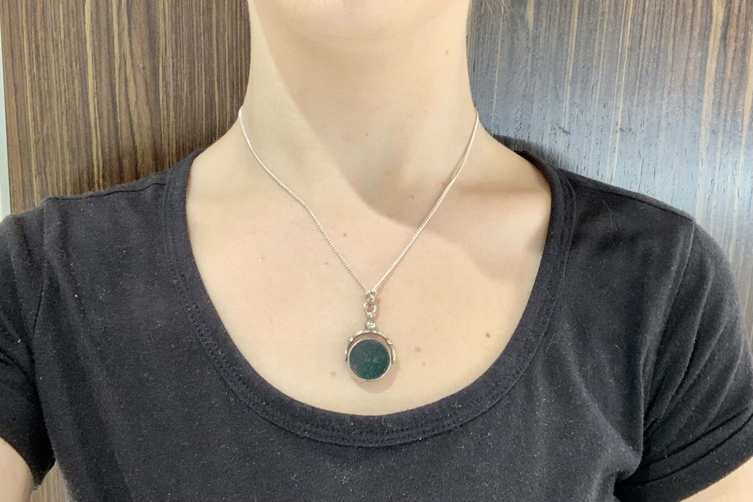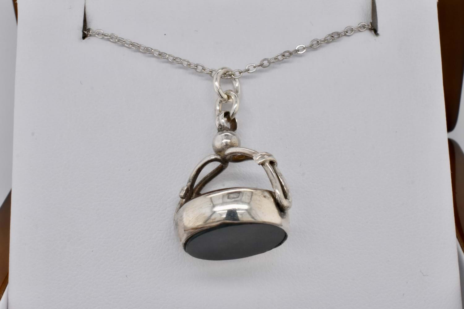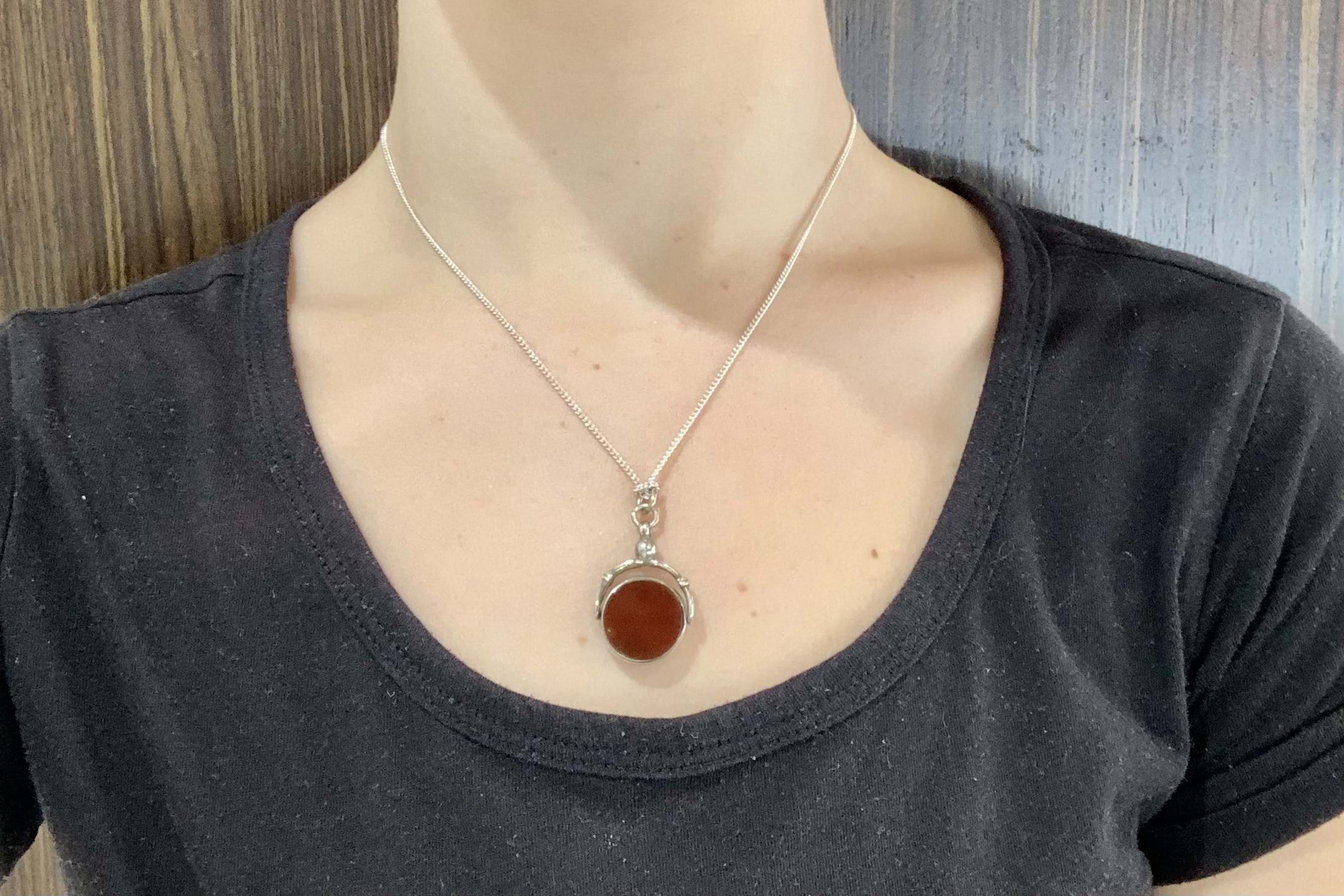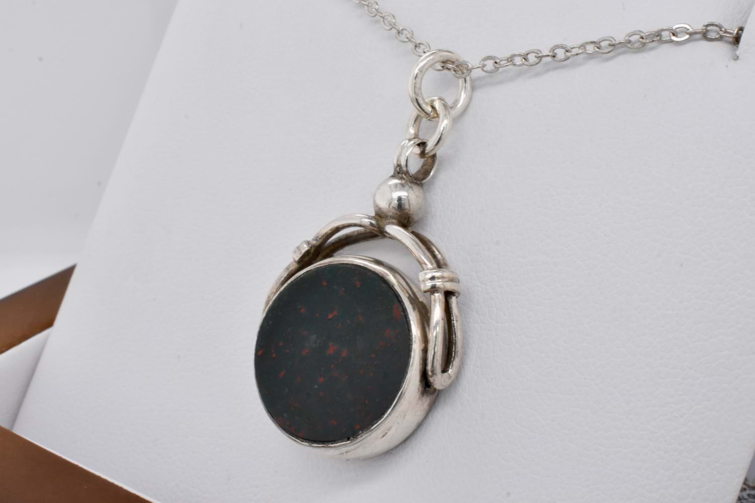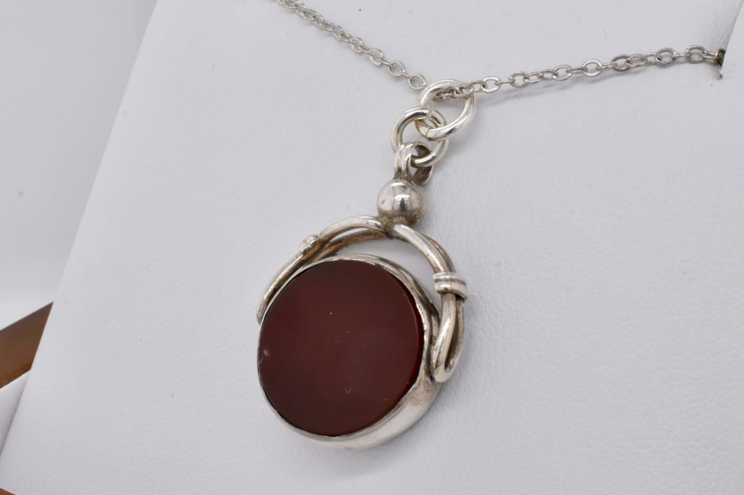 Beautiful antique spinner crafted in sterling silver with an unusual knot twist top and bloodstone & carnelian tablets. Circa 1900