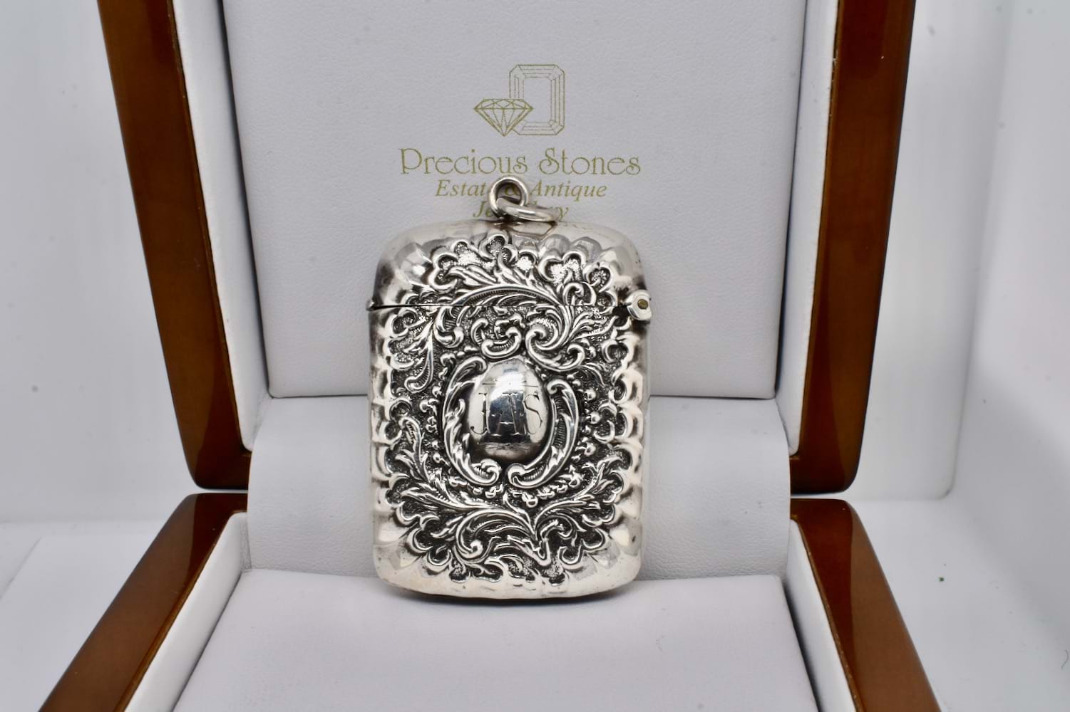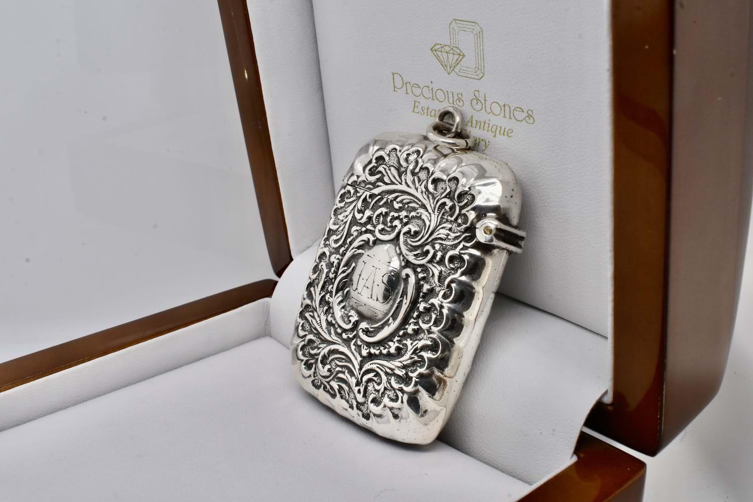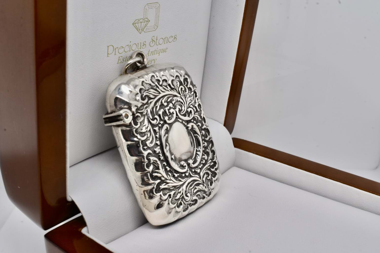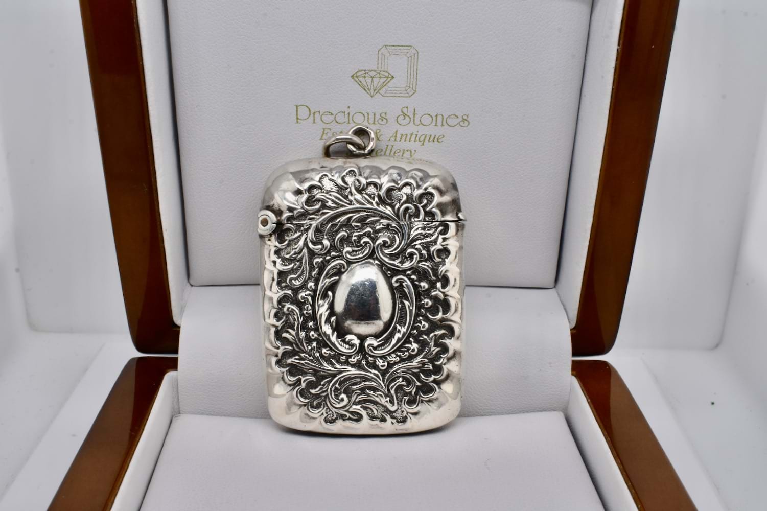 A beautiful delicately embossed sterling silver vesta case, hallmarked Birmingham 1894 with a plain oval cartouche and an initialled "JG" cartouche. Measures approx. 64x40mm with attached jumpring ideal to suspend from an Albert chain or muff chain.