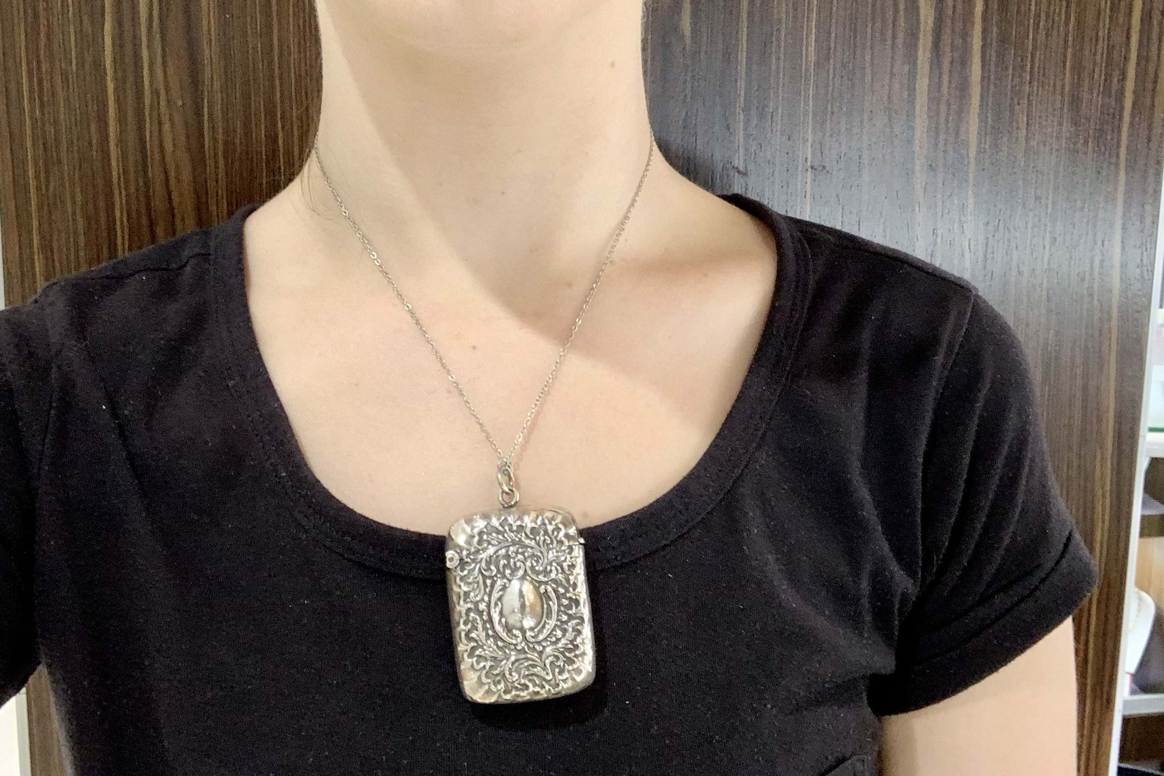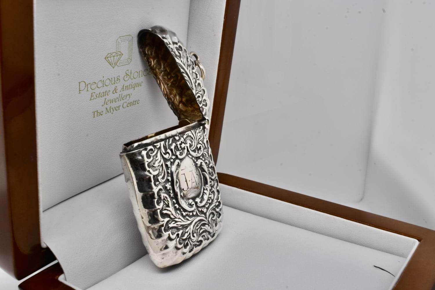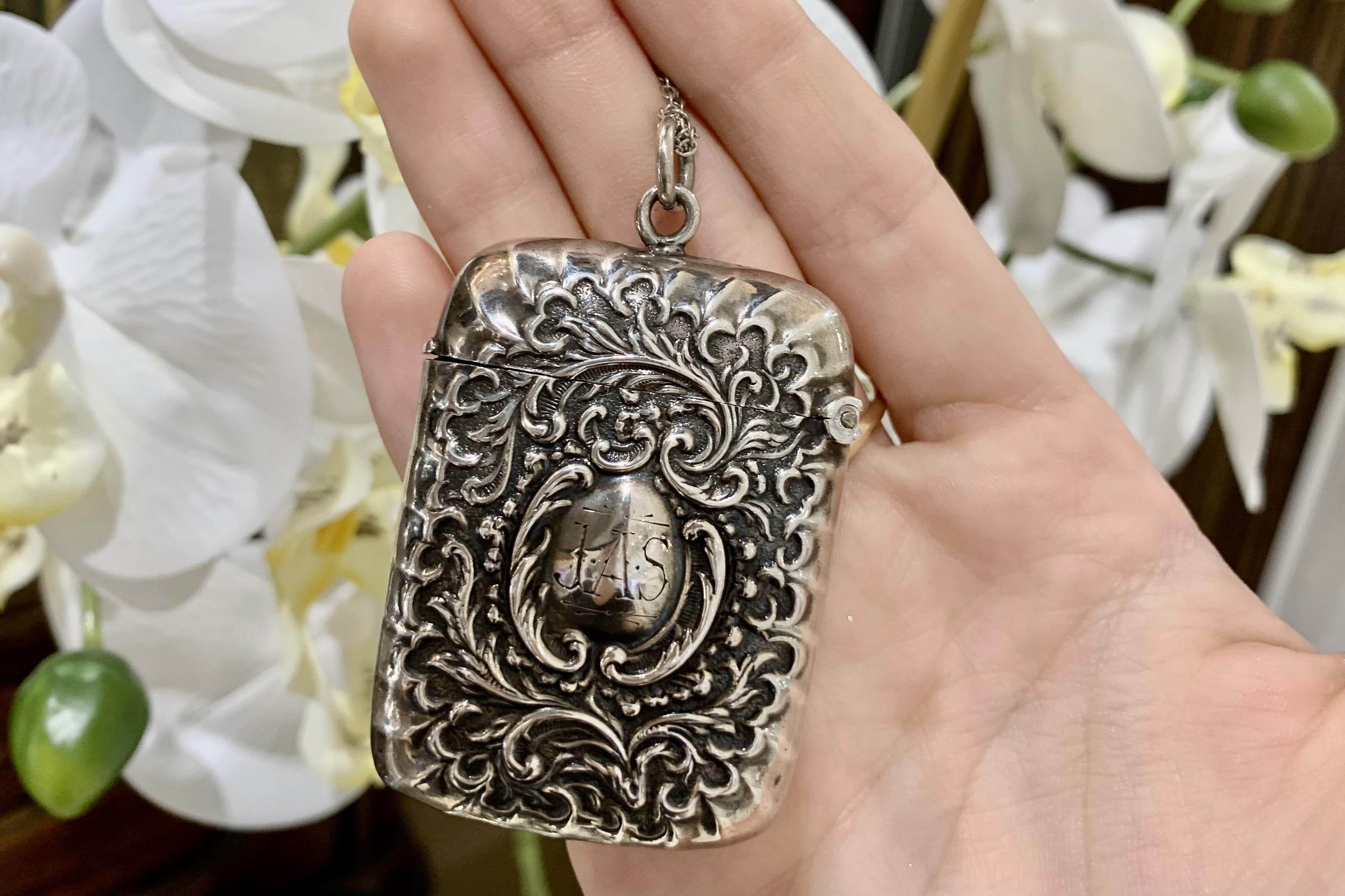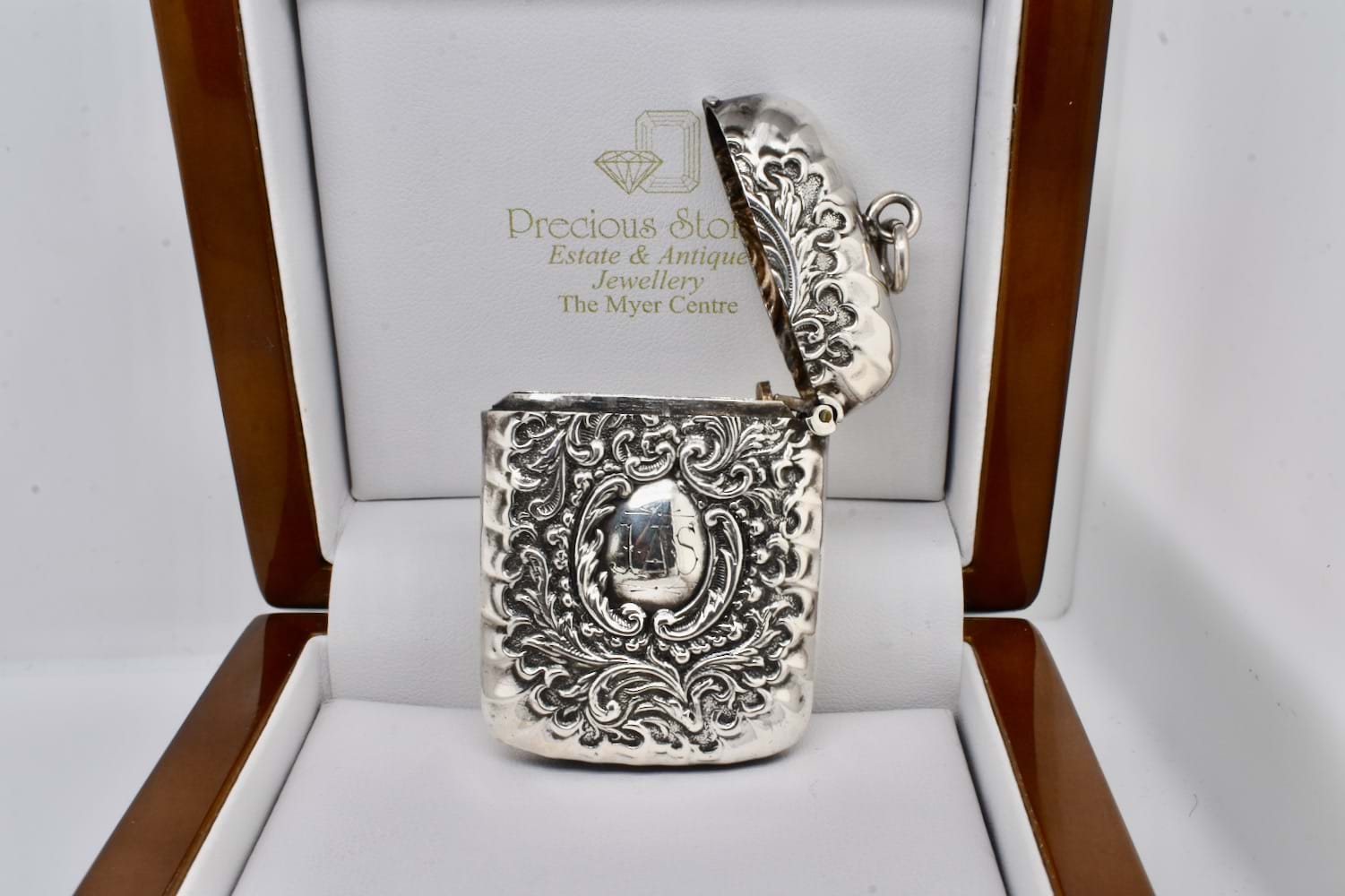 A beautiful delicately embossed sterling silver vesta case, hallmarked Birmingham 1894 with a plain oval cartouche and an initialled "JG" cartouche. Measures approx. 64x40mm with attached jumpring ideal to suspend from an Albert chain or muff chain.
