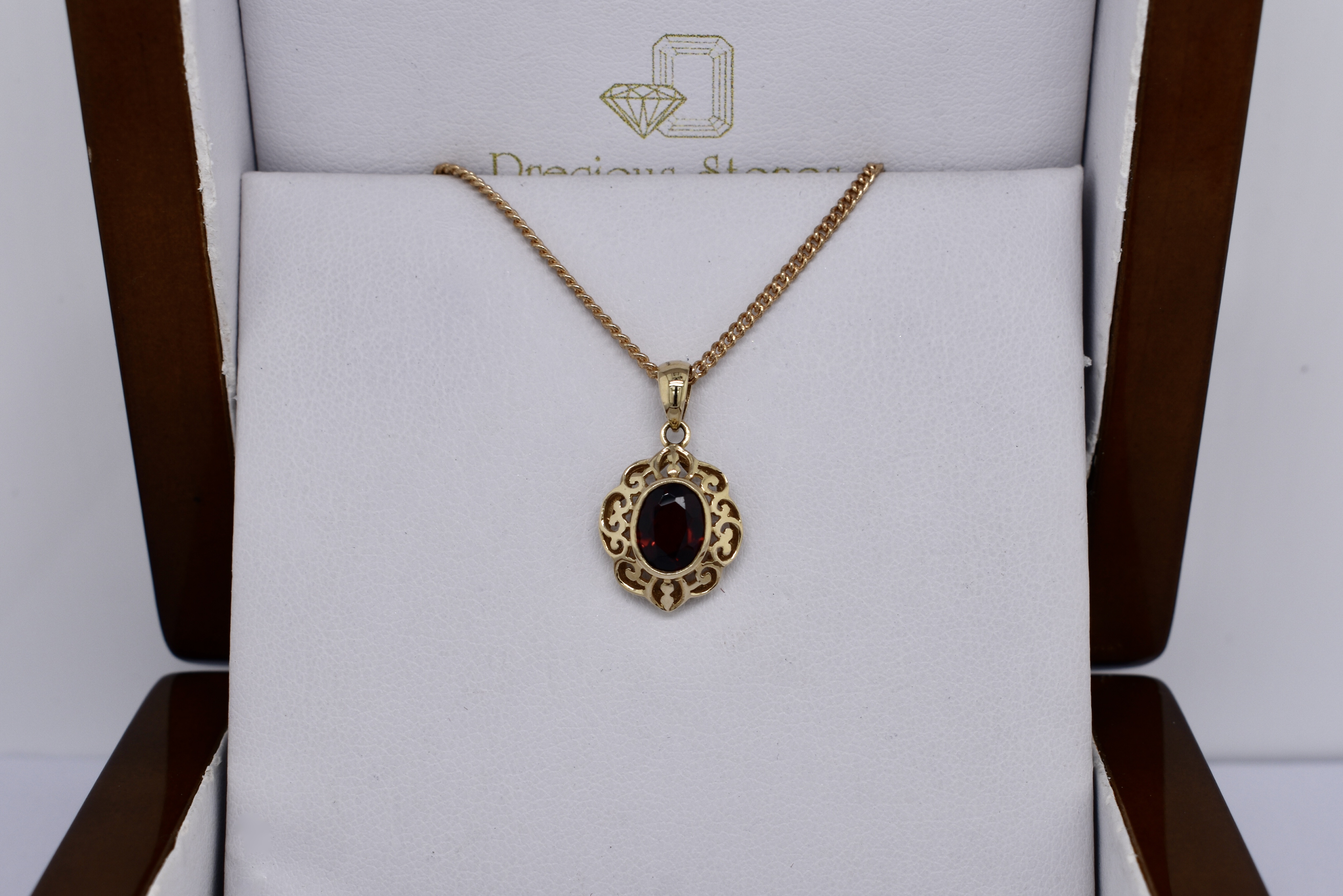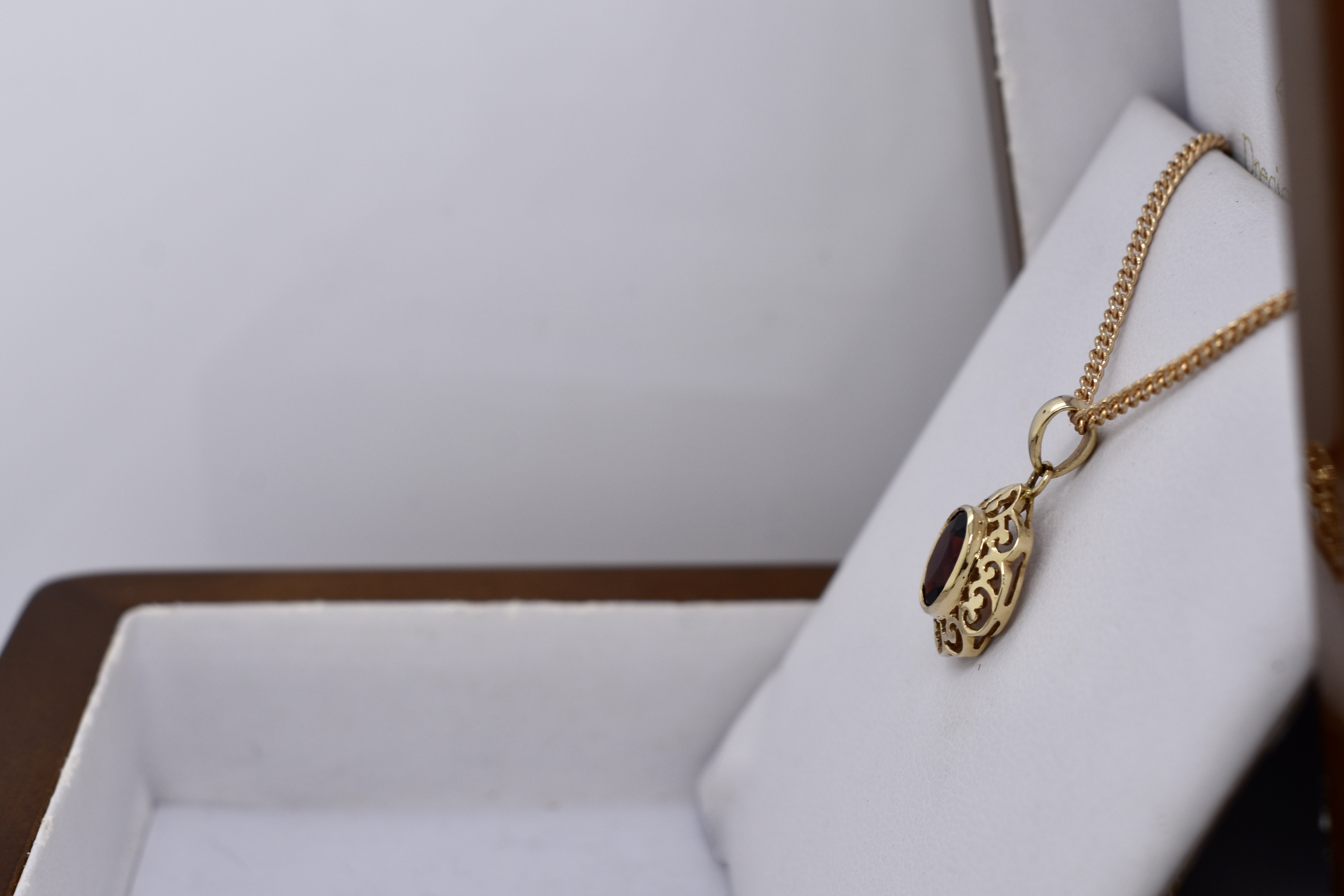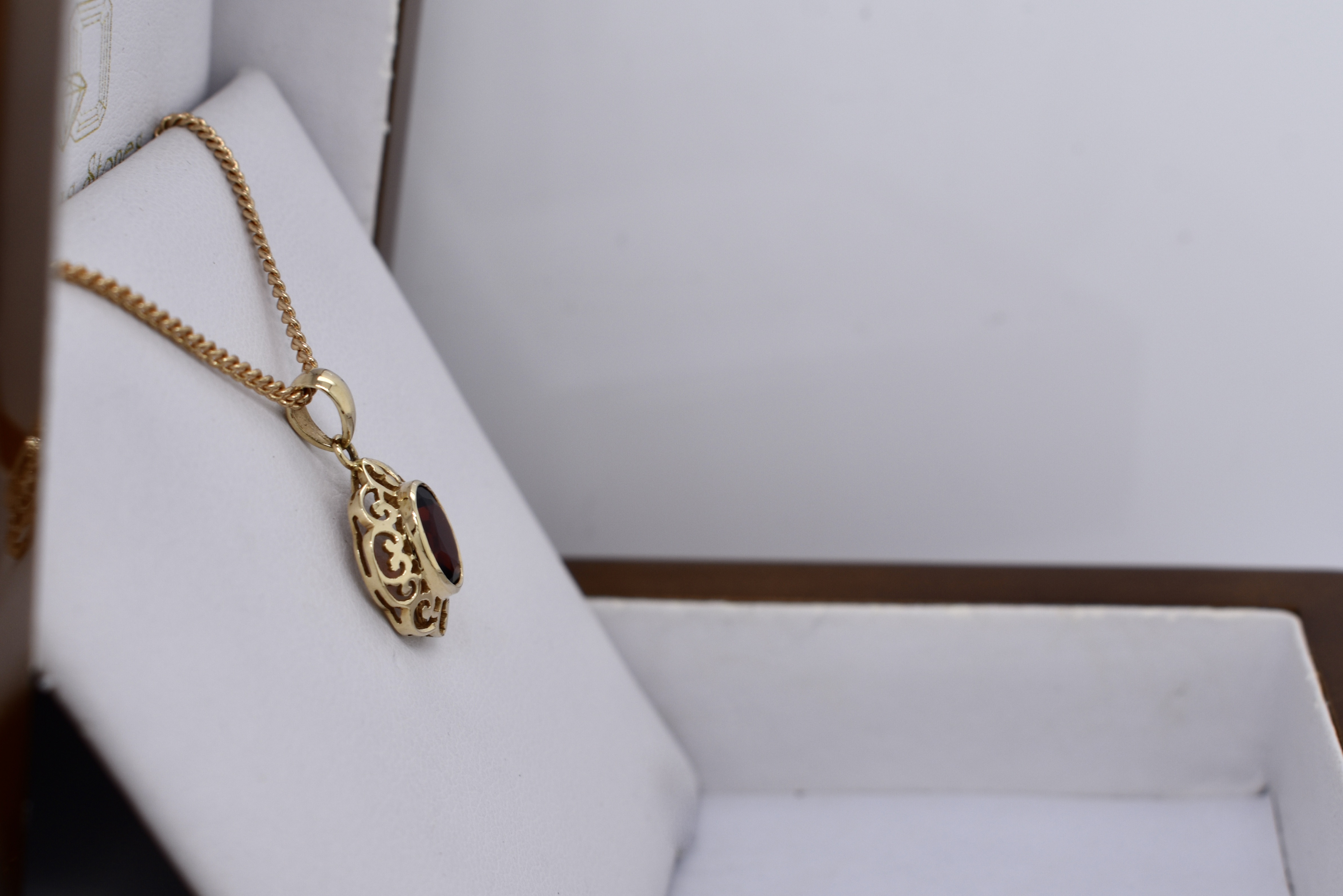 This lovely 9ct yellow gold pendant, features an oval cabochon garnet measuring 7.5x5.5mm, bezel set with a beautiful filigree style border. Completed with a plain pendant bale. Chains are available for separate purchase.