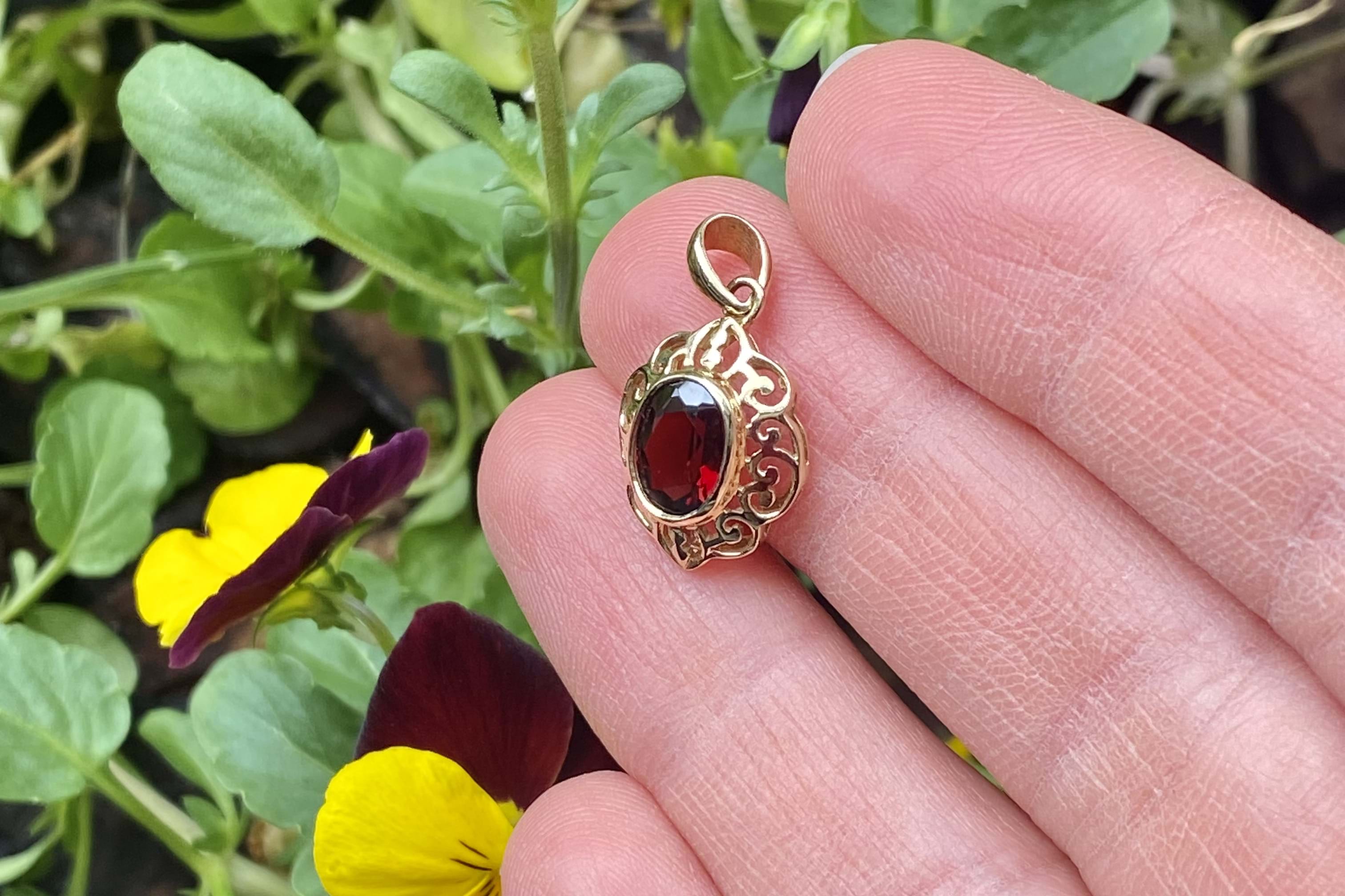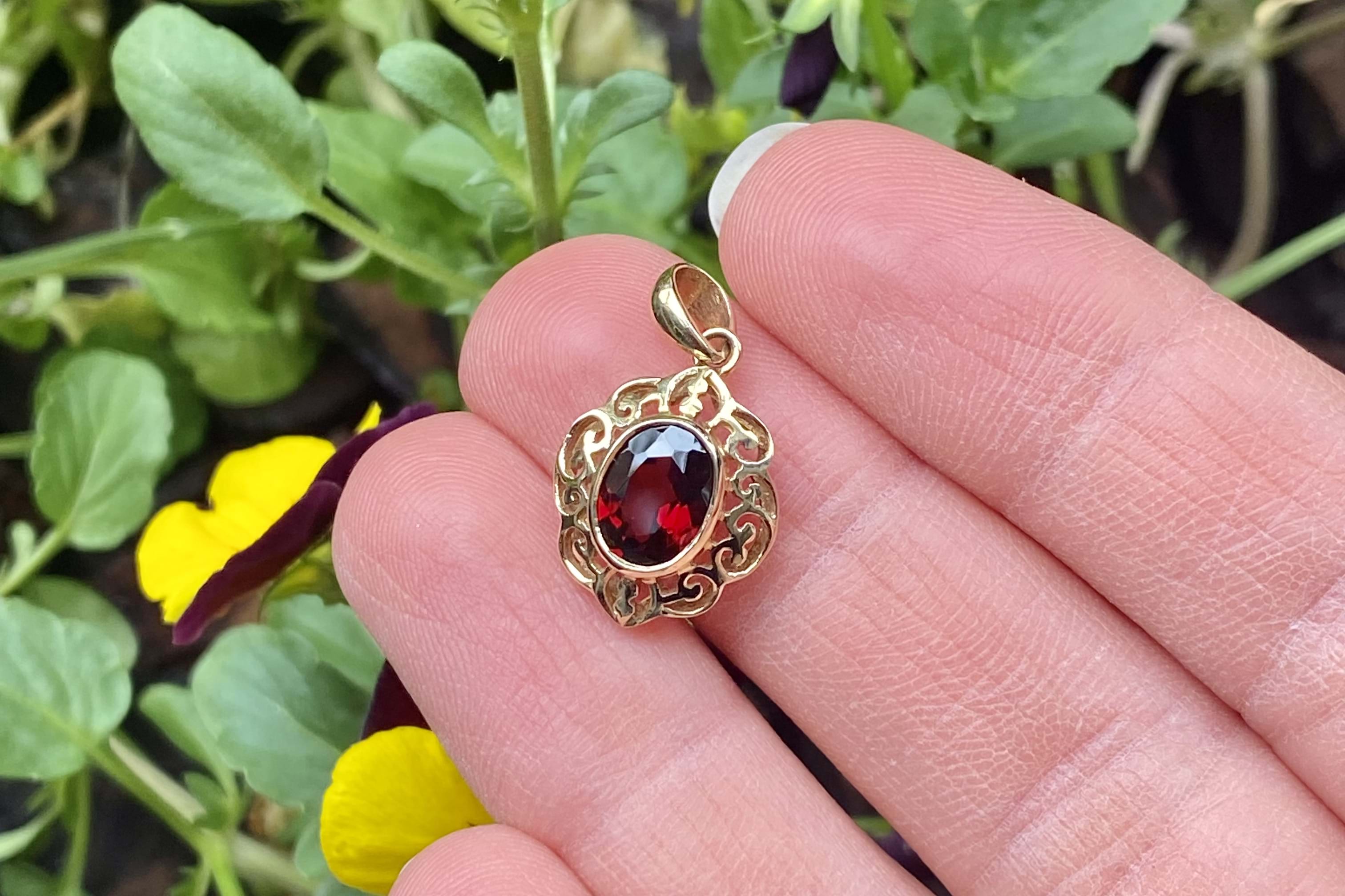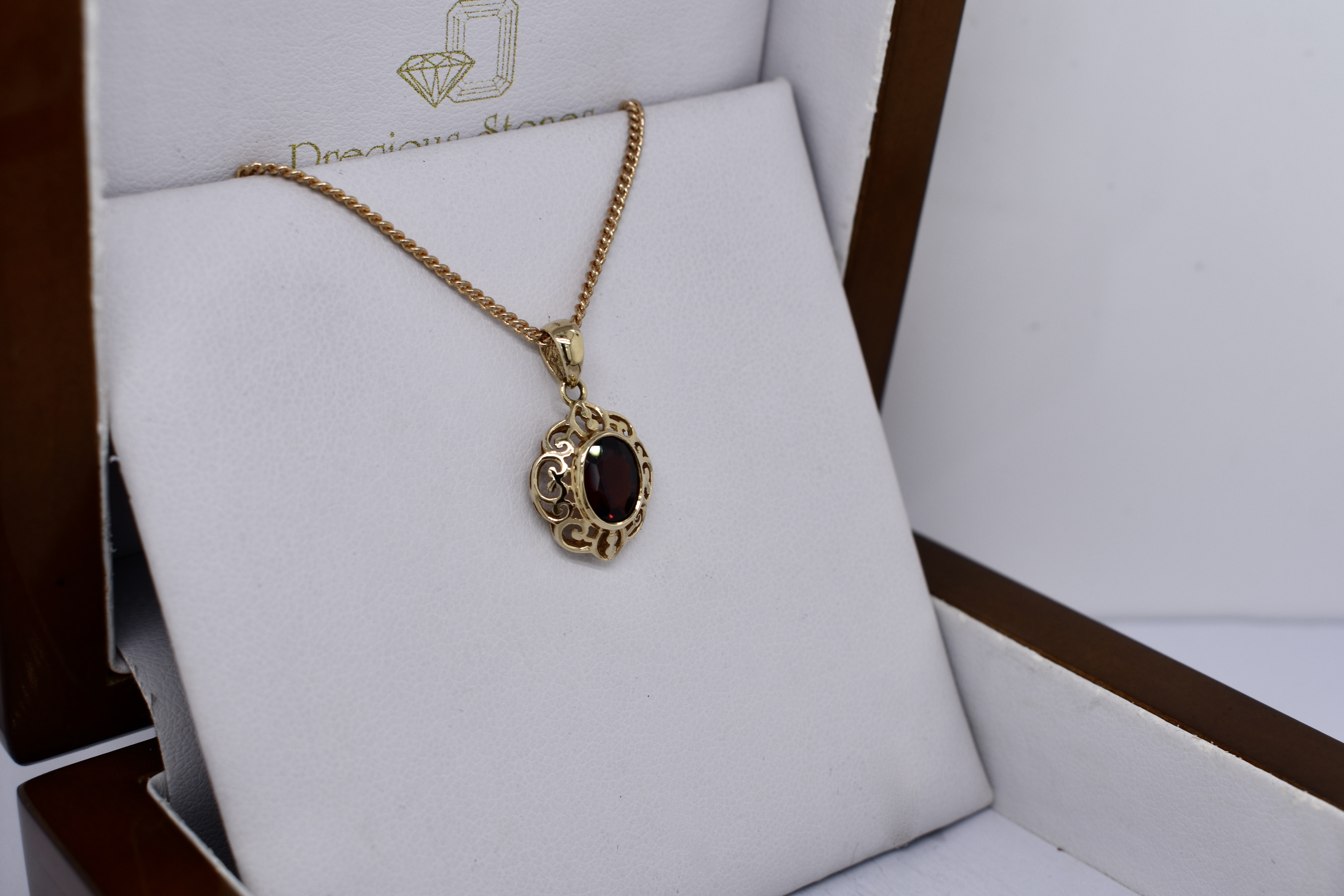 This lovely 9ct yellow gold pendant, features an oval cabochon garnet measuring 7.5x5.5mm, bezel set with a beautiful filigree style border. Completed with a plain pendant bale. Chains are available for separate purchase.