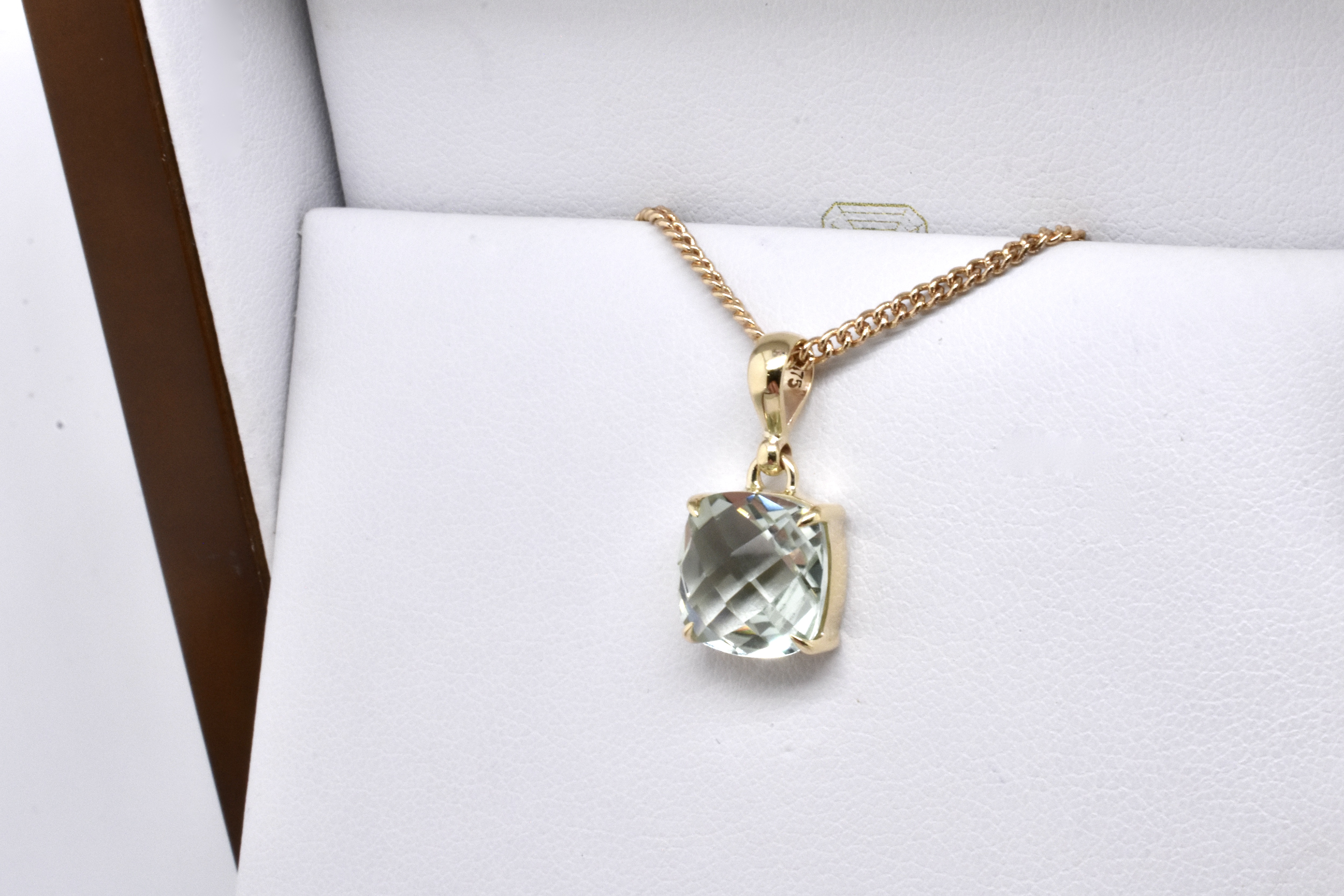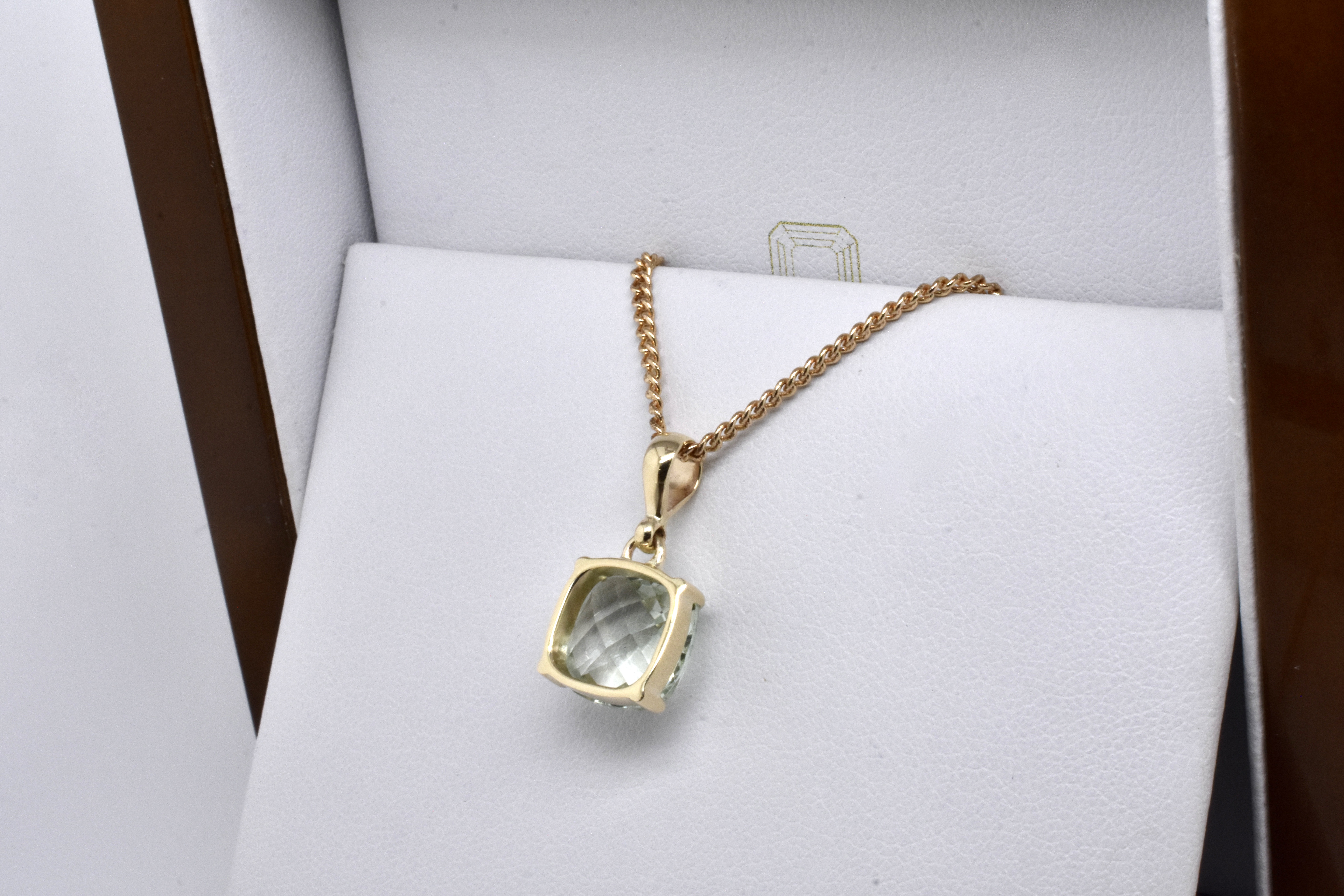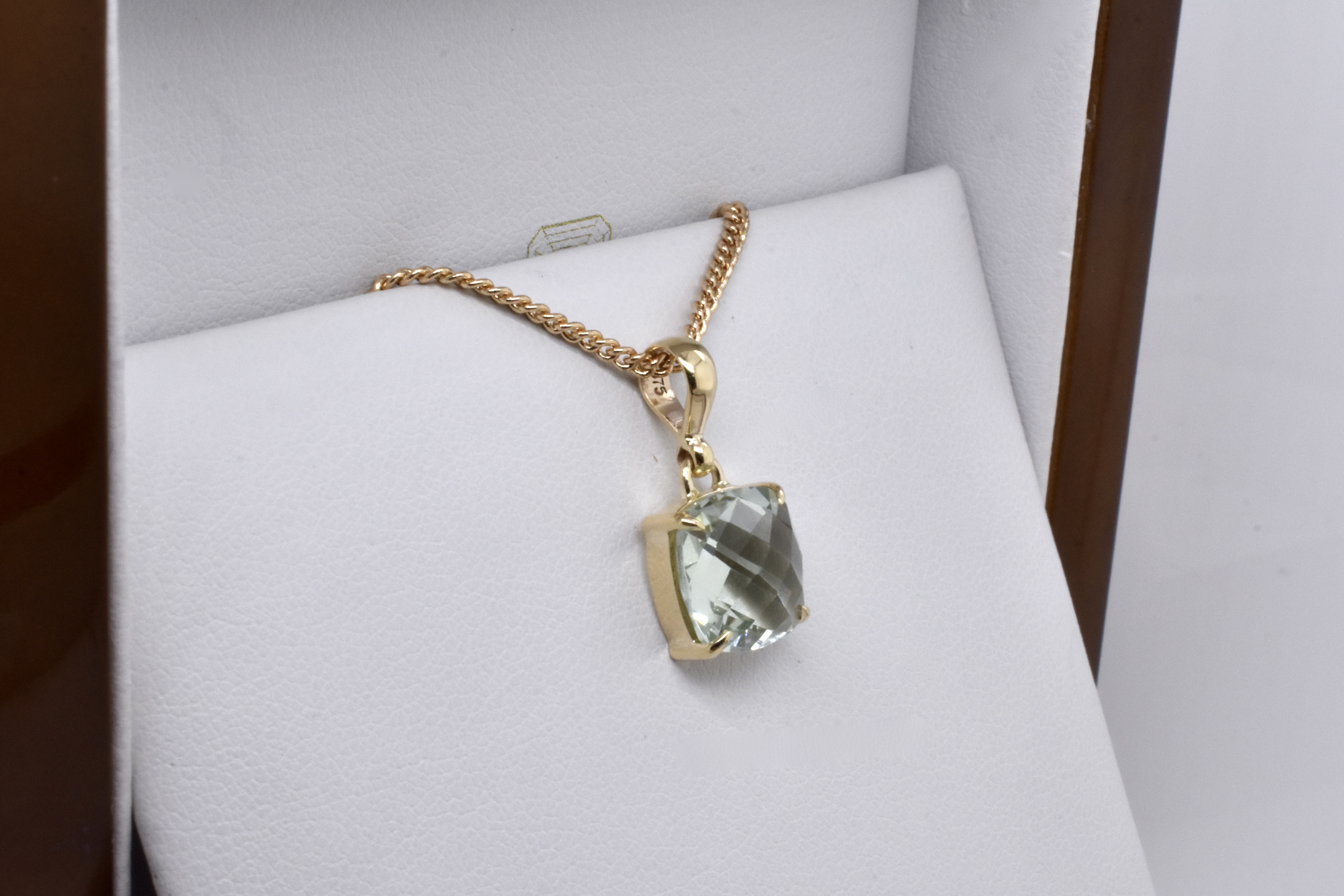 This cute pendant is handmade and crafted in 9ct yellow gold, with an approx. 10mm cushion prasiolite with shimmering chequerboard faceting, 4 claw set with a plain tapered bail. Chains available for separate purchase