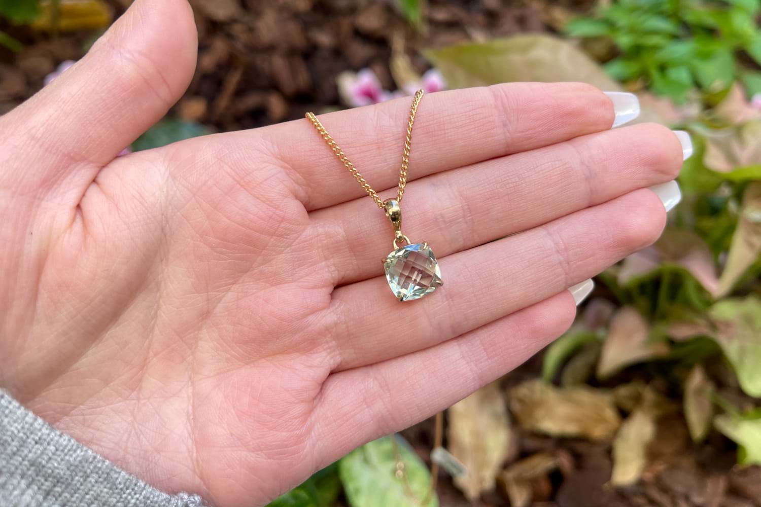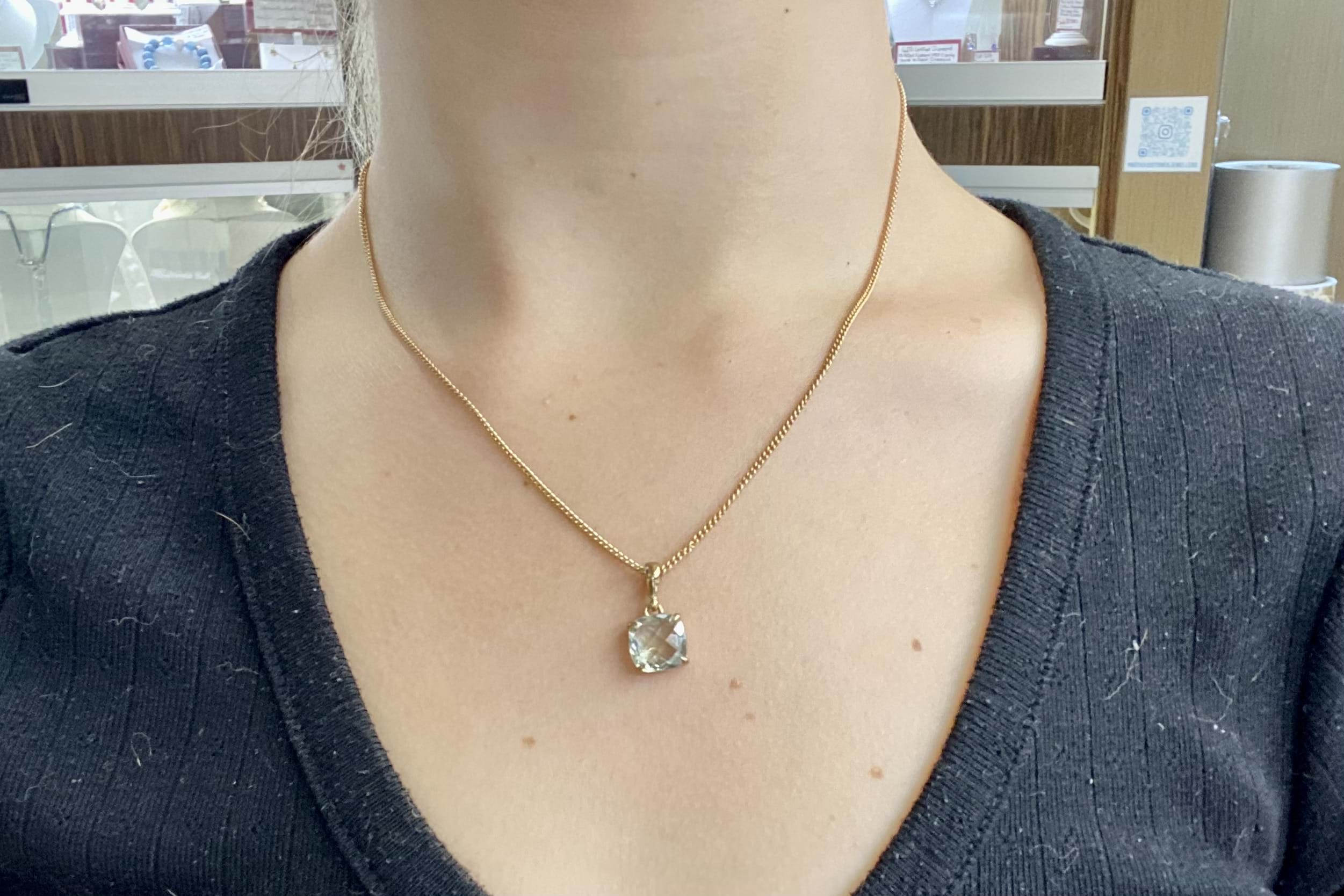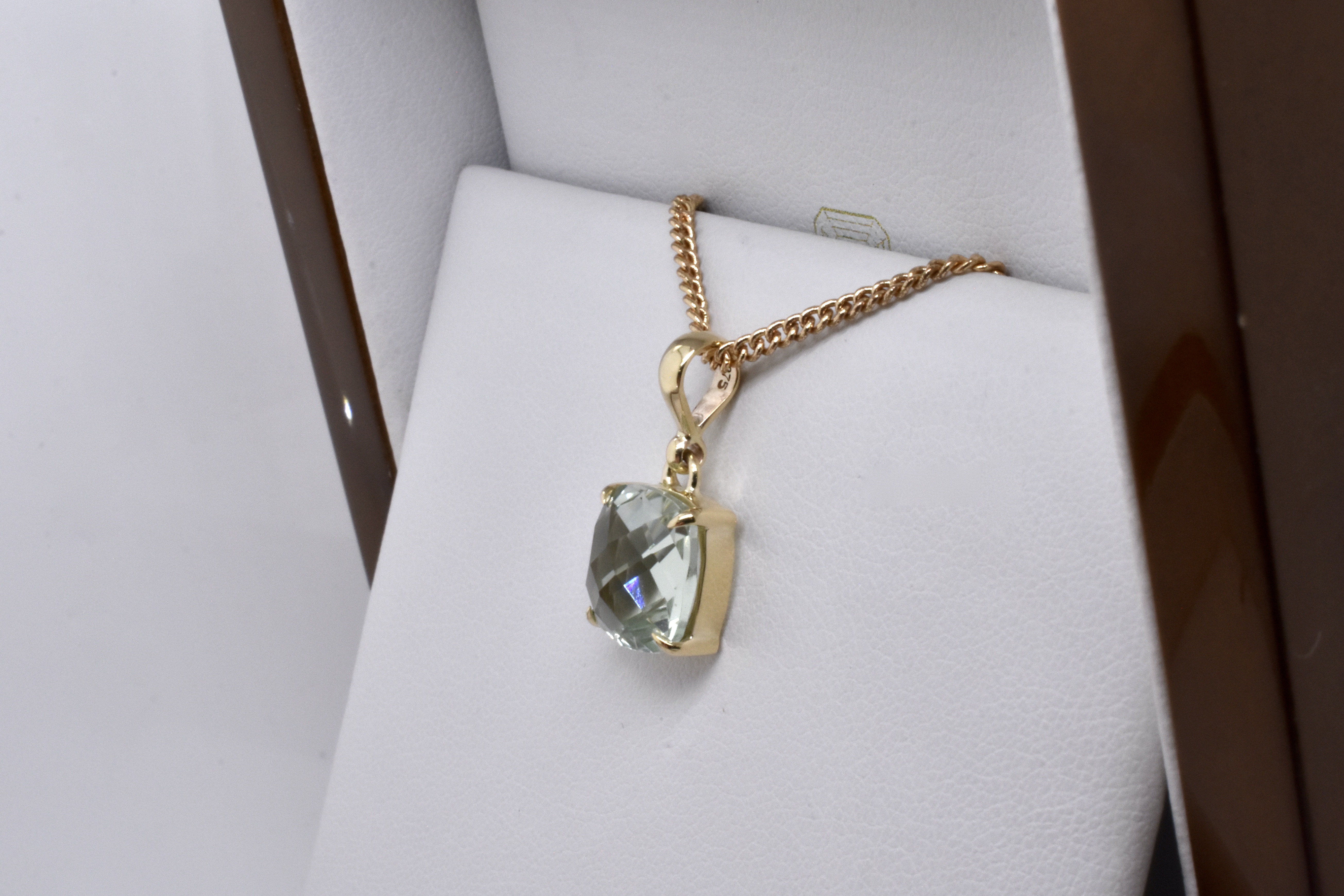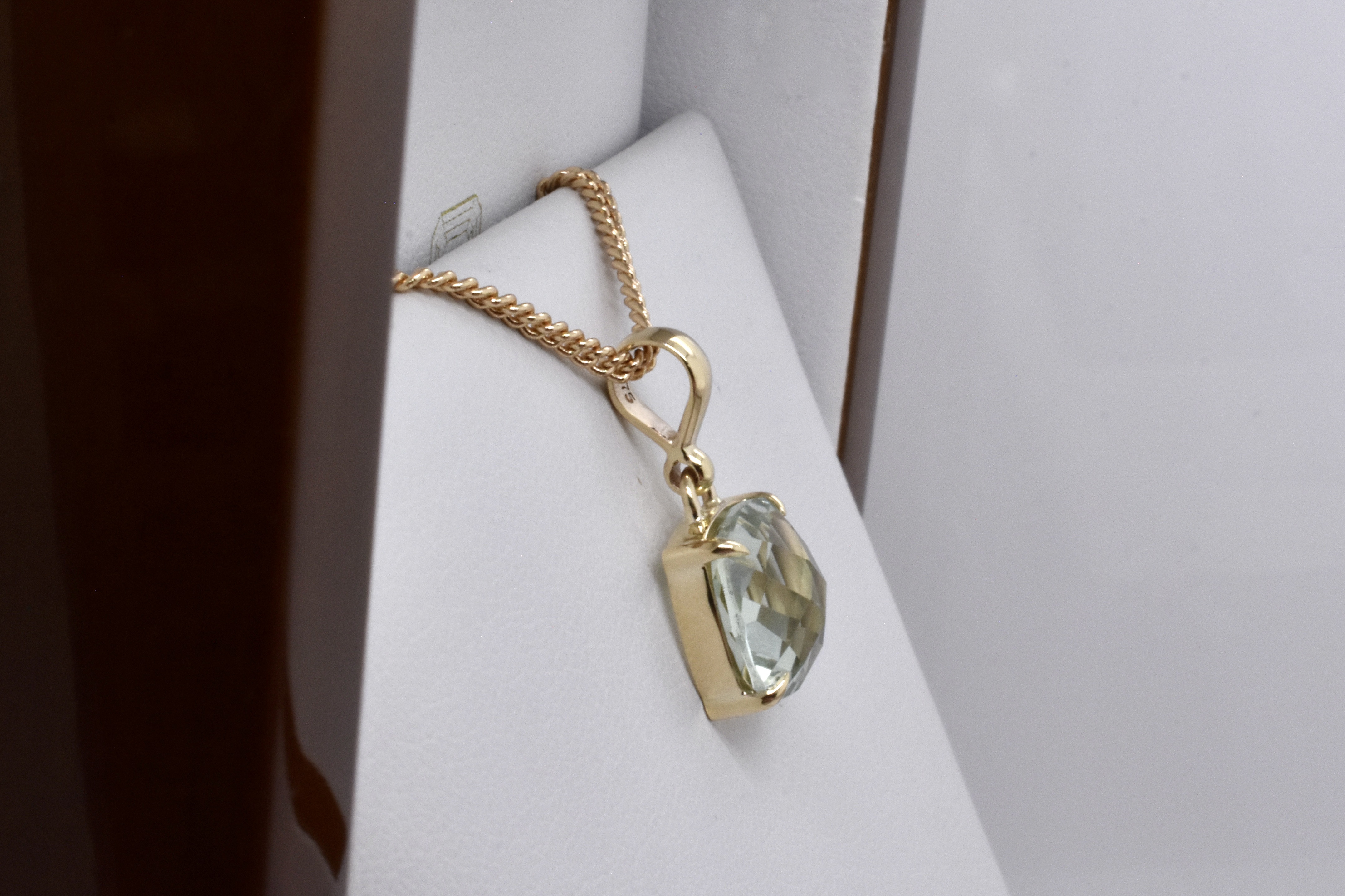 This cute pendant is handmade and crafted in 9ct yellow gold, with an approx. 10mm cushion prasiolite with shimmering chequerboard faceting, 4 claw set with a plain tapered bail. Chains available for separate purchase