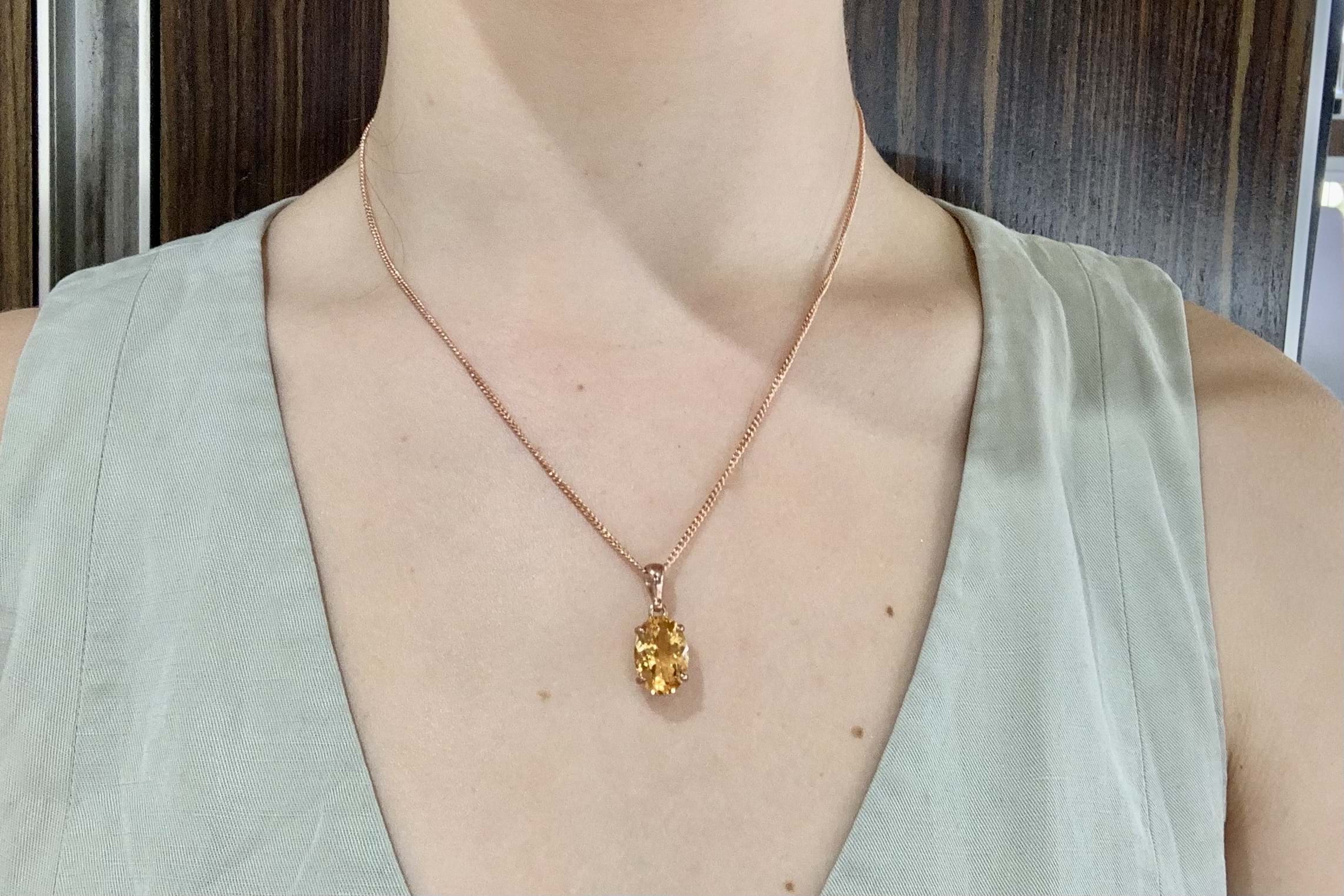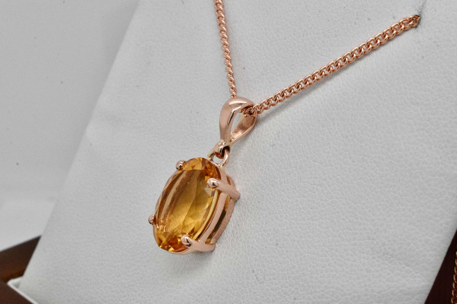 A striking oval faceted citrine measuring approx.13x10mm set into a handmade 9ct rose gold four claw pendant setting with a plain bale. Chains are available for separate purchase