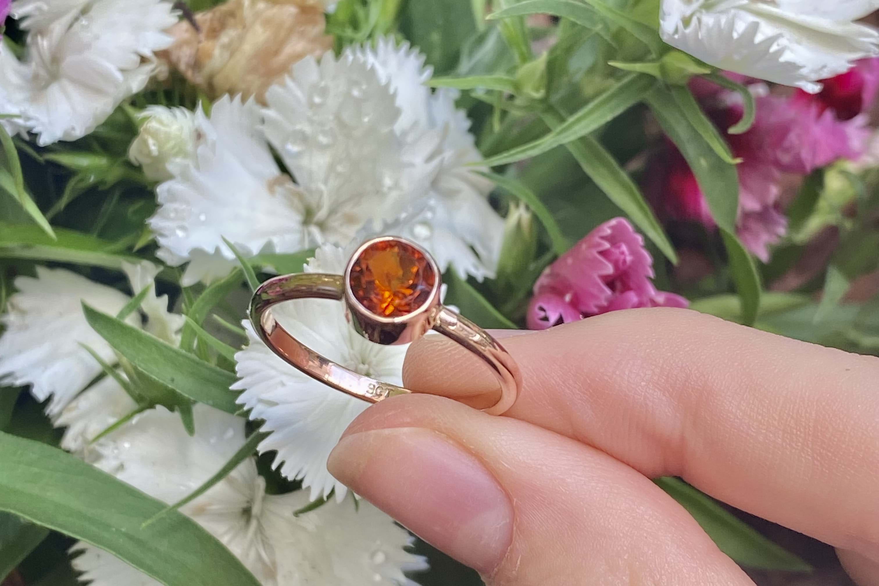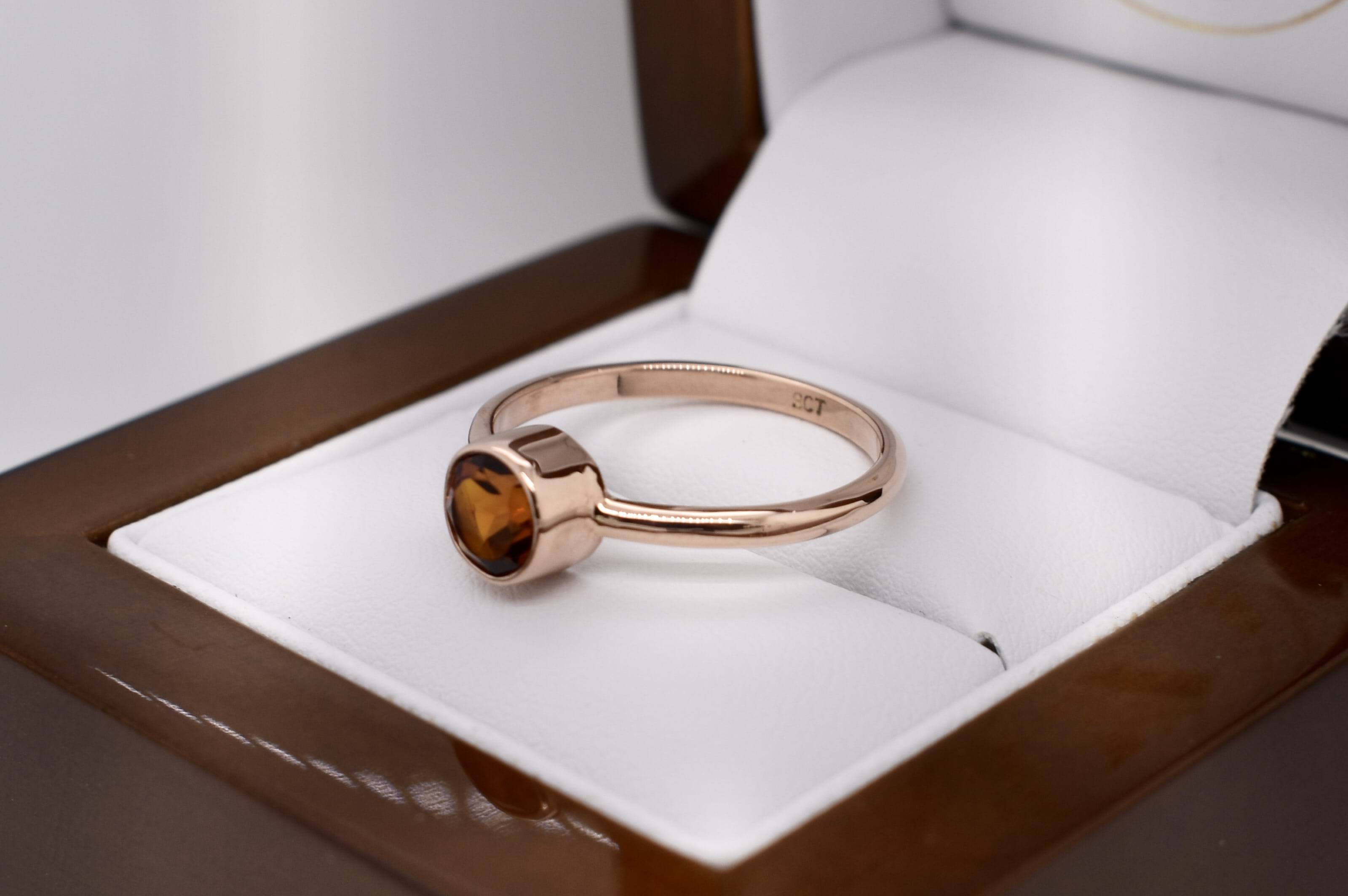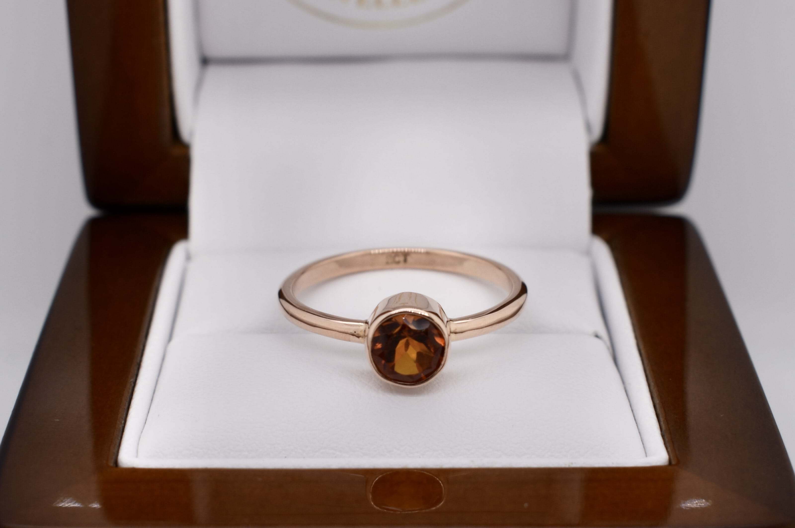 Crafted in 9ct rose gold, this dark orange citrine measures 6.9mm round set in a bezel with a simple plain band. Finger size Q+.
