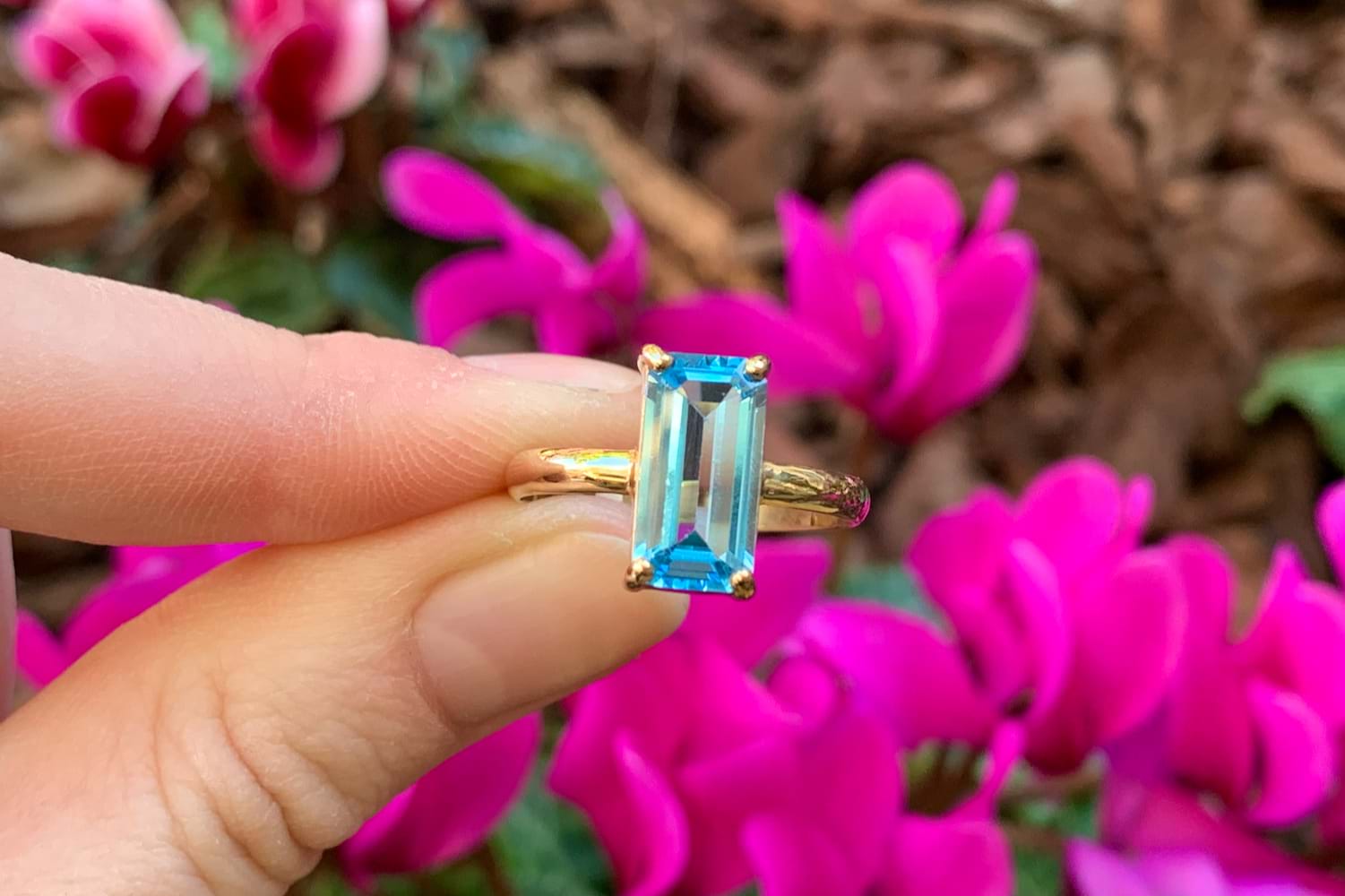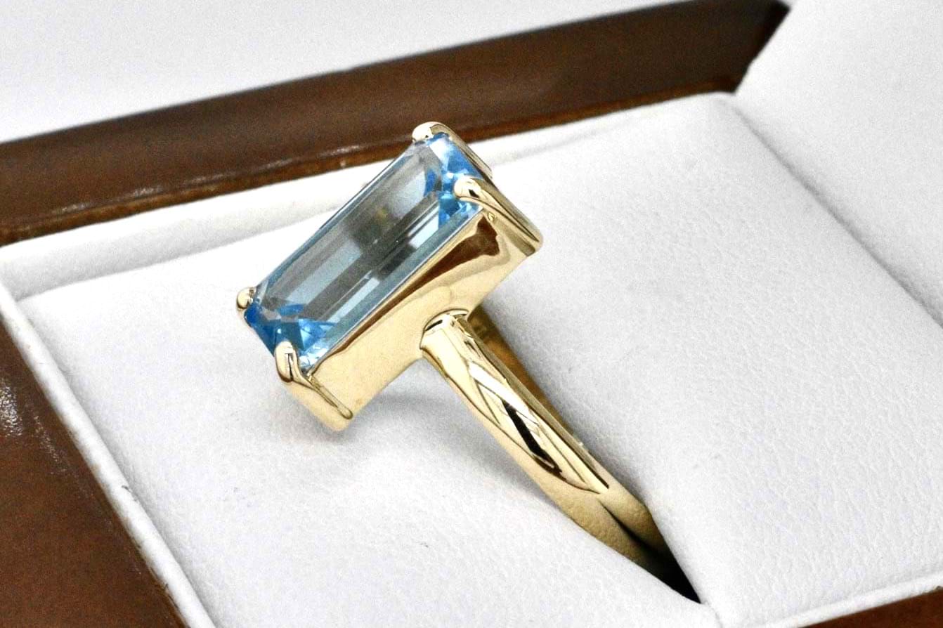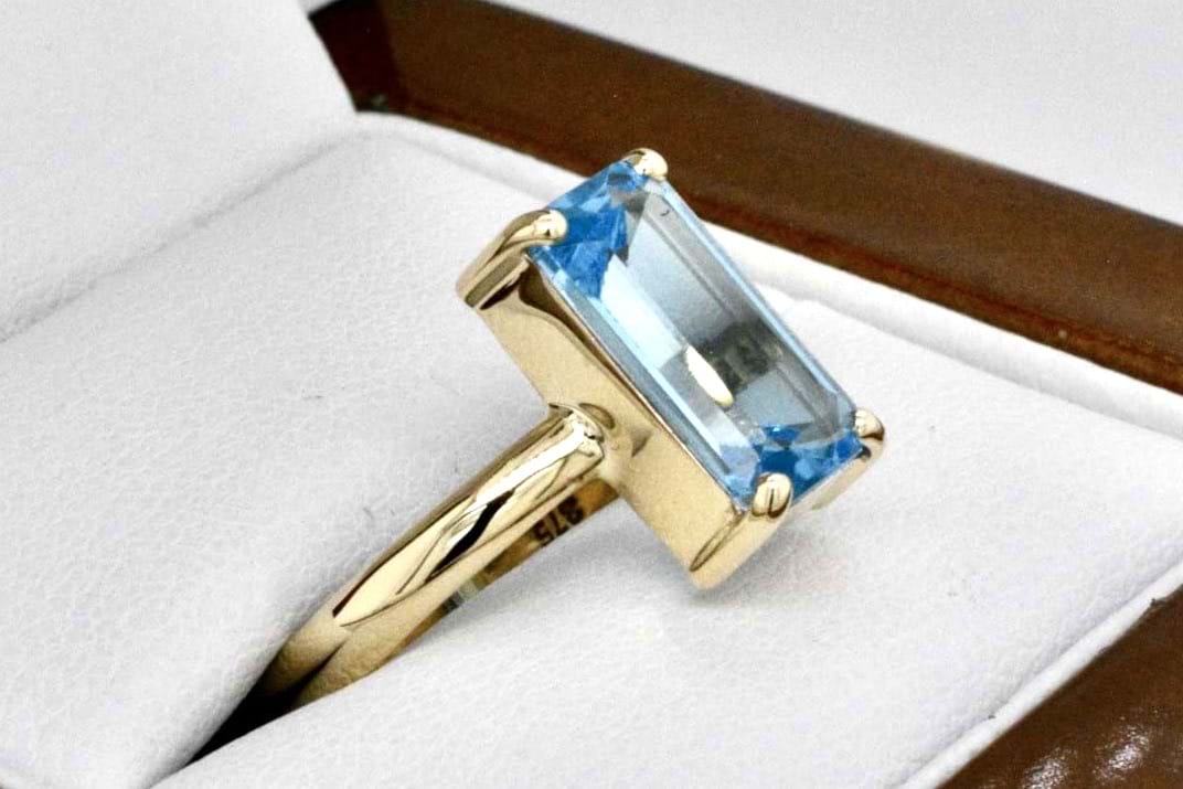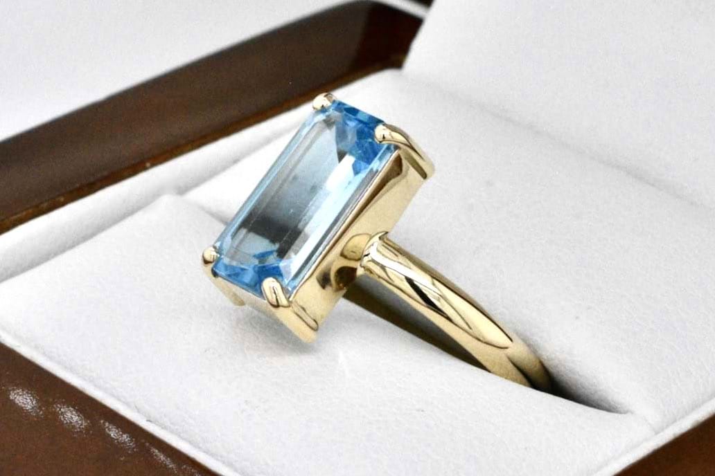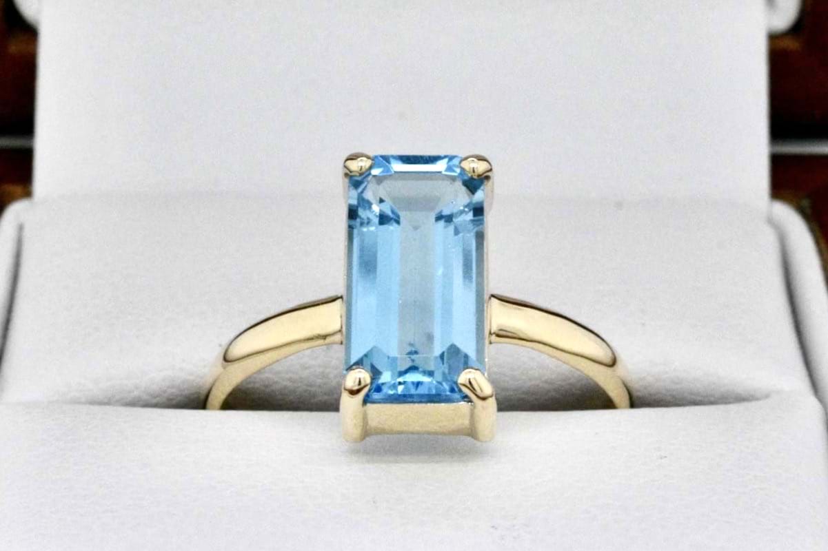 Stunning elongated baguette cut sky blue topaz measuring 13x7mm set into a simple and timeless handmade 9ct yellow gold four claw ring. Finger size R