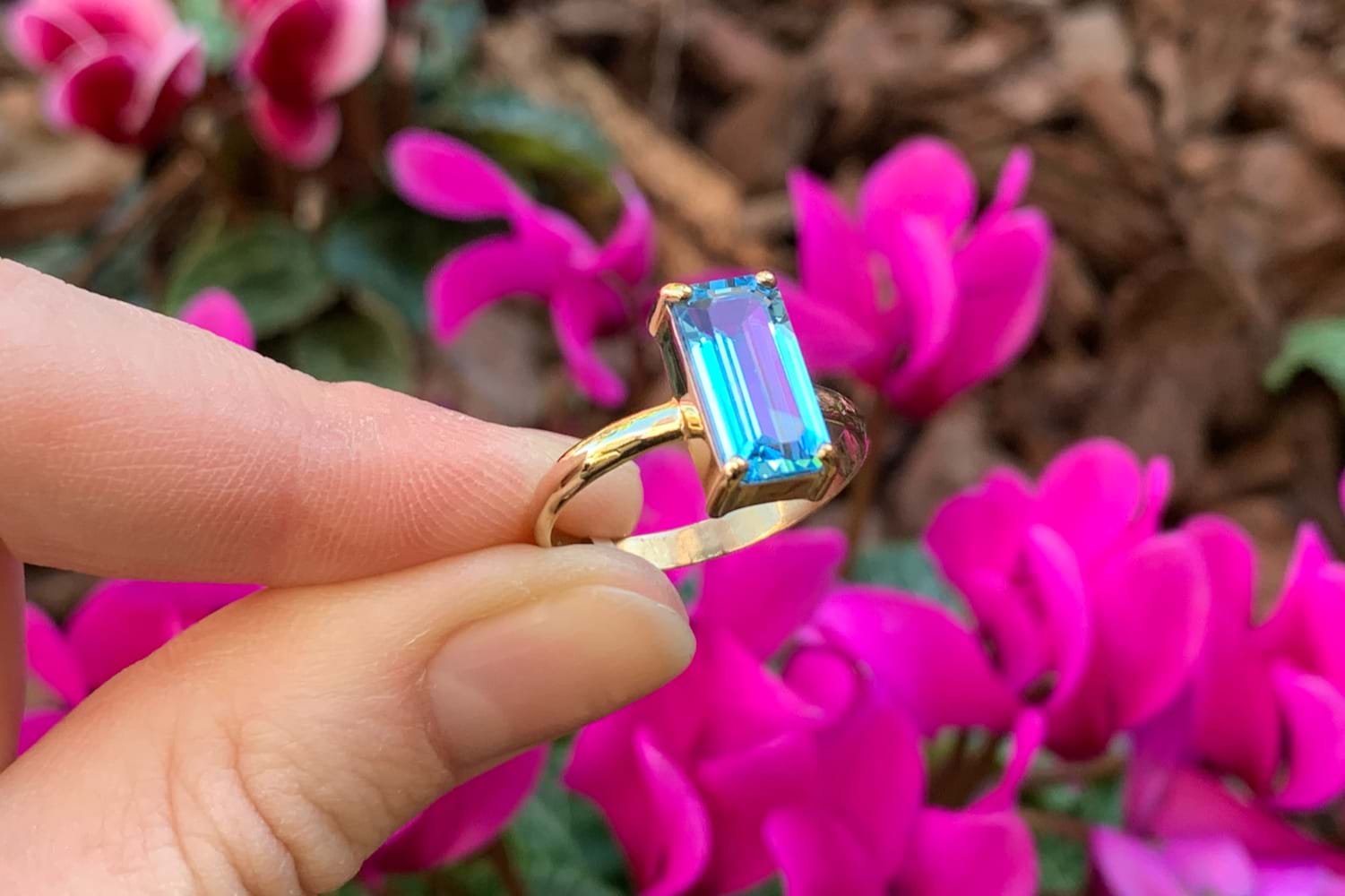 SOLD Handmade 9ct Yellow Gold 13x7mm Sky Blue Topaz Ring