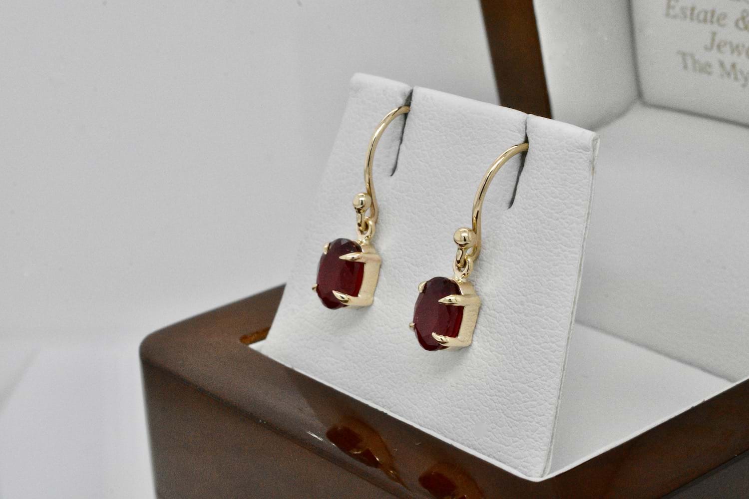 Simple and striking handmade 9ct yellow gold drop earrings featuring oval rubies (glass filled) measuring approx. 7x6mm set into four claw settings and suspended from shepherd hook fittings