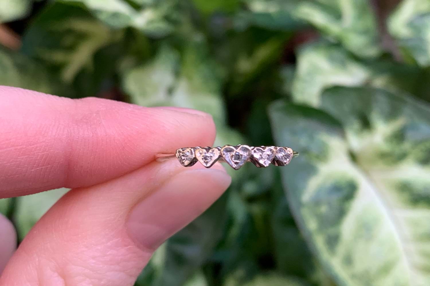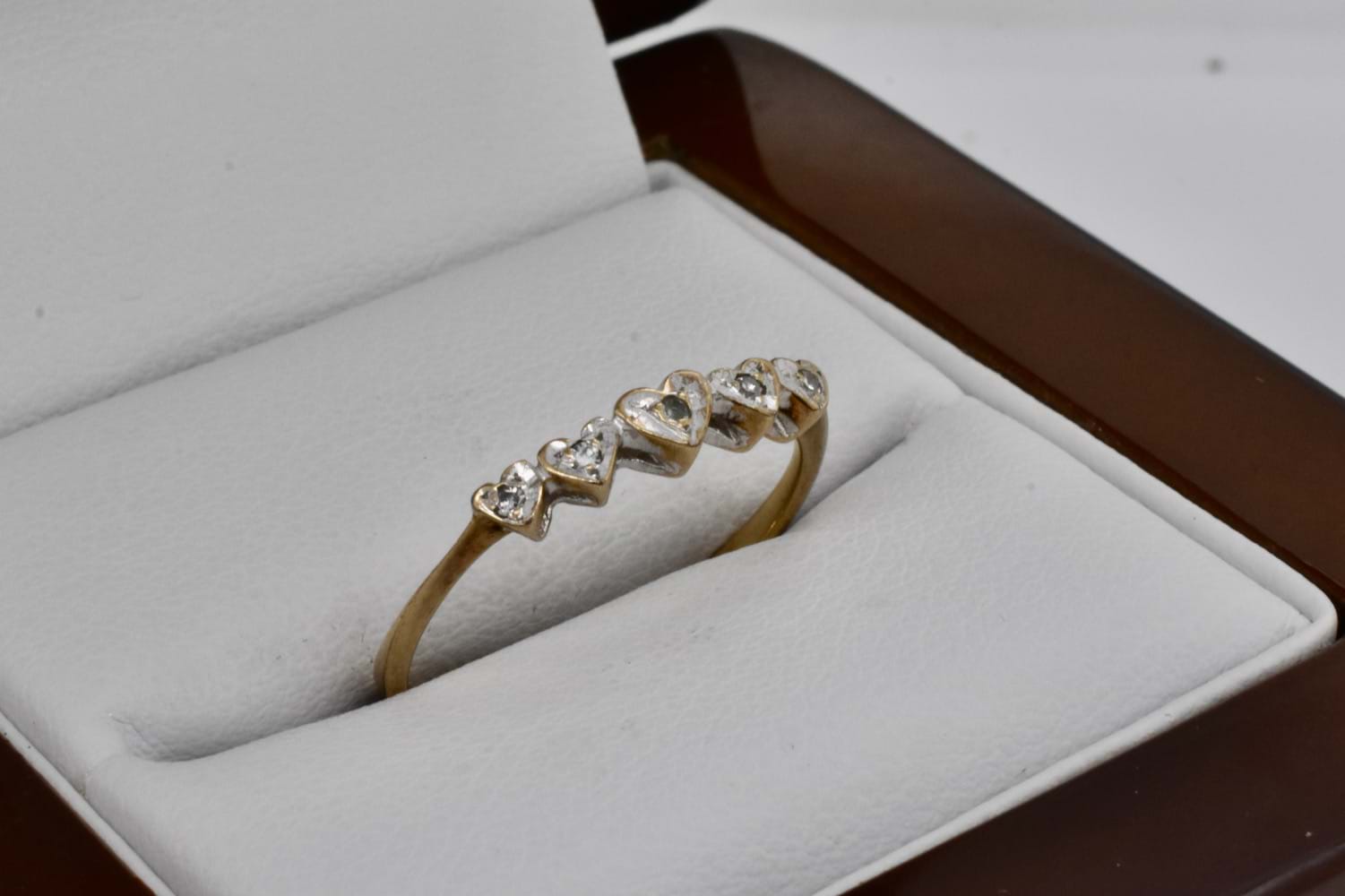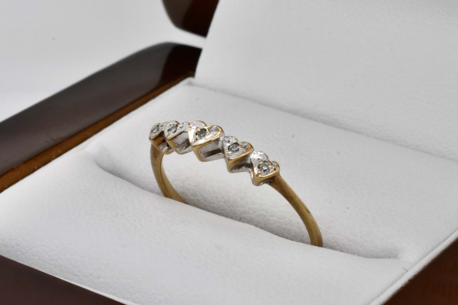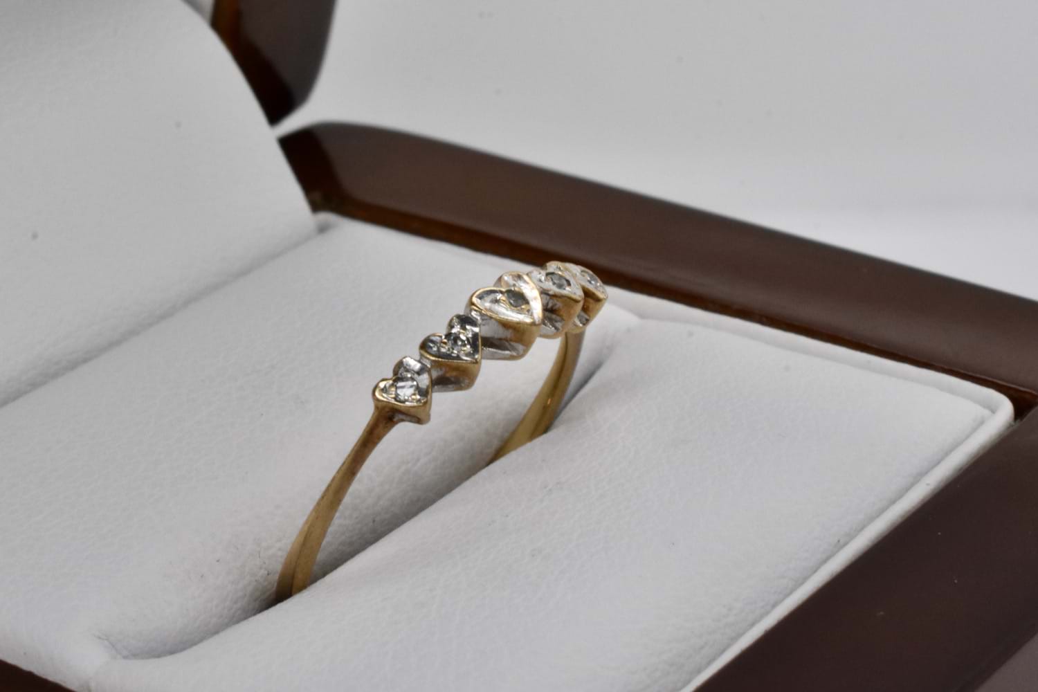 Cute and pretty secondhand 9ct yellow gold band with five heart motifs set with diamonds. Finger size M+