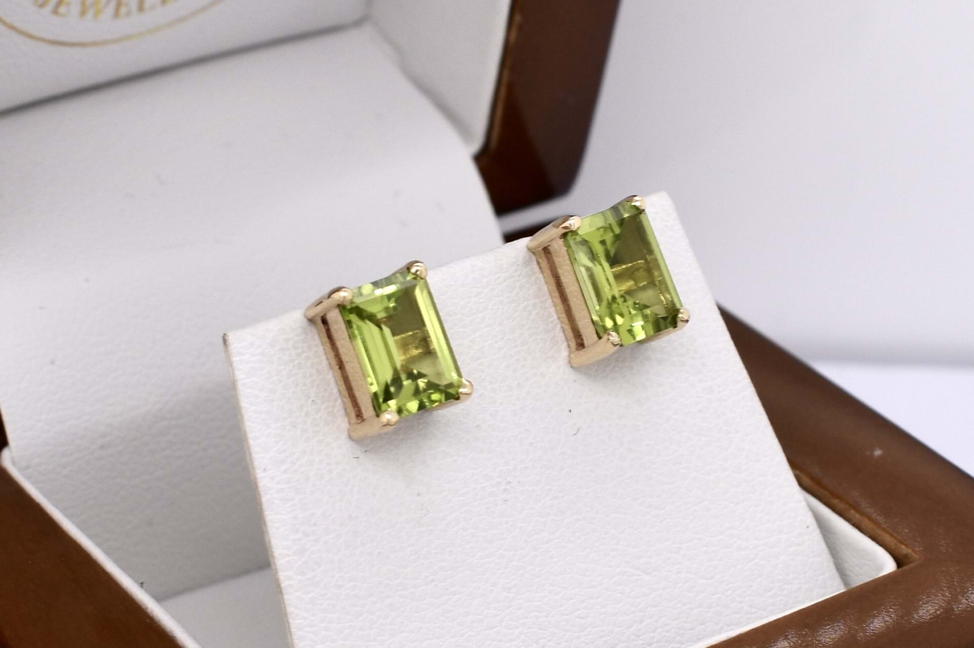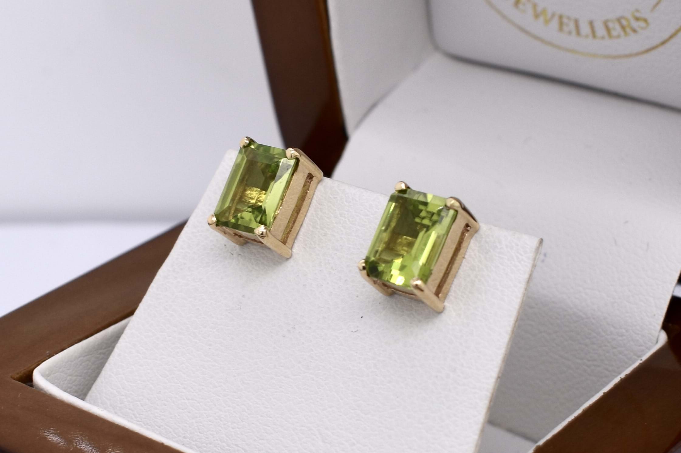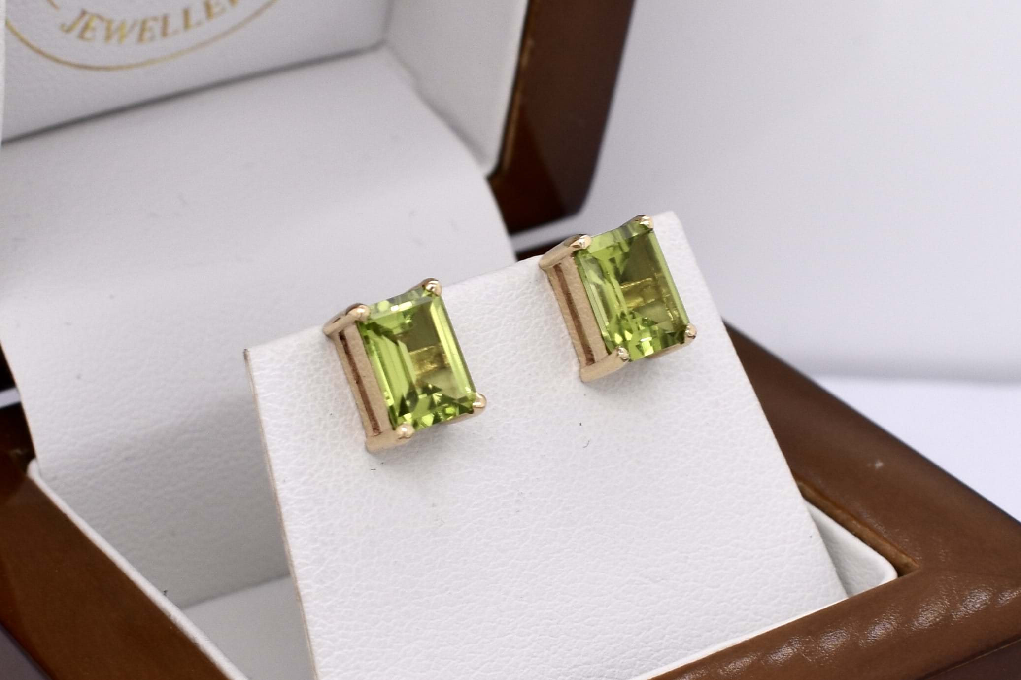 Crafted in 9ct yellow gold, these pretty vintage emerald cut peridot studs measure 8x6mm and are four claw set with post and butterfly fittings.