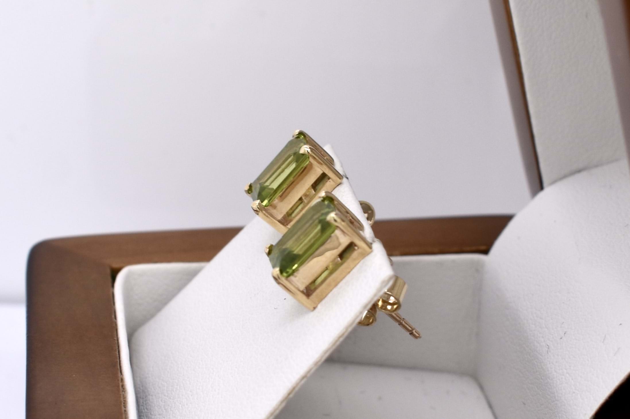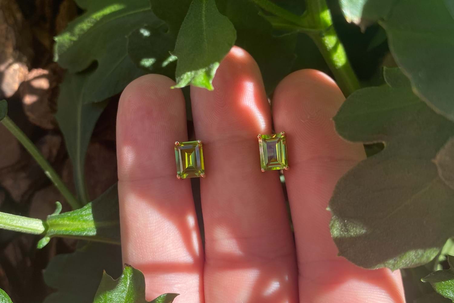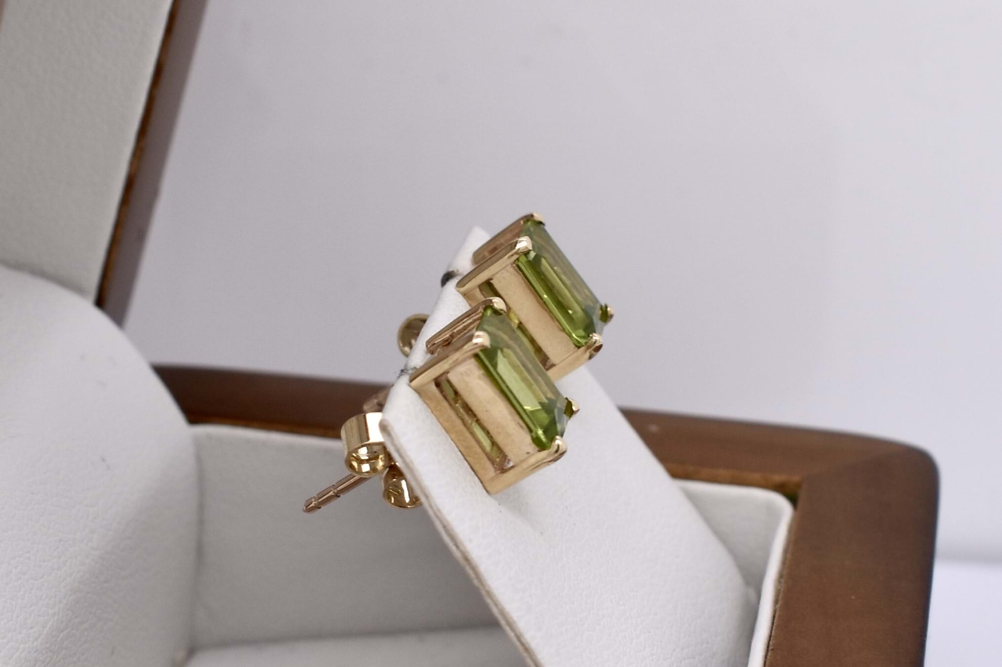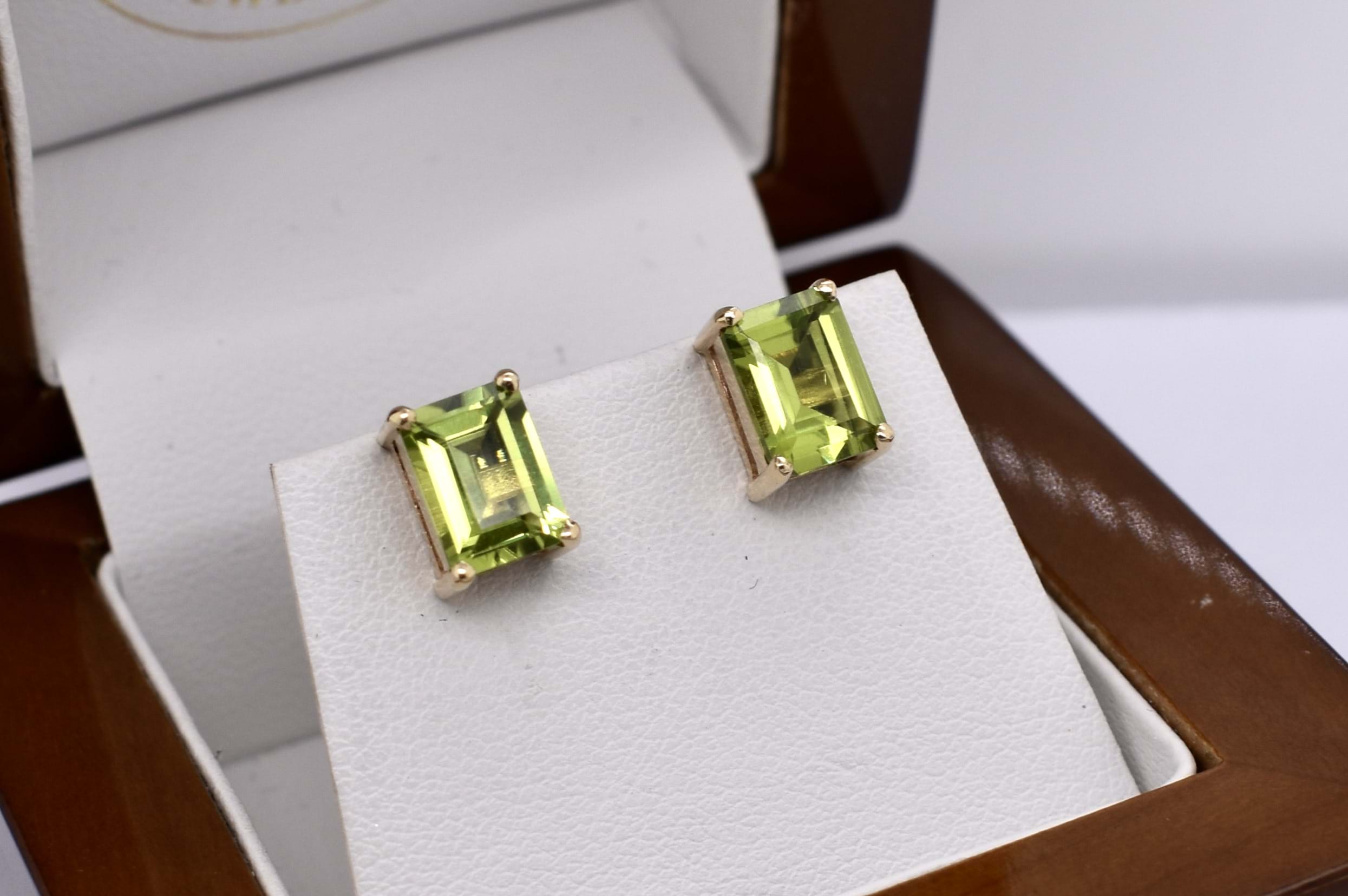 Crafted in 9ct yellow gold, these pretty vintage emerald cut peridot studs measure 8x6mm and are four claw set with post and butterfly fittings.