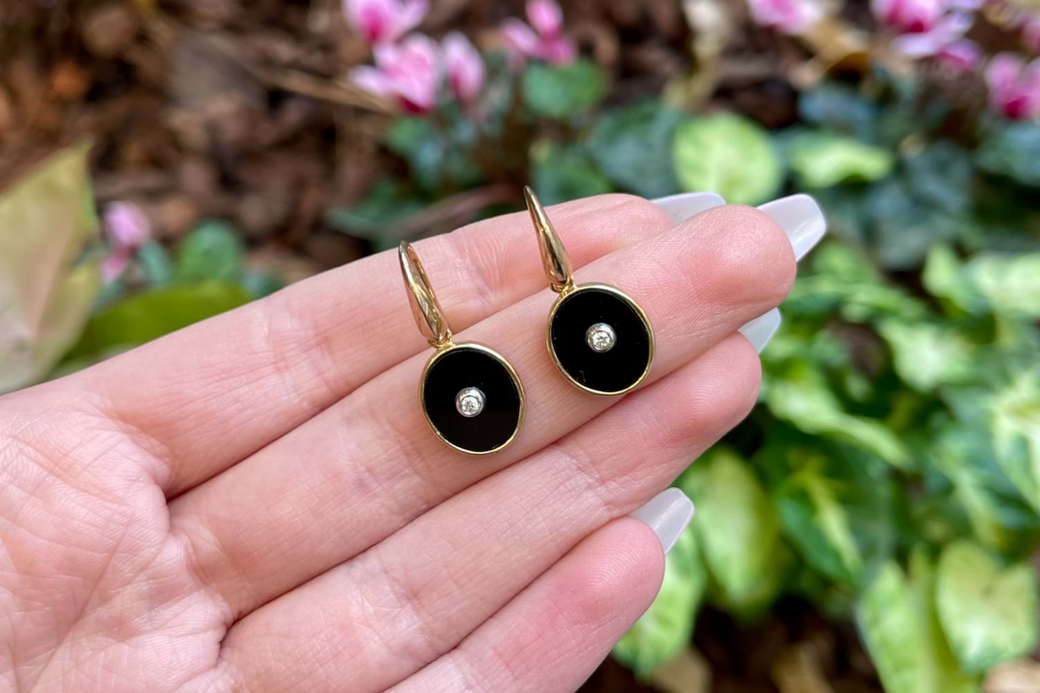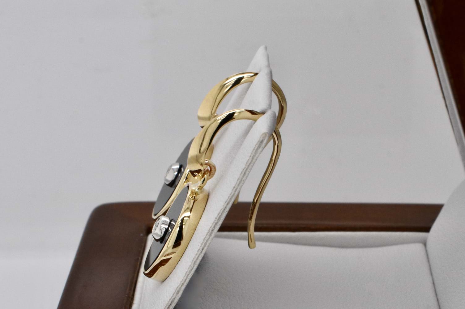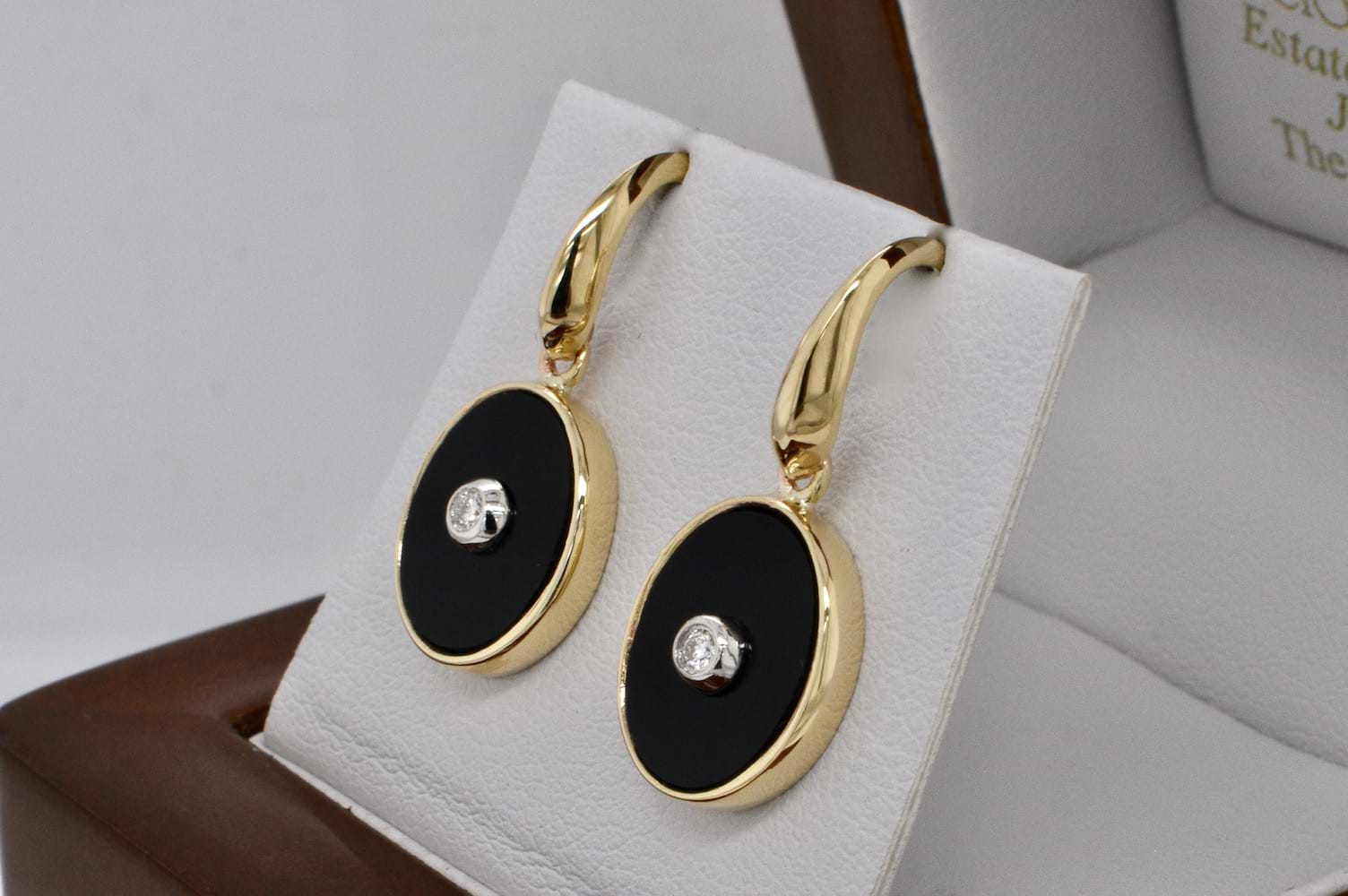 A simple and pretty pair of 9ct yellow gold drop earrings with an oval panel of onyx bezel set and a small round diamond white gold bezel set in the centre. Onyx measures approx. 12.7x11mm