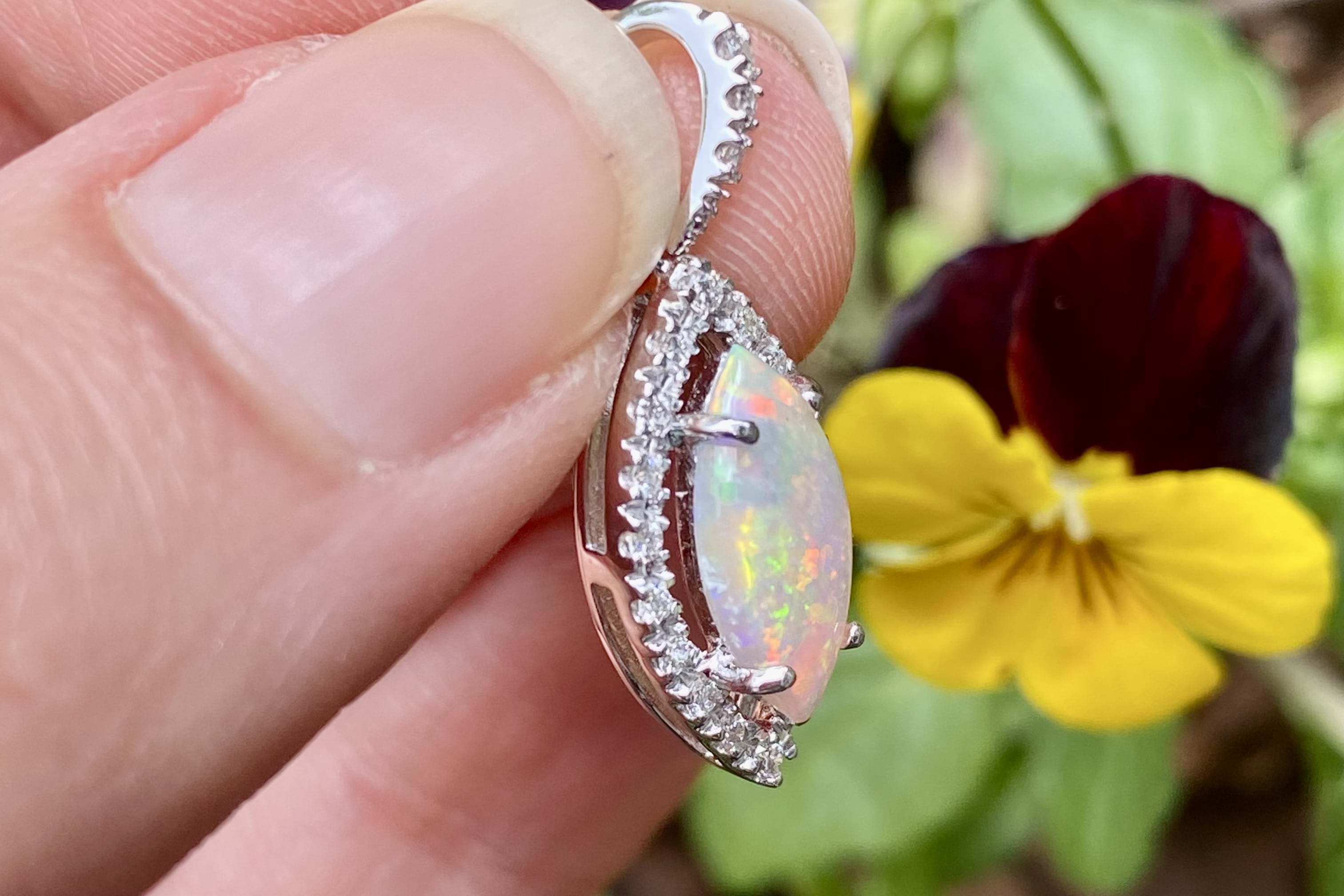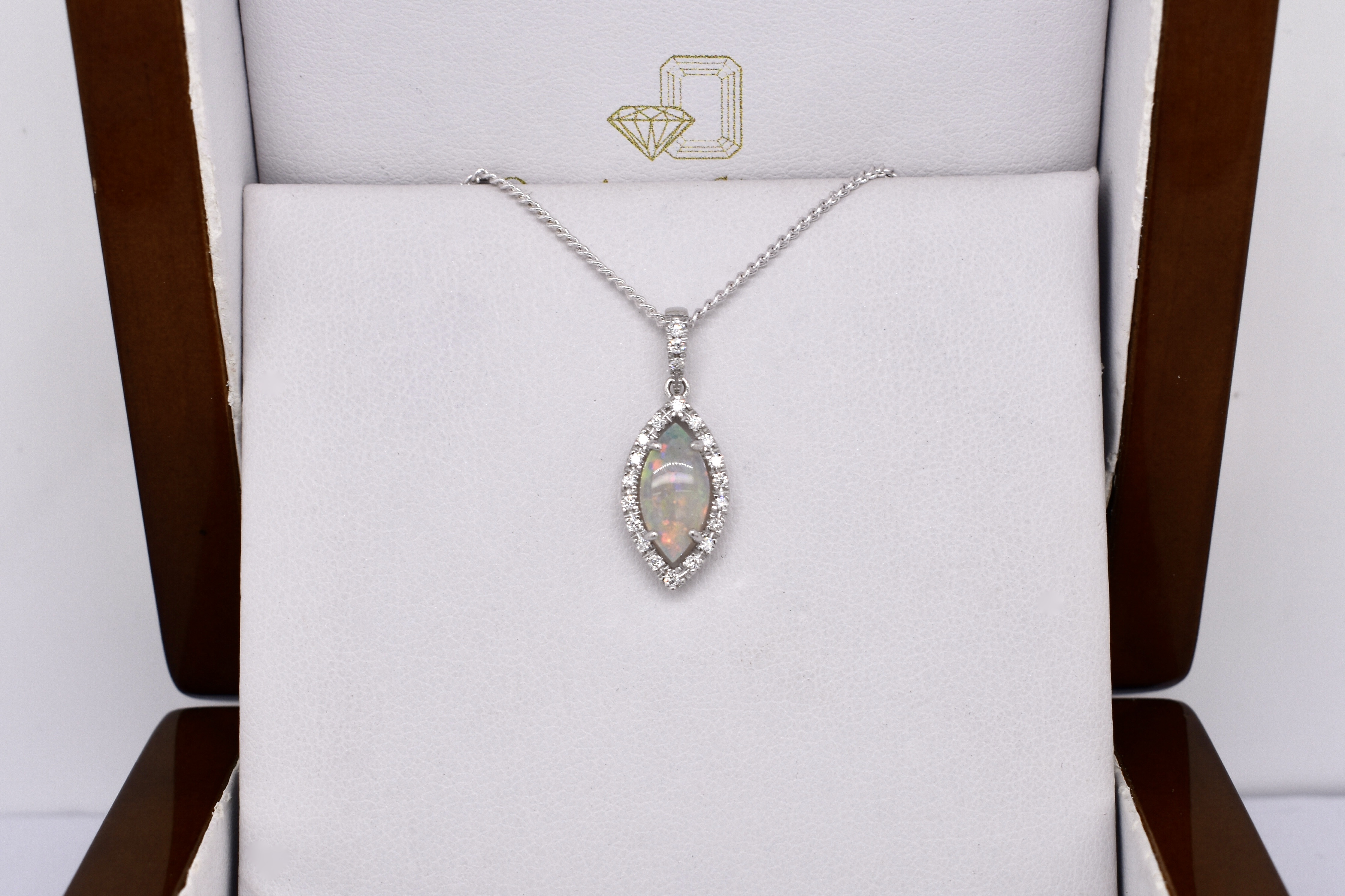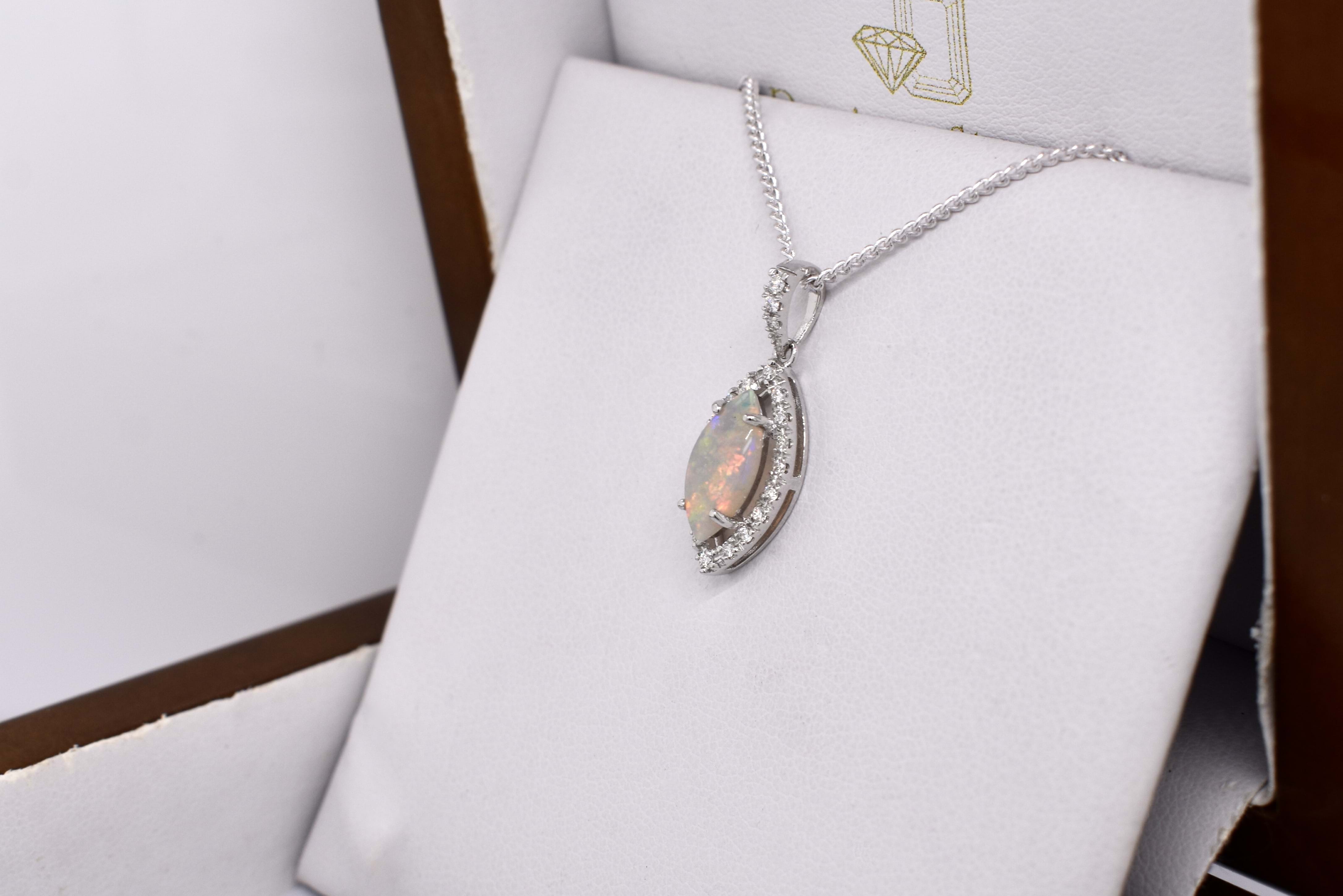Pretty with a flash of colour, this white opal pendant features a four claw set marquise shaped crystal opal. The opal measures 12.14x6.02x2.14mm and has flashes of orange, blue and green throughout. Surrounding the opal, a sparkling halo of twenty one 1.40-1.20mm round brilliant cut diamonds, totalling 0.19ct, finished with a plain bale. Chains available for separate purchase. Independent Valuation Supplied.
