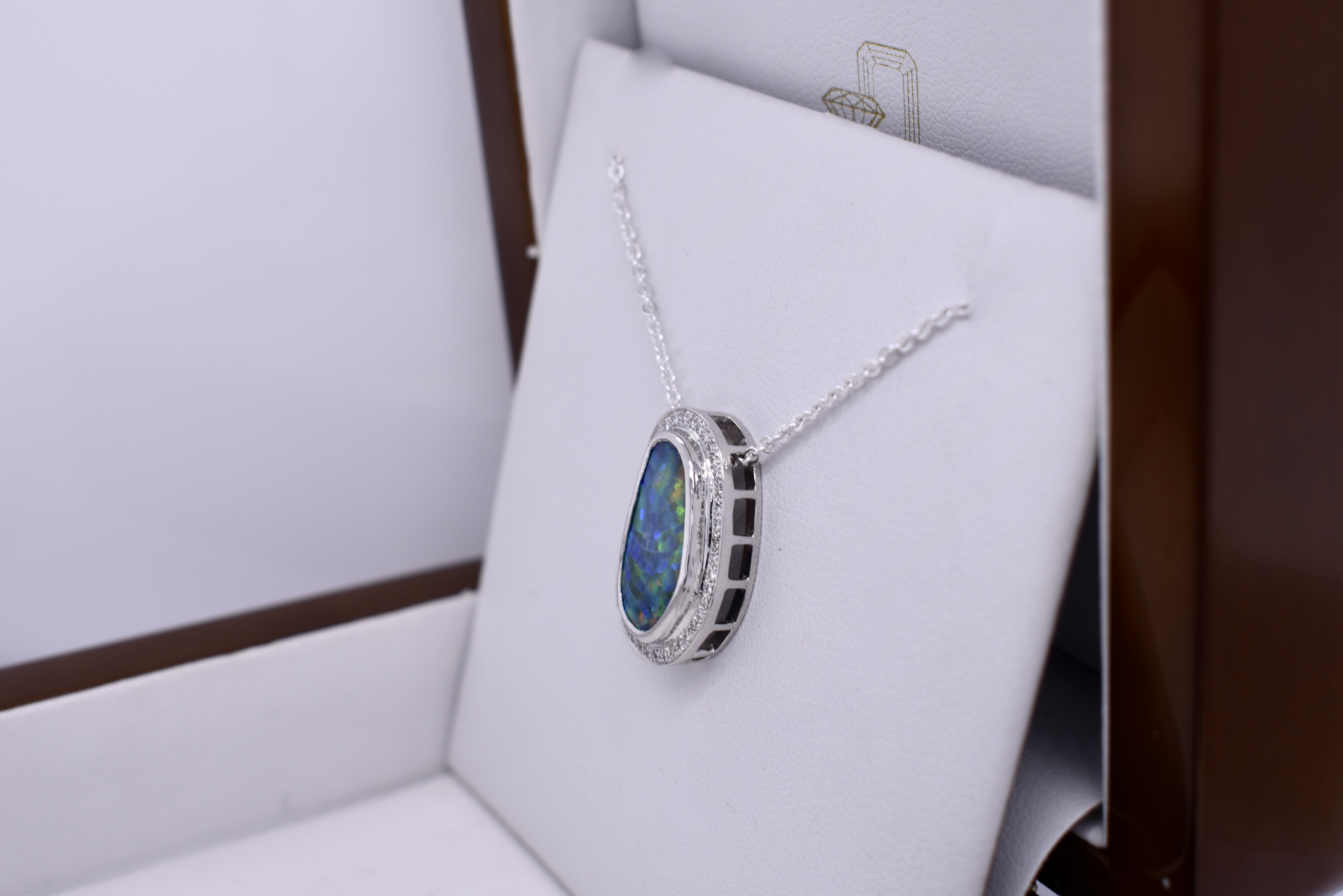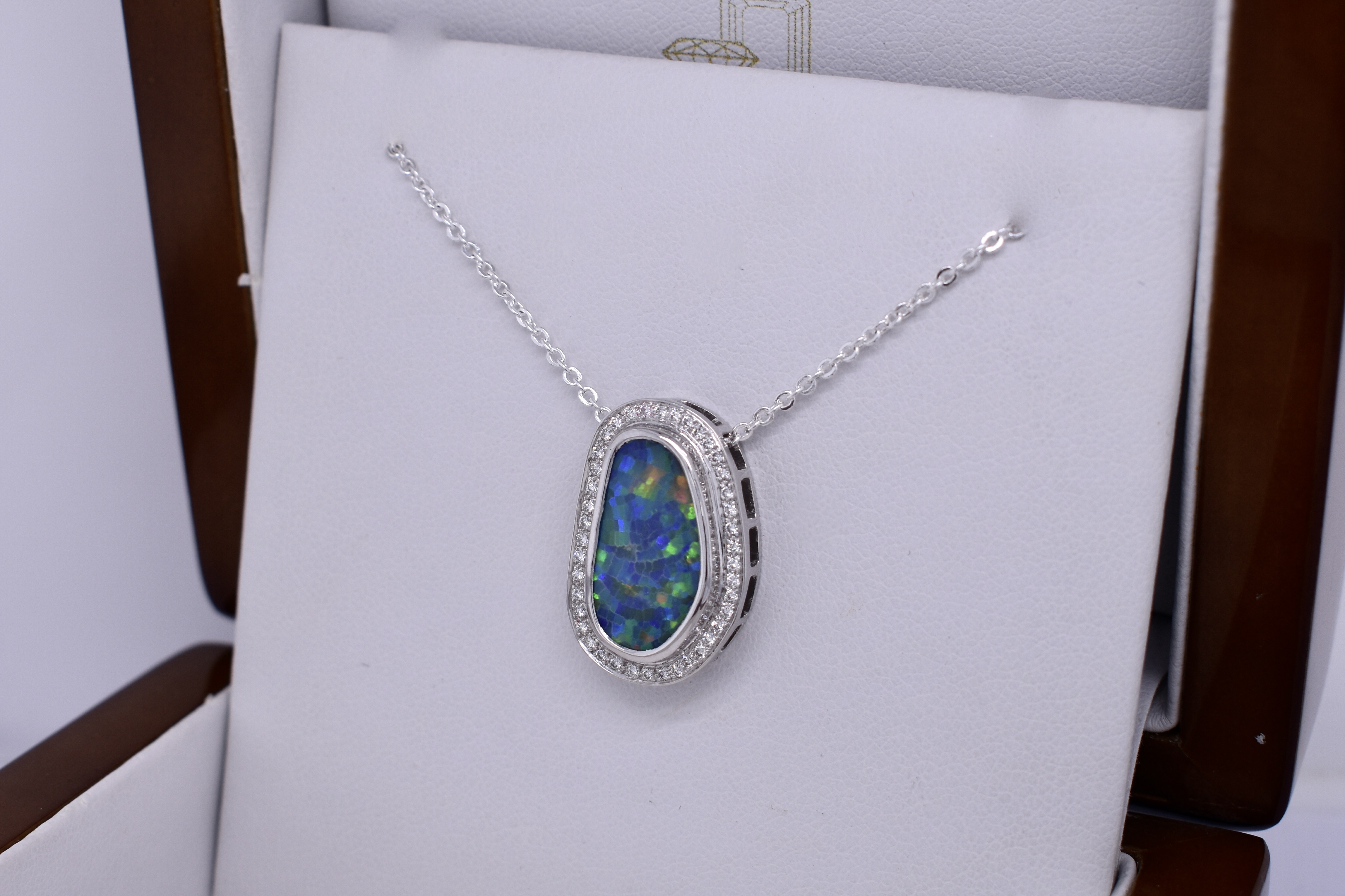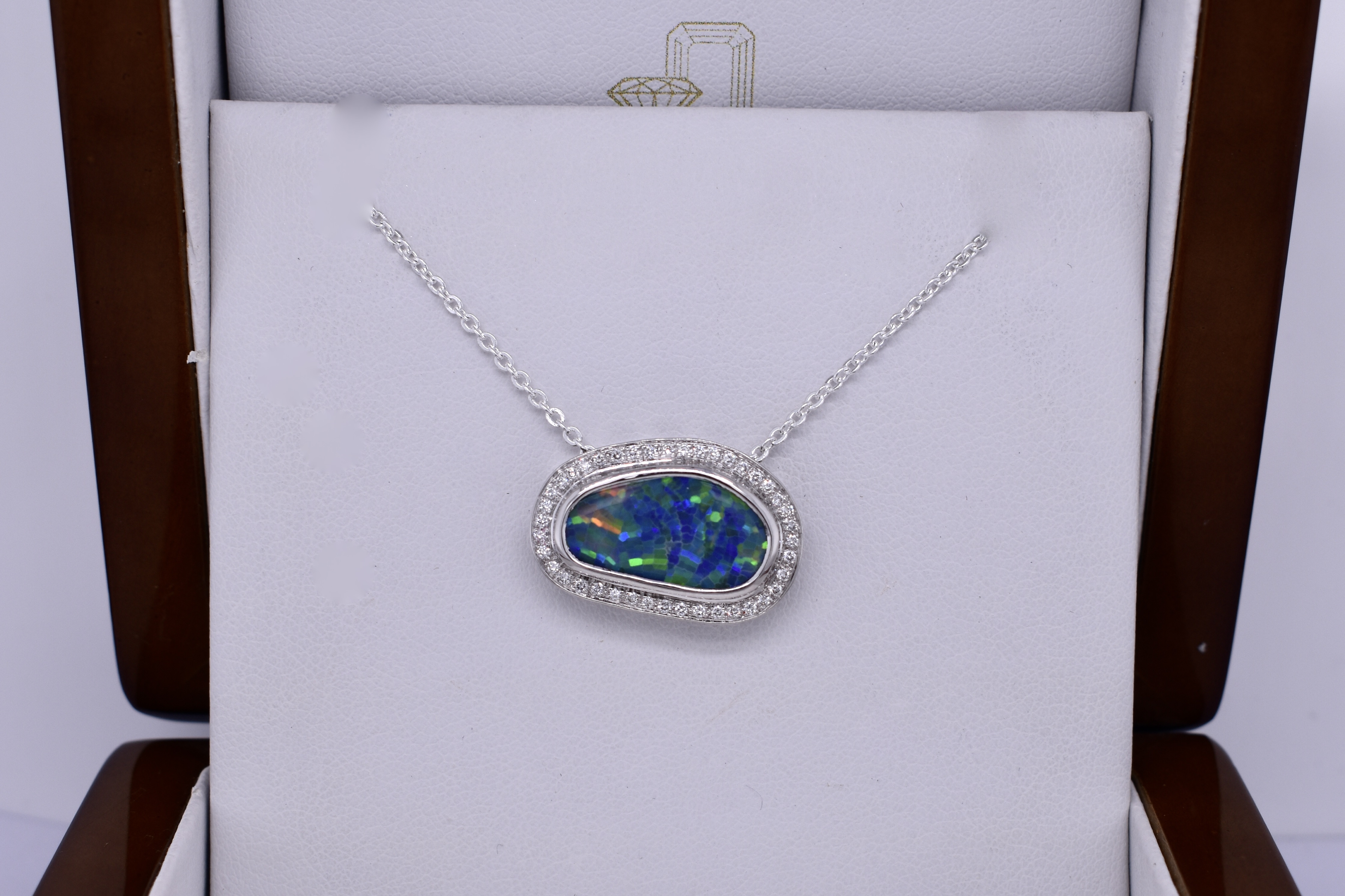 Remarkable and rare, this black Harlequin opal is freeform shaped and measures 16.4x9.0x2.3mm and is set in 18ct white gold, surrounded by a bordered halo of 41 round brilliant cut 1.00mm sparkling diamonds, totalling 0.20ct G-H VS. The opal has a mixed play of colour predominately orange, green and blue with a distinct harlequin pattern. Supported with a contoured under rail and a slide style bale which allows the pendant to be worn multiple directions. 4.30 grams. Chains are available for separate purchase.