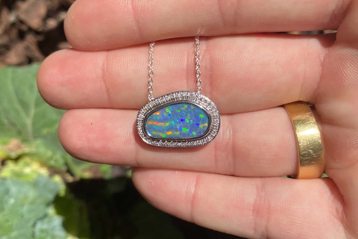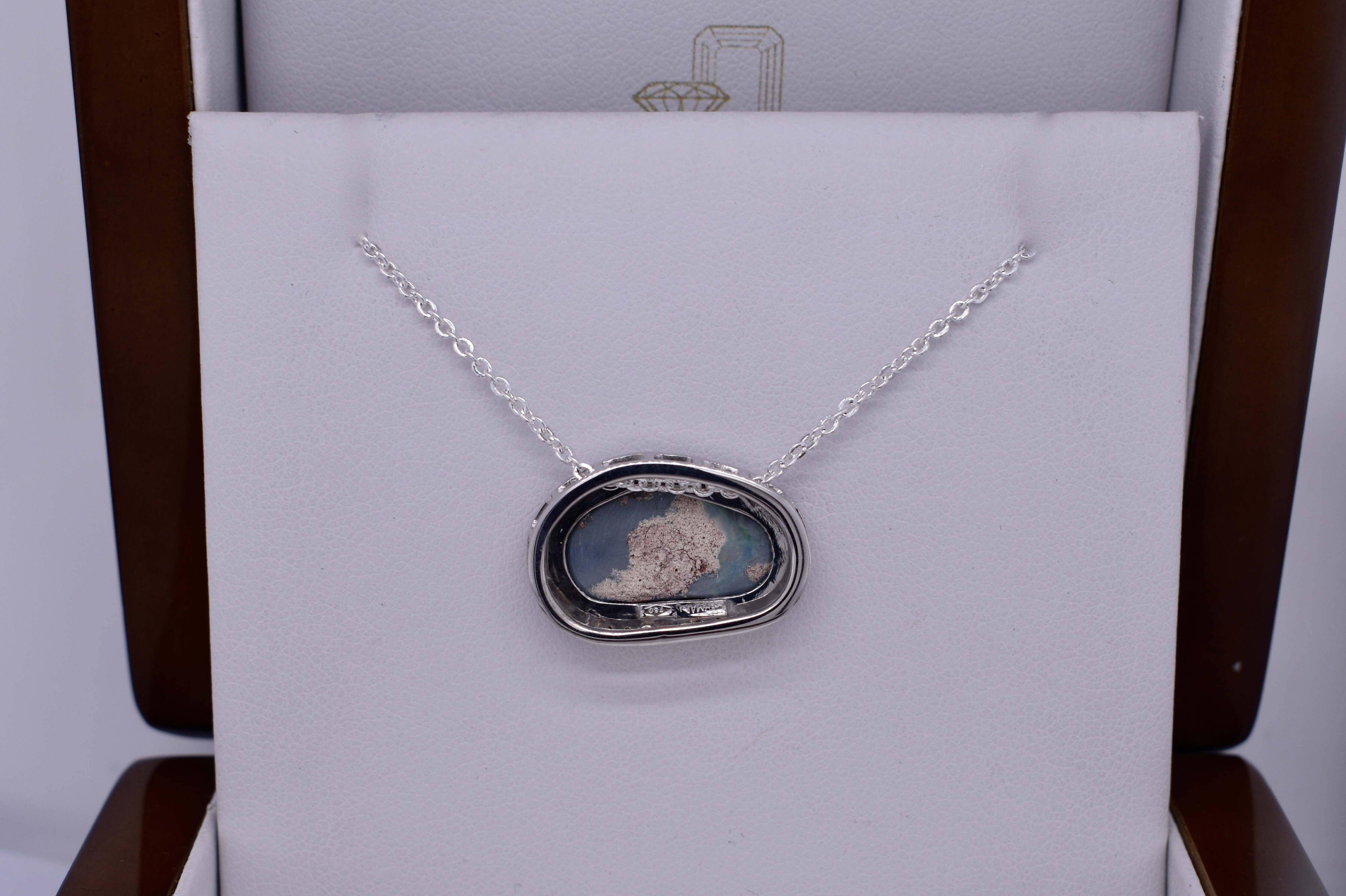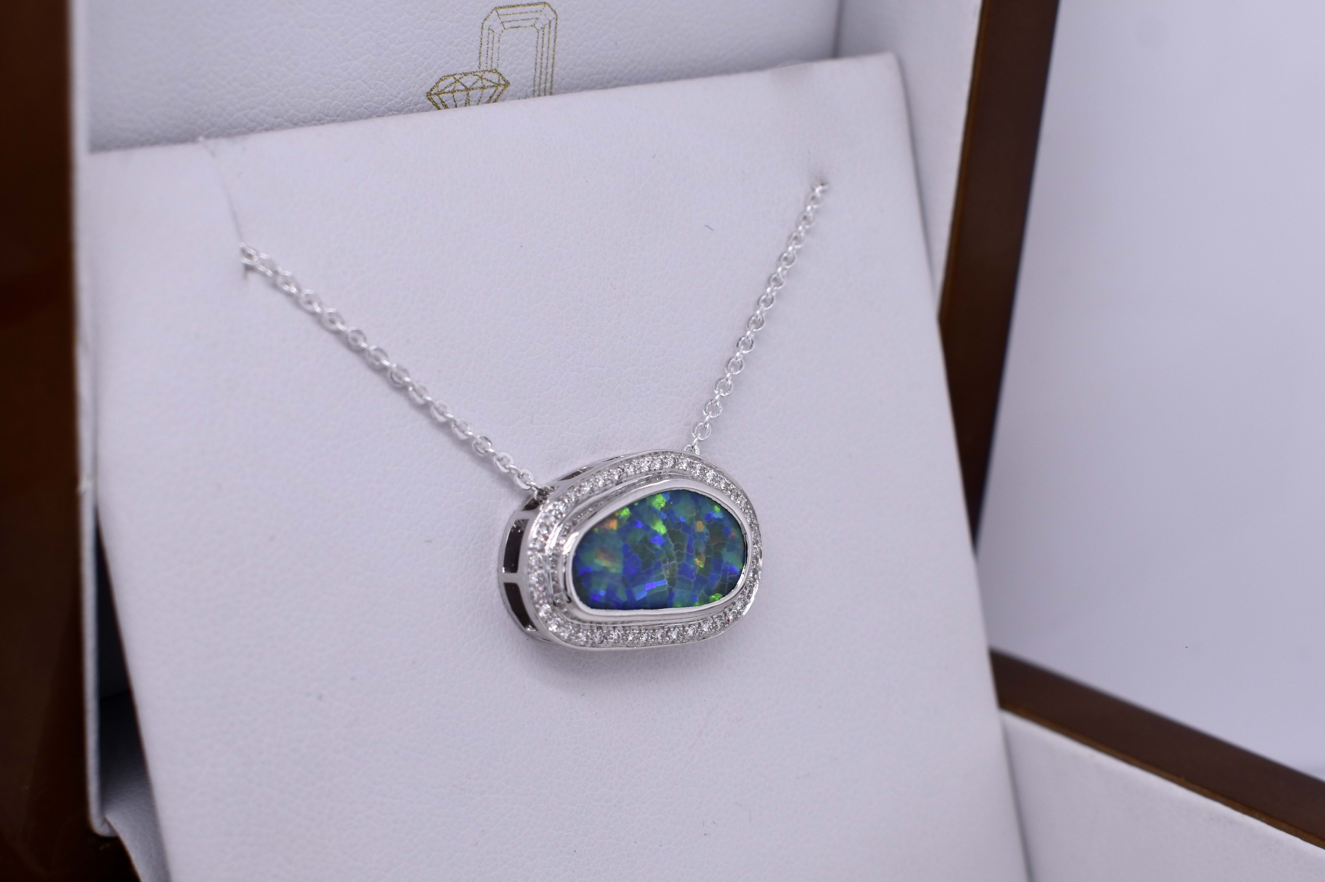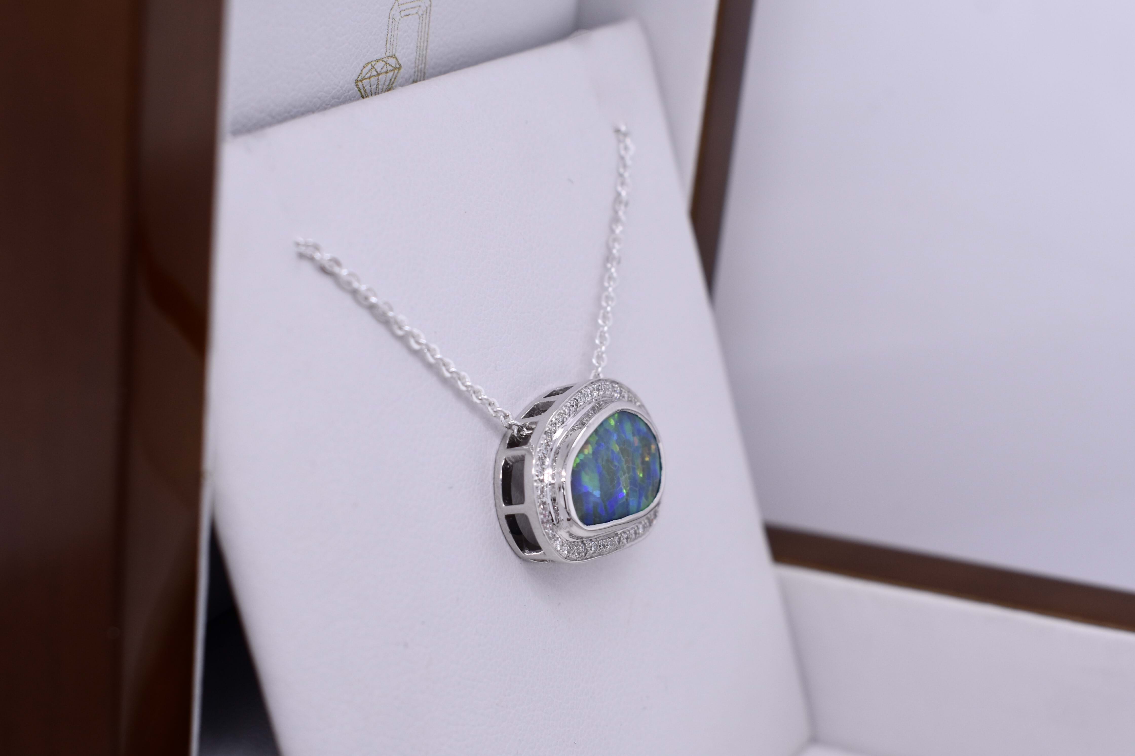 Remarkable and rare, this black Harlequin opal is freeform shaped and measures 16.4x9.0x2.3mm and is set in 18ct white gold, surrounded by a bordered halo of 41 round brilliant cut 1.00mm sparkling diamonds, totalling 0.20ct G-H VS. The opal has a mixed play of colour predominately orange, green and blue with a distinct harlequin pattern. Supported with a contoured under rail and a slide style bale which allows the pendant to be worn multiple directions. 4.30 grams. Chains are available for separate purchase.