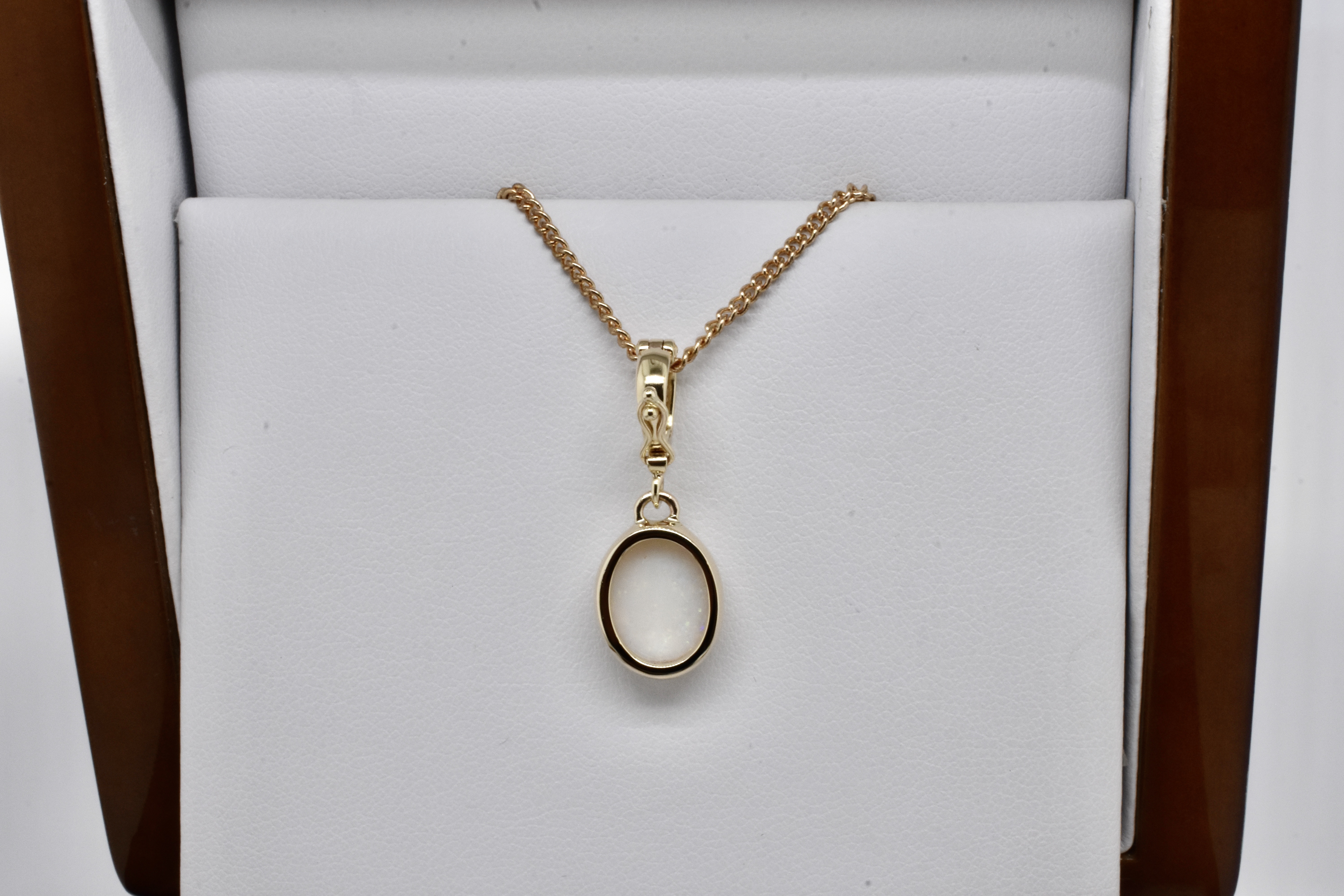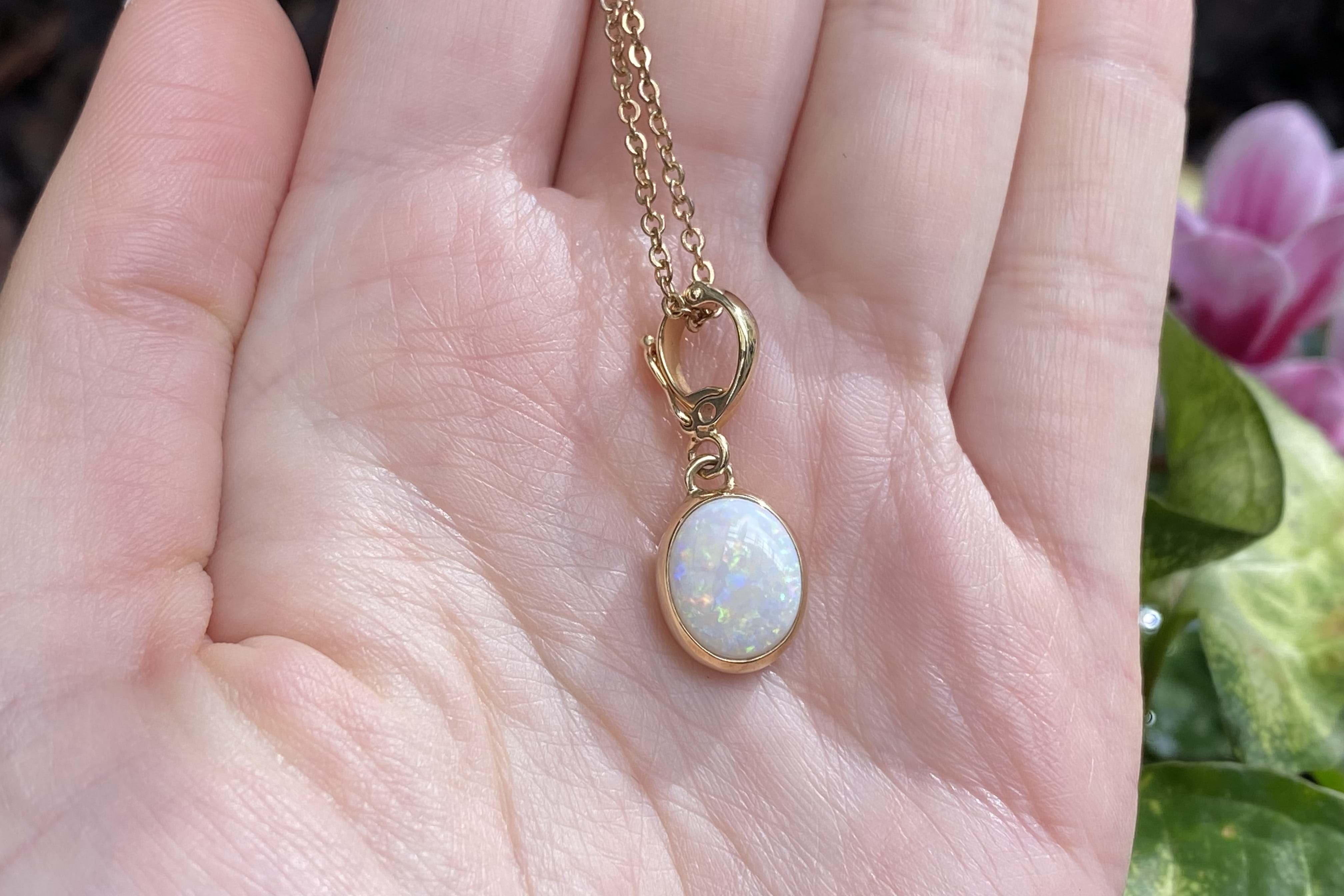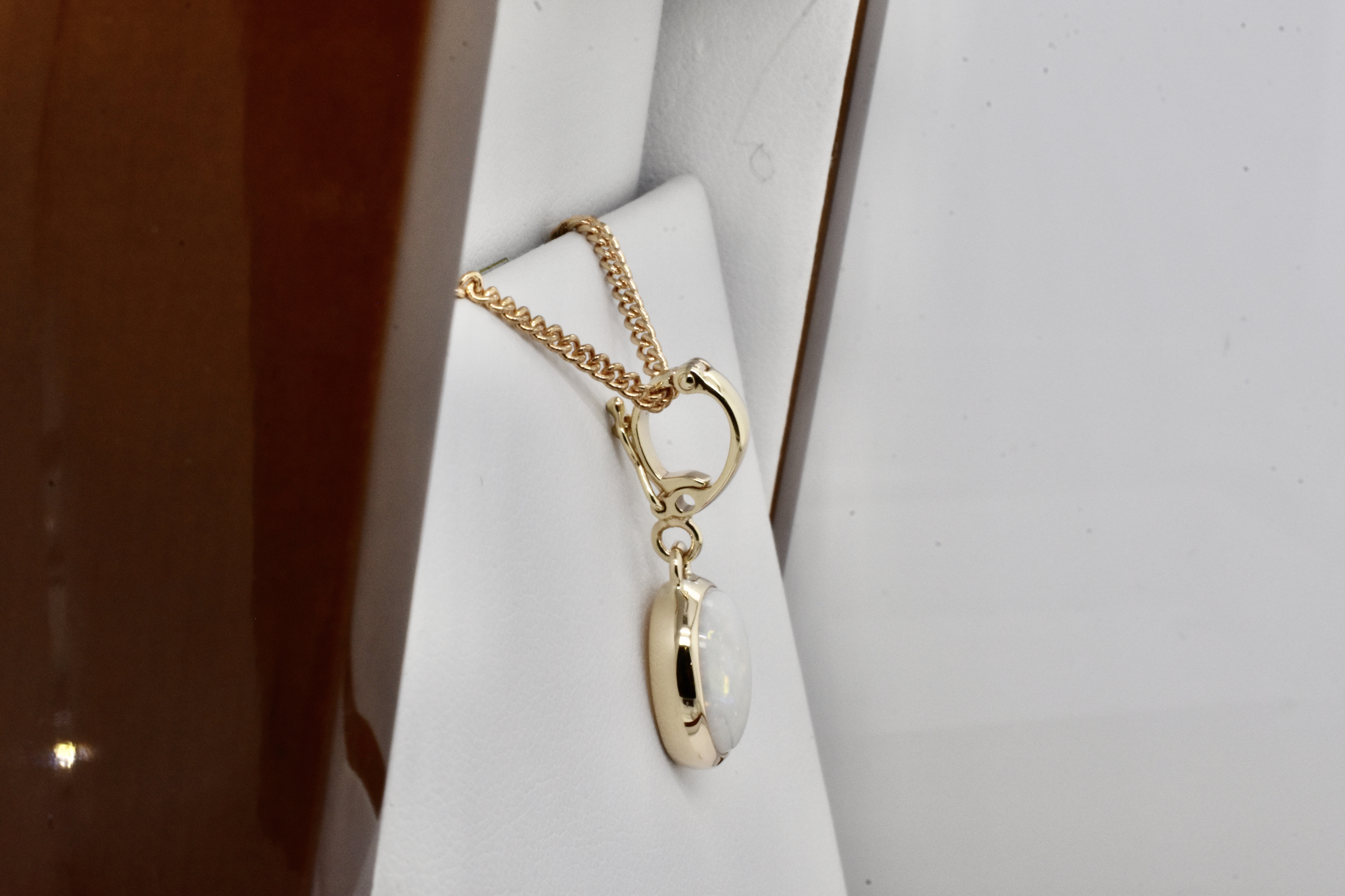 A versatile piece, this handmade 9ct yellow gold pendant features an approx.. 13 x 10.5mm oval piece of solid white opal with orange, yellow, green and blue flashes, in a bezel setting with enhancer clasp which can be clipped onto chains, pearls or other strands. Chains available for separate purchase