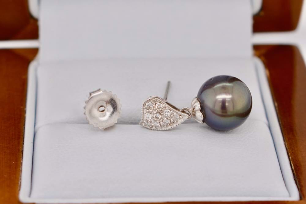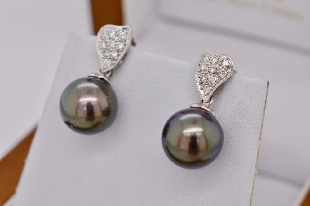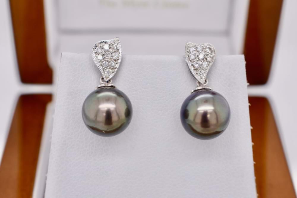 In 18ct white gold these 9.5-10mm Tahitian Pearl drops feature a pave top of 0.22cts of shimmering Diamonds.