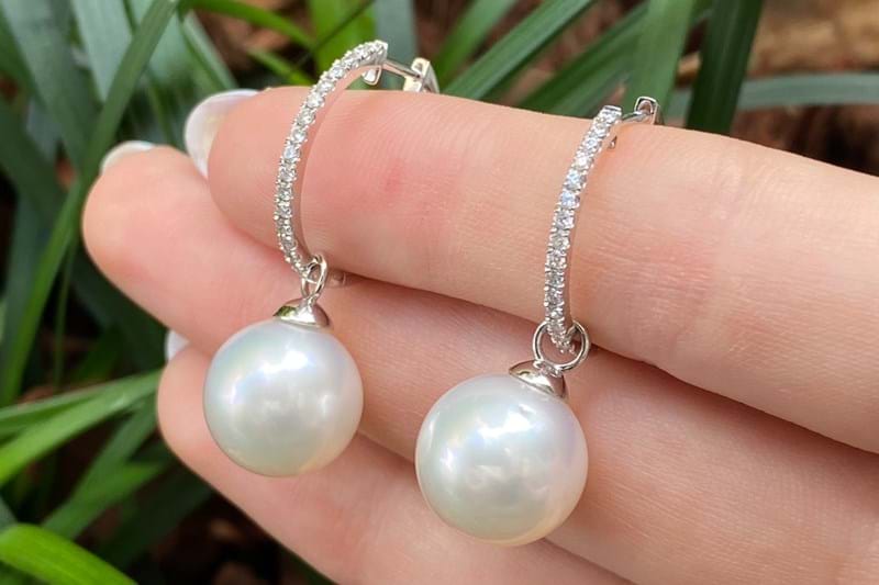 A simple and elegant pair of semi round 12.45-12.55 mm south sea pearls with 18ct white gold cap and ring fittings perfect to suspend from diamond huggies. Pearls independently graded as: pink white silvery hue with high lustre, slightly blemished. Independent Valuation Supplied. Diamond huggies pictured are available for separate purchase
