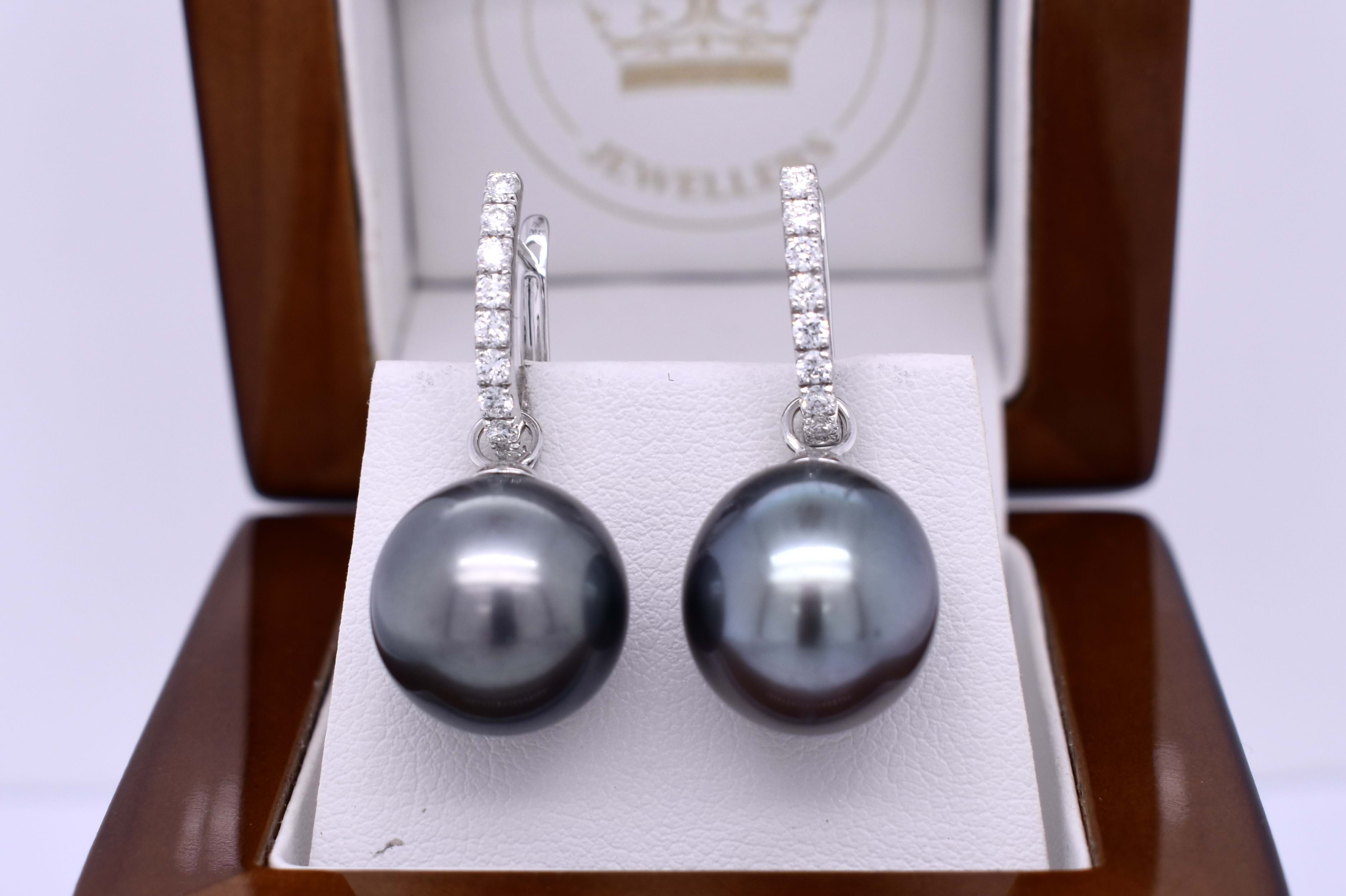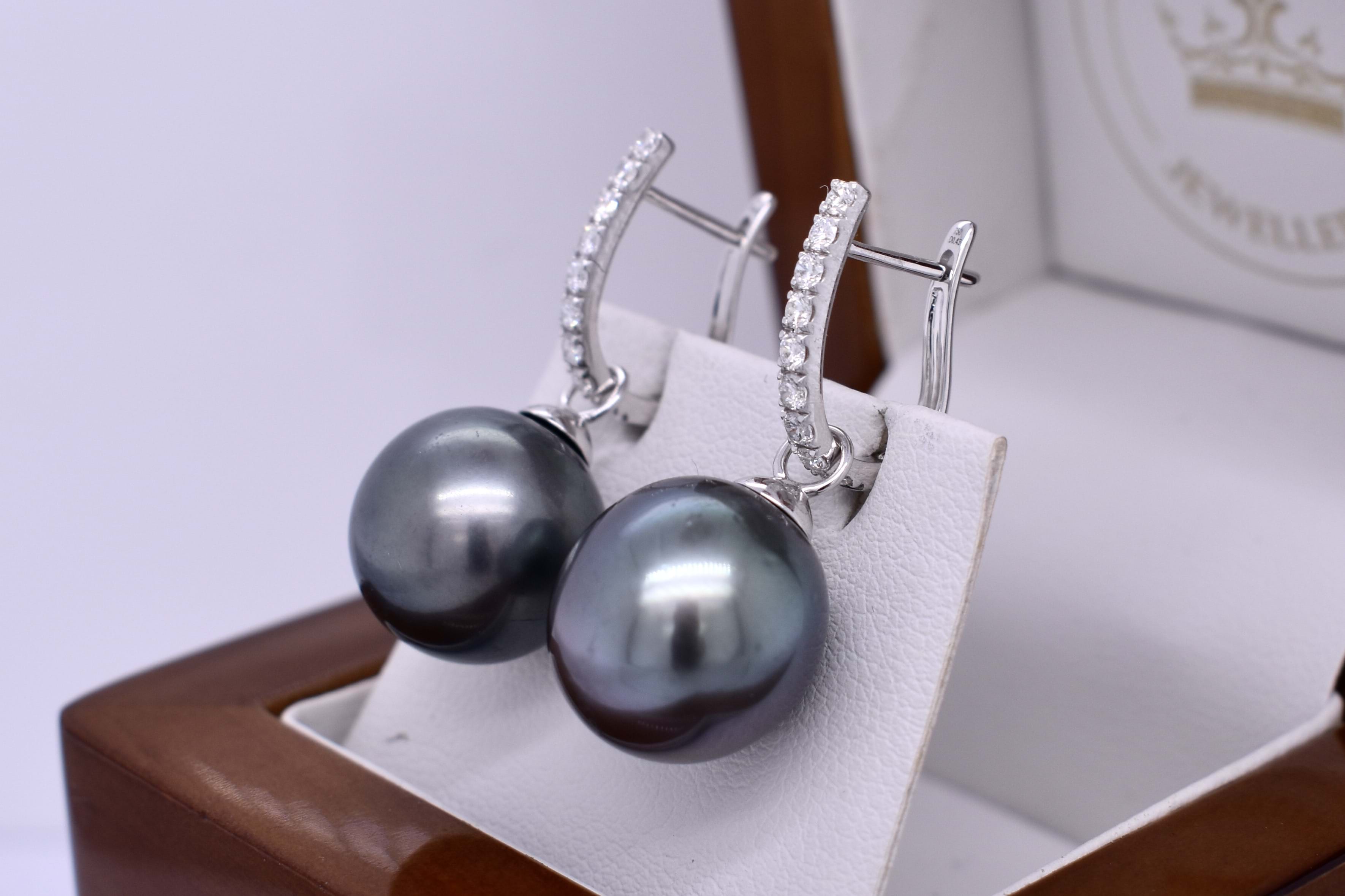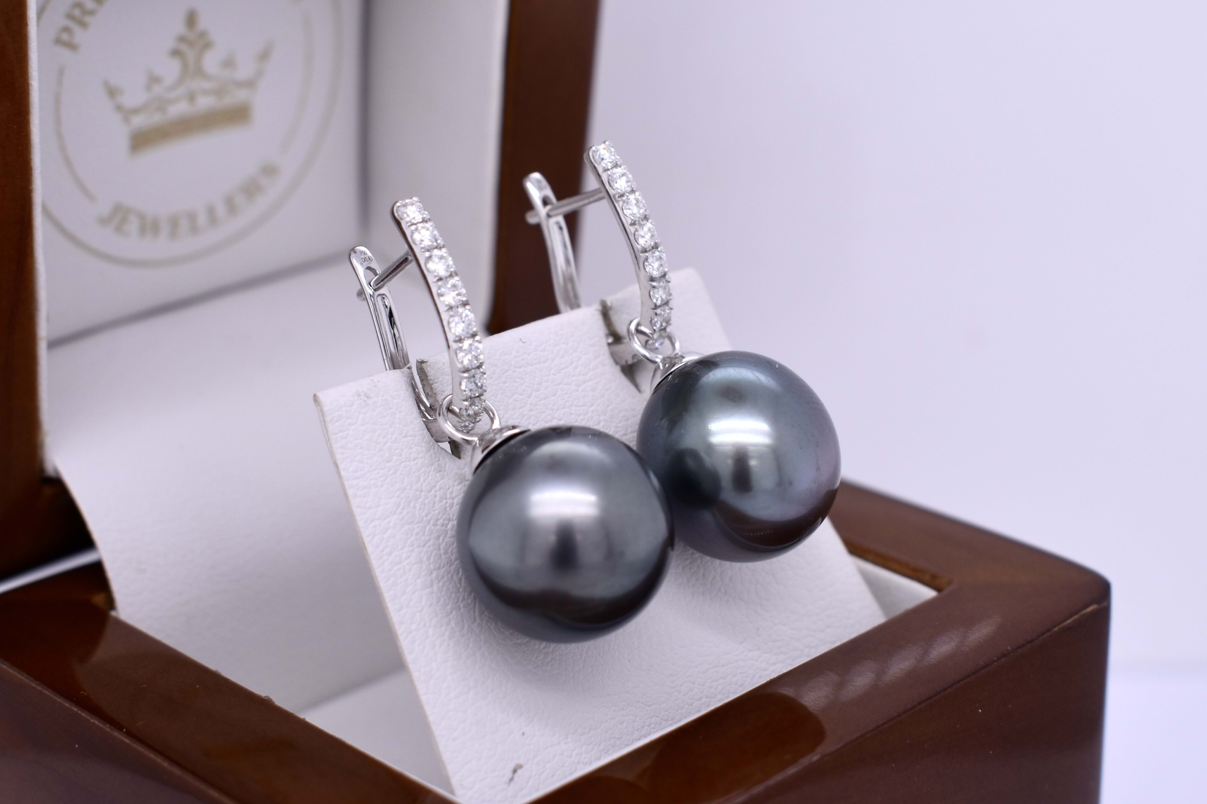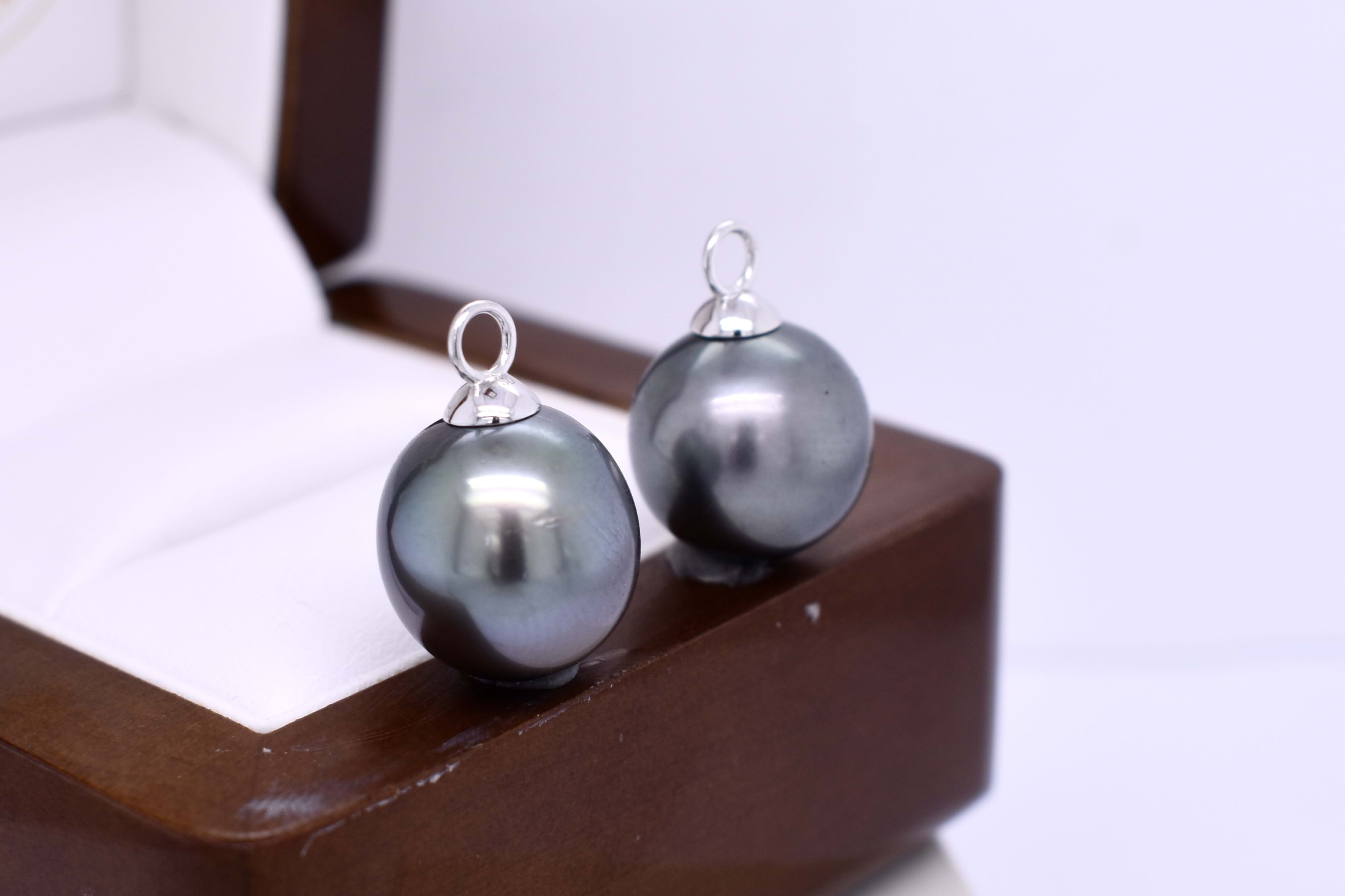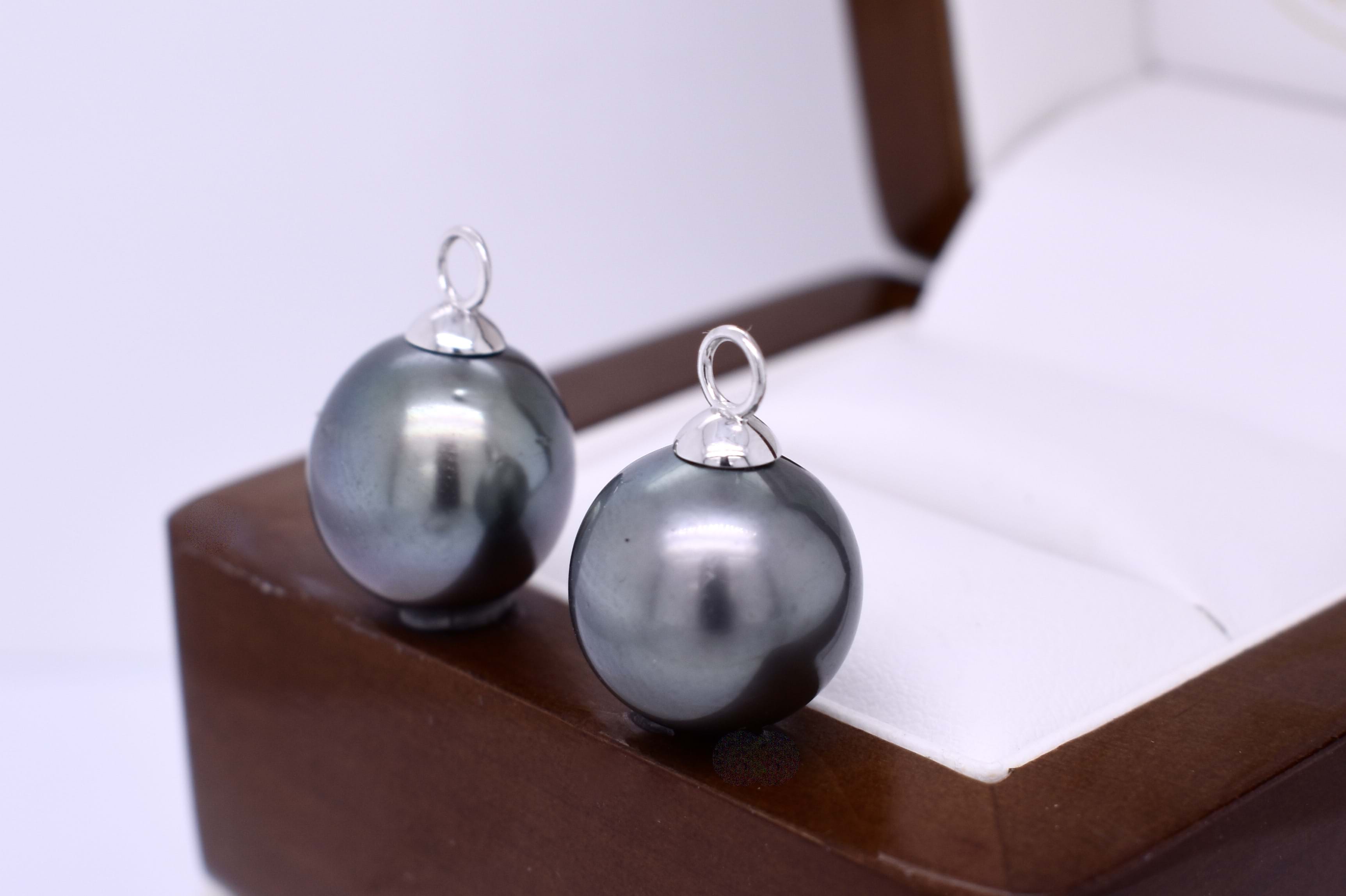 Pretty and sweet pair of semi-round 13-13.5mm tahitian pearls with 18ct white gold cap and ring fittings, perfect to suspend from diamond huggies. Pearls independently graded as: semi-round, good lustre, dark greenish black hue, lightly blemished. Independent valuation supplied.