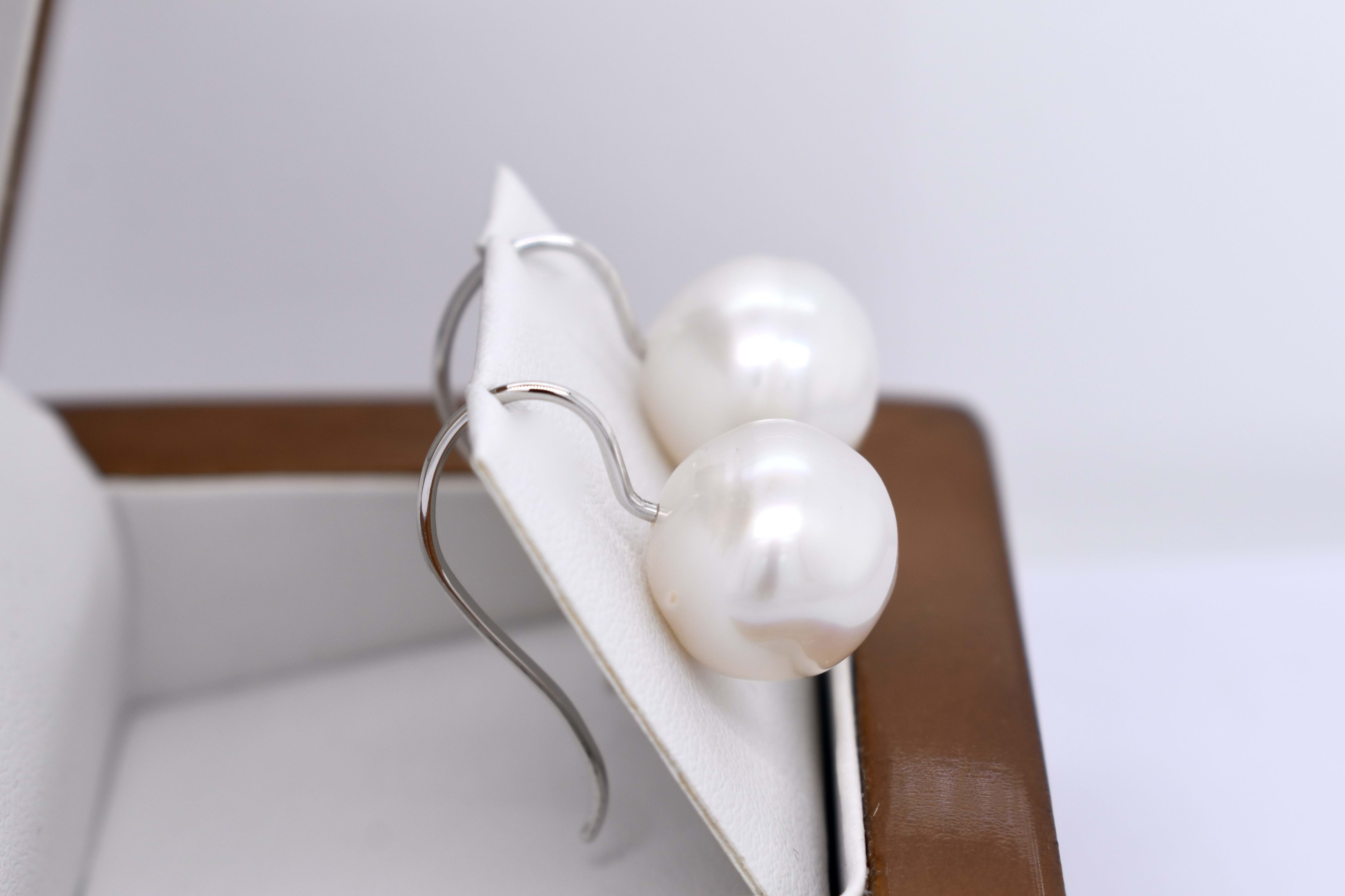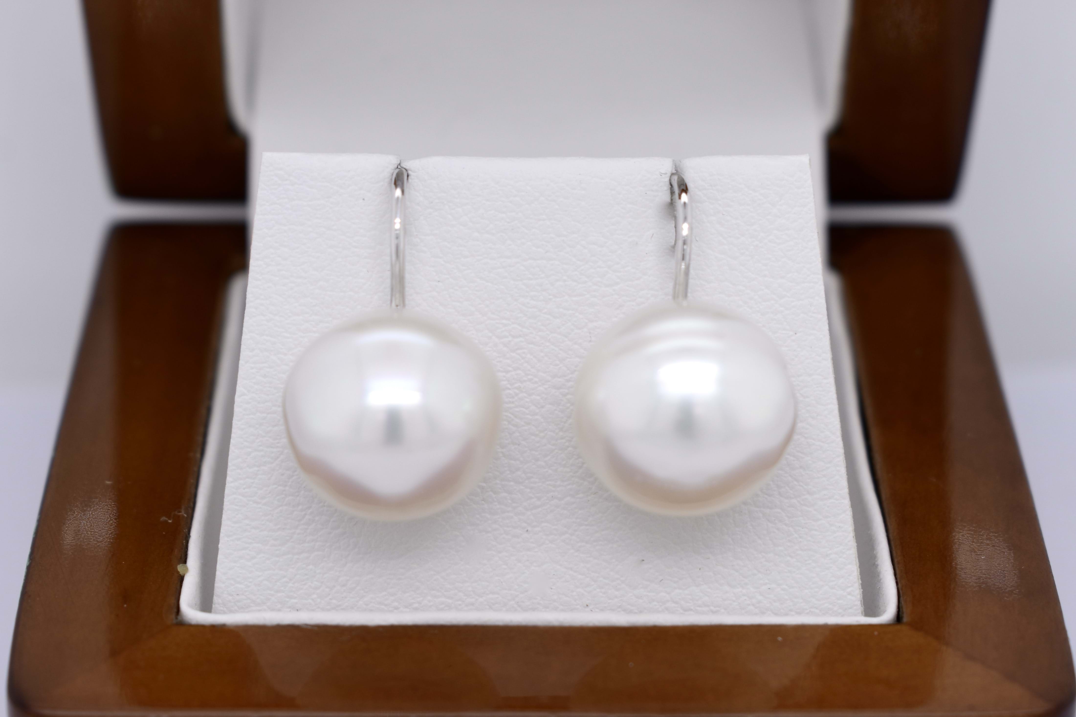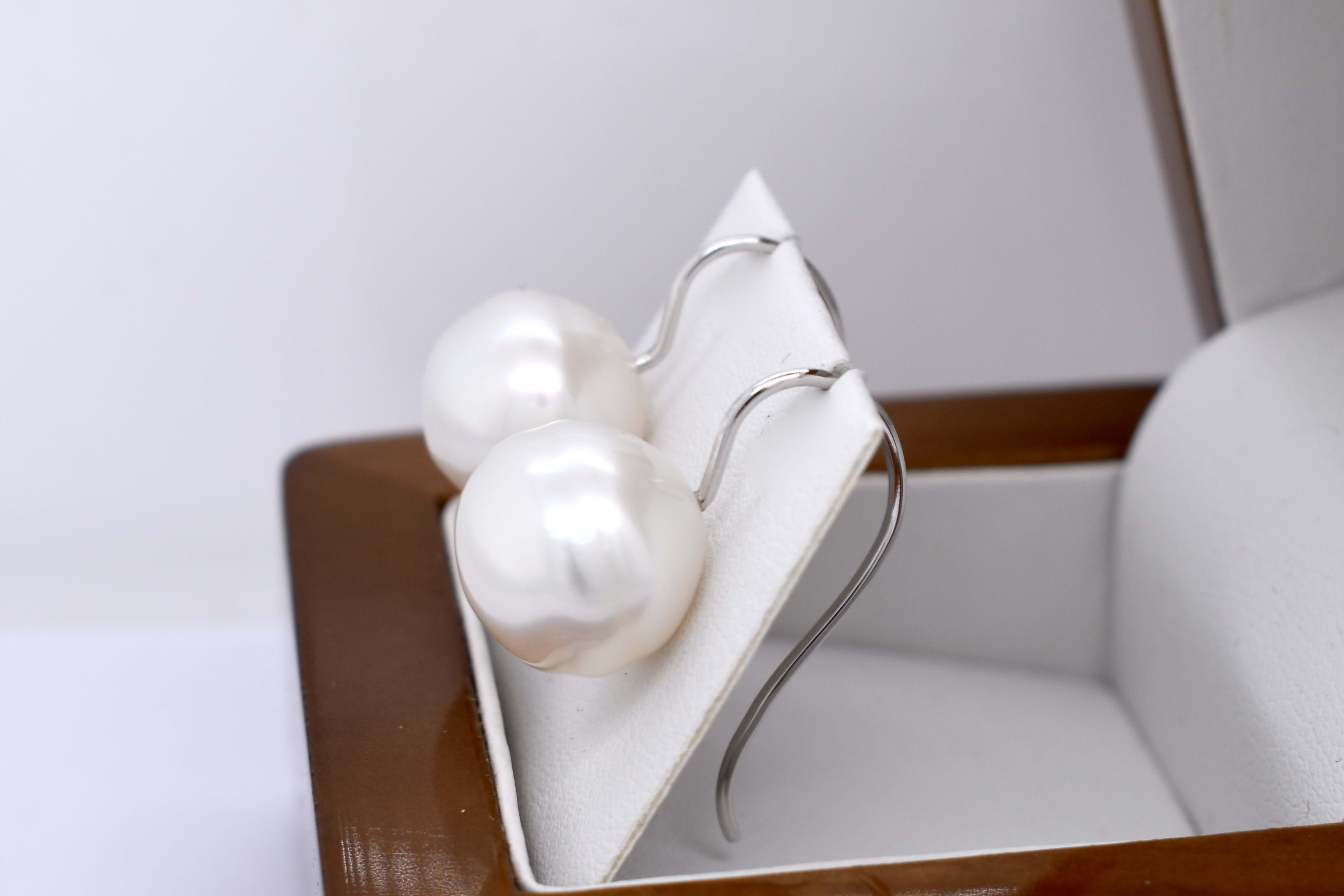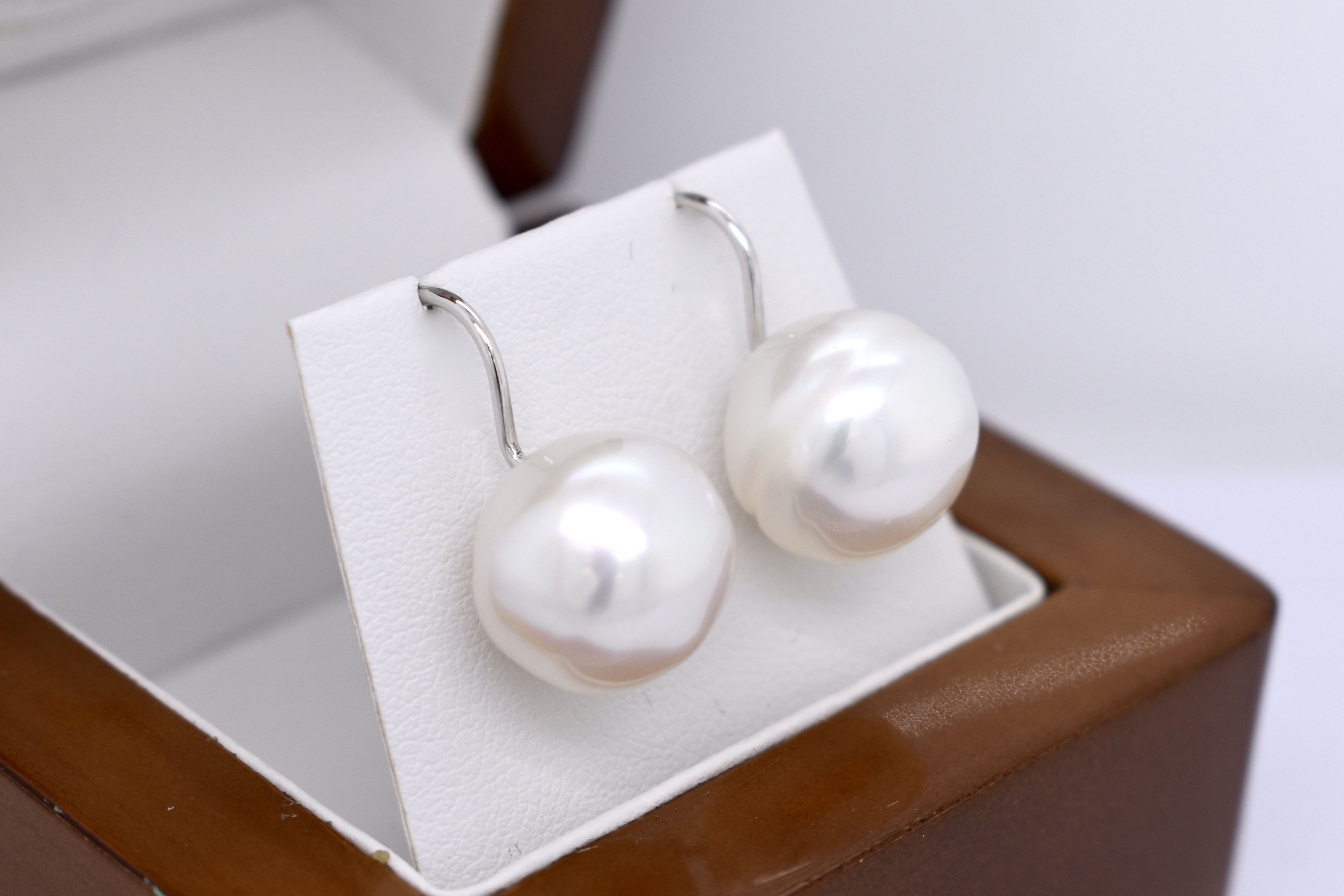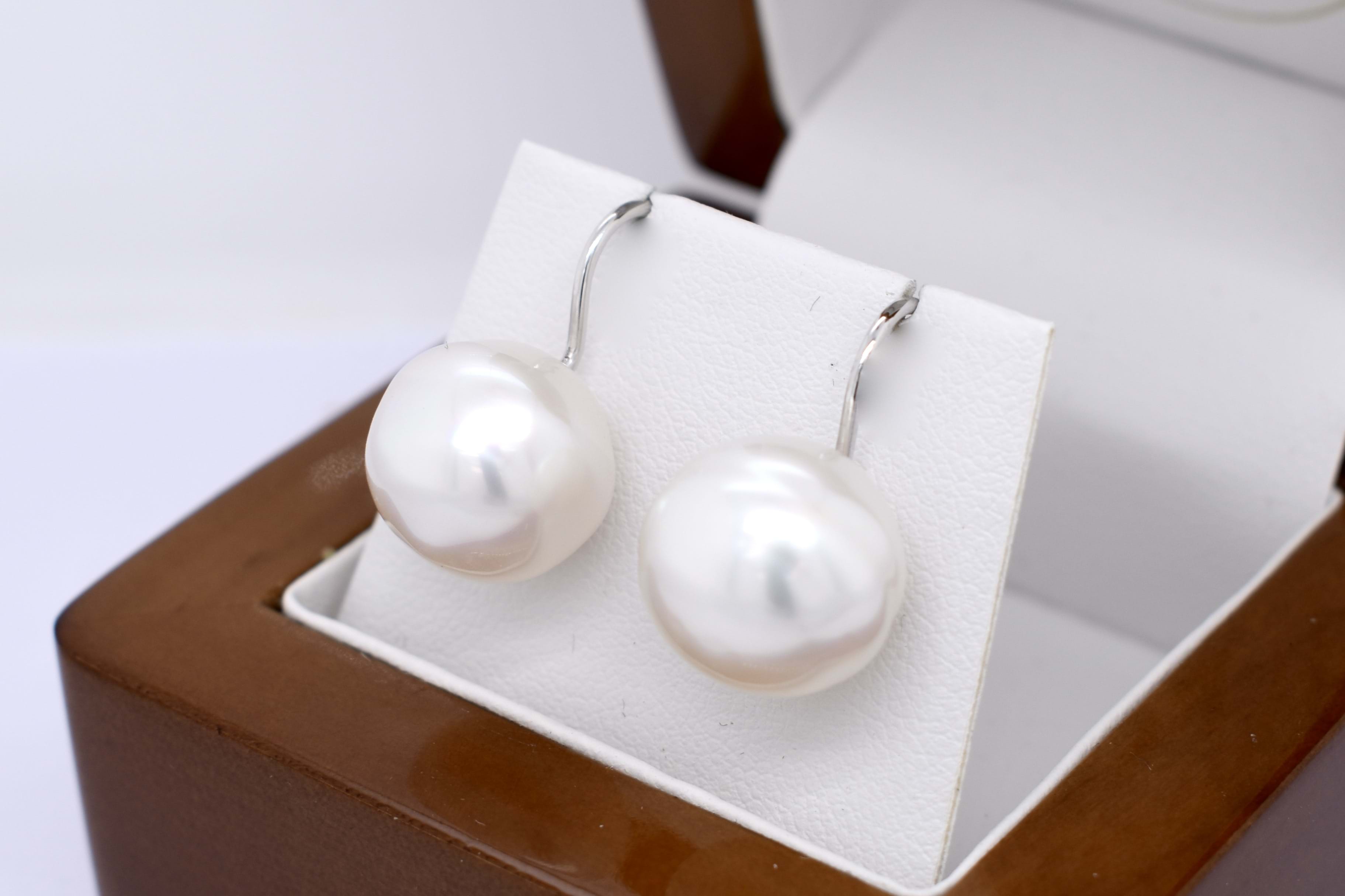 A classic white pair of south sea pearls measuring approx 13.2mm baroque shaped with a high lustre. Set in a simple curved 18ct white gold shepherd hook fittings.