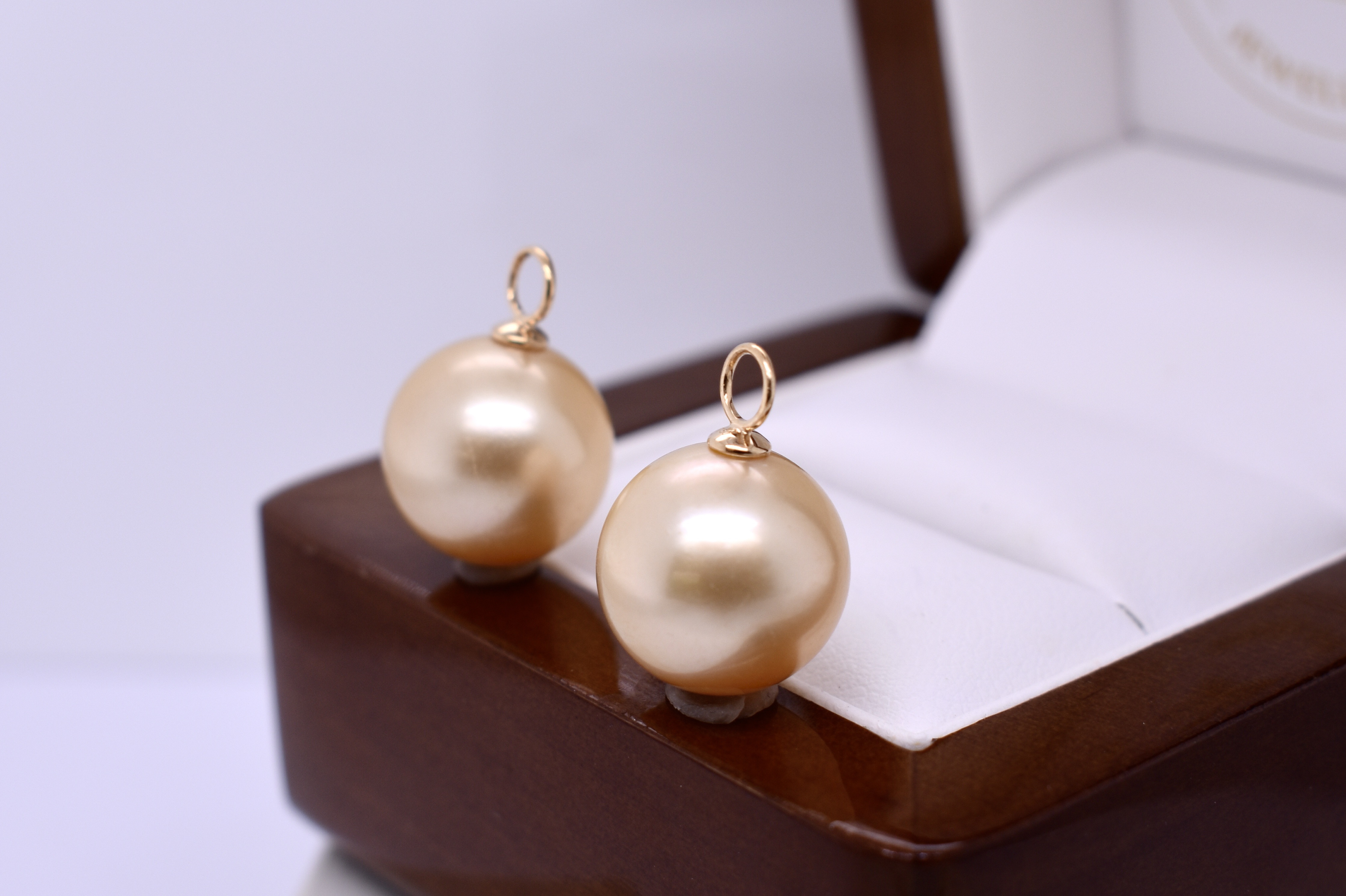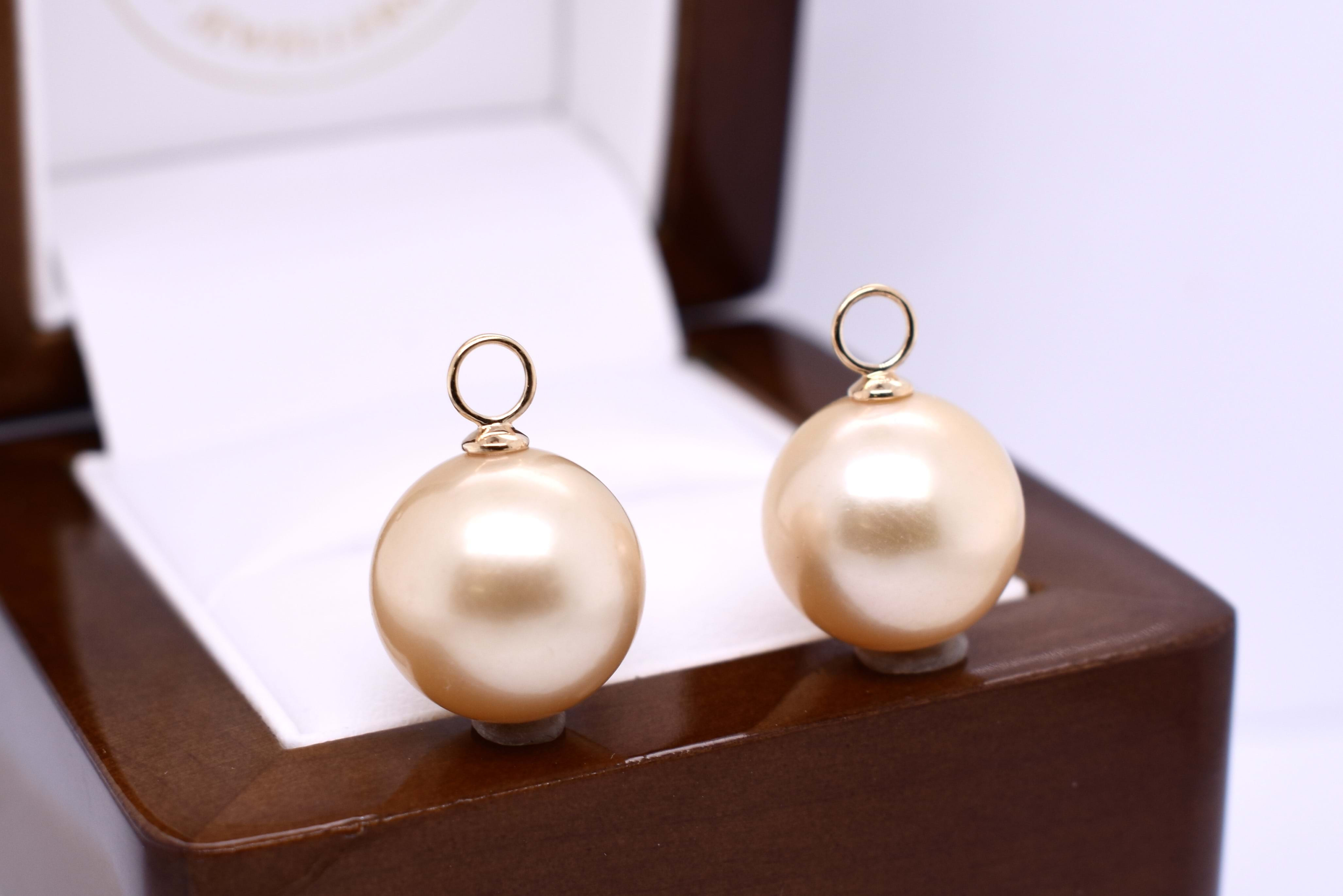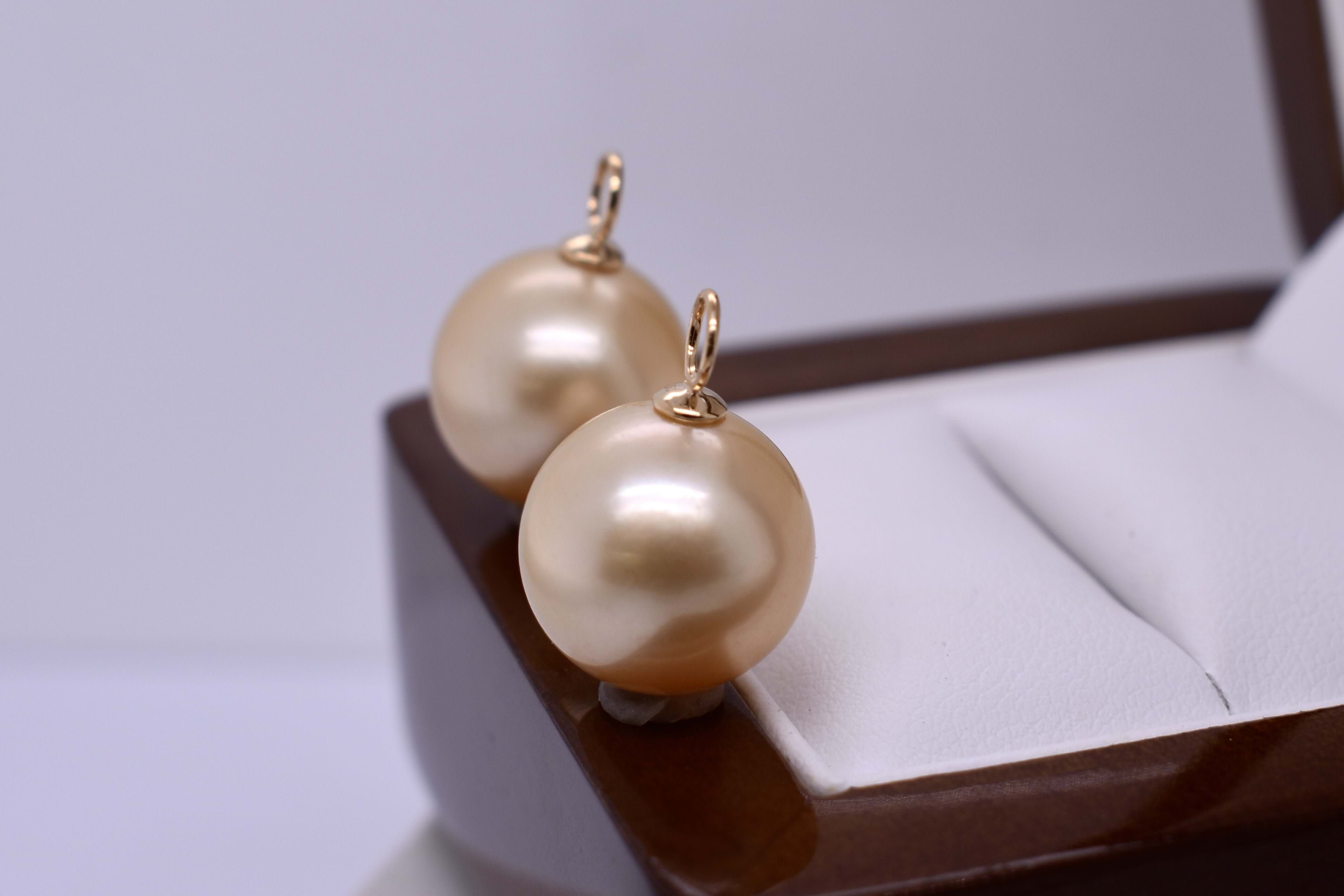 A gorgeous and stunning pair of oval 12-12.5mm south sea pearls with 18ct yellow gold cap and ring fittings, perfect to suspend from diamond huggies. Pearls independently graded as: oval, good lustre, deep gold hue, very lightly blemished. Independent valuation supplied.