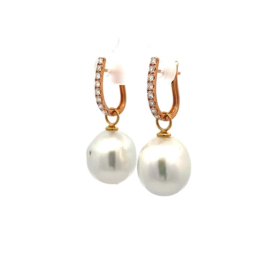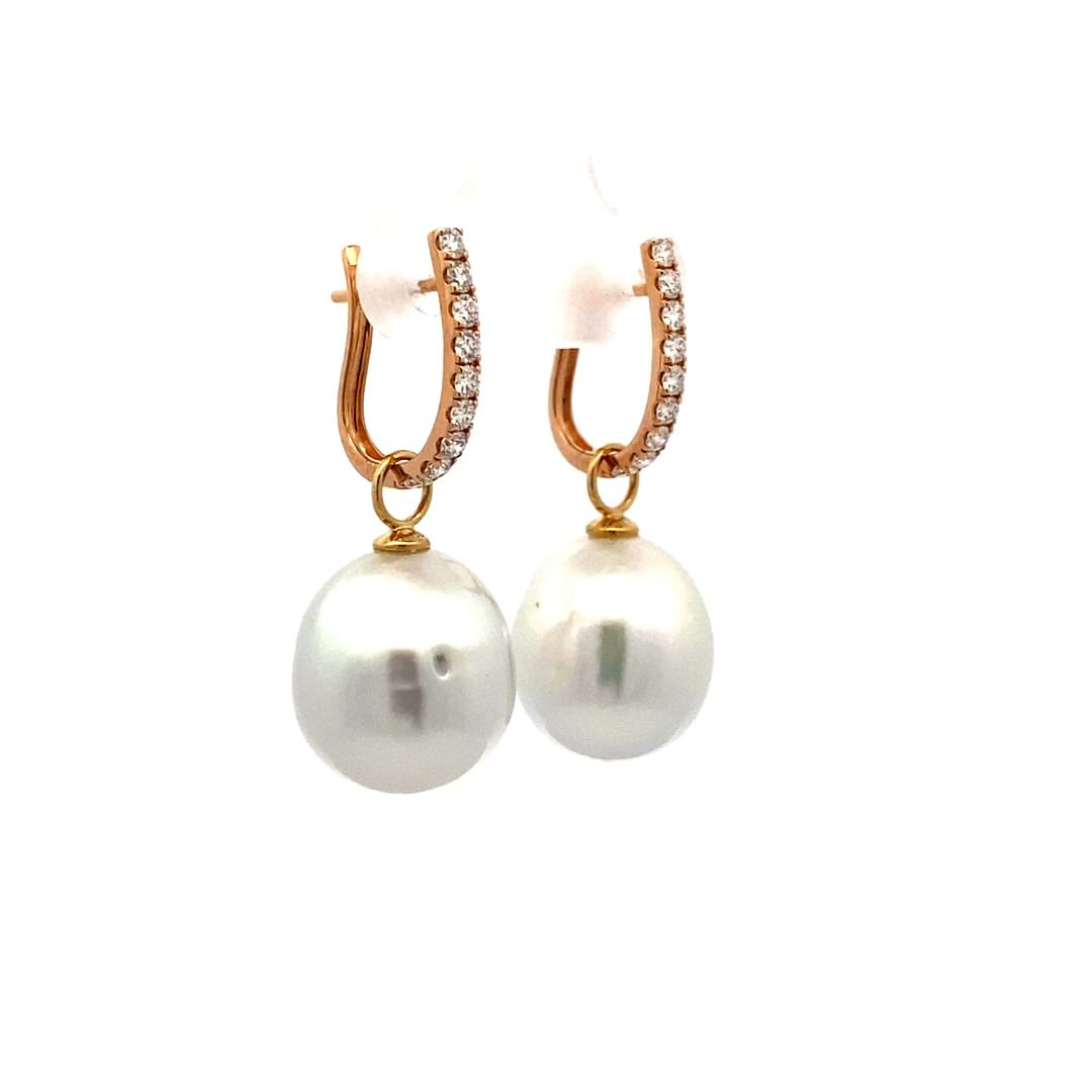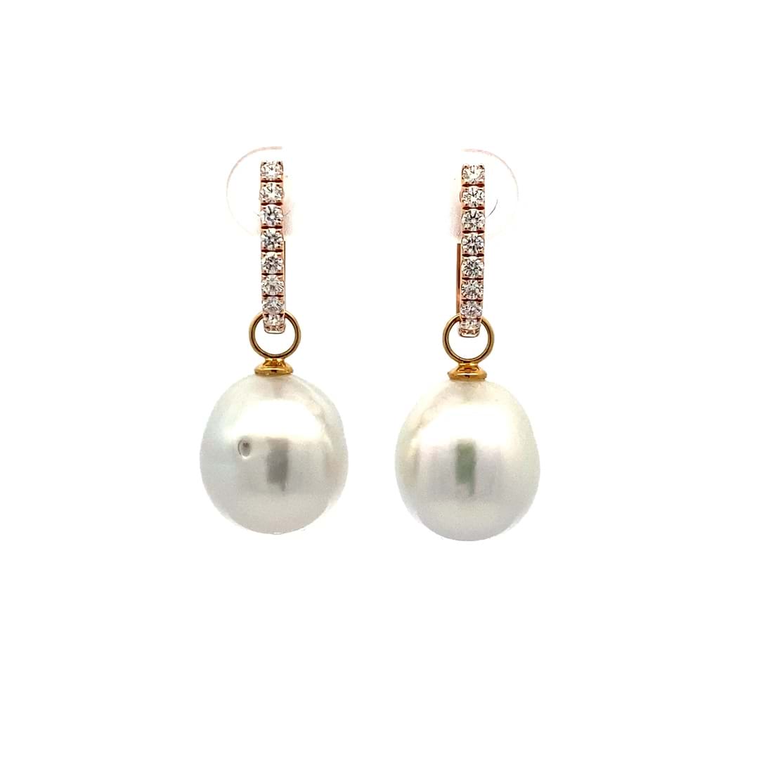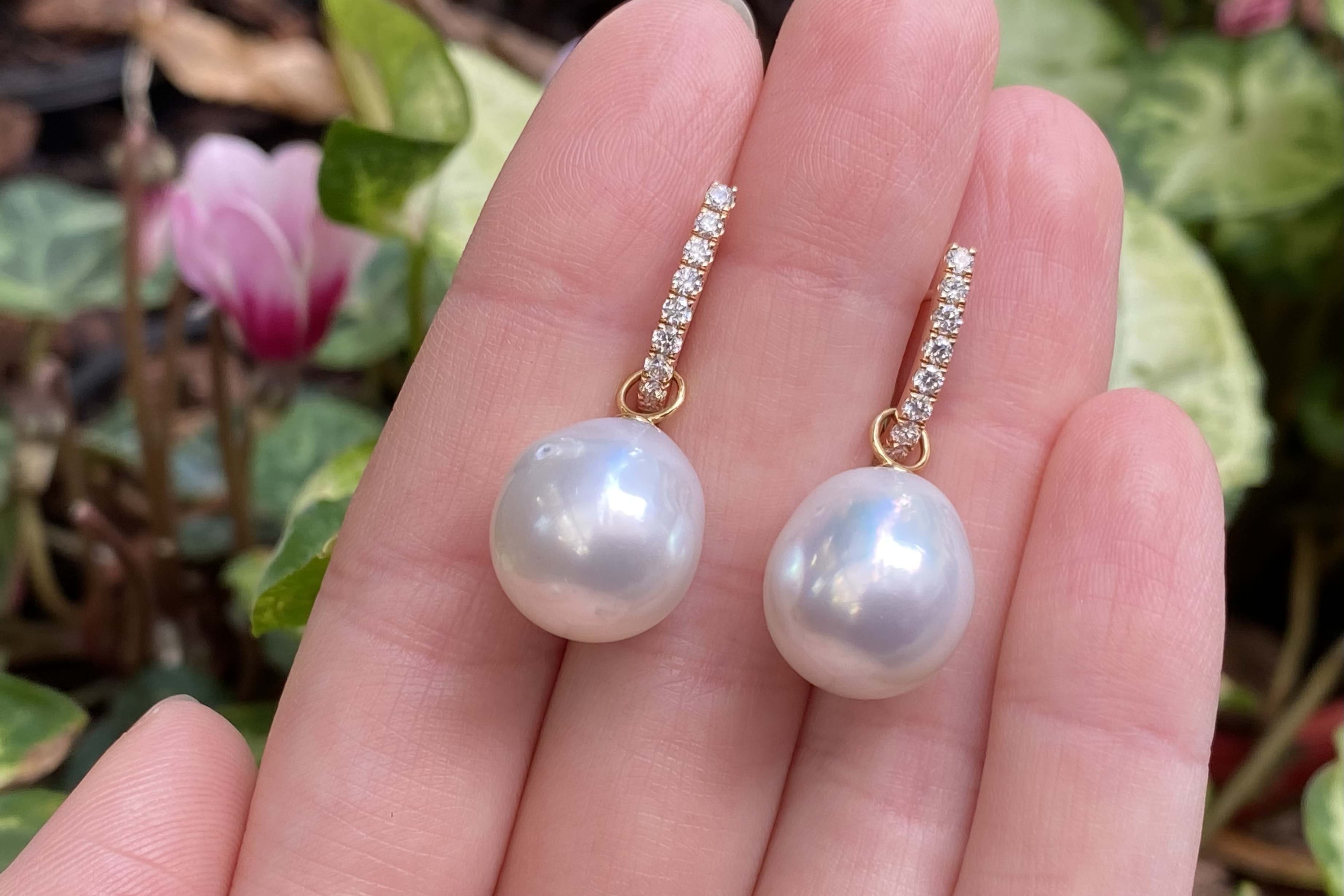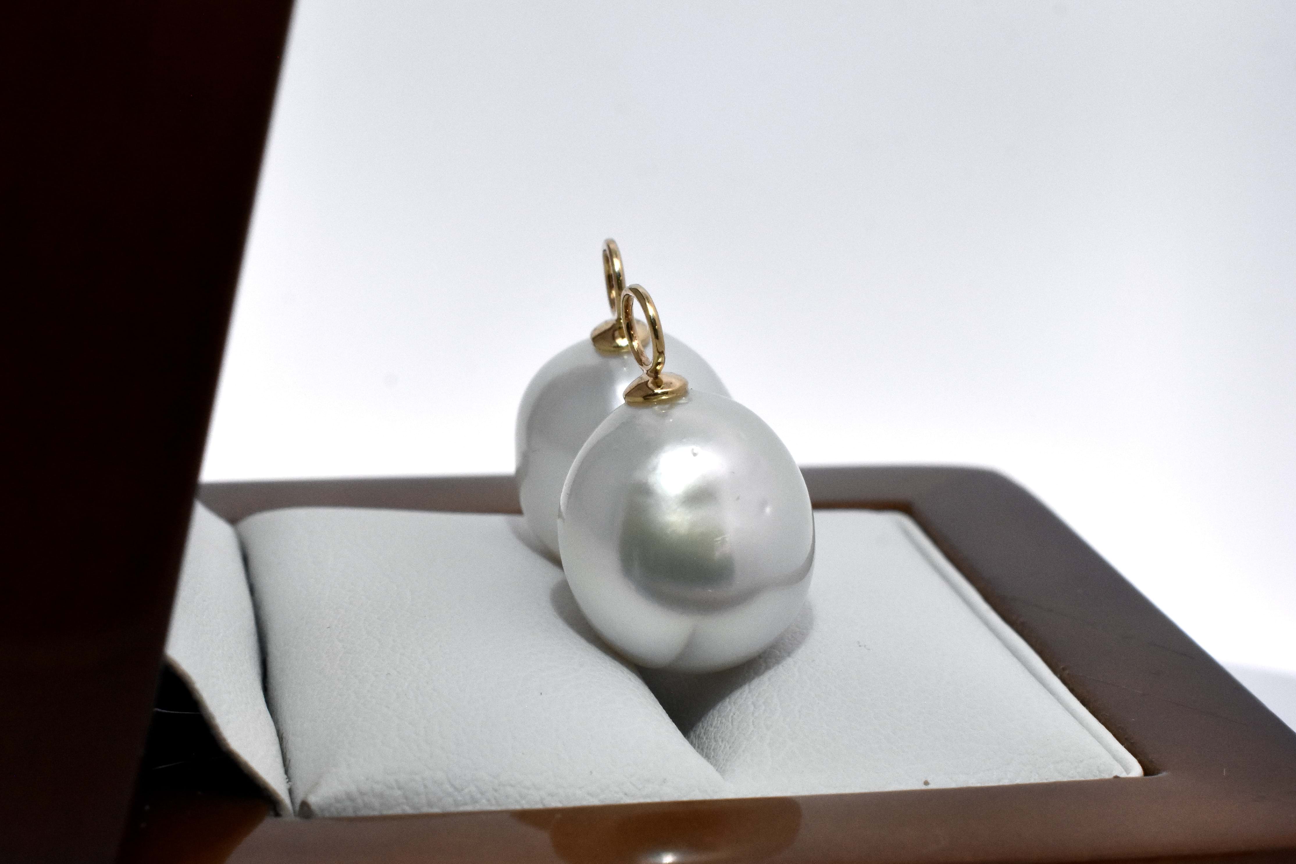 A versatile and elegant pair of oval 13.1-12.91mm south sea pearls, with 18ct yellow gold cap and ring fittings perfect to suspend from diamond huggies
