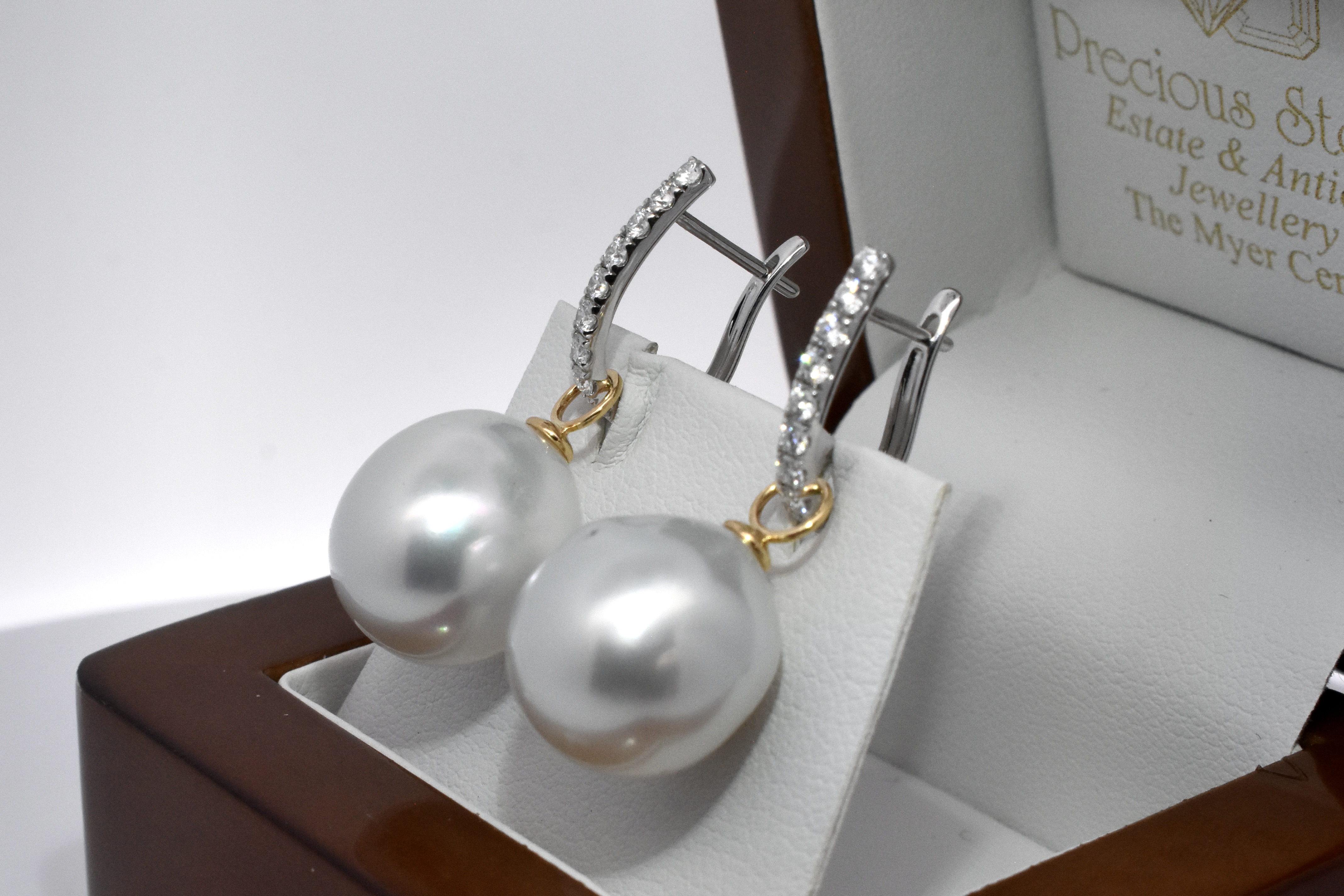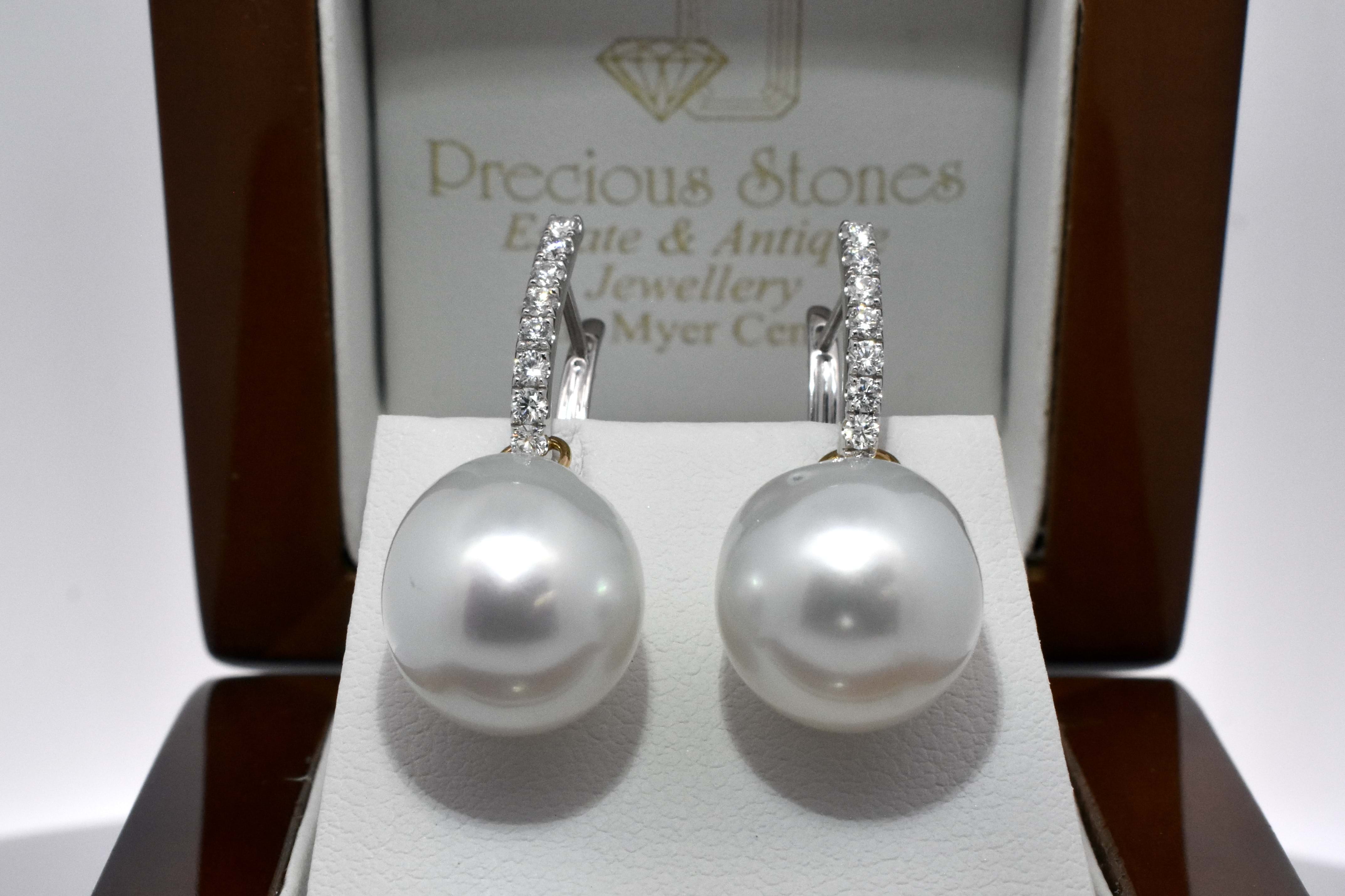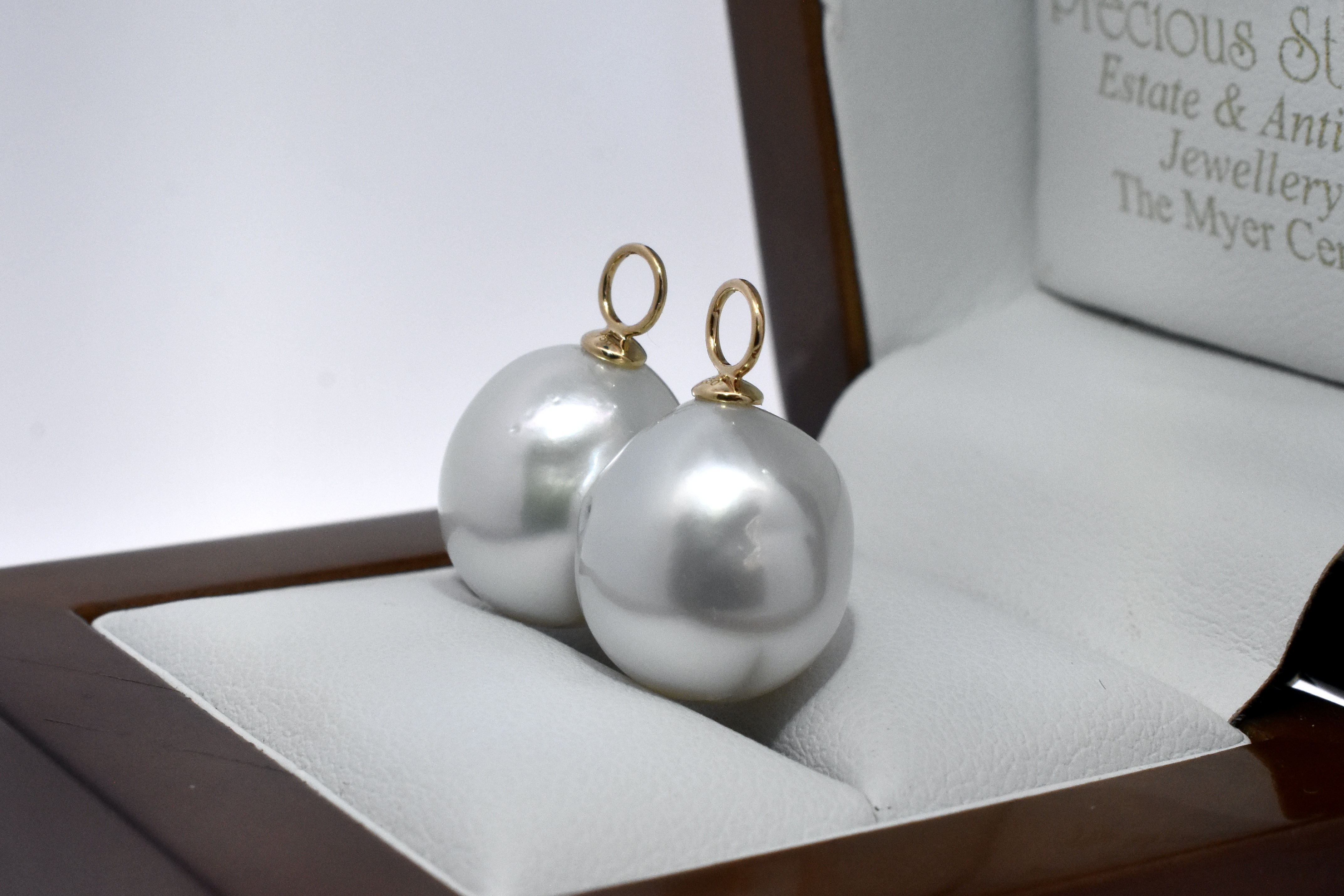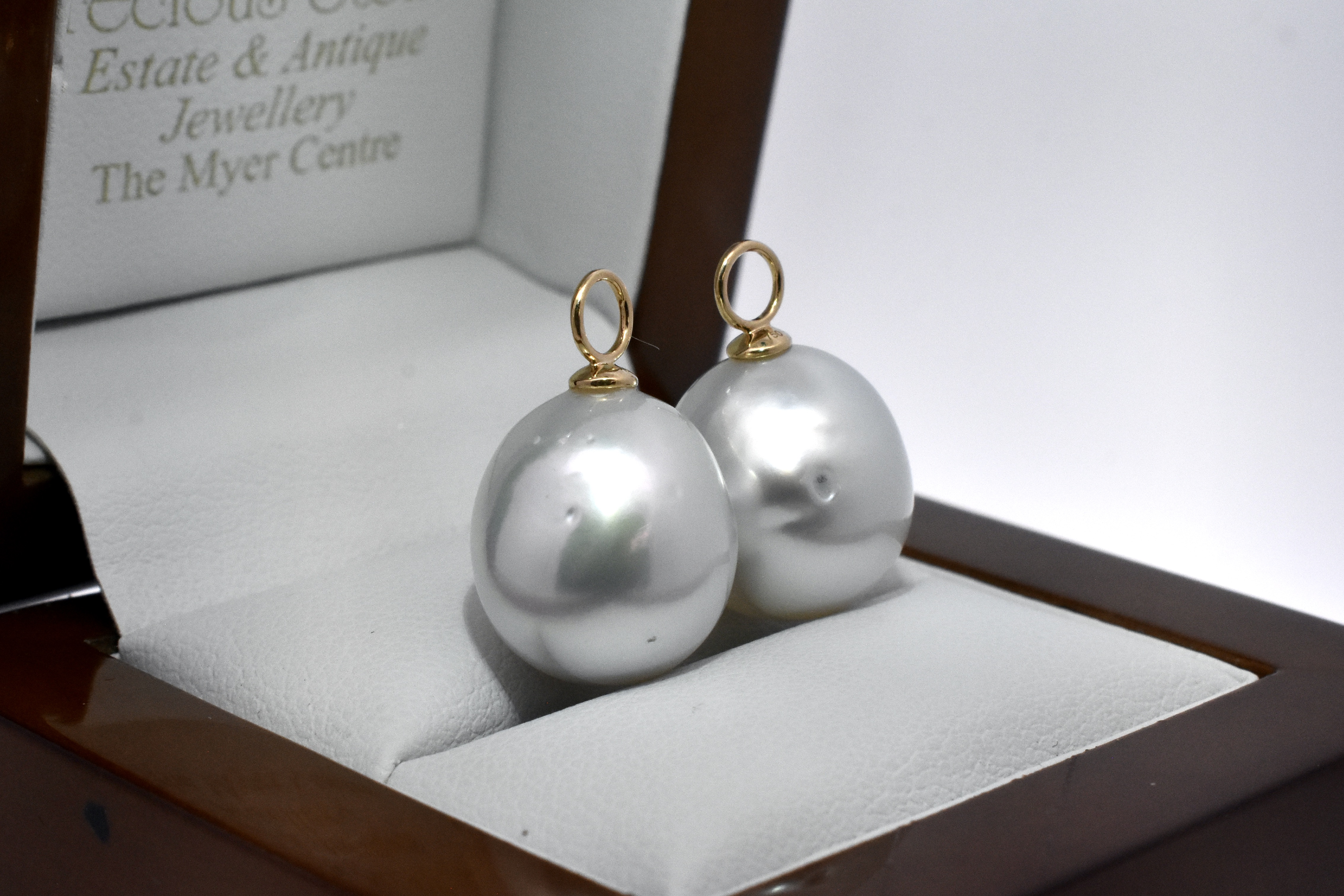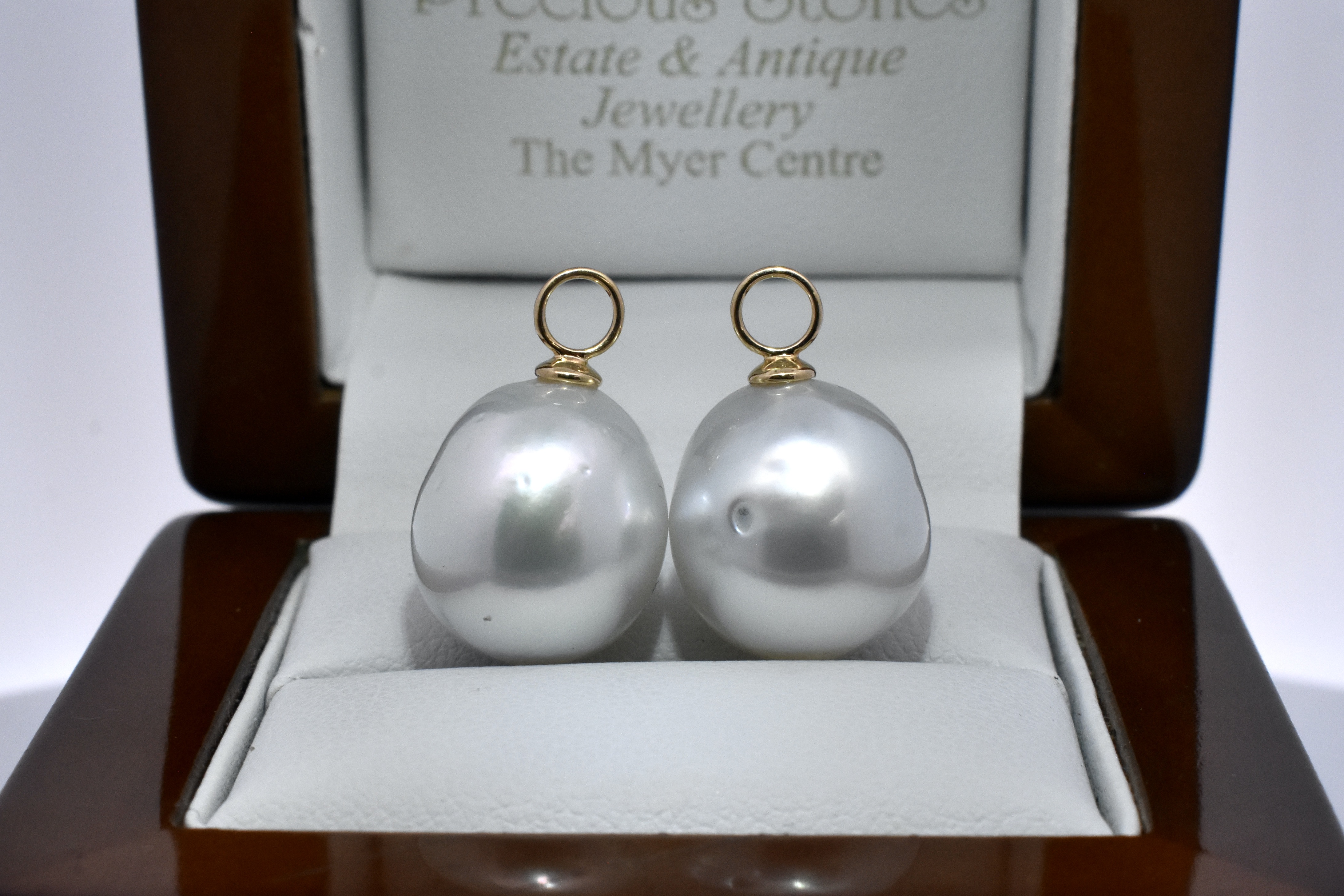 A versatile and elegant pair of oval 13.1-12.91mm south sea pearls, with 18ct yellow gold cap and ring fittings perfect to suspend from diamond huggies