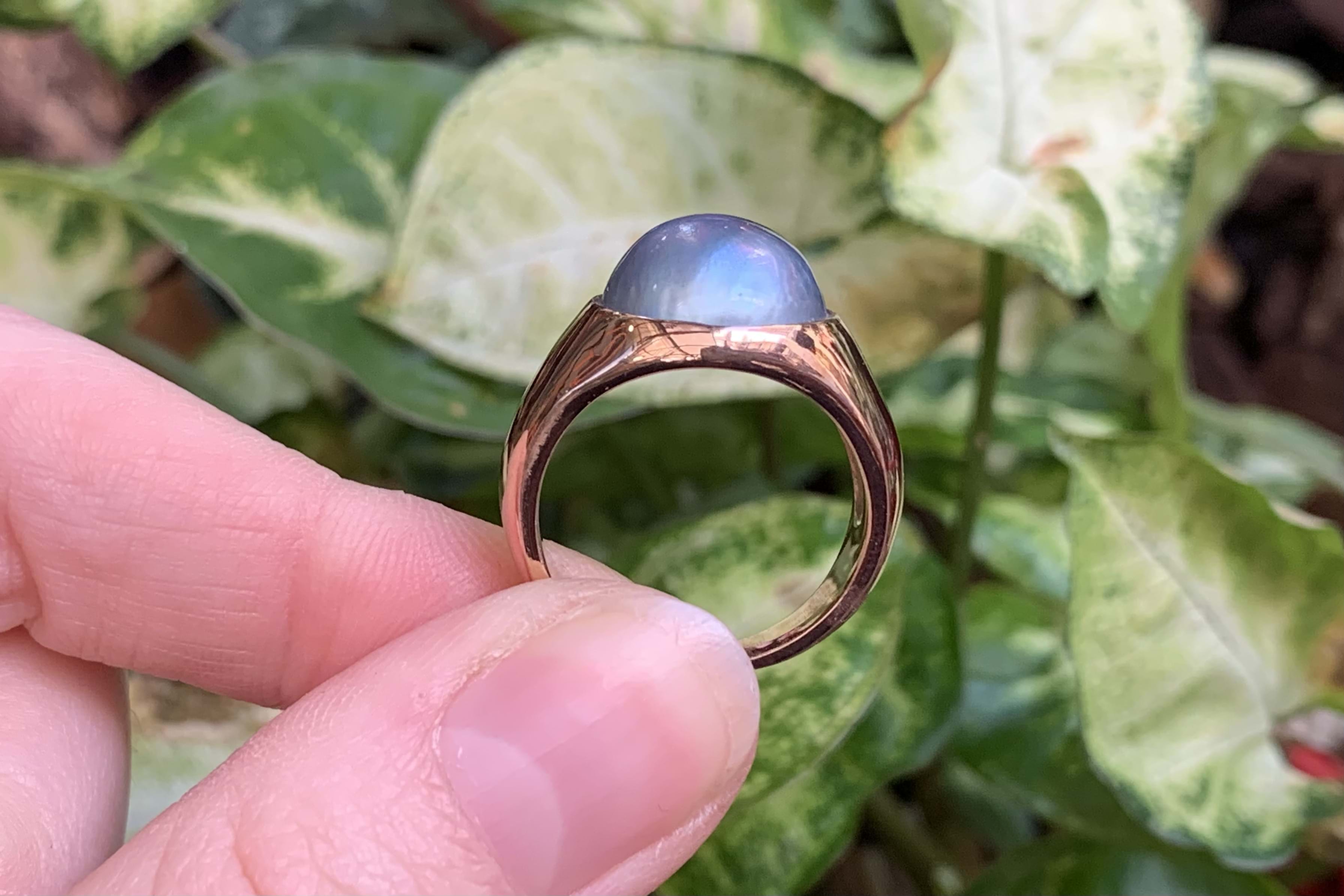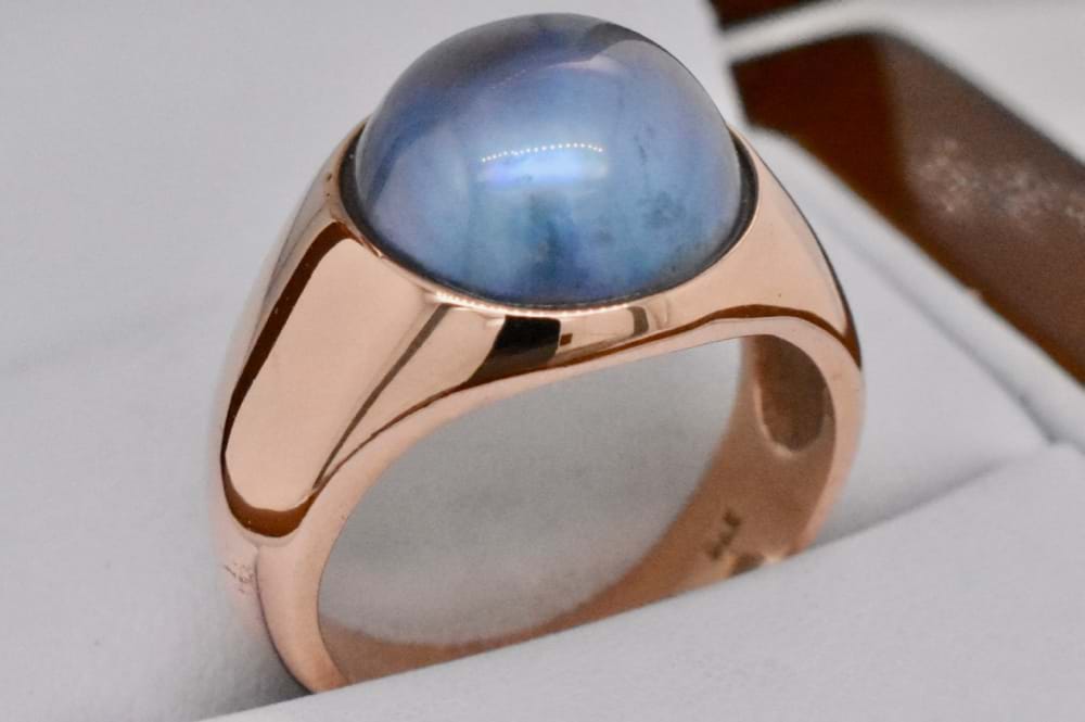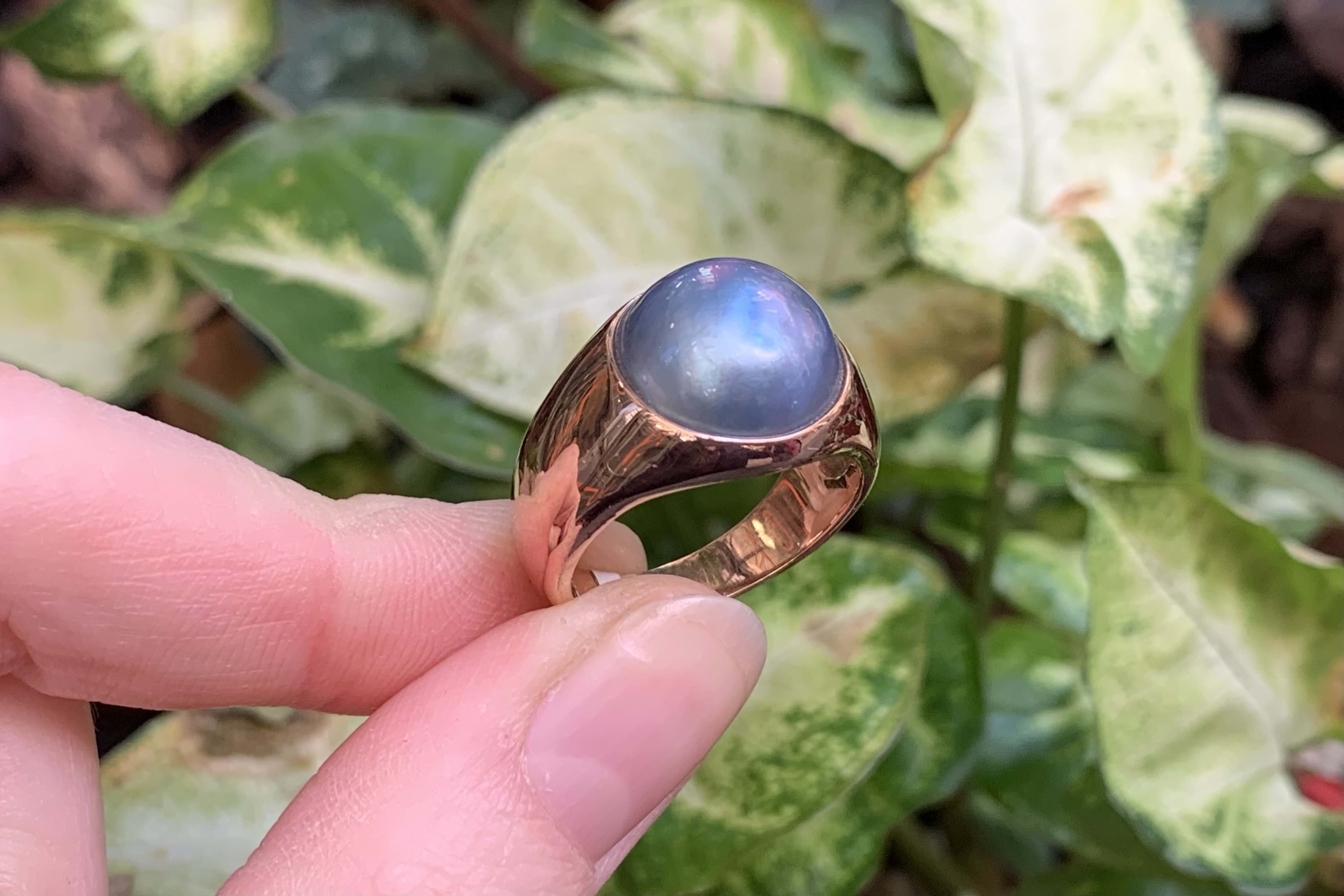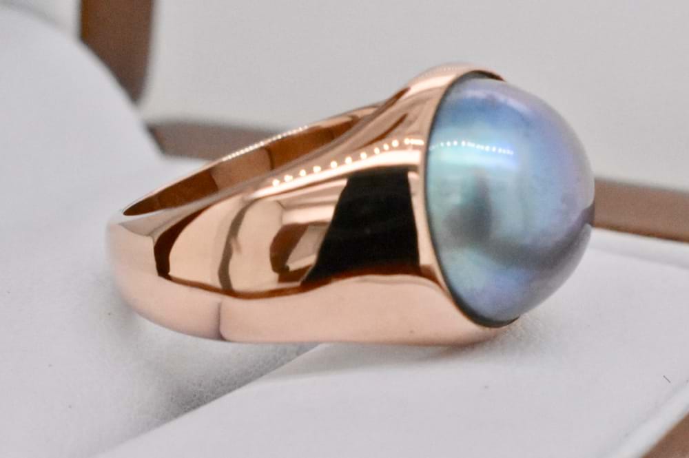 A beautiful black Mabe Pearl set in a 9ct Rose Gold band. Finger size N+.