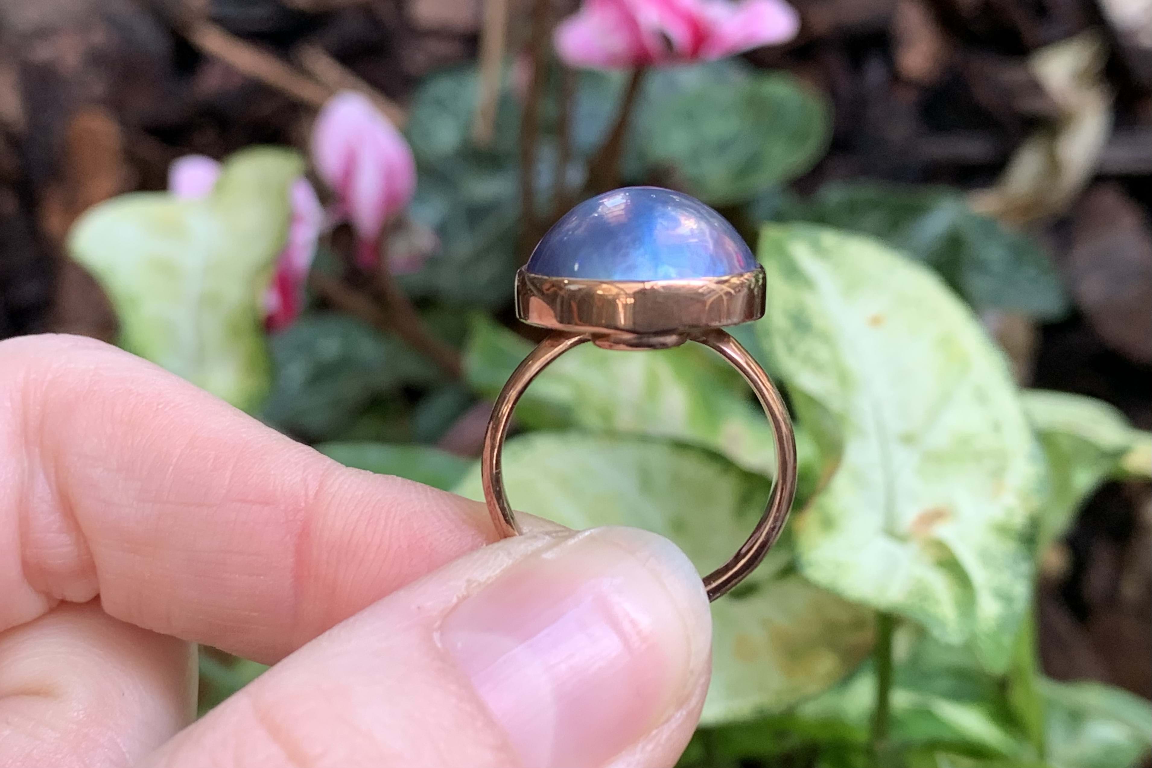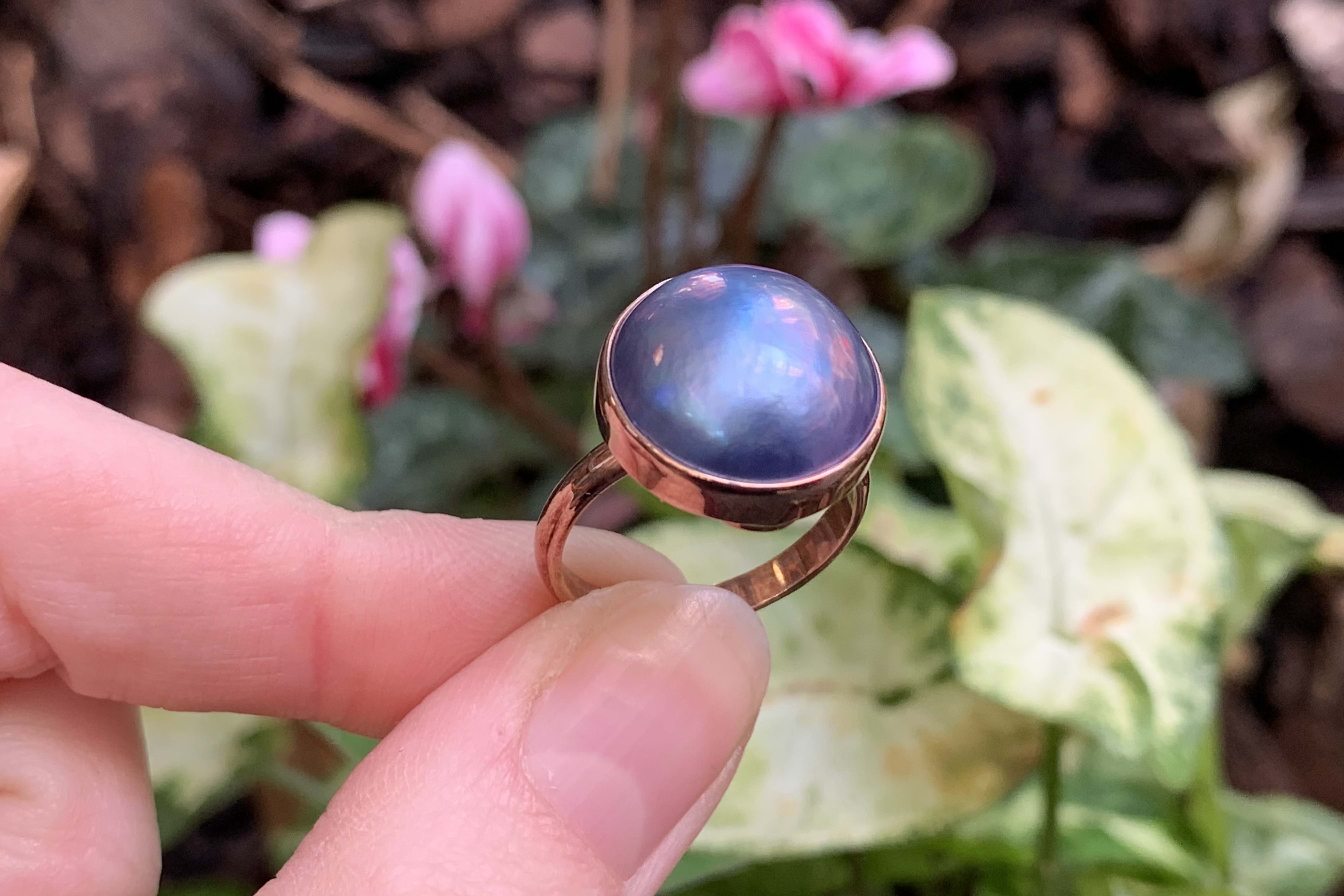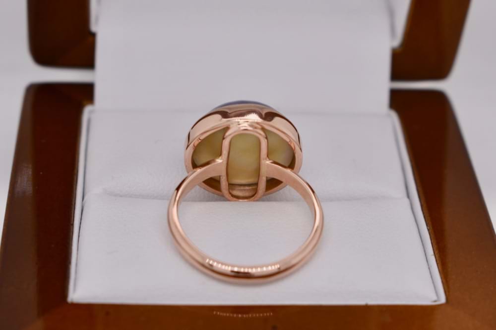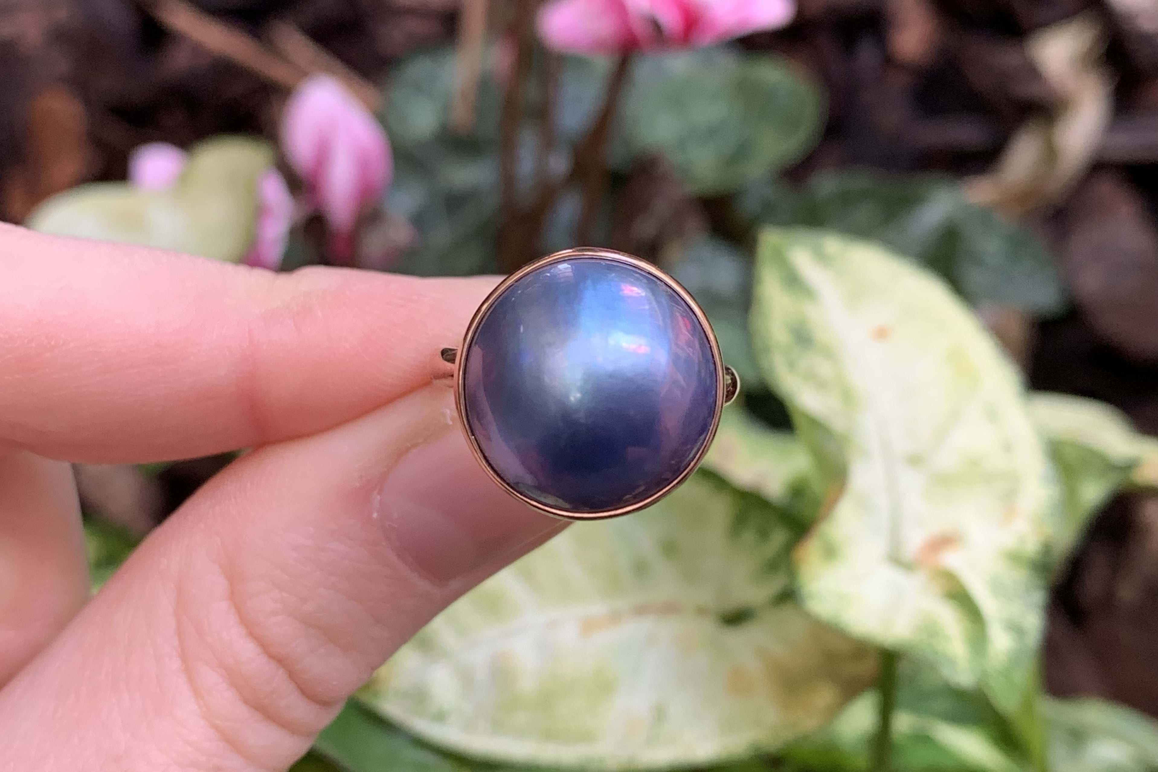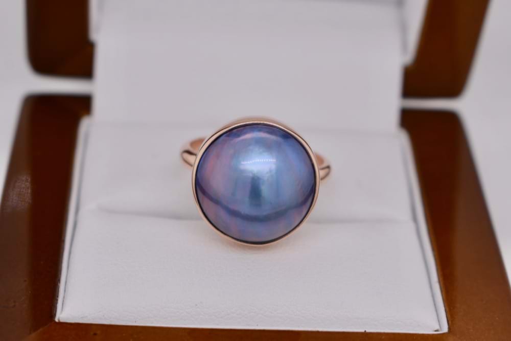 9ct rose gold handmade ring featuring one beautiful black mabe pearl (dyed) in a bezel setting. Pearl measures 15mm. Finger size M