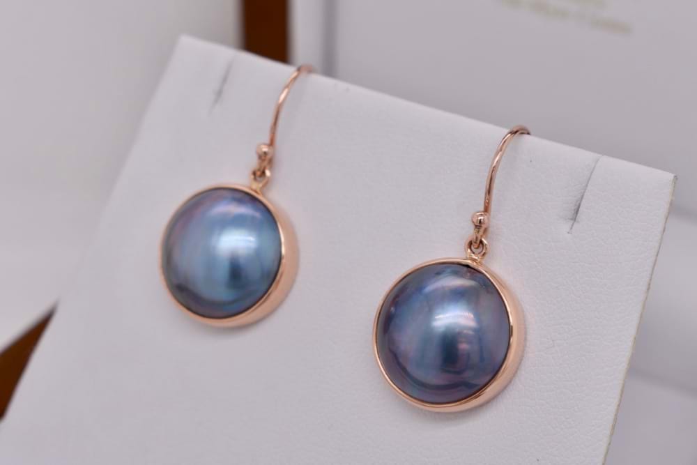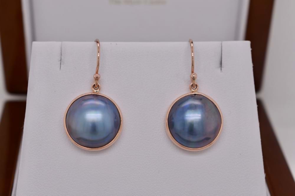 9ct rose gold handmade earrings featuring a pair of round black mabe pearls (dyed) in bezel settings suspended from shepherd hooks. Pearls measure 15mm
