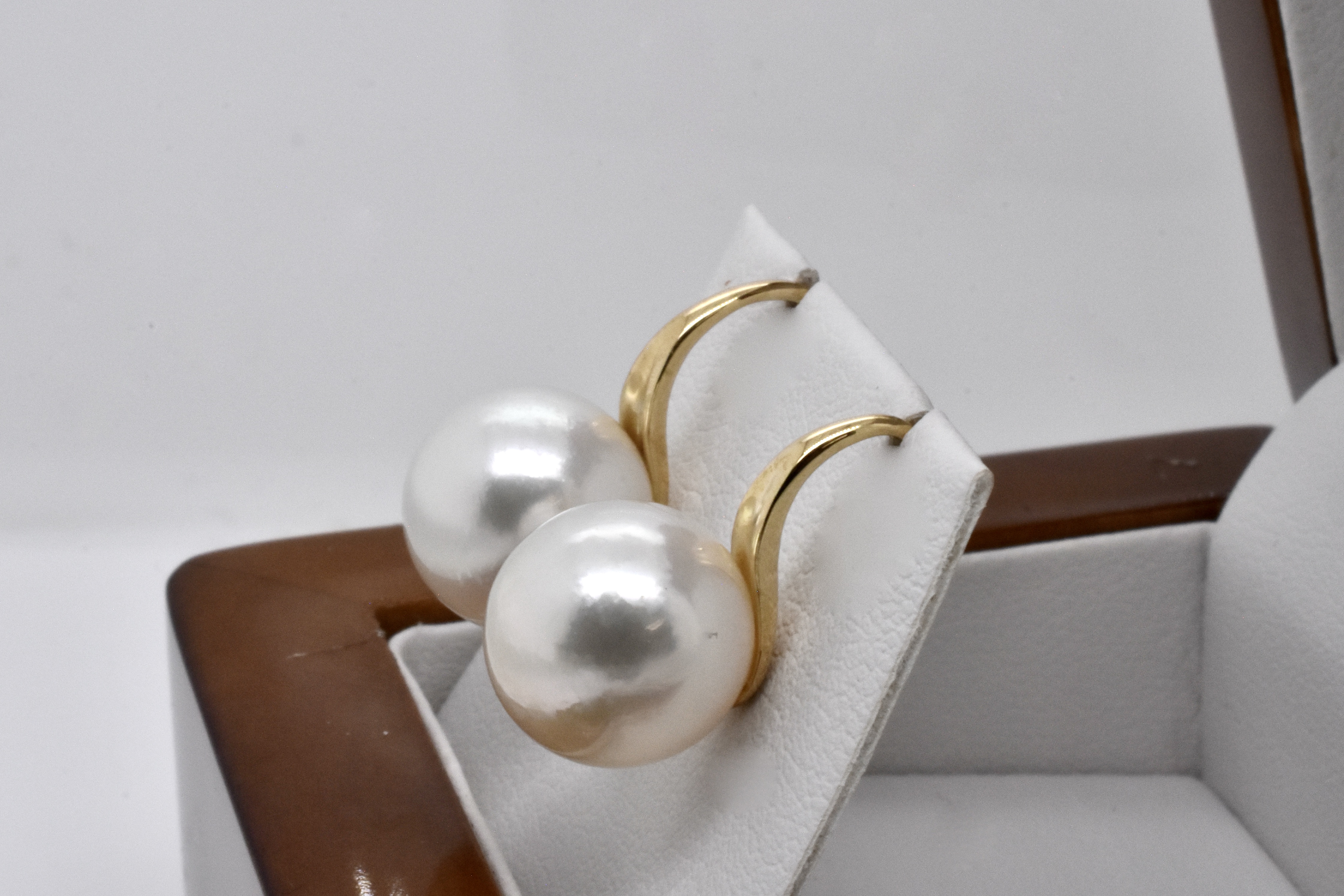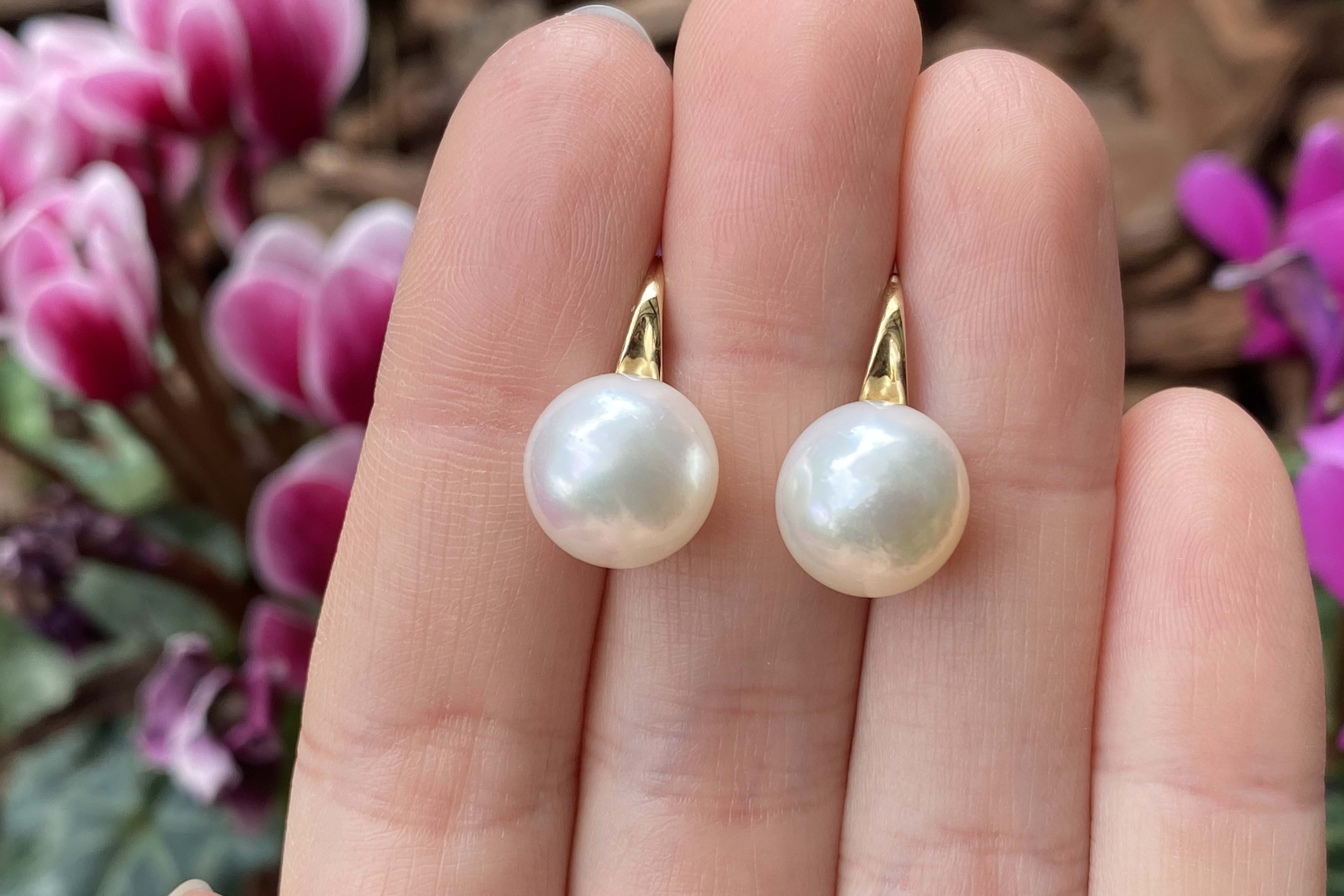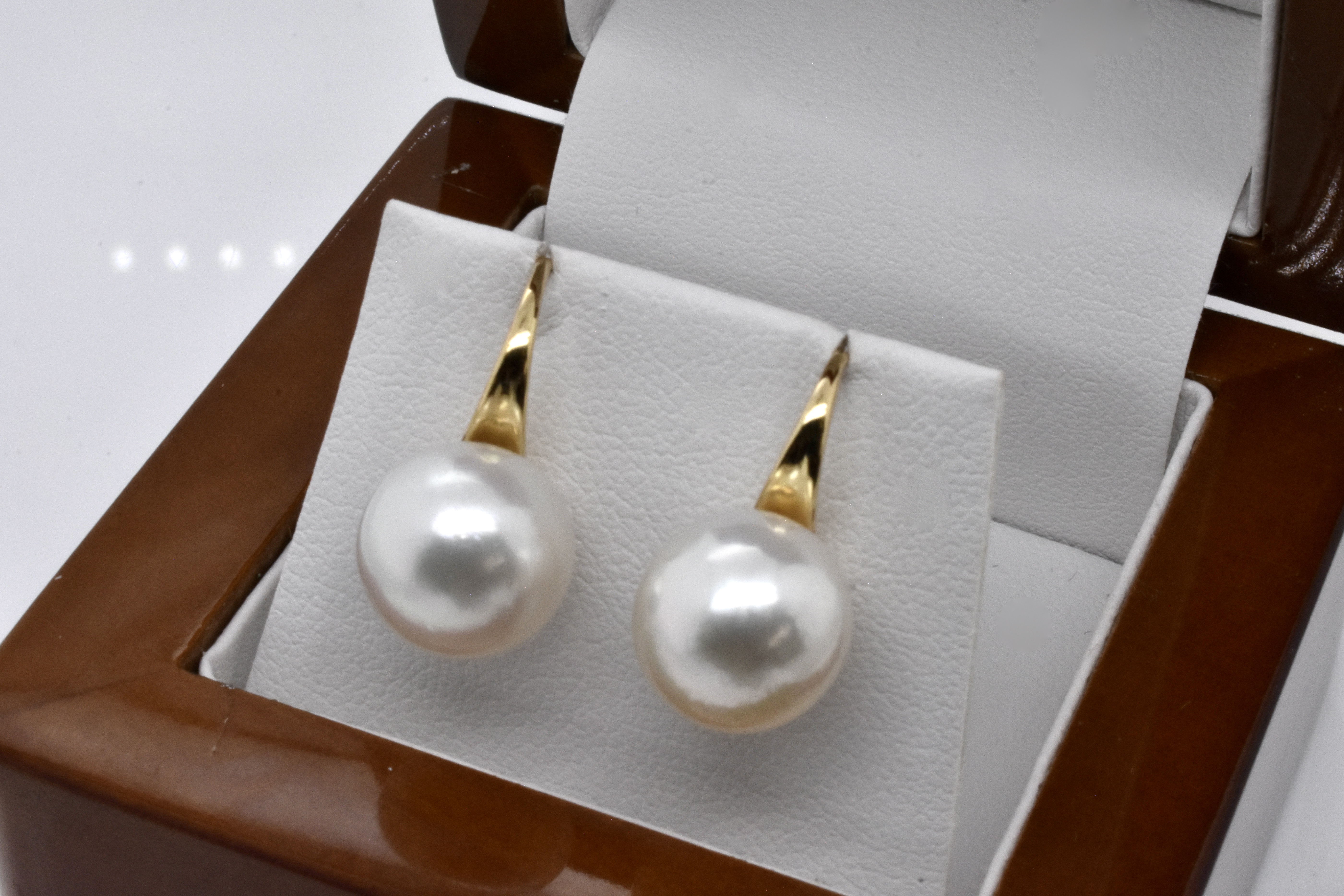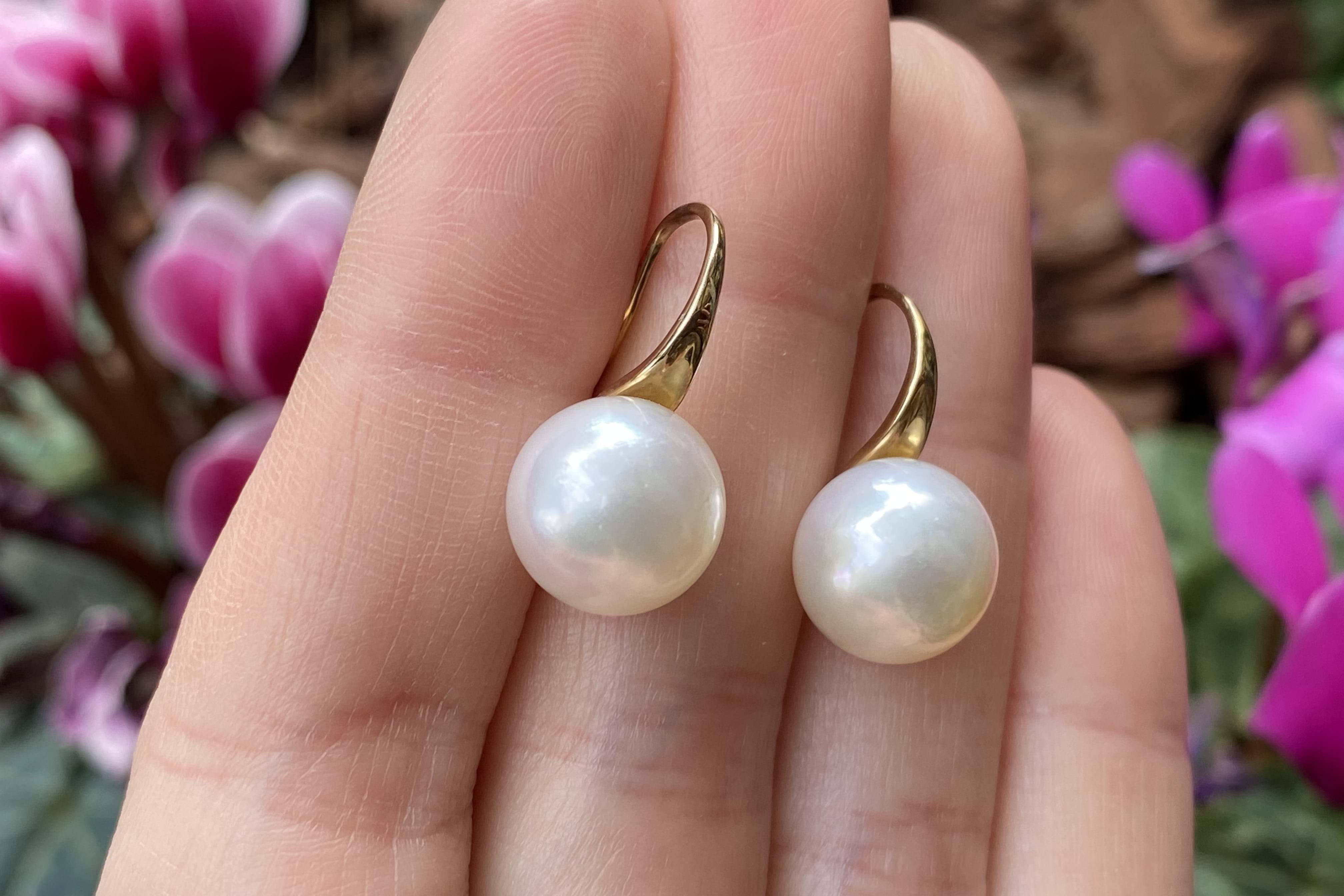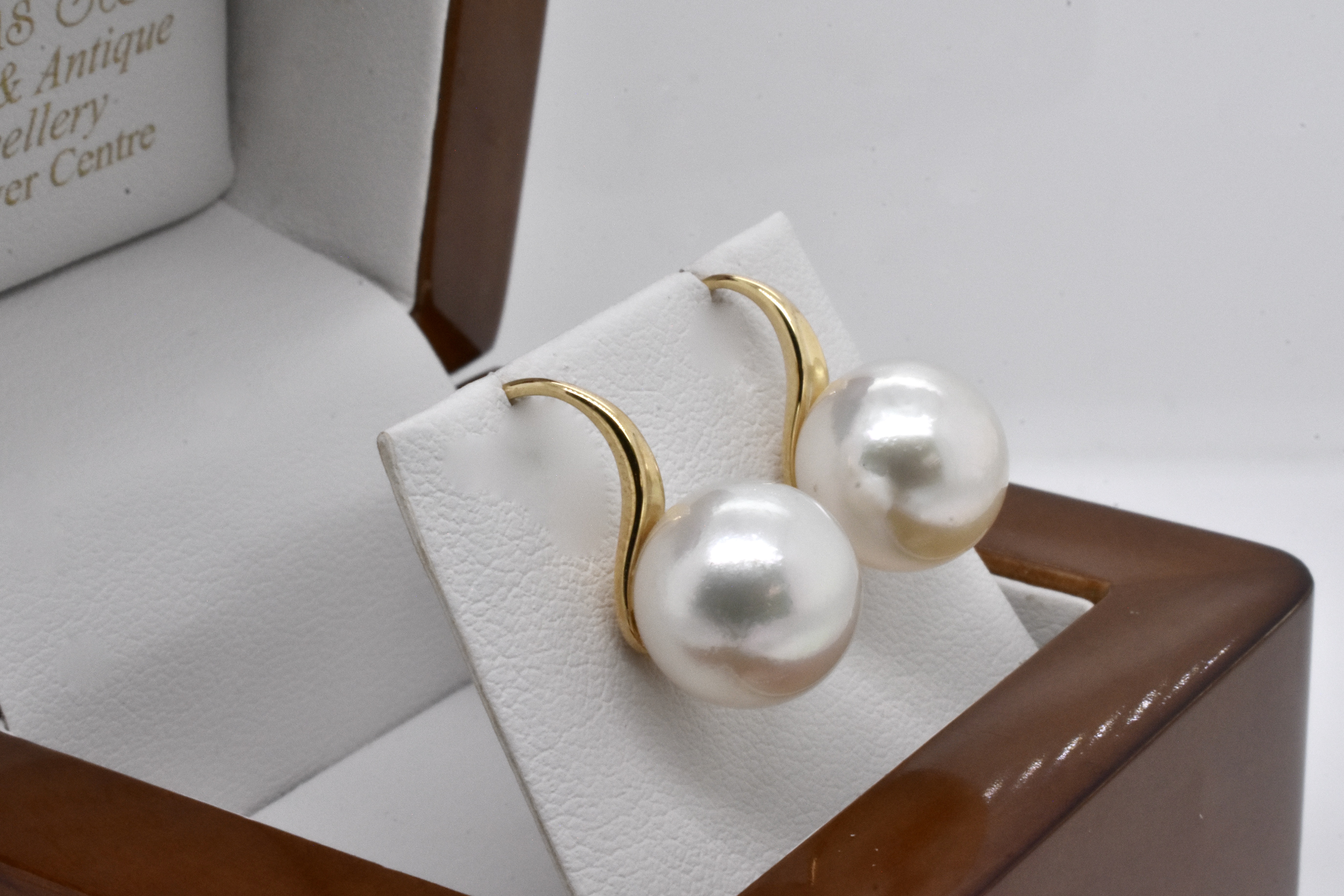 An elegant pair of white, round south sea pearls measuring 10.5-11mm with a good lustre in elegant, curved 9ct yellow gold settings with shepherd hooks