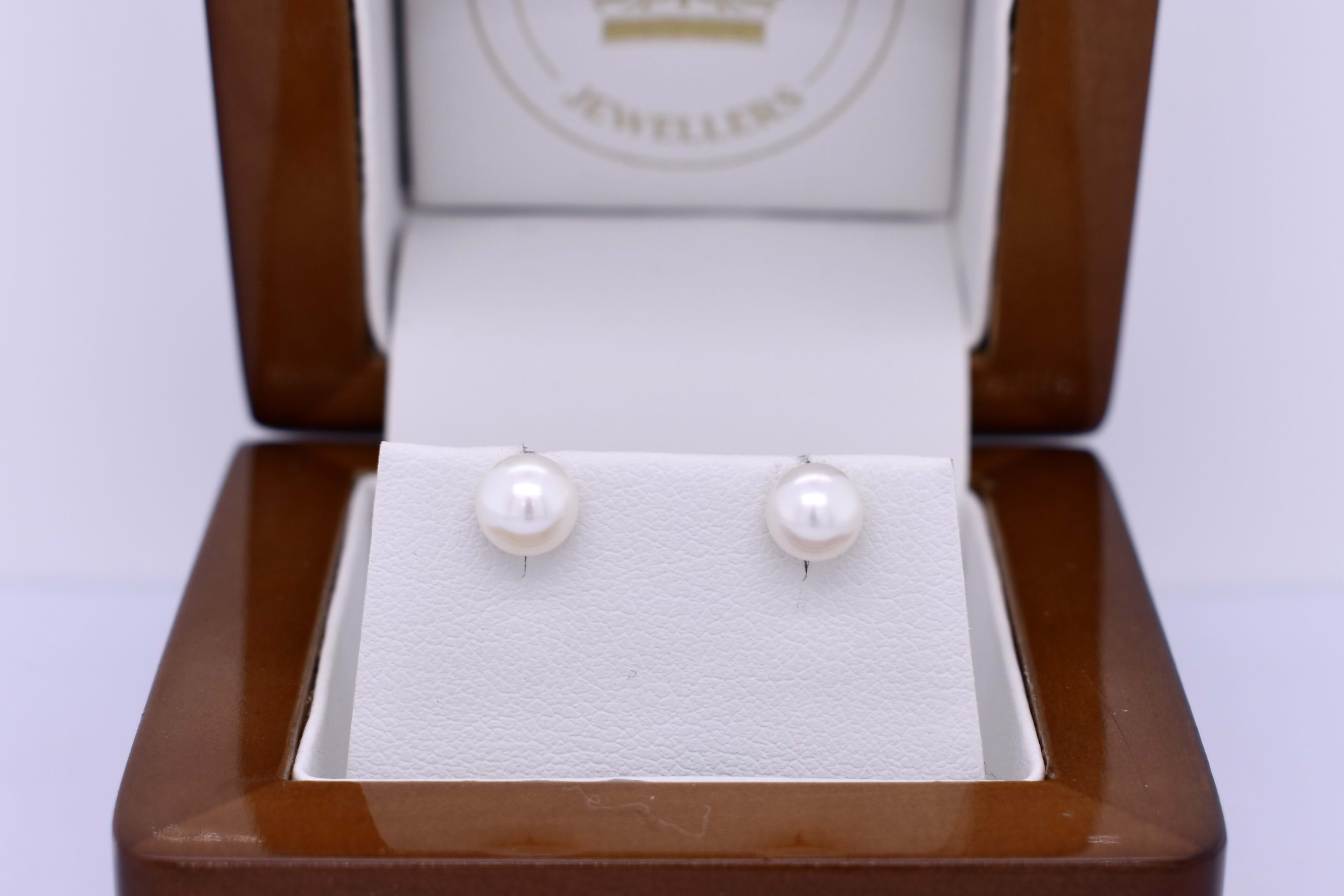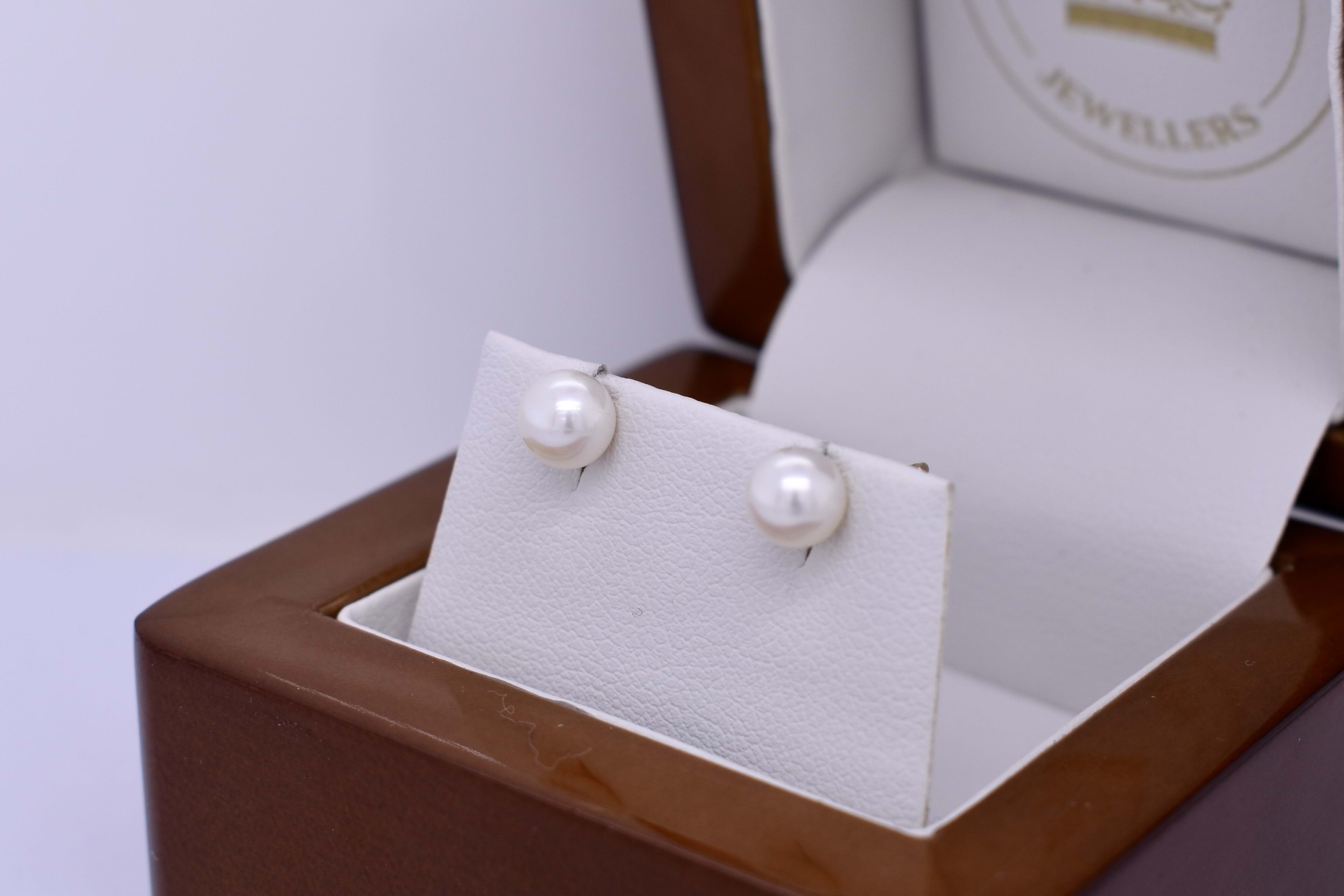 Classic pair of pearl earrings, with two 5.5-6.0mm near round white freshwater pearls in 9ct yellow gold studs, with post and butterfly fittings.