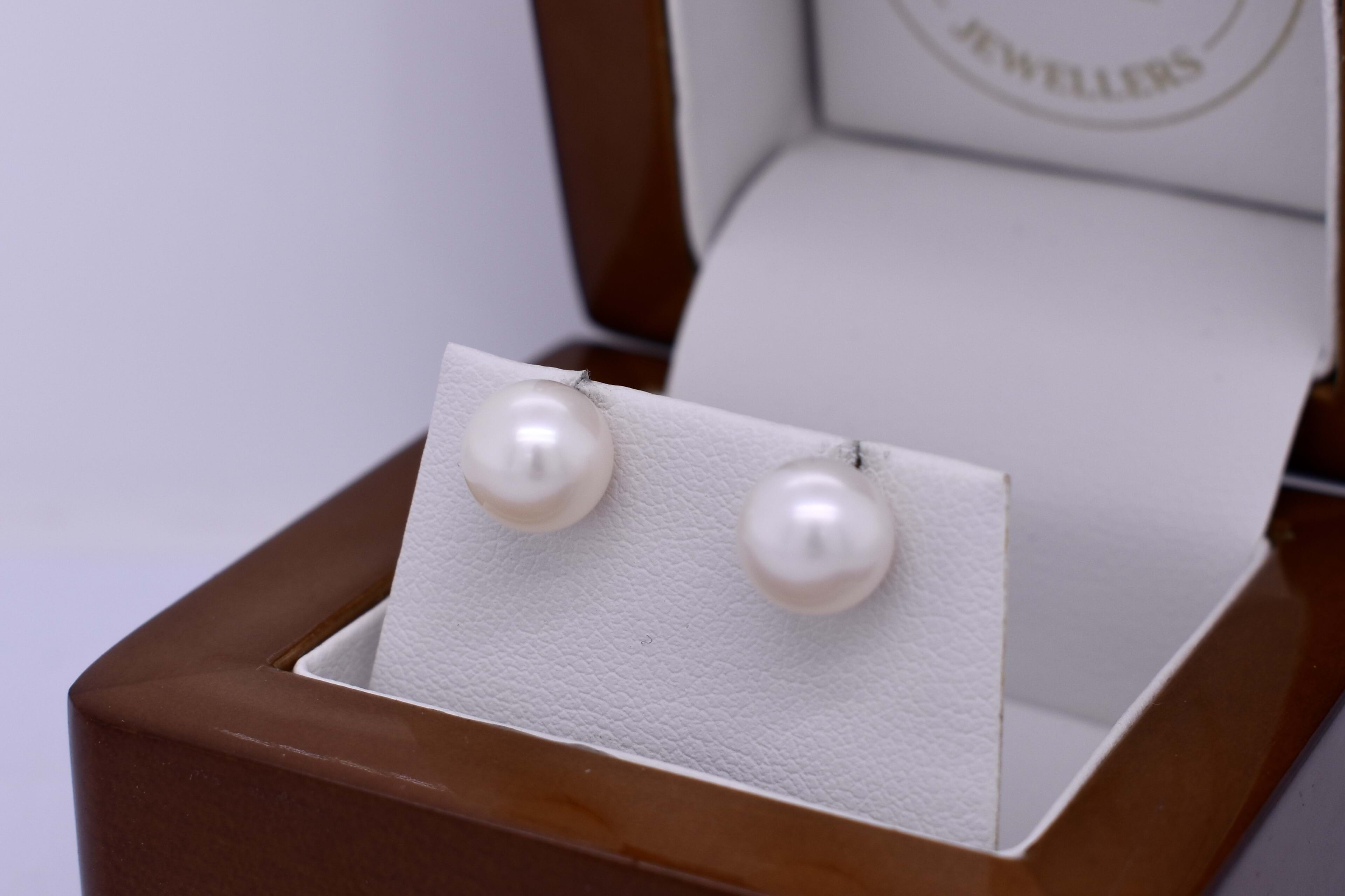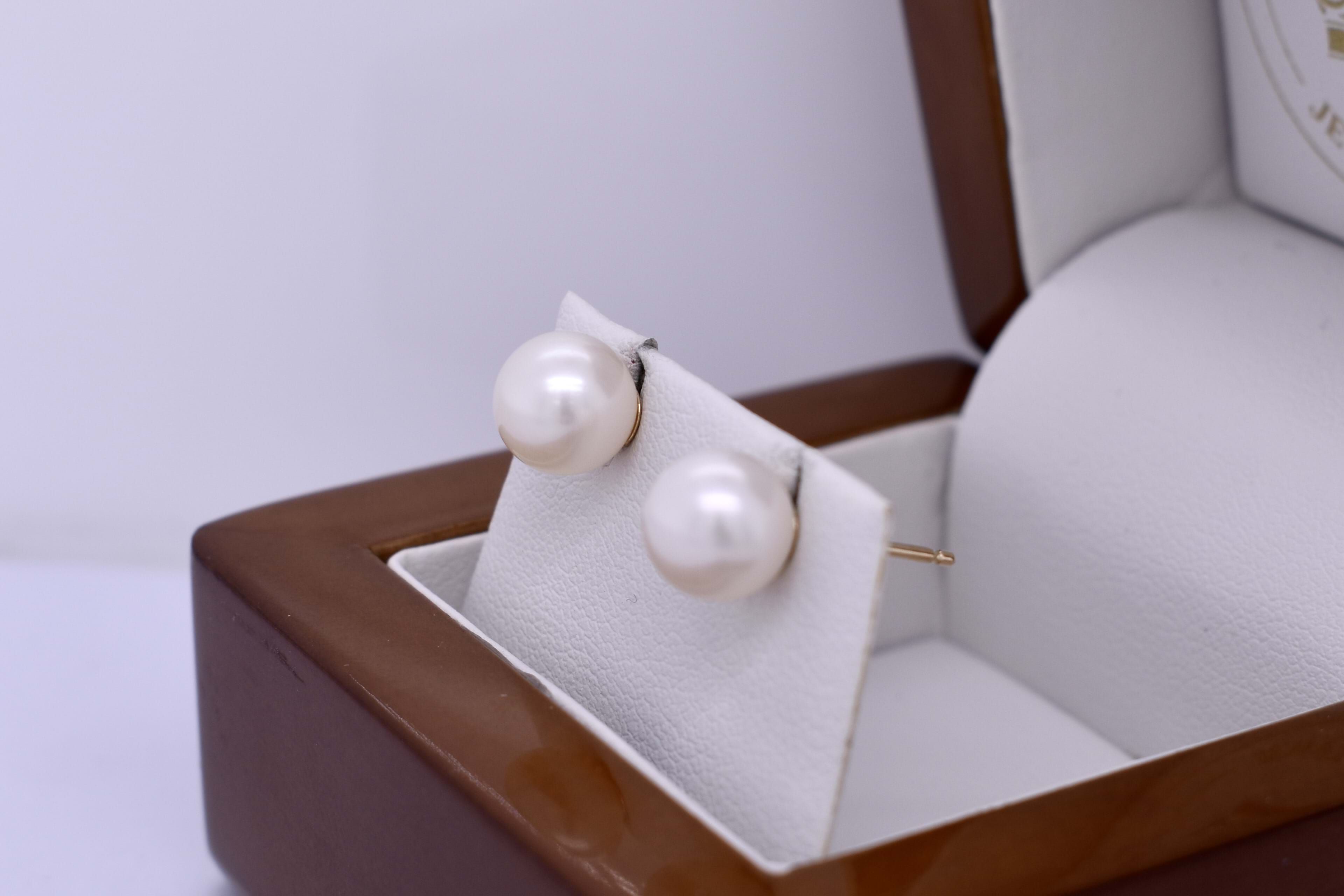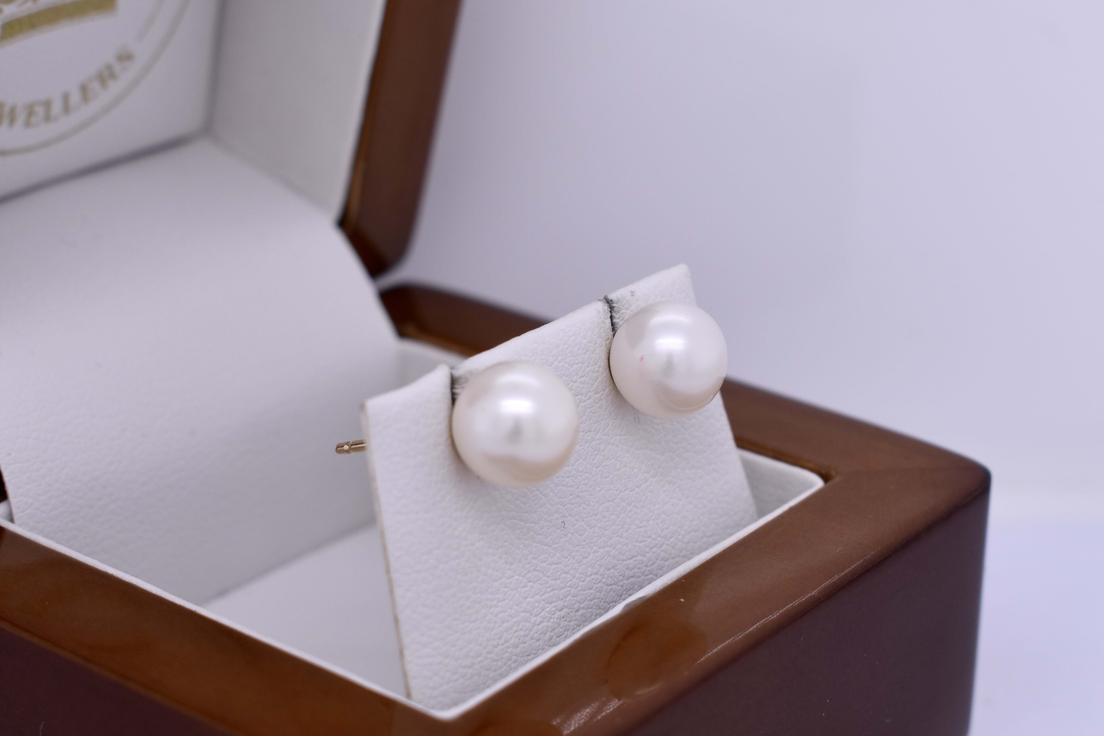 Timeless pair of pearl earrings, with two 7.5-8.0mm near round white freshwater pearls in 9ct yellow gold studs, with post and butterfly fittings.