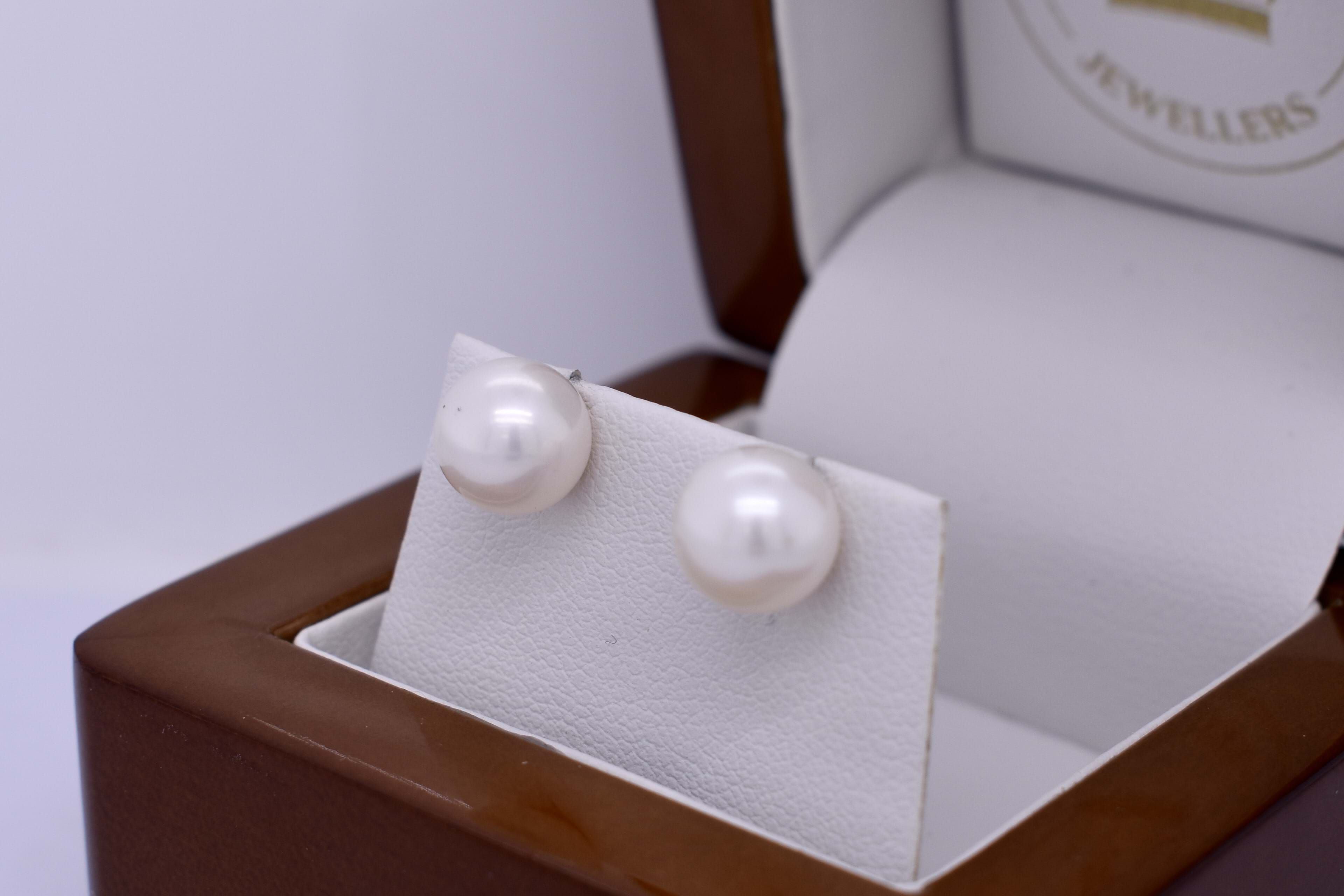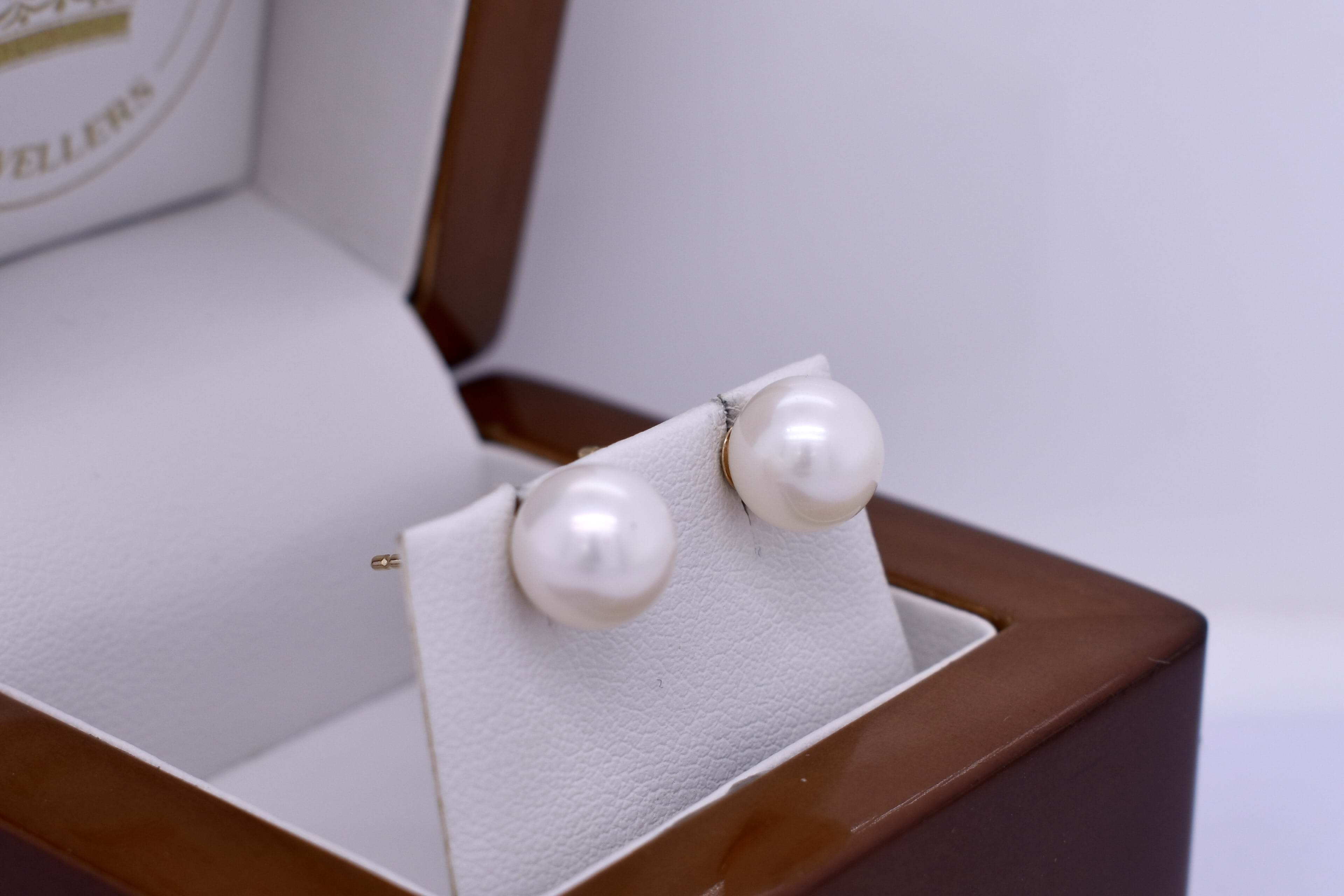 Lovely pair of pearl earrings, with two 8.0-8.5mm near round white freshwater pearls in 9ct yellow gold studs, with post and butterfly fittings.