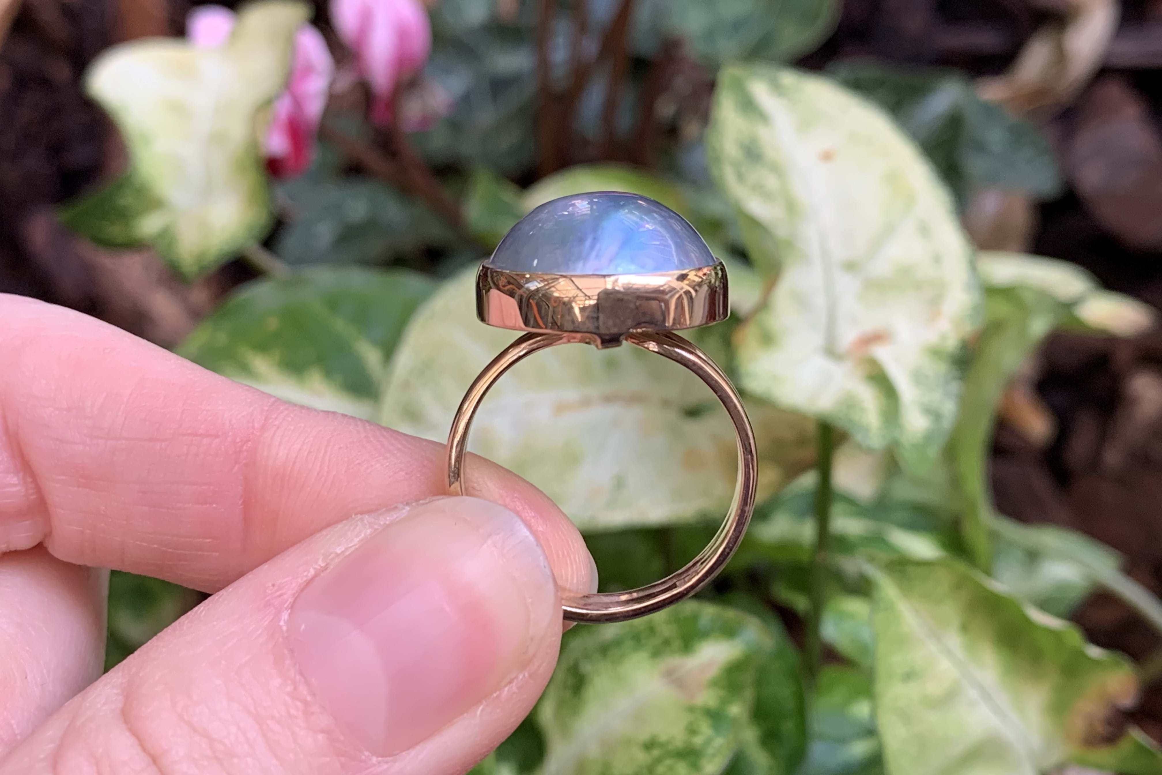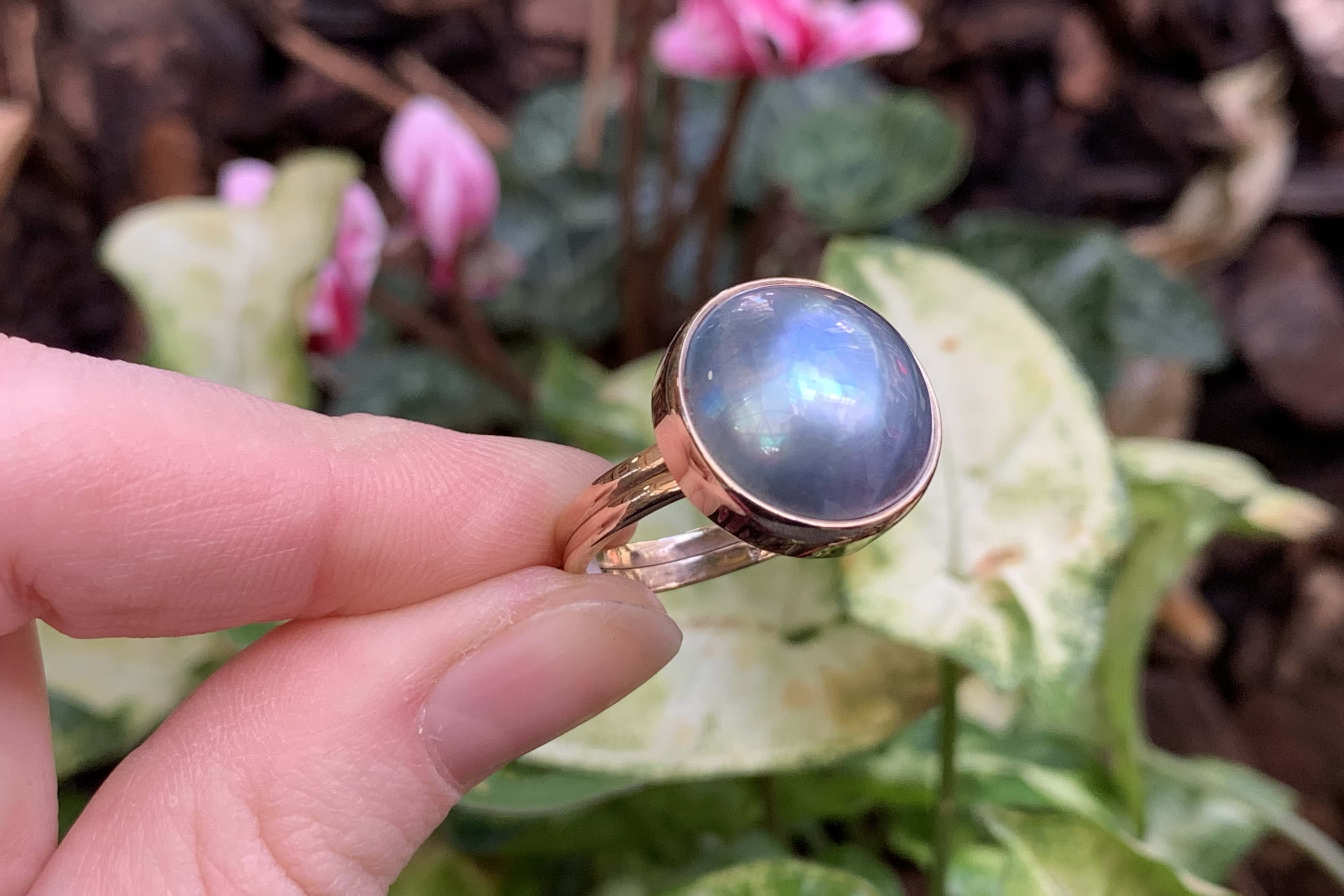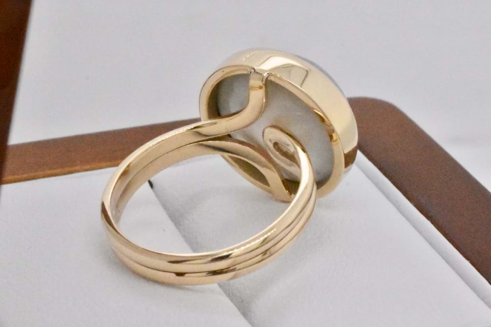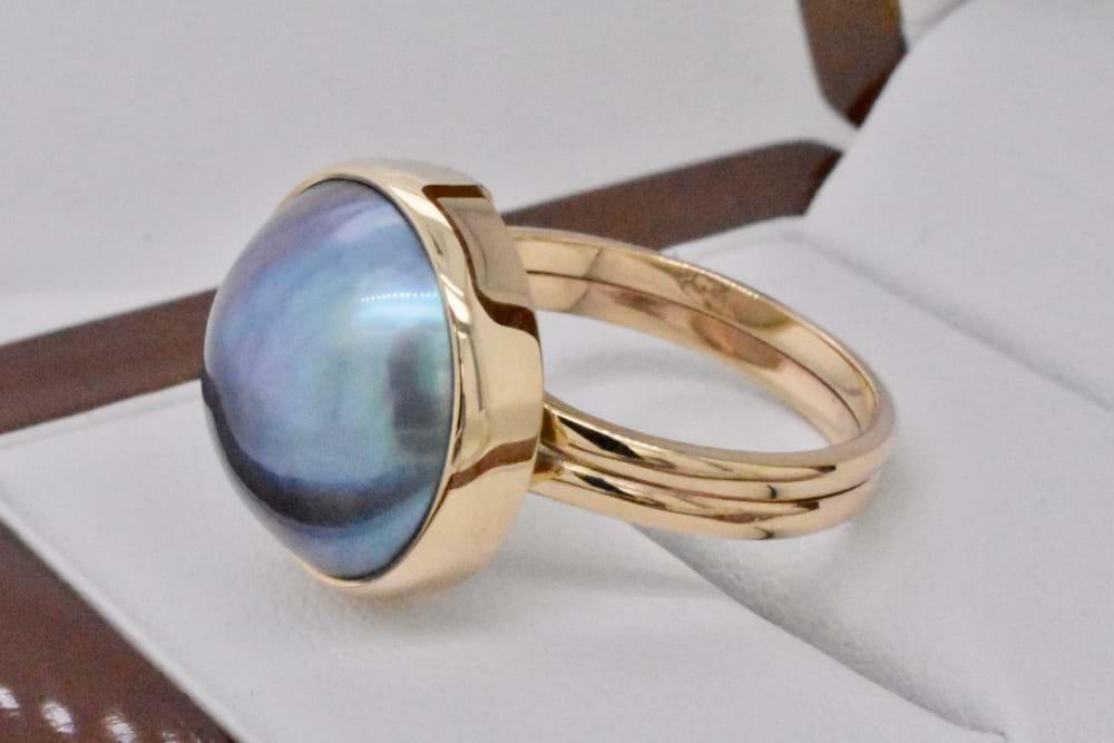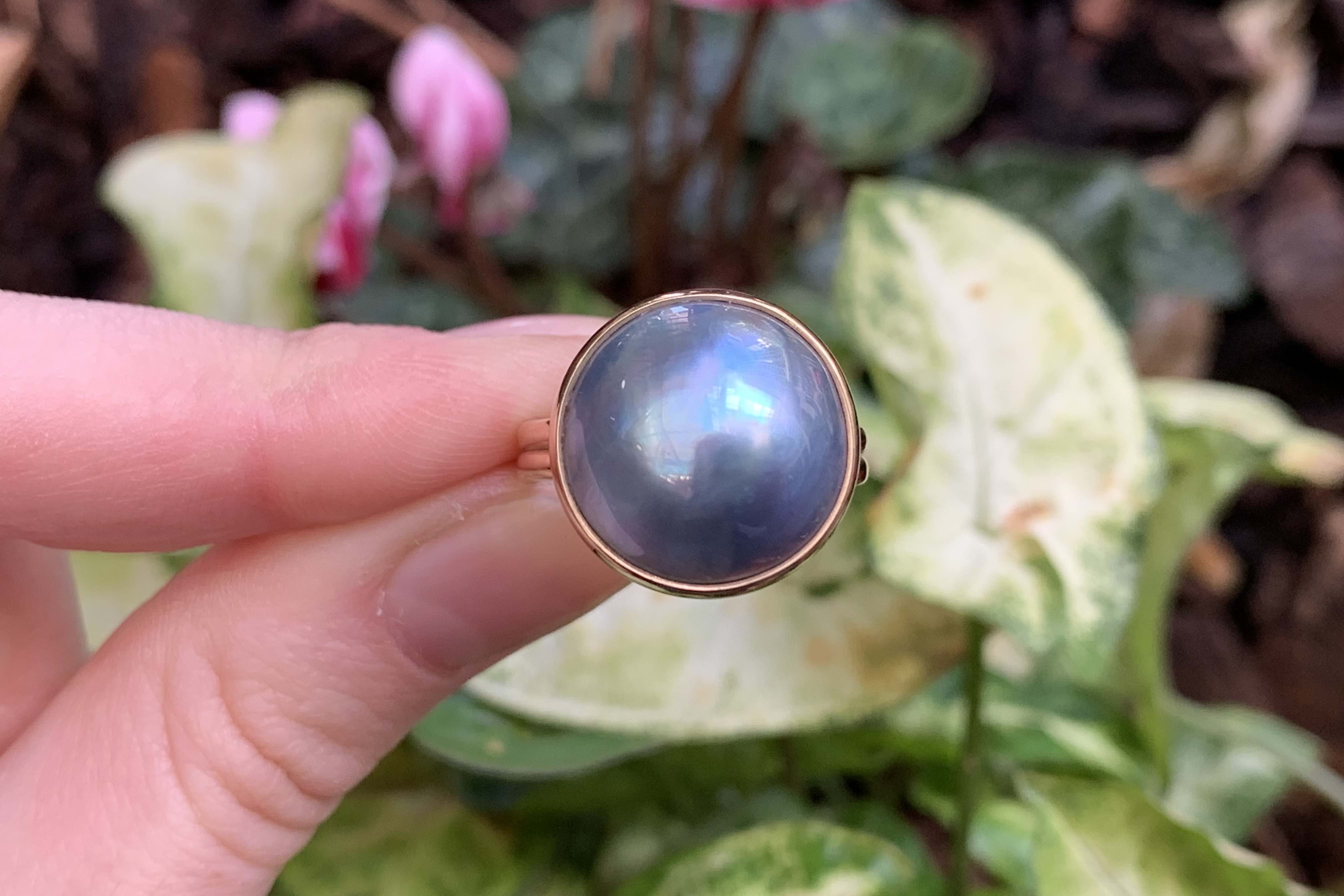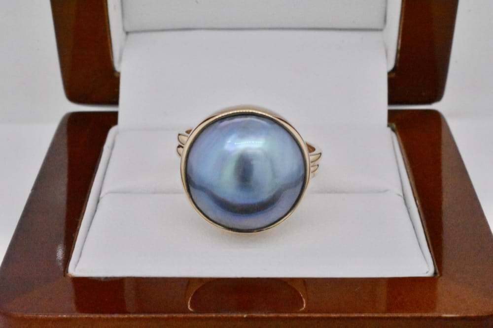 This 15mm round dyed black Mabe pearl has been bezel set into a handmade 9ct yellow gold bezel set ring. Finger size is adjustable