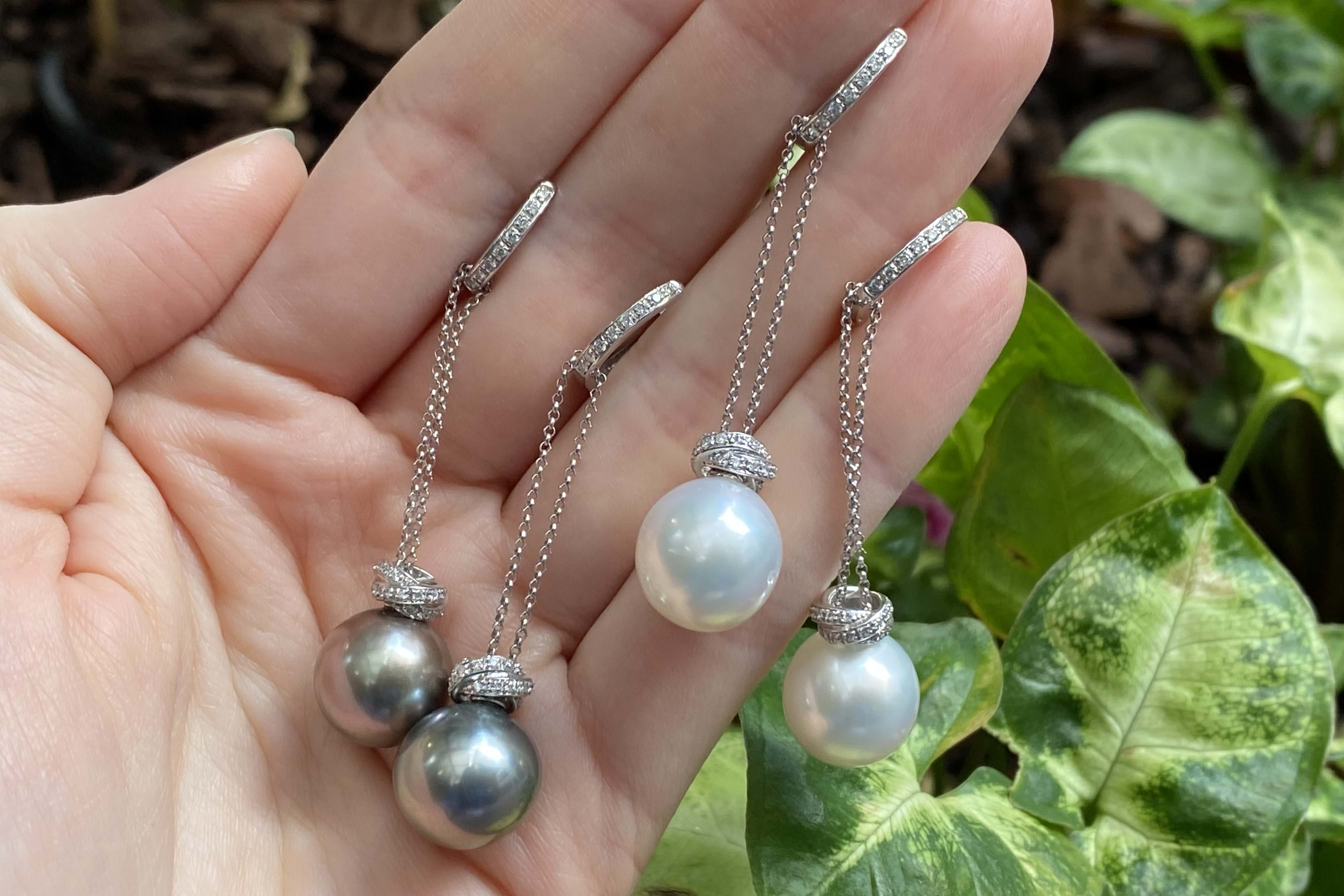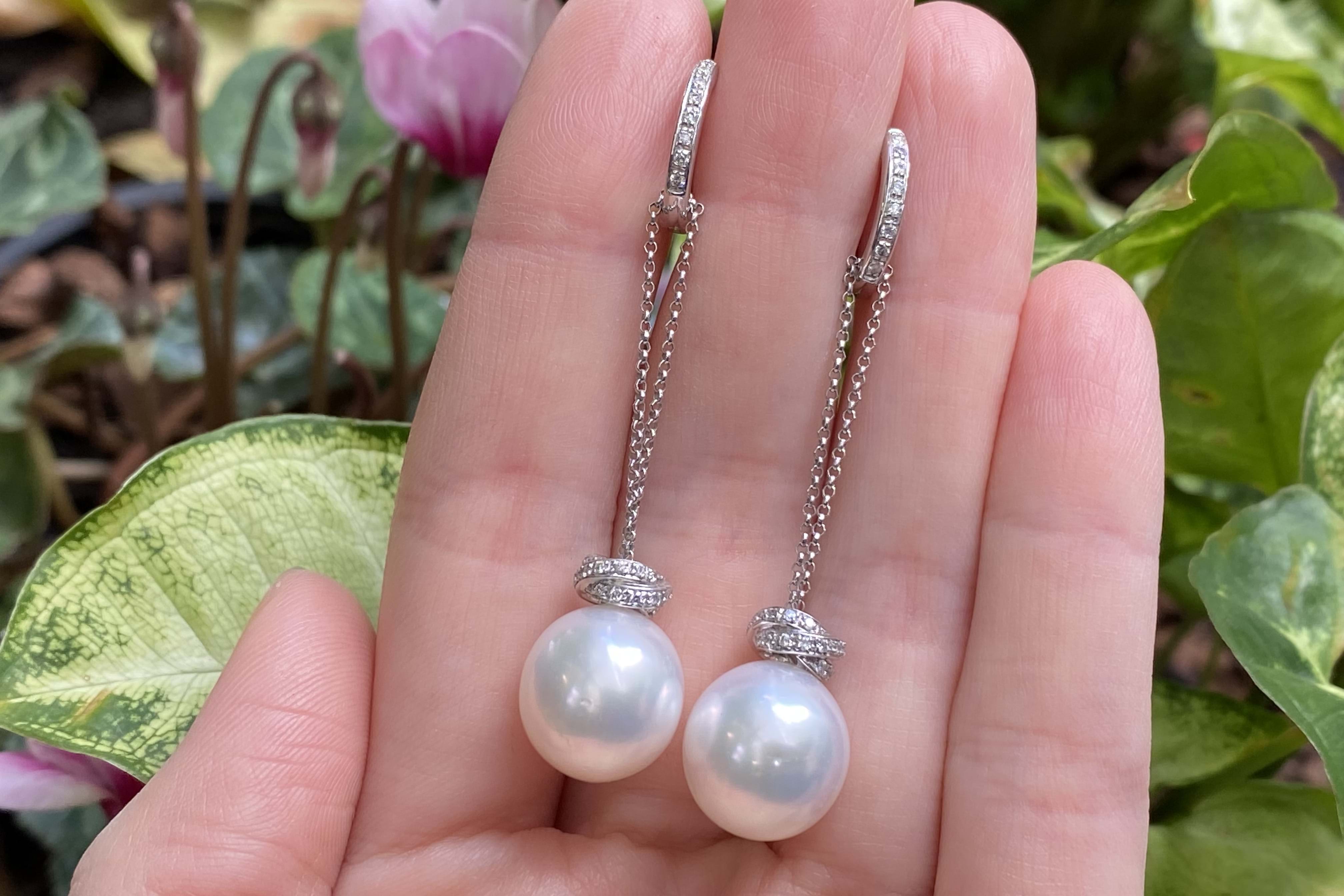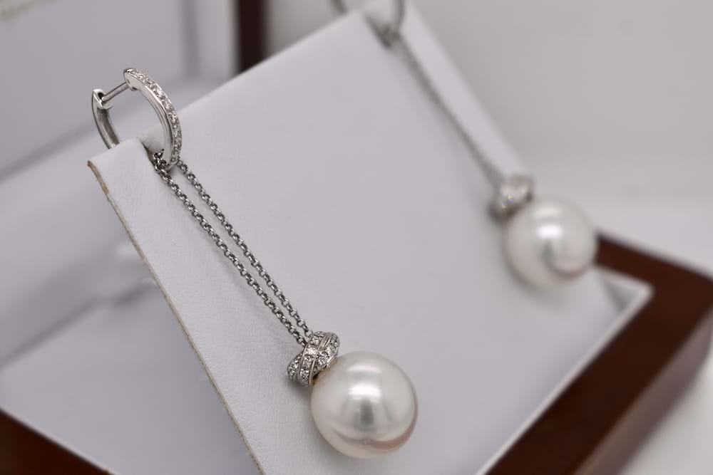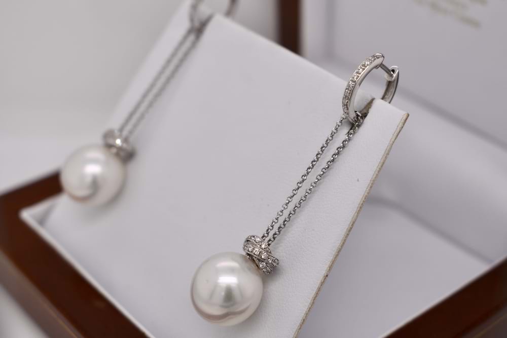 These beautiful white Australian south sea pearls measure 12mm oval with a silver/white hue and good lustre and are capped with a overlapped, diamond encrusted, ring and suspended from a long double drop of 9ct white gold chain. The drops are suspended from 9ct white gold diamond huggies and can be removed, leaving a plain everyday earring and transformed into stunning evening earrings by adding the pearls. Total diamond content equals 0.31cts. Independent Valuation Supplied.
