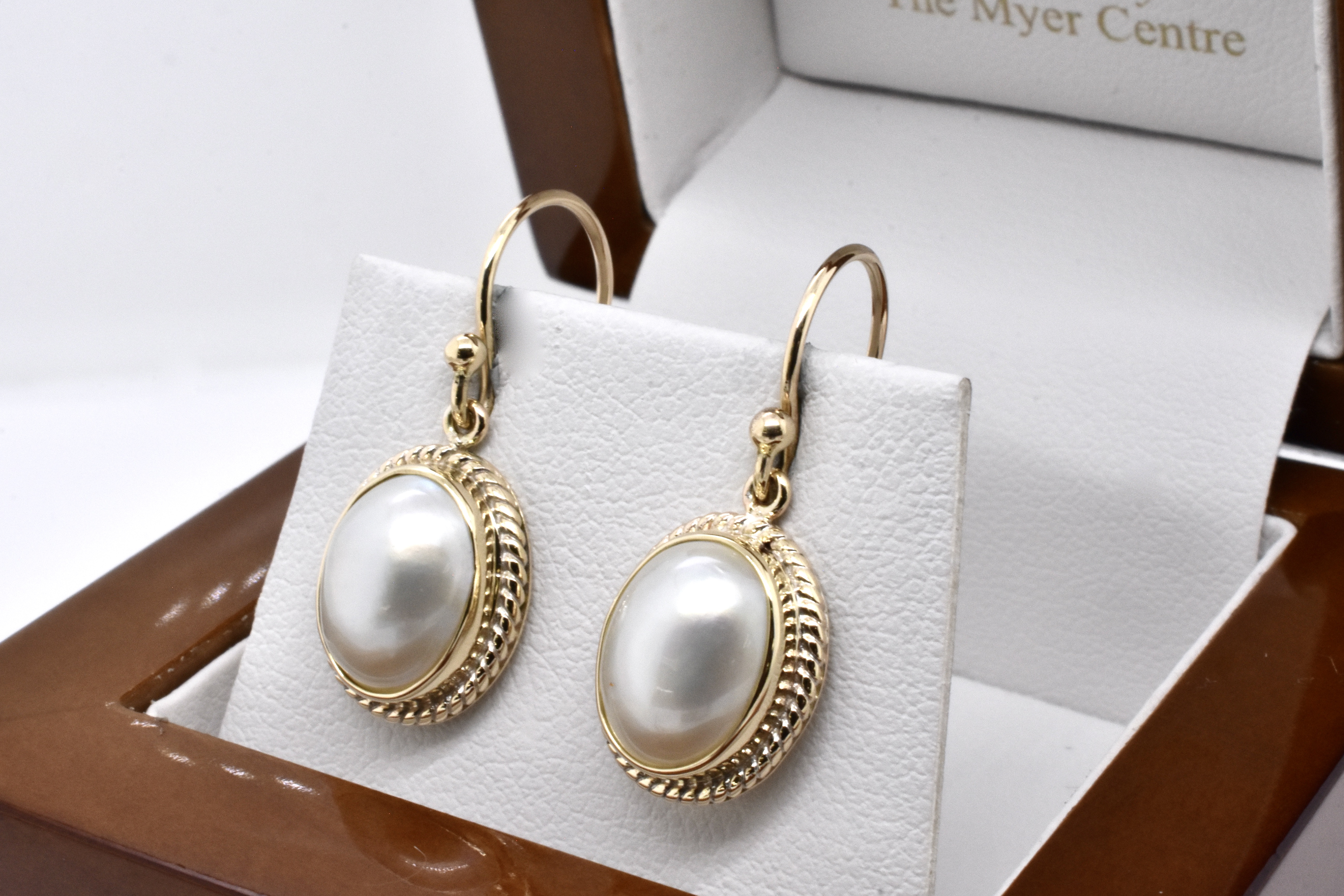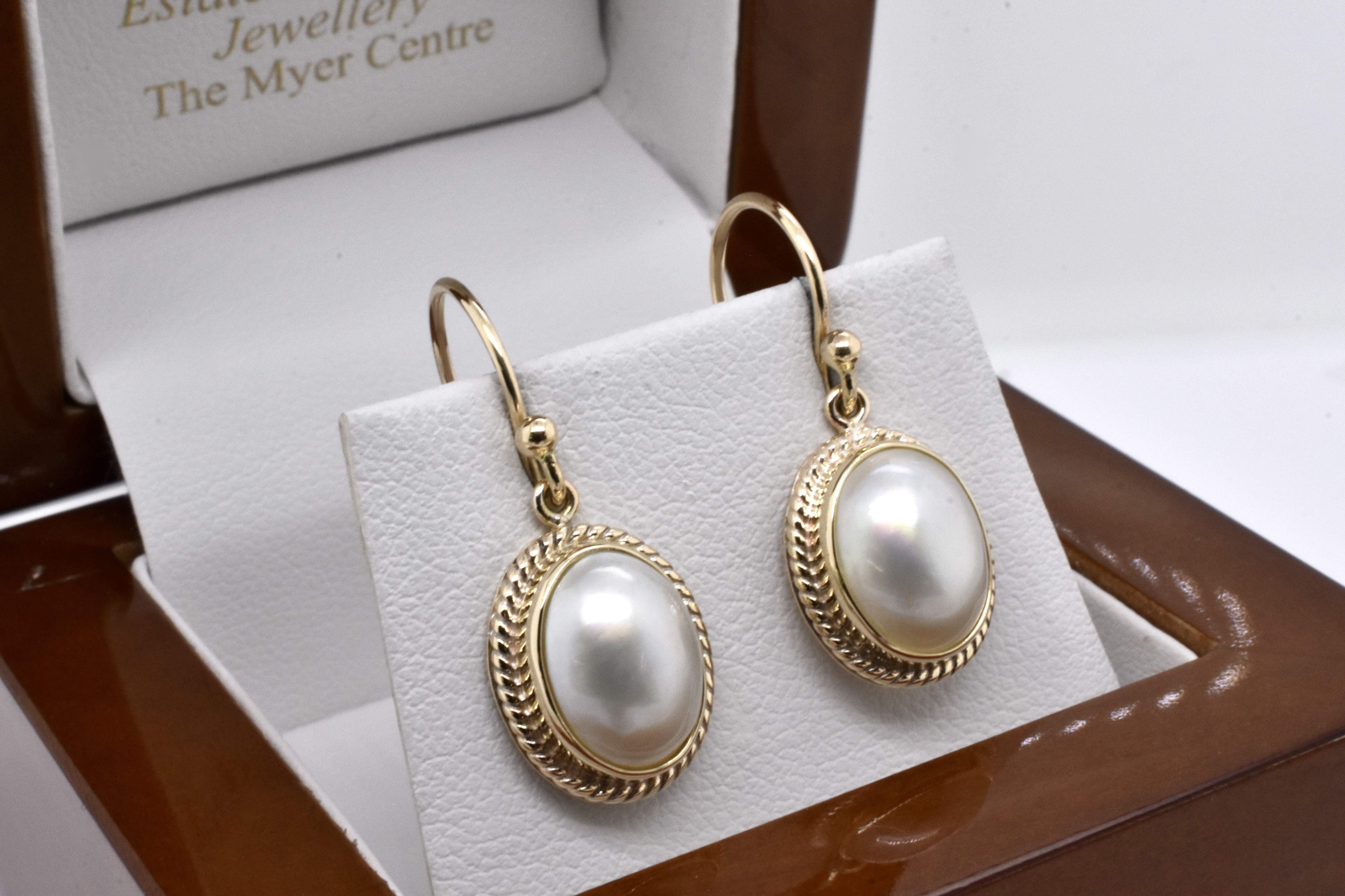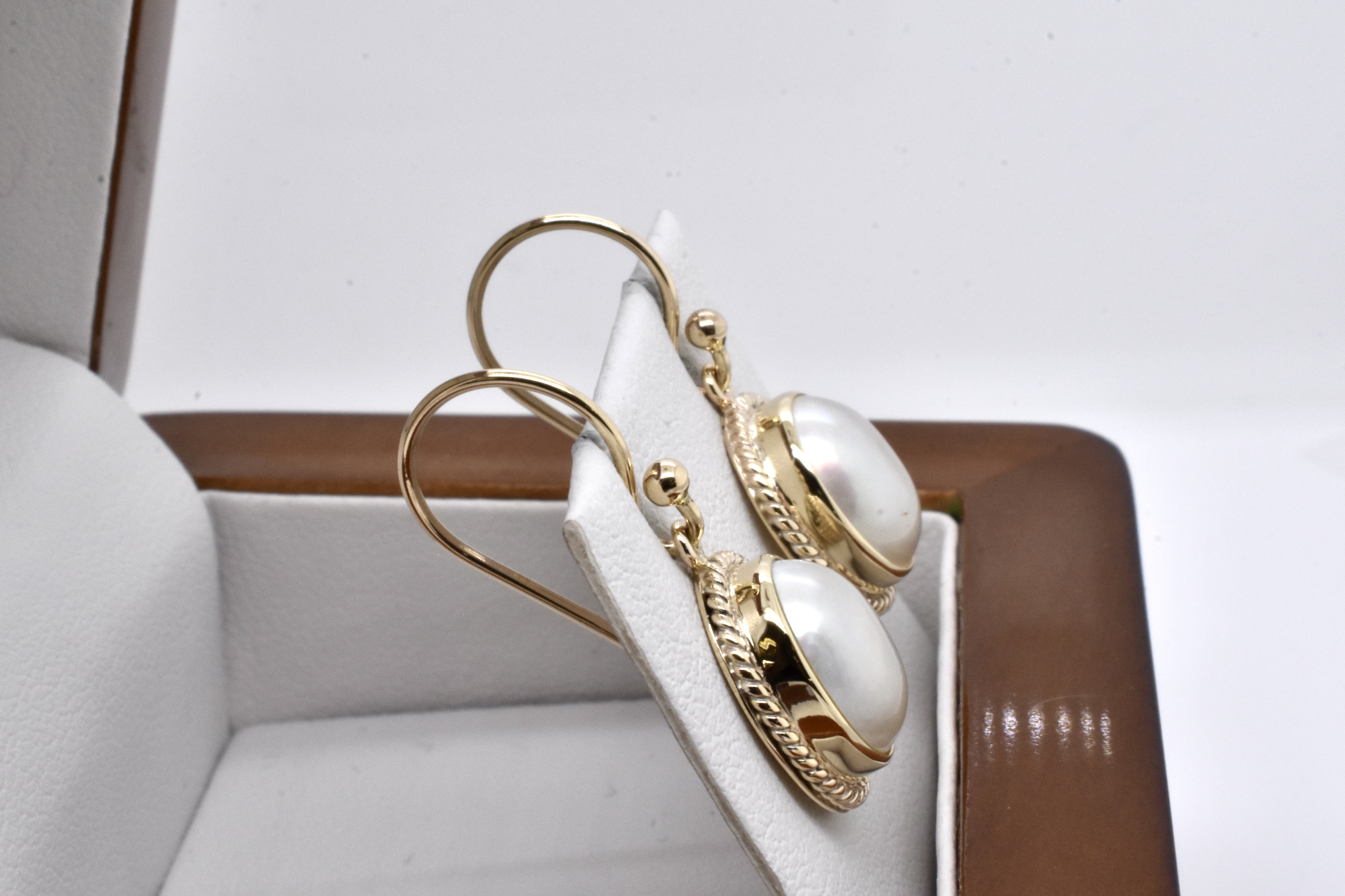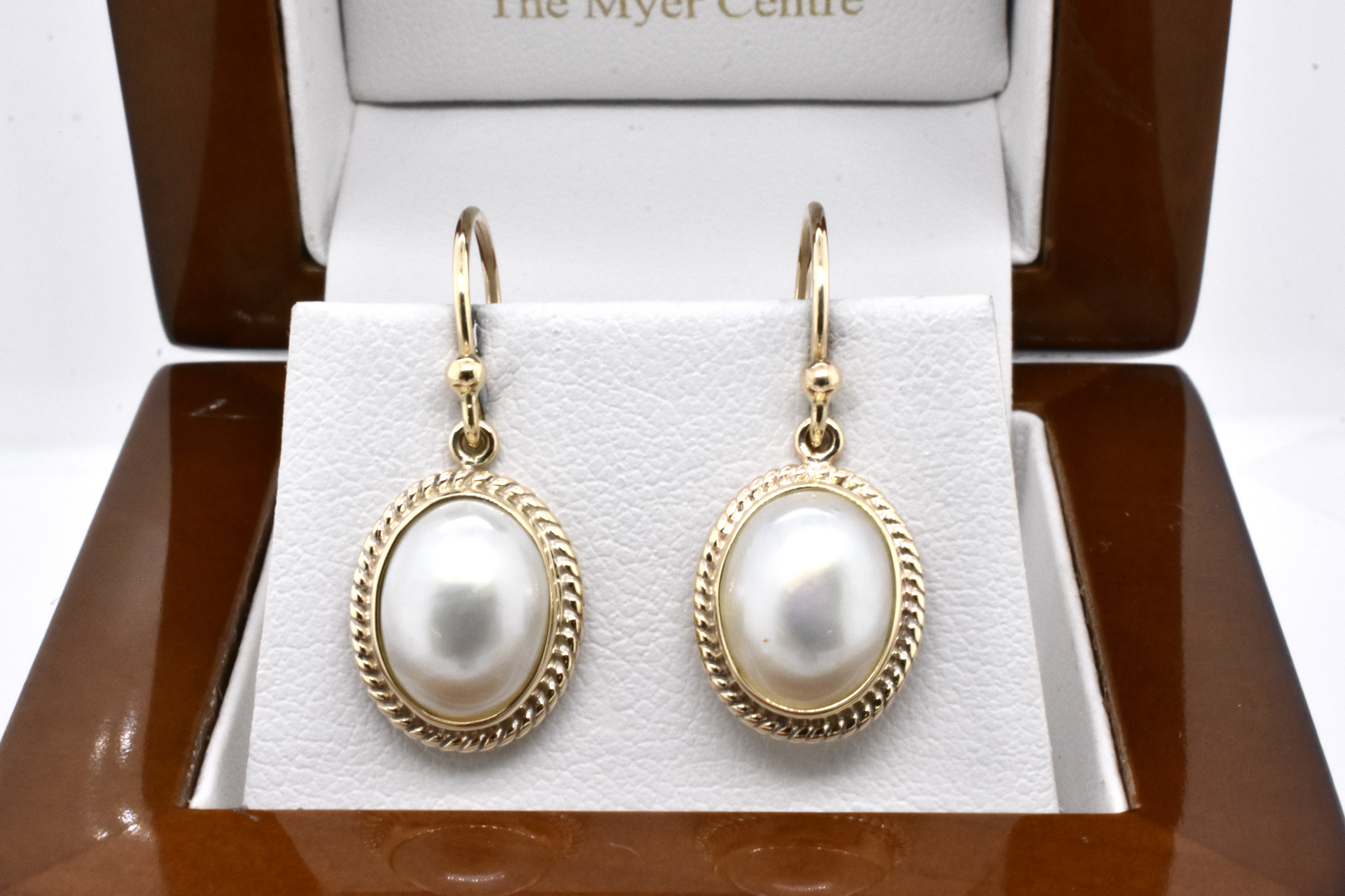 A modern, yet classic handmade pair of 9ct yellow gold earrings with oval, white mabe pearls measuring approx. 11 x 9mm in a twisted rope style bezel setting with shepherd hooks