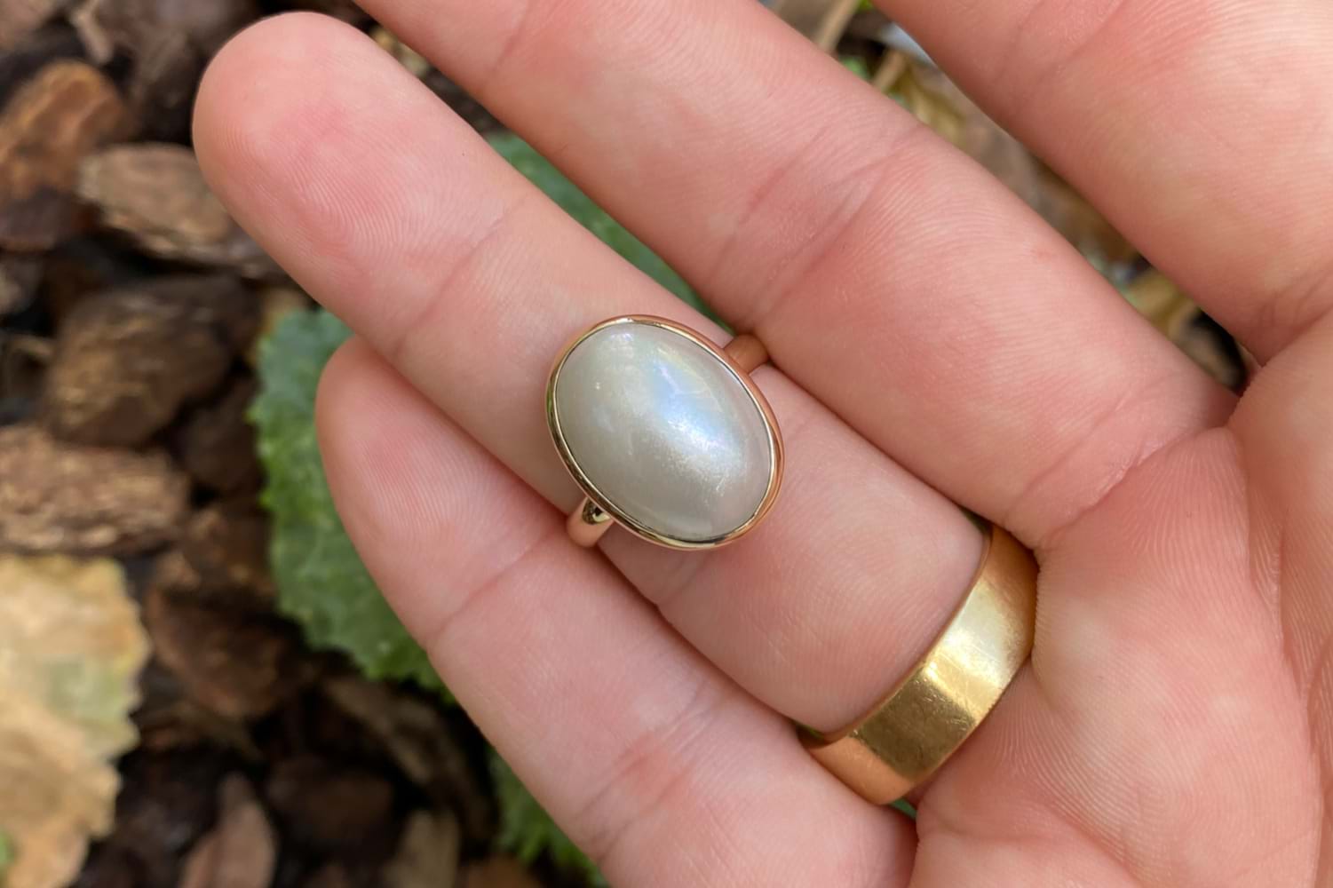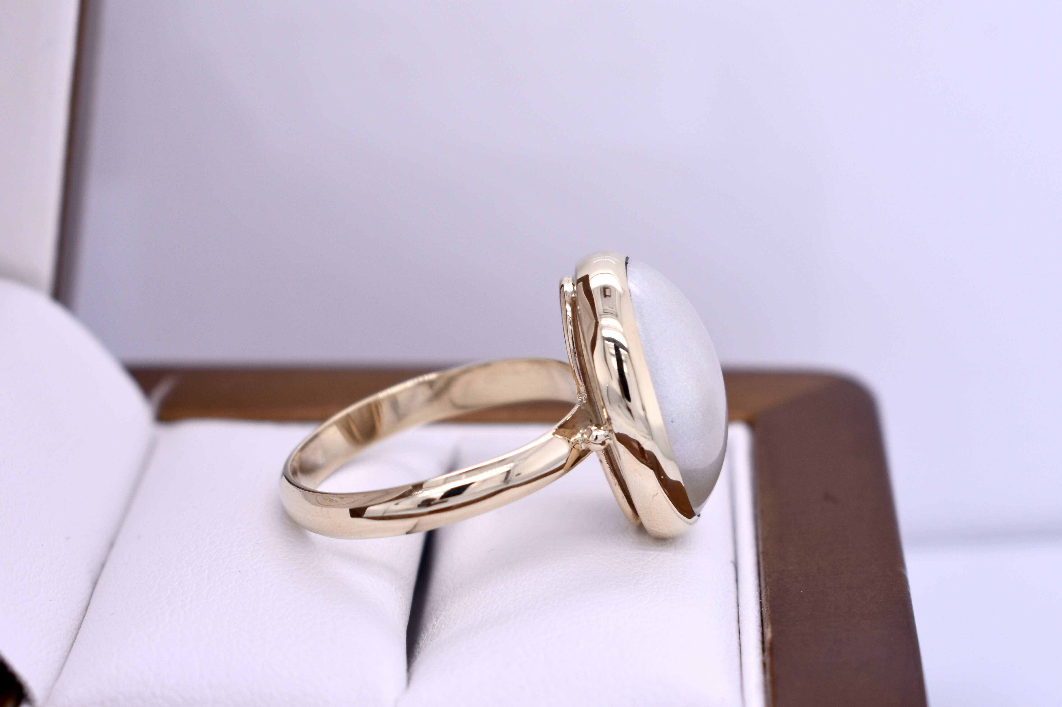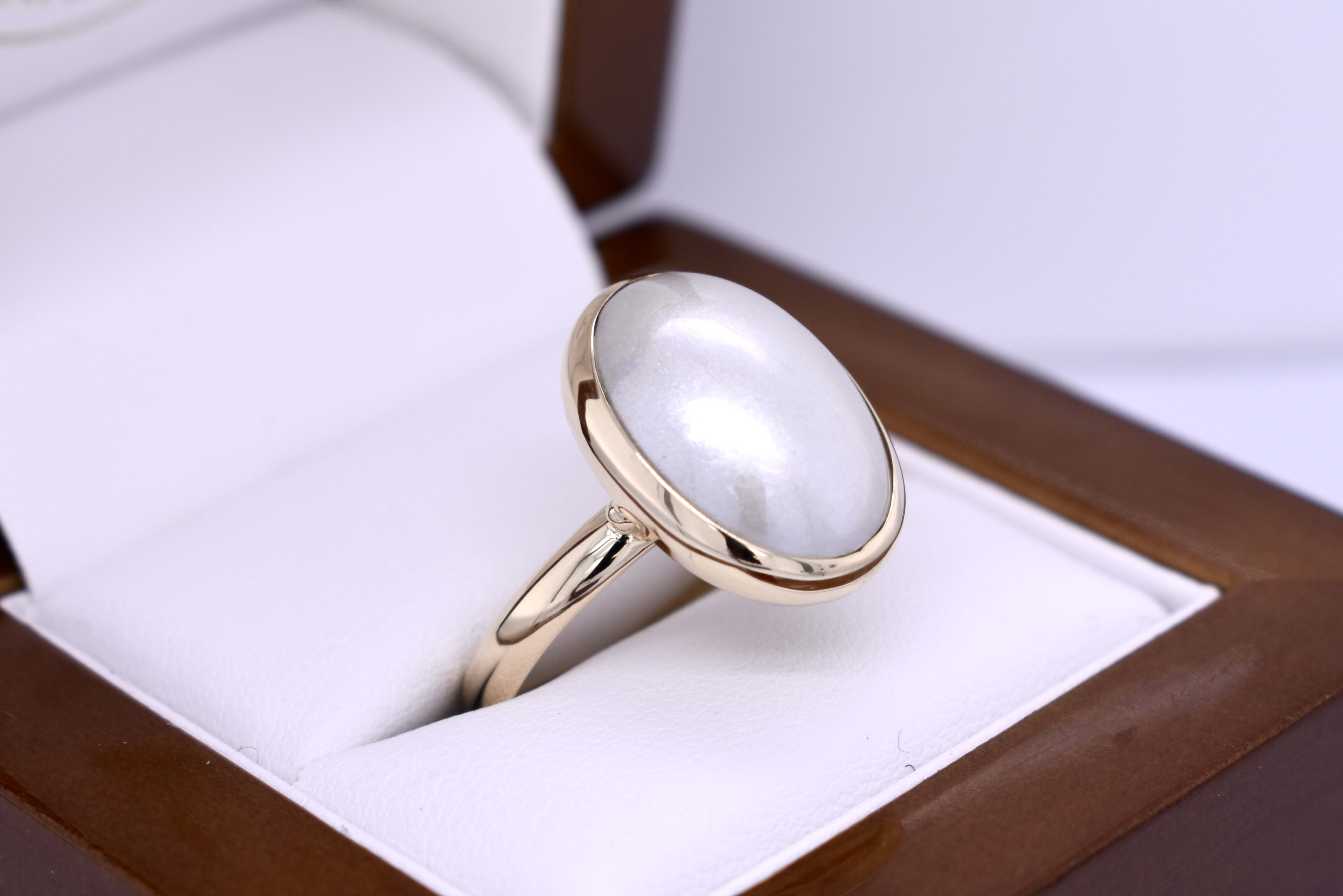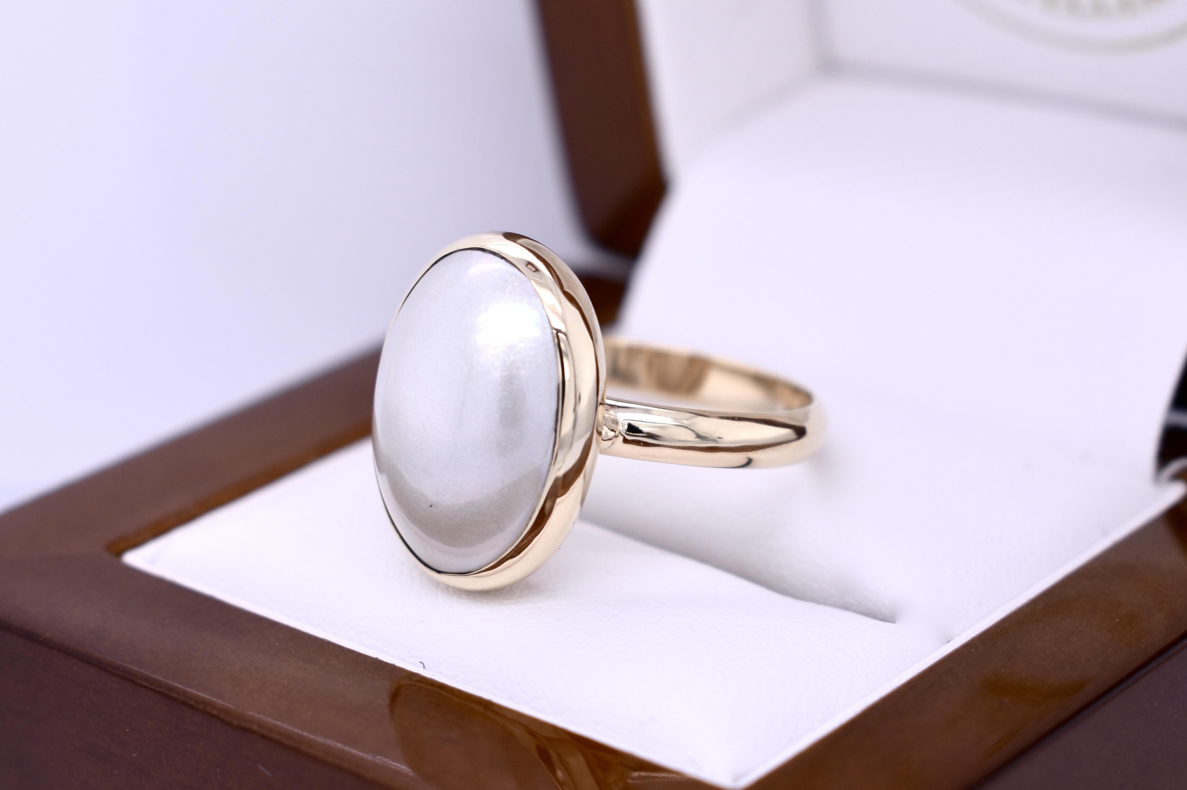 Lovely oval mabe pearl measuring approx. 18.6x13.mm bezel set into a classic 9ct yellow gold setting on a plain band. Finger size R