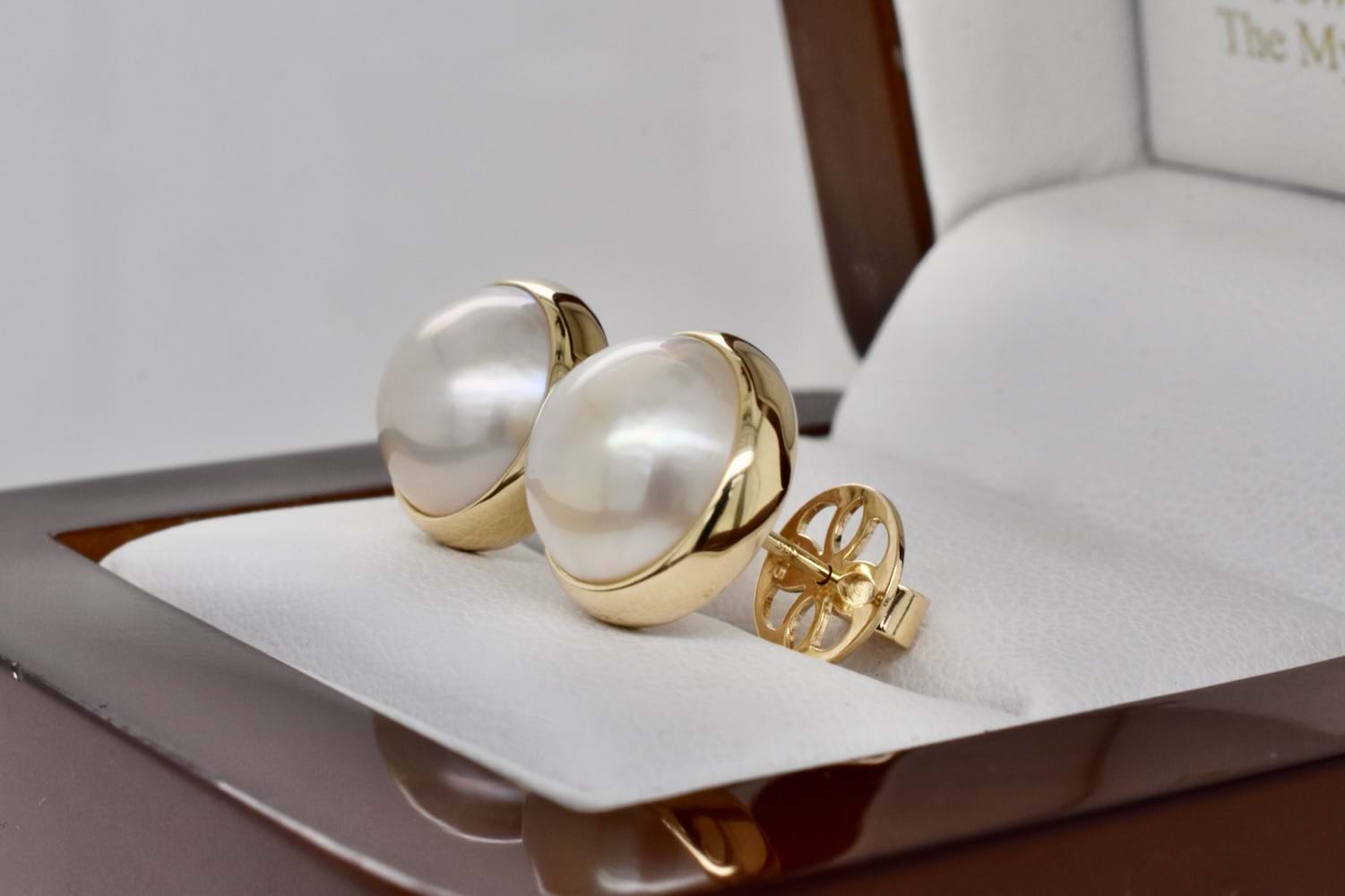 Classic and timeless these lustrous white mabe pearls measure approx. 11.9mm round and are showcased in this pair of handmade 9ct yellow gold bezel set stud earrings