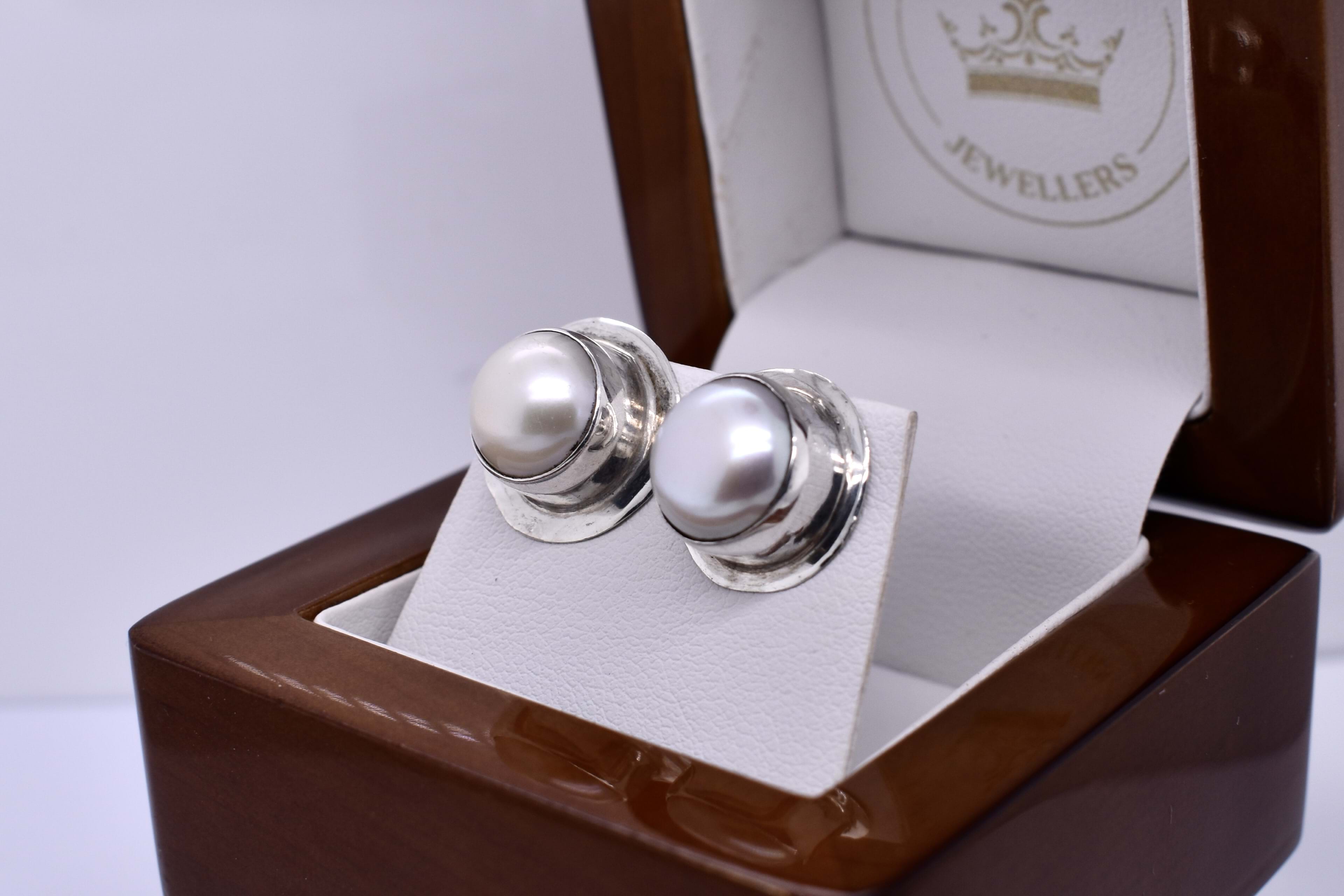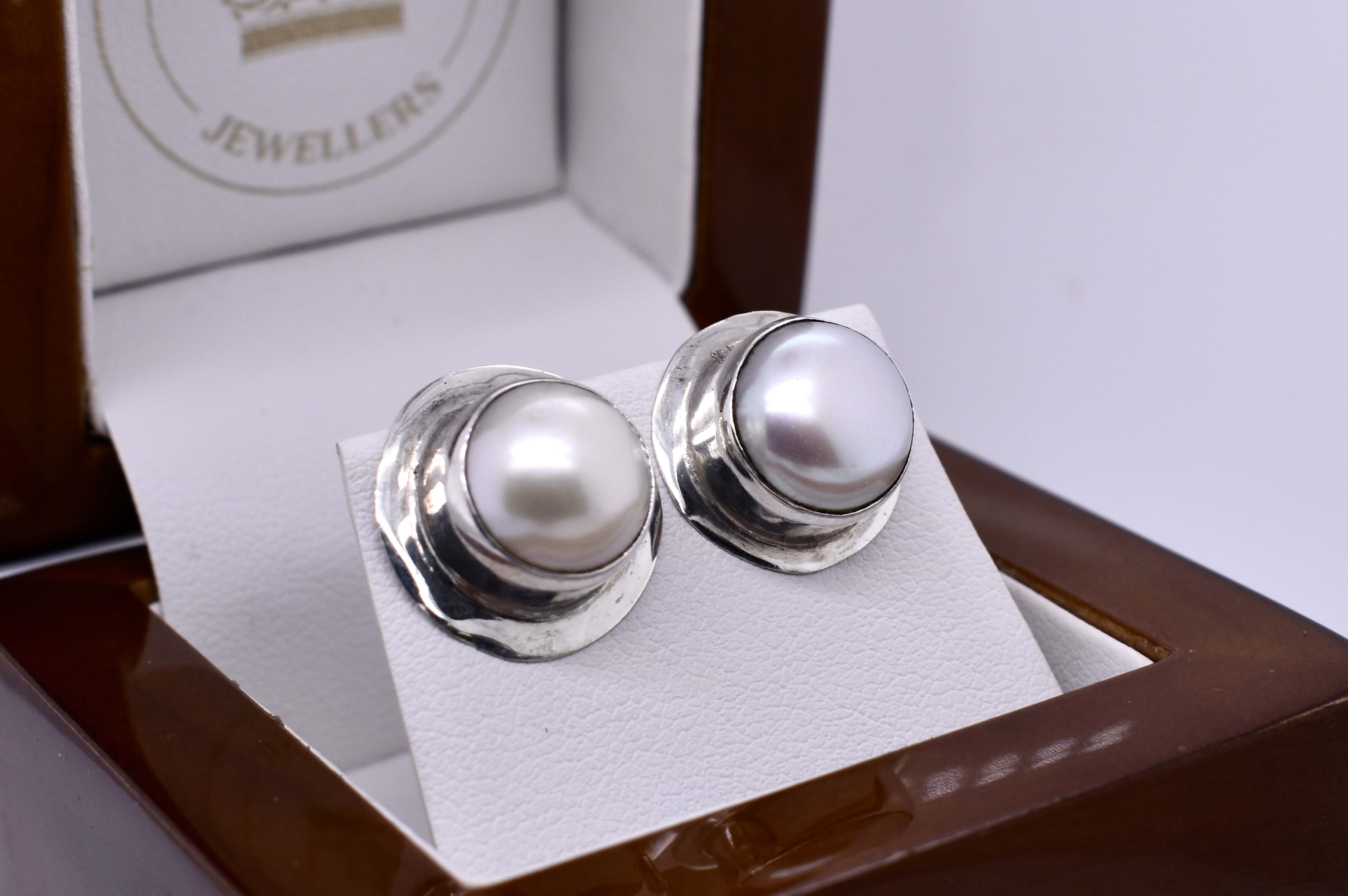 These pretty and simple studs feature mabe pearls, bezel set into sterling silver and finished with clipped post and butterfly fittings. Total weight 5.78g.